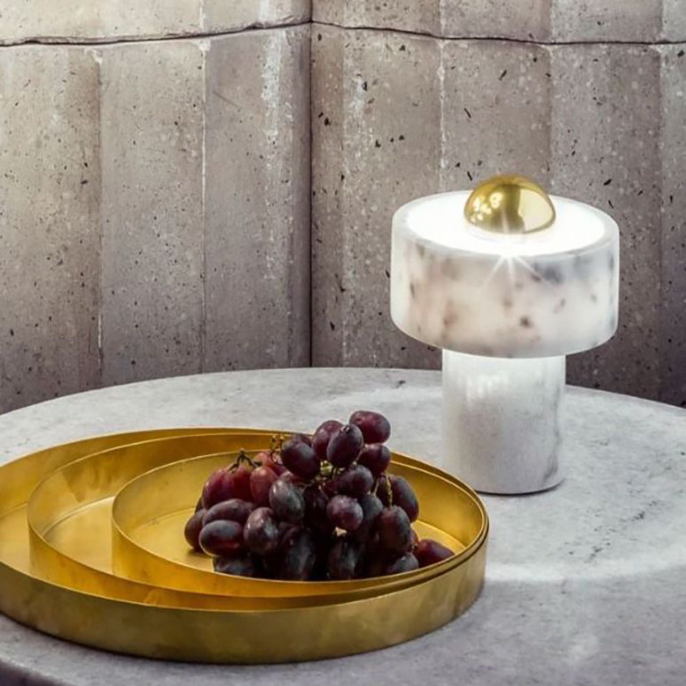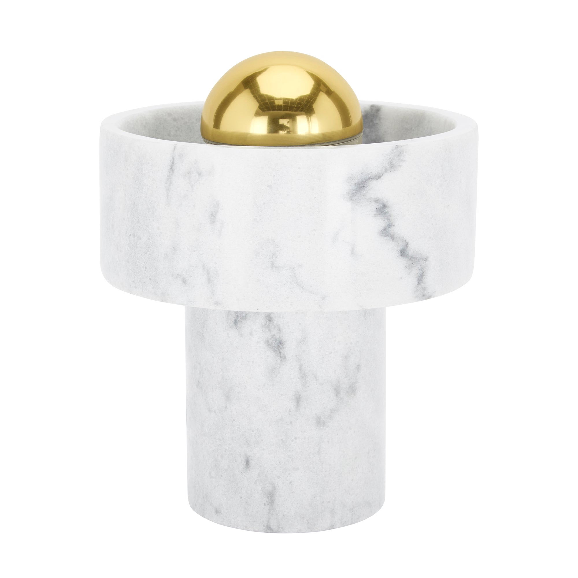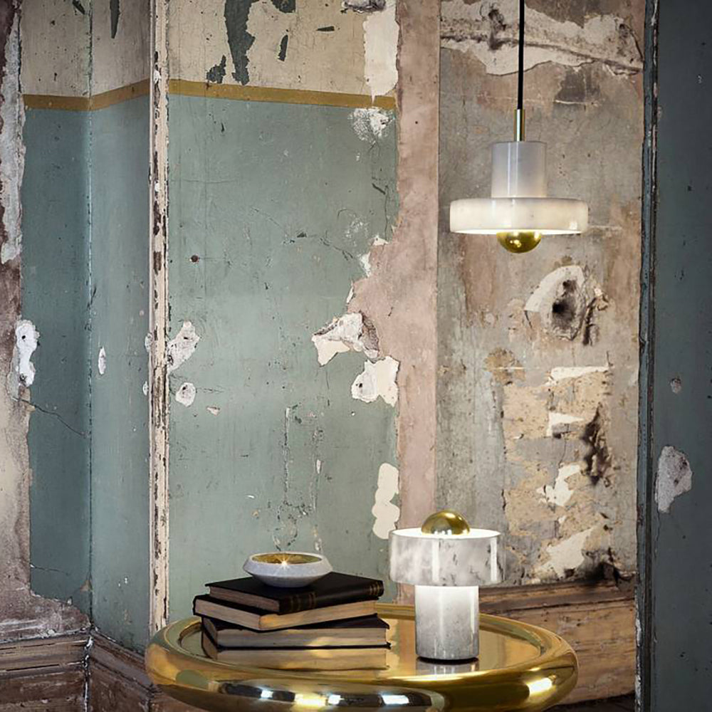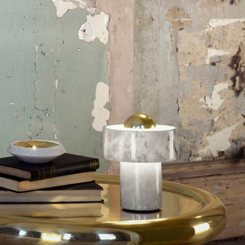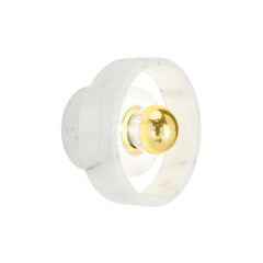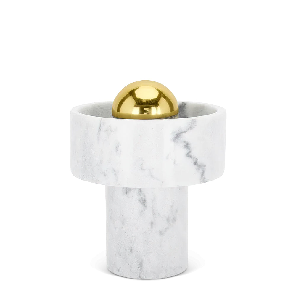 Hollowed and carved from white semi-precious marble, this table light’s halo-like ringed shade has a semi-translucent finish that accentuates its unique veined pattern. Designed to sit sturdily on your table of choice, it omits its light from the gold-toned brass center that reminds us of a contemporary sun. Every piece of marble has unique textures and stripes, making each piece completely unique.