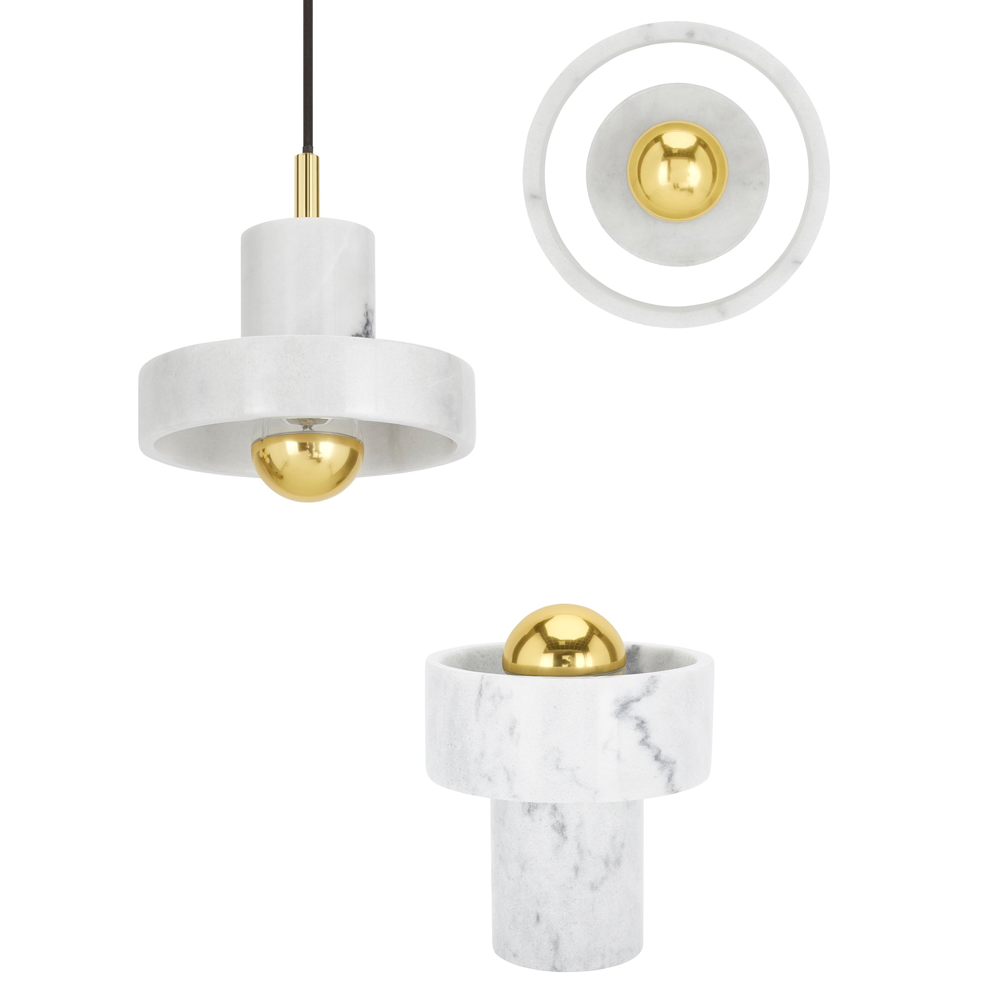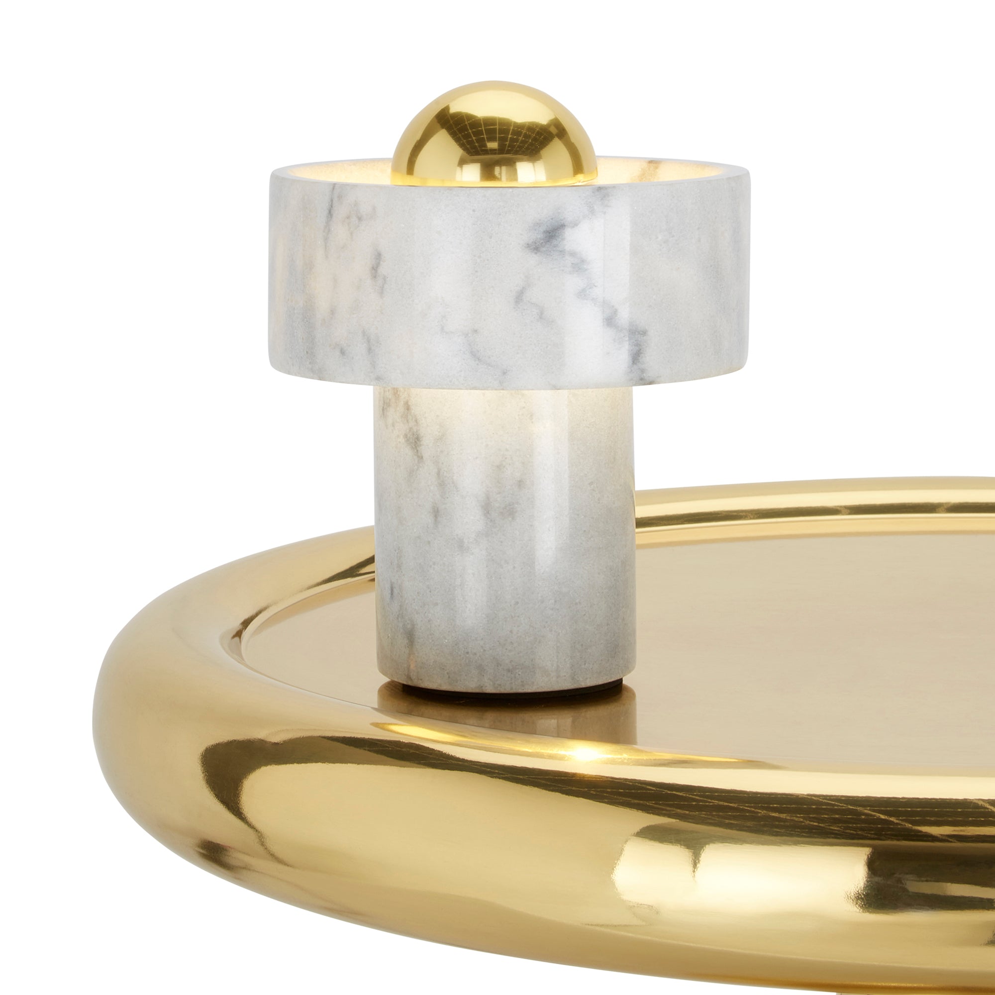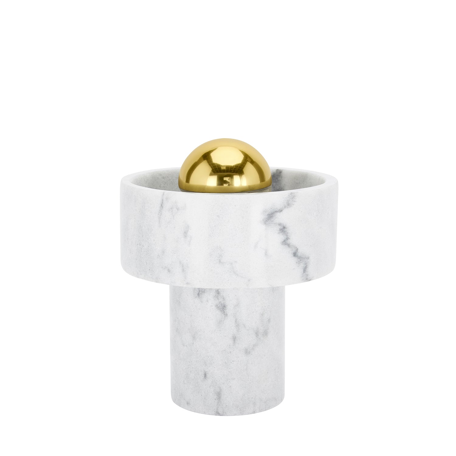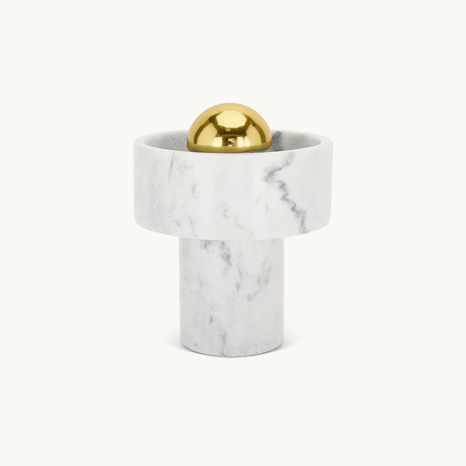 Hollowed and carved from white semi-precious marble, this table light’s halo-like ringed shade has a semi-translucent finish that accentuates its unique veined pattern. Designed to sit sturdily on your table of choice, it omits its light from the gold-toned brass center that reminds us of a contemporary sun. Every piece of marble has unique textures and stripes, making each piece completely unique.