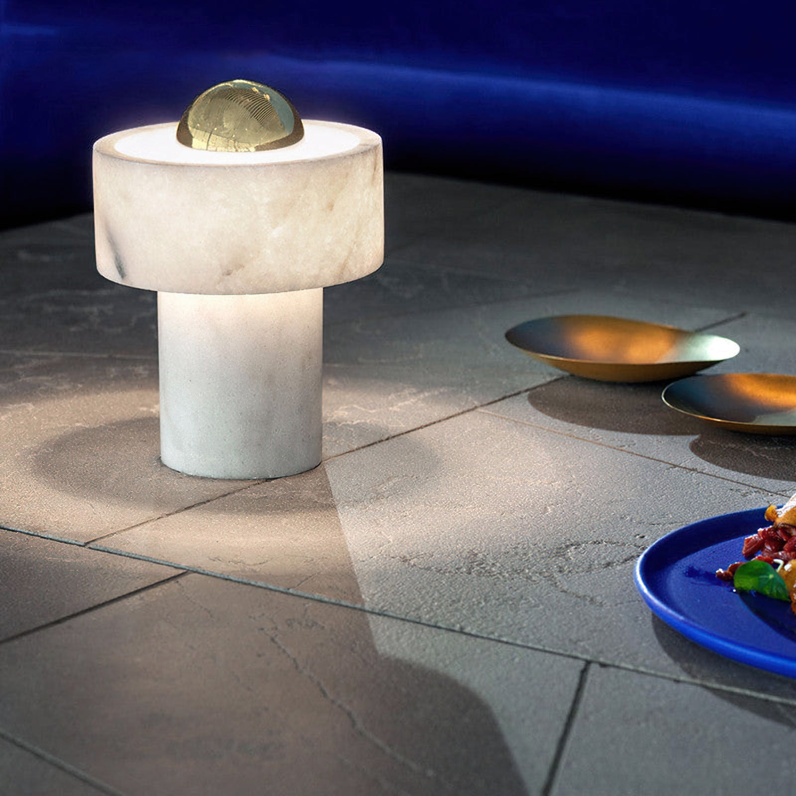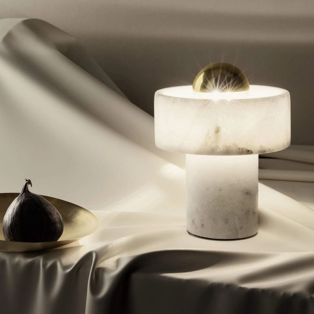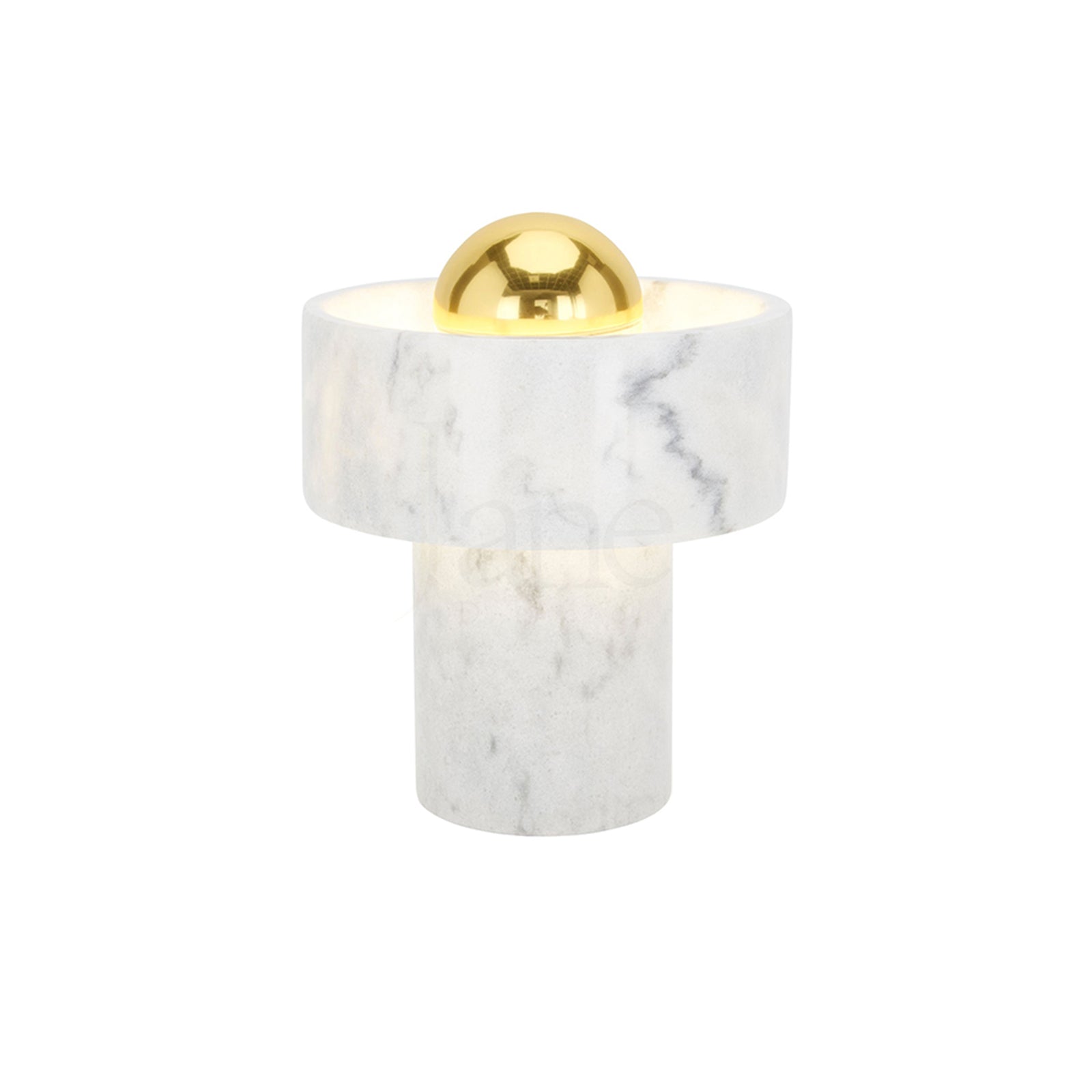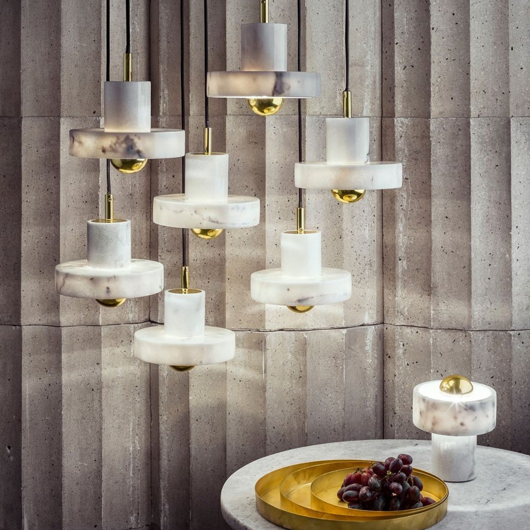 Hollowed and carved from white semi-precious marble, this table light’s halo-like ringed shade has a semi-translucent finish that accentuates its unique veined pattern. Designed to sit sturdily on your table of choice, it omits its light from the gold-toned brass center that reminds us of a contemporary sun. Every piece of marble has unique textures and stripes, making each piece completely unique.