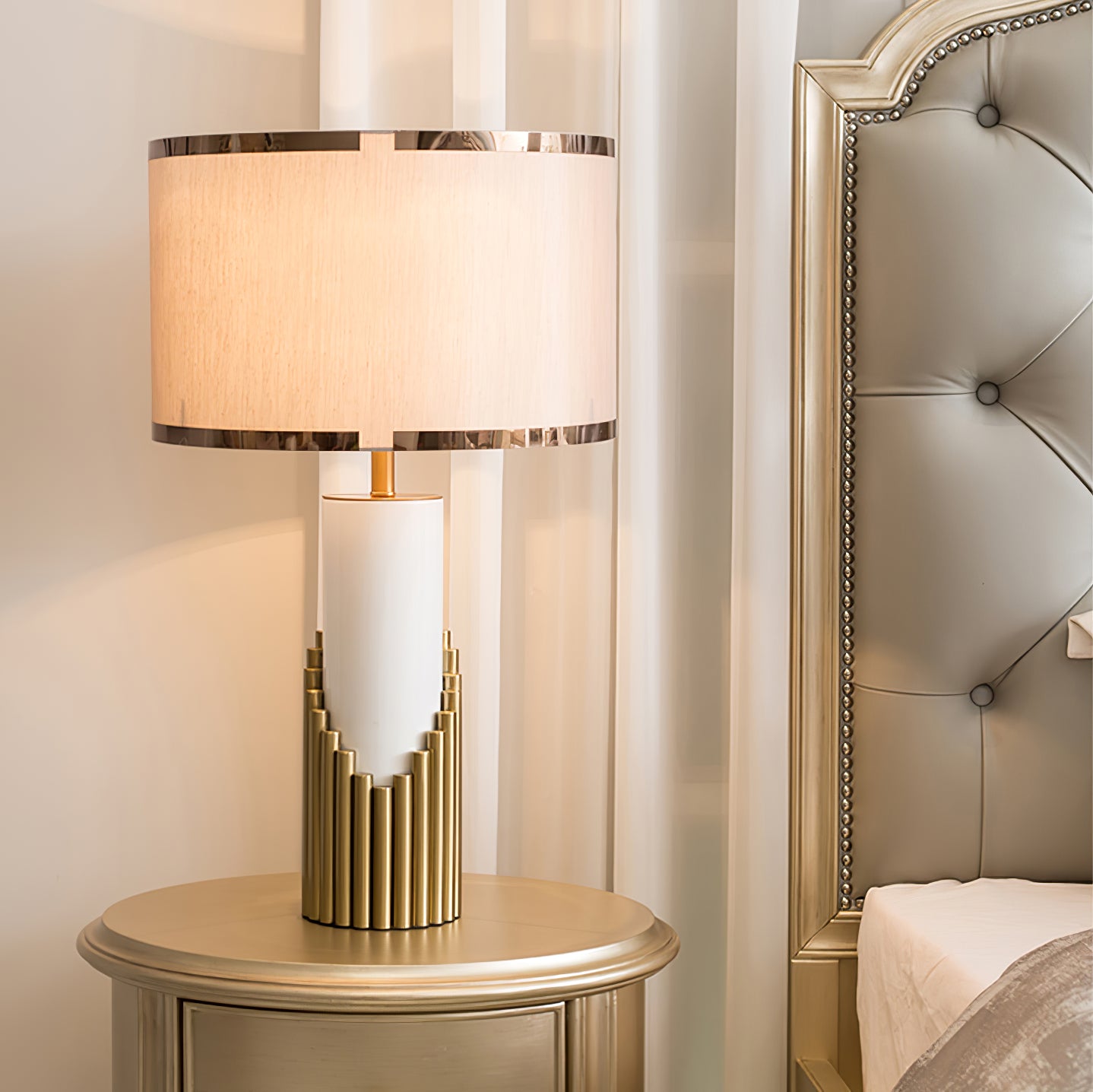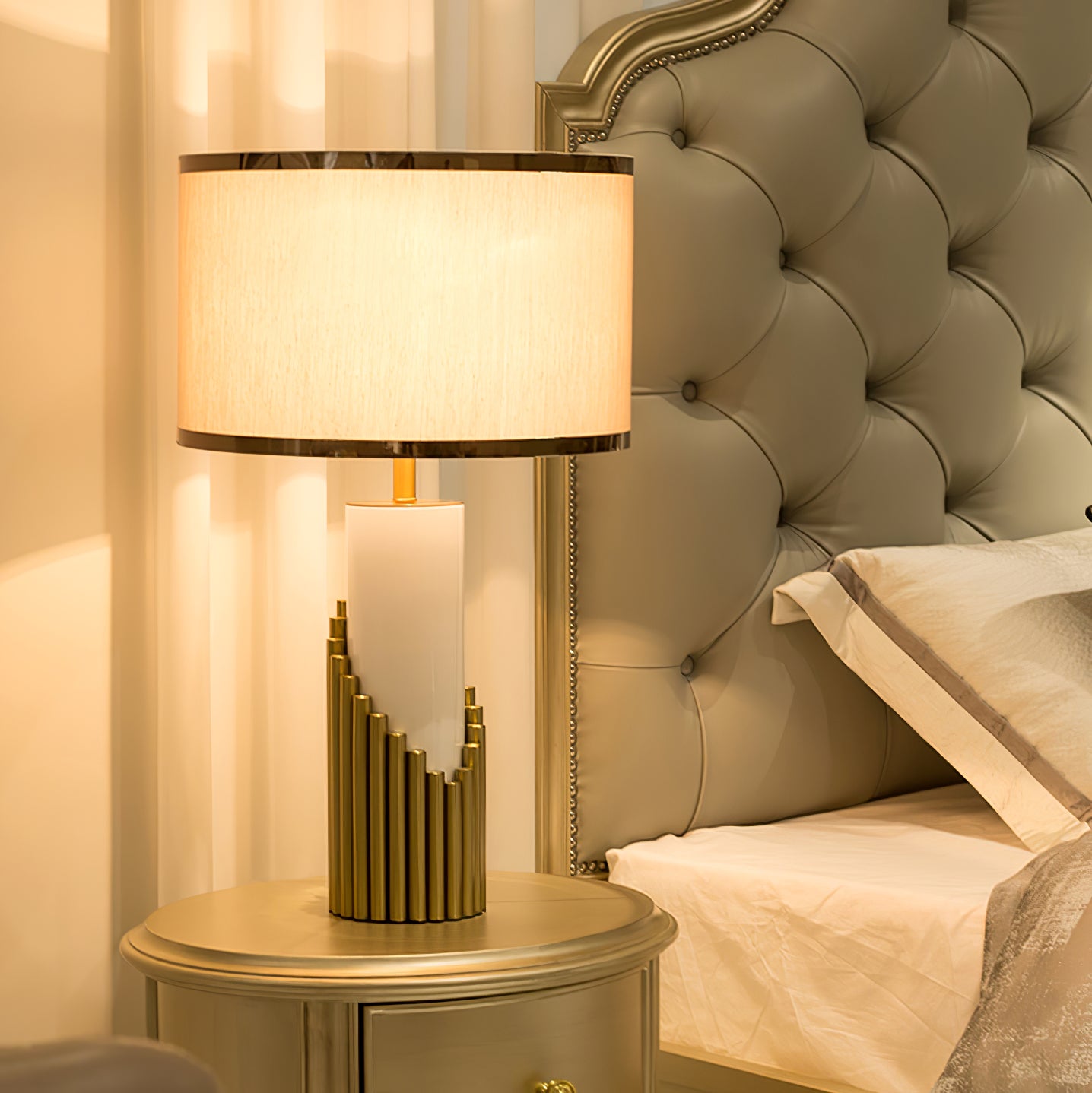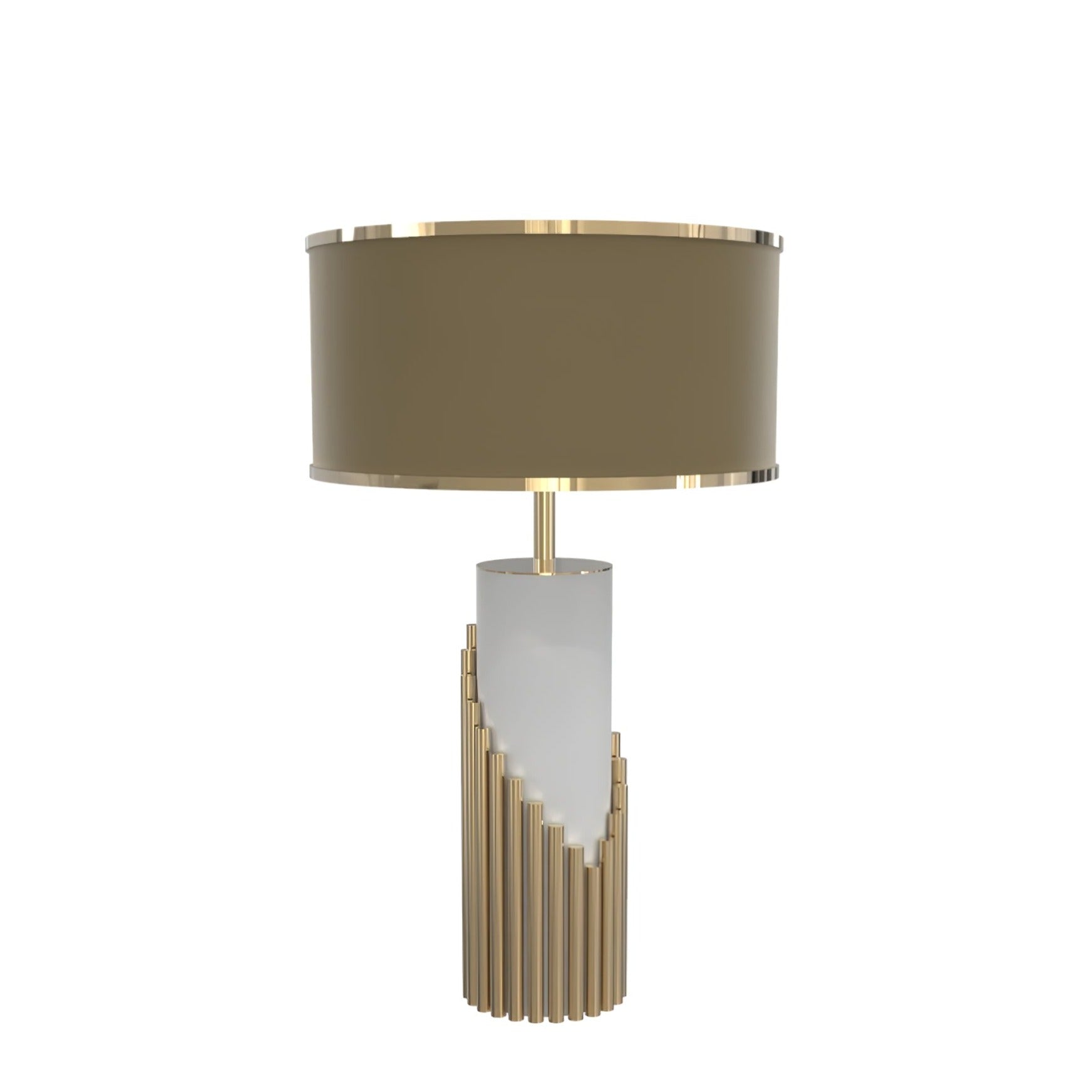 - Lampshade: Gold and Brown.