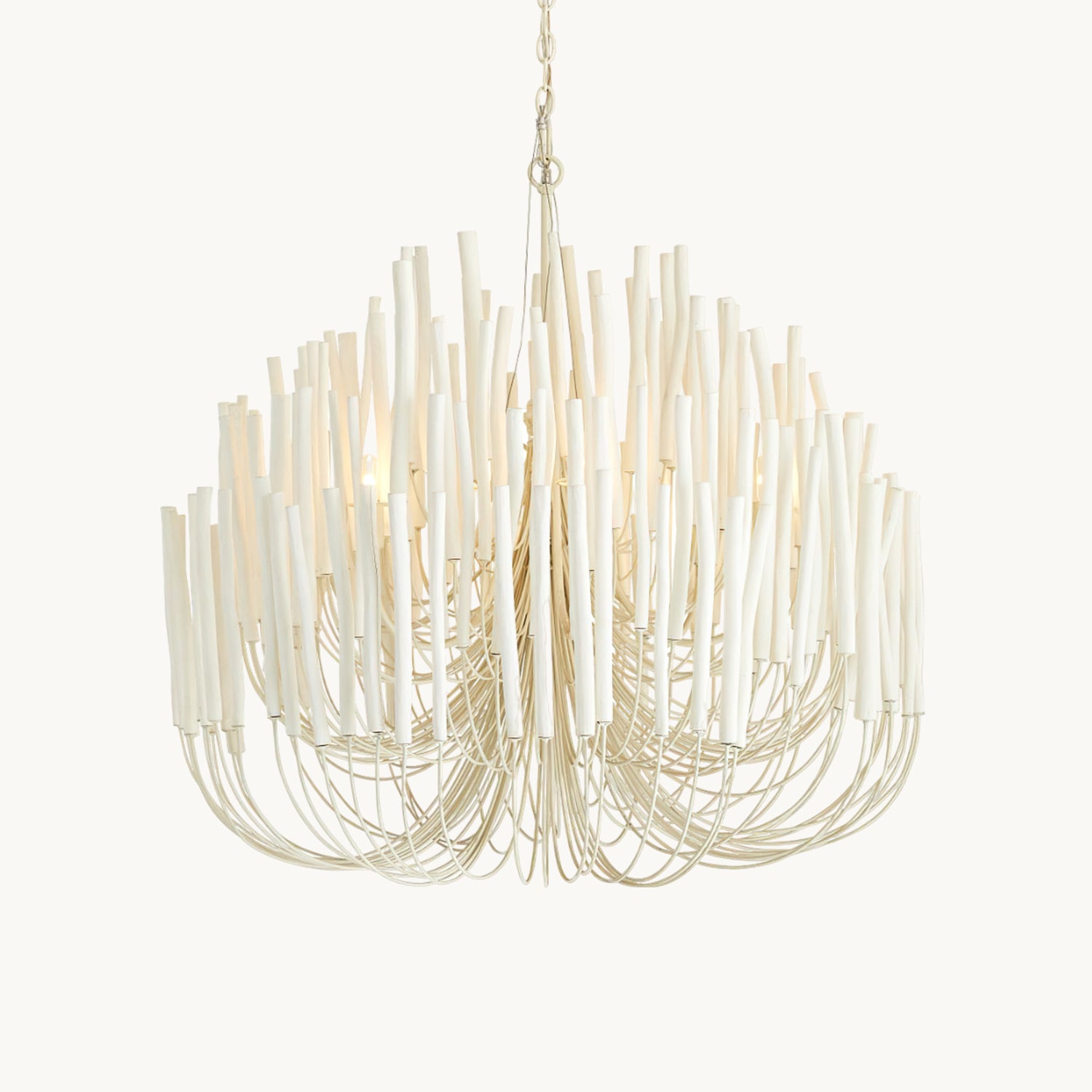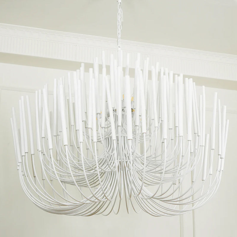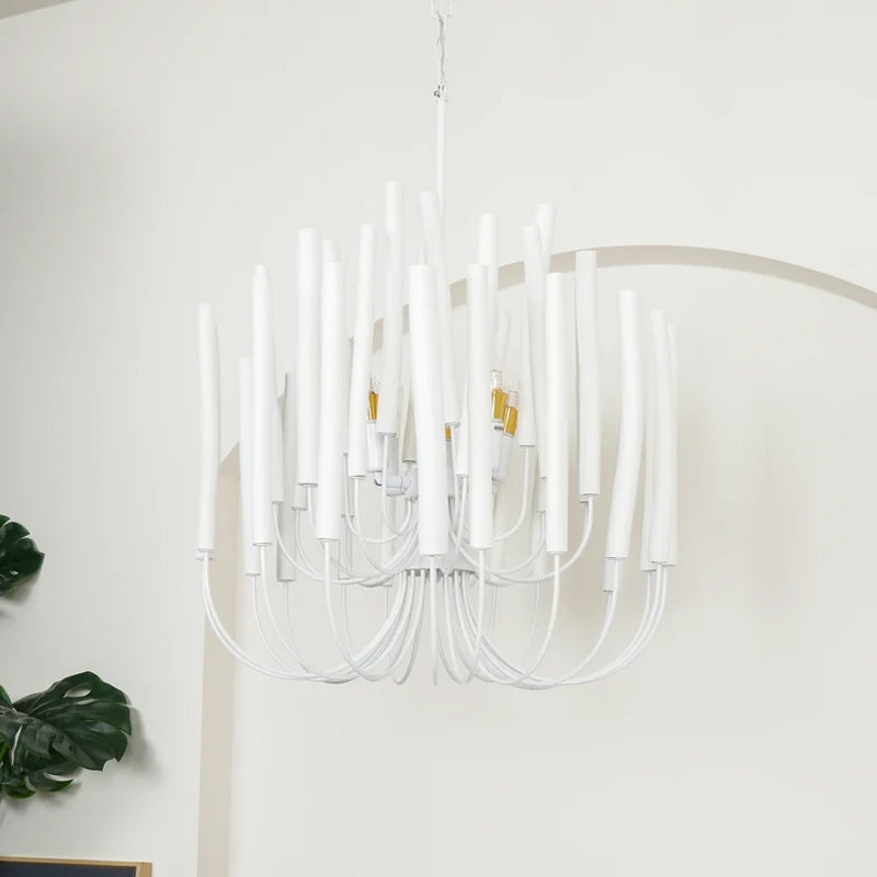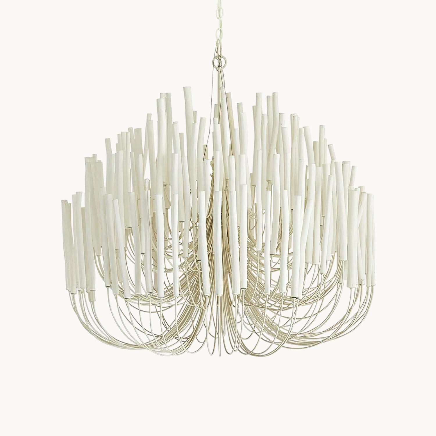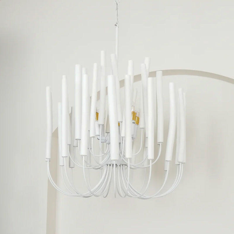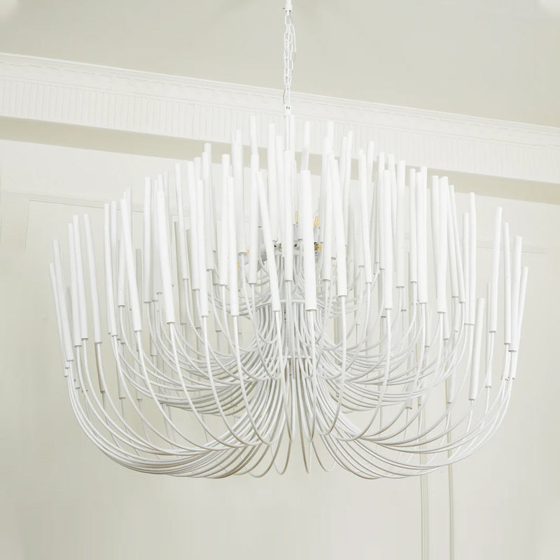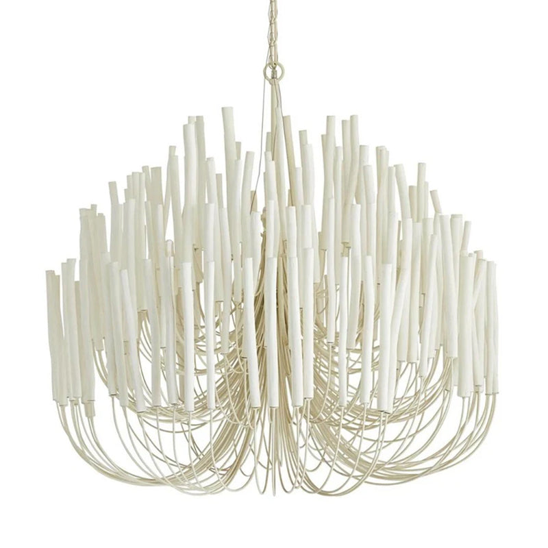 From Mooijane, the crafted Swinton Chandelier will elevate your space. This unique lamp is made of natural white material, with six curved metal arms and multiple layers of white wooden studs. It fits any room and brings a sophisticated and artistic touch to your living room, dining room, or bedroom.