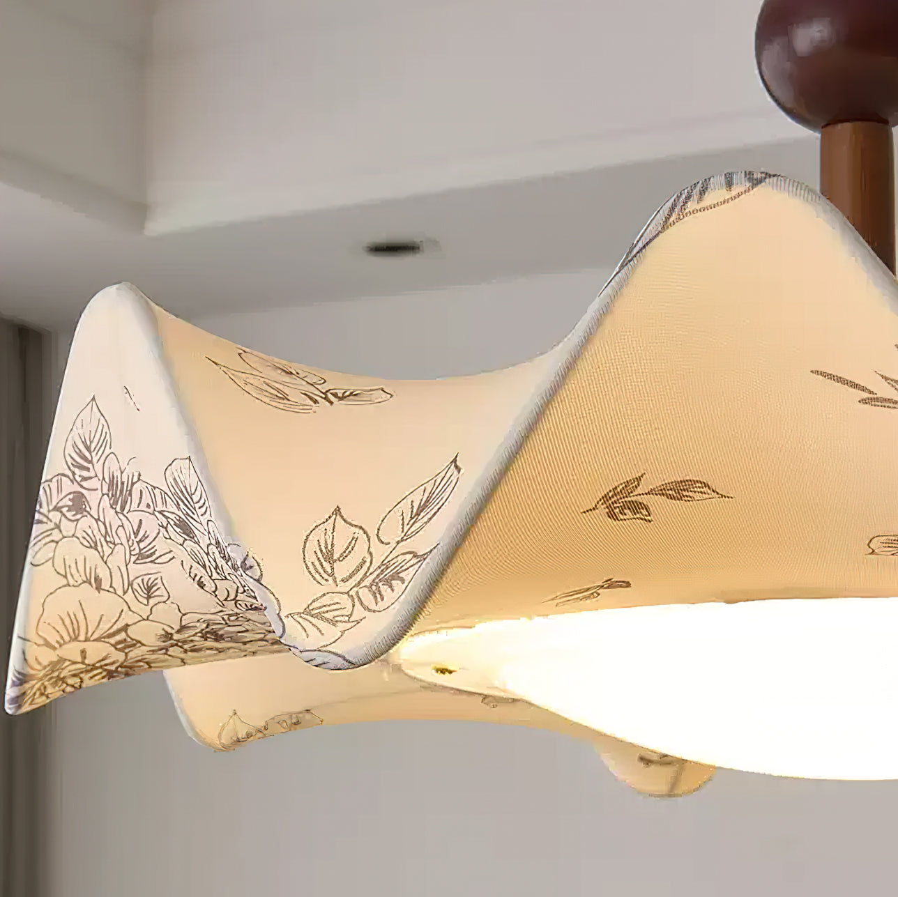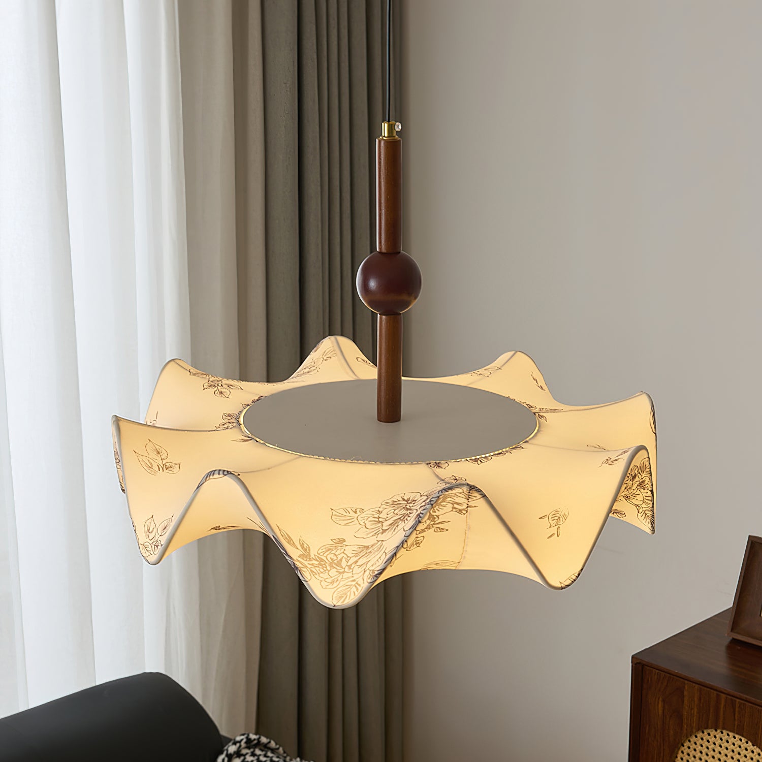 Illuminate your space with the Tanyel Petal Pendant Lamp from Mooijane. Featuring a delicate floral design, this lamp adds a touch of nature to your home. The warm glow filtering through the fabric petals creates a tranquil ambiance. Made with timeless metal and wood accents, this chandelier exudes sophistication, making it ideal for any modern home.