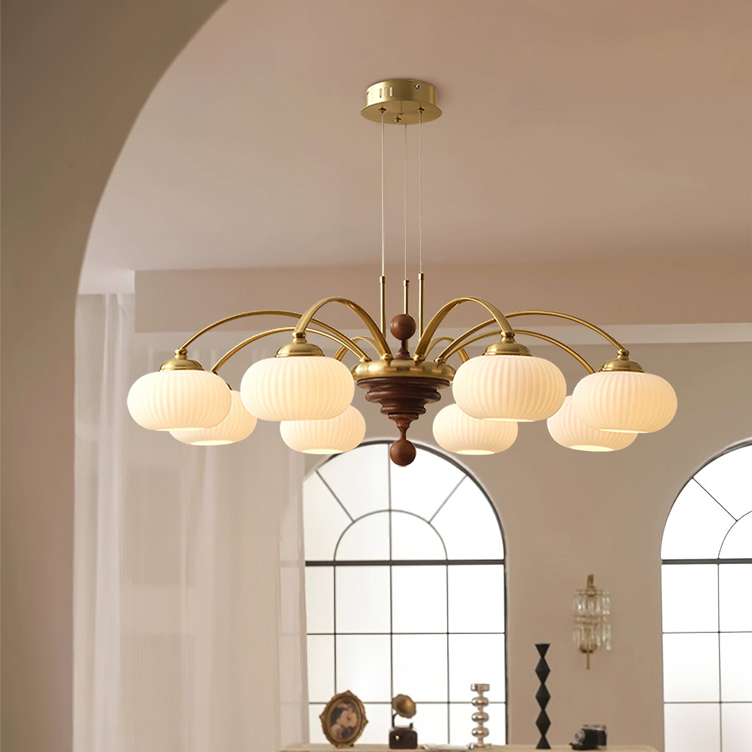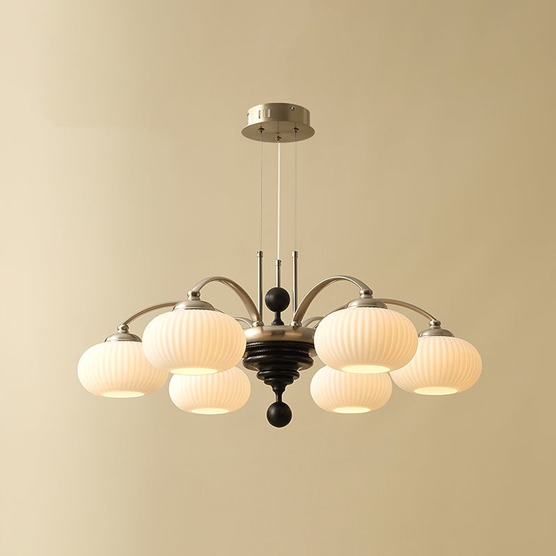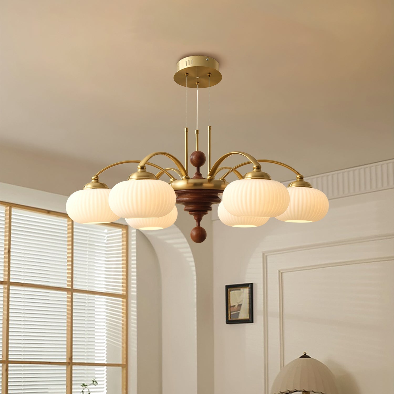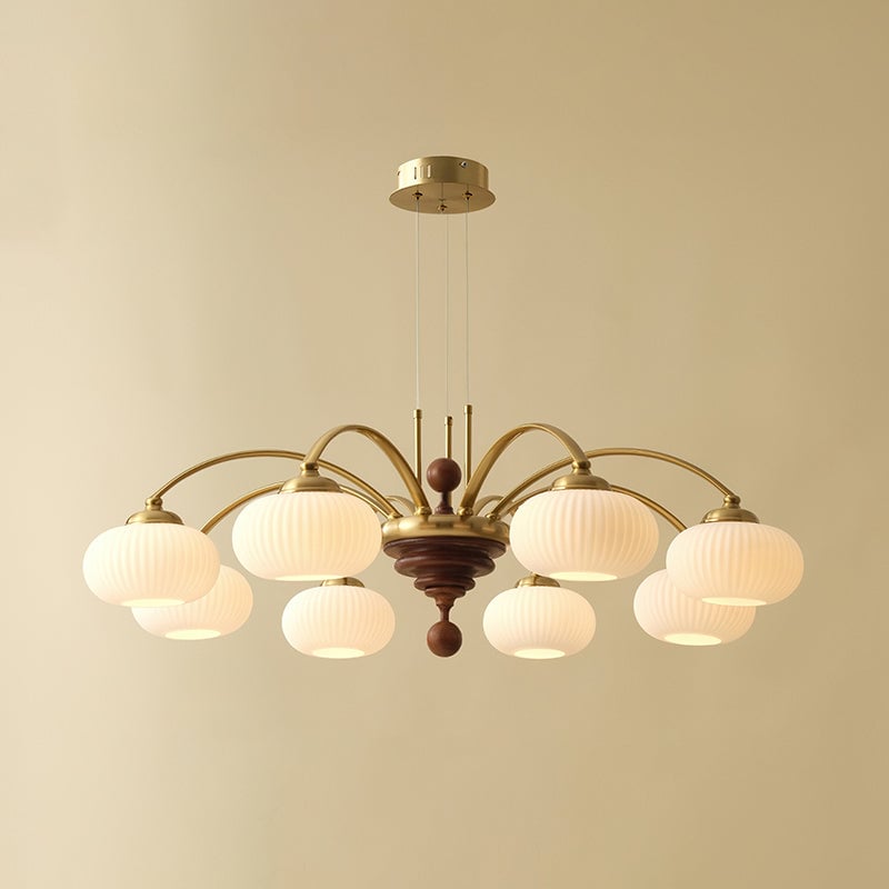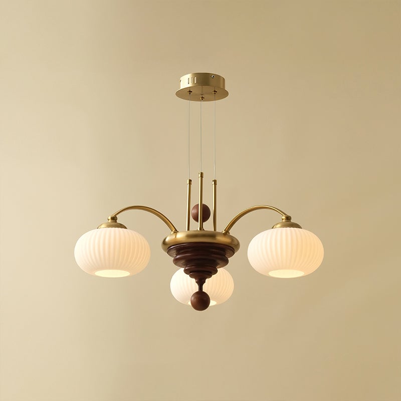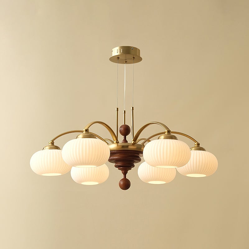The Tavelyn Chandelier from Mooijane draws inspiration from the harvest season, featuring gracefully curved metal arms that echo the sway of wheat stalks. Warm wood accents and polished metal elements evoke natural abundance, while a ribbed glass shade casts a soft, inviting glow. Ideal for dining rooms or living spaces, it harmoniously blends traditional charm with modern elegance.