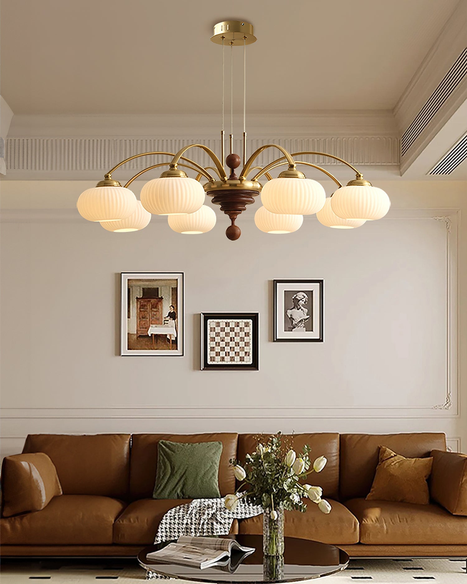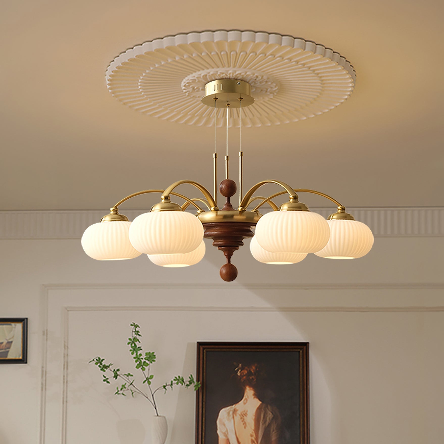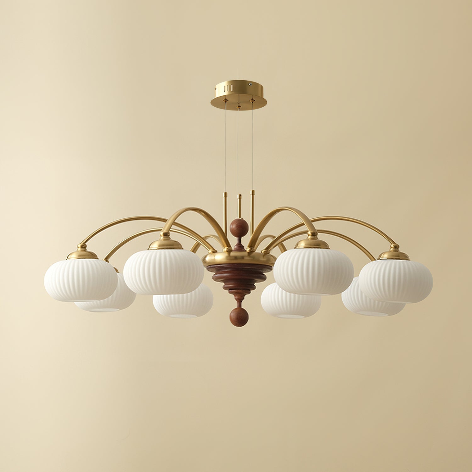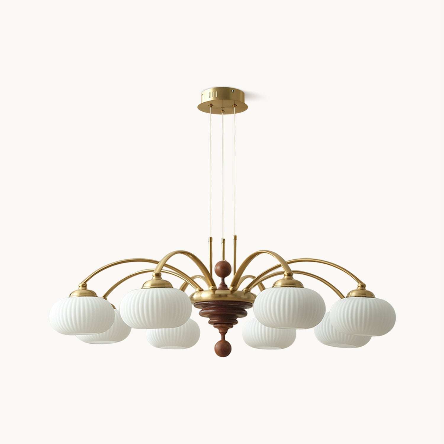The Tavelyn Chandelier from Mooijane draws inspiration from the harvest season, featuring gracefully curved metal arms that echo the sway of wheat stalks. Warm wood accents and polished metal elements evoke natural abundance, while a ribbed glass shade casts a soft, inviting glow. Ideal for dining rooms or living spaces, it harmoniously blends traditional charm with modern elegance.