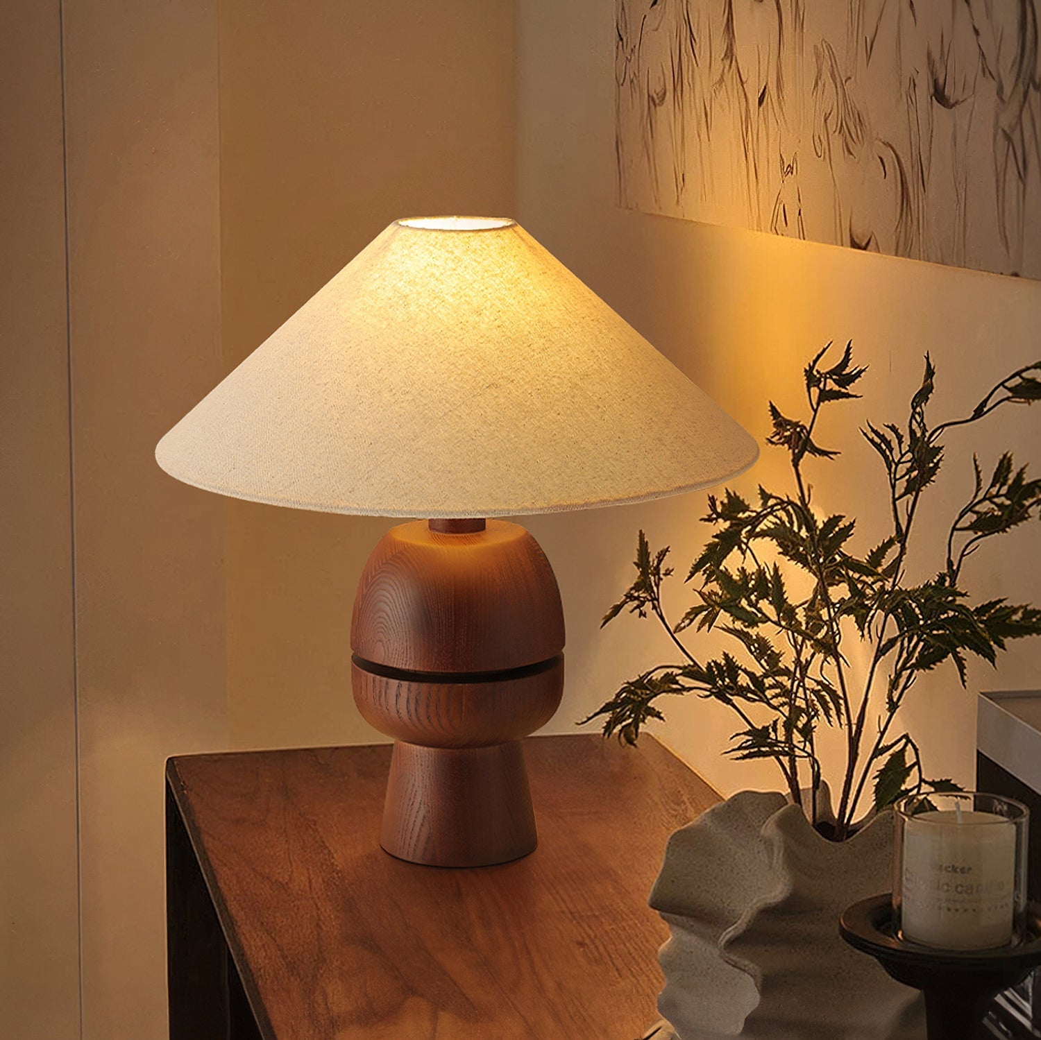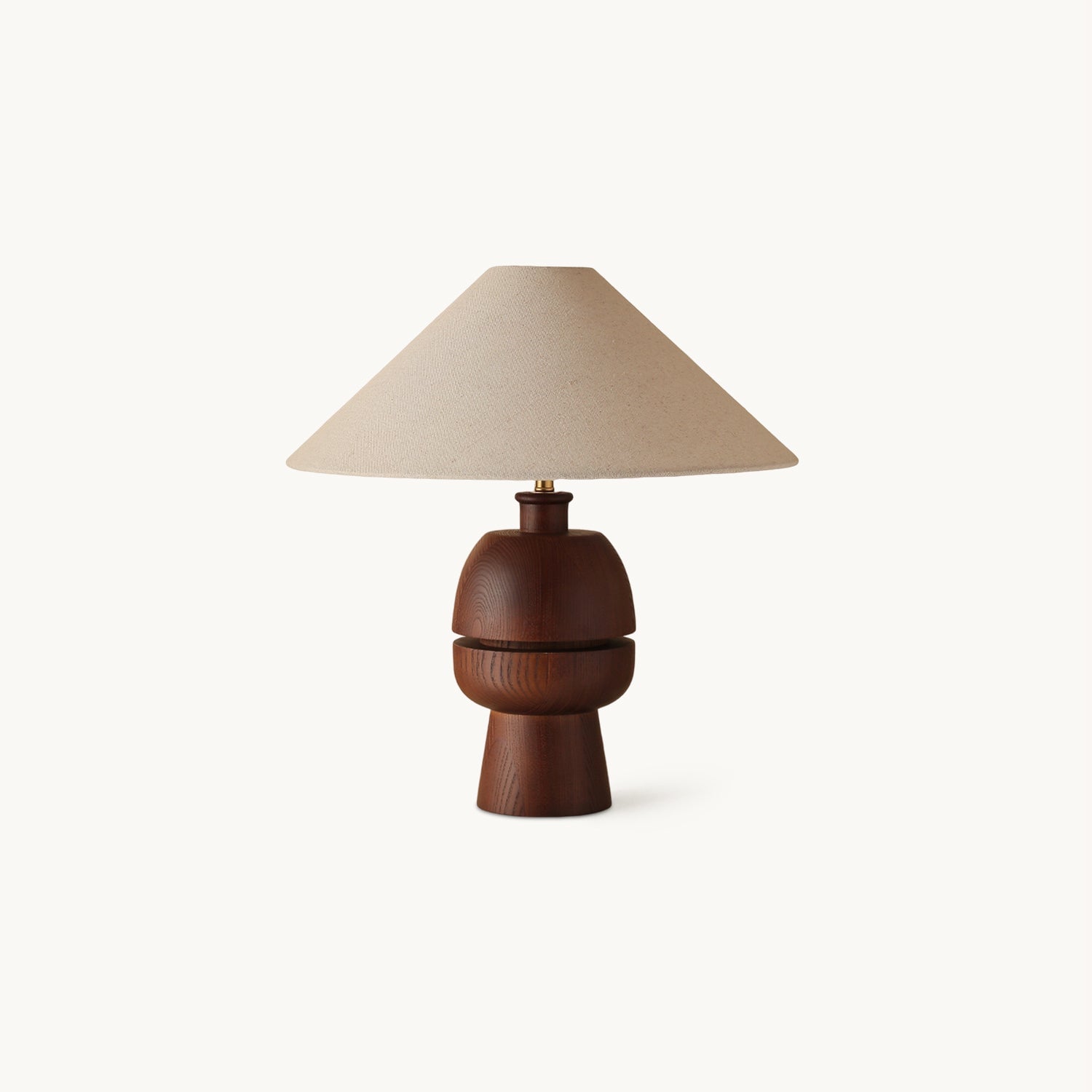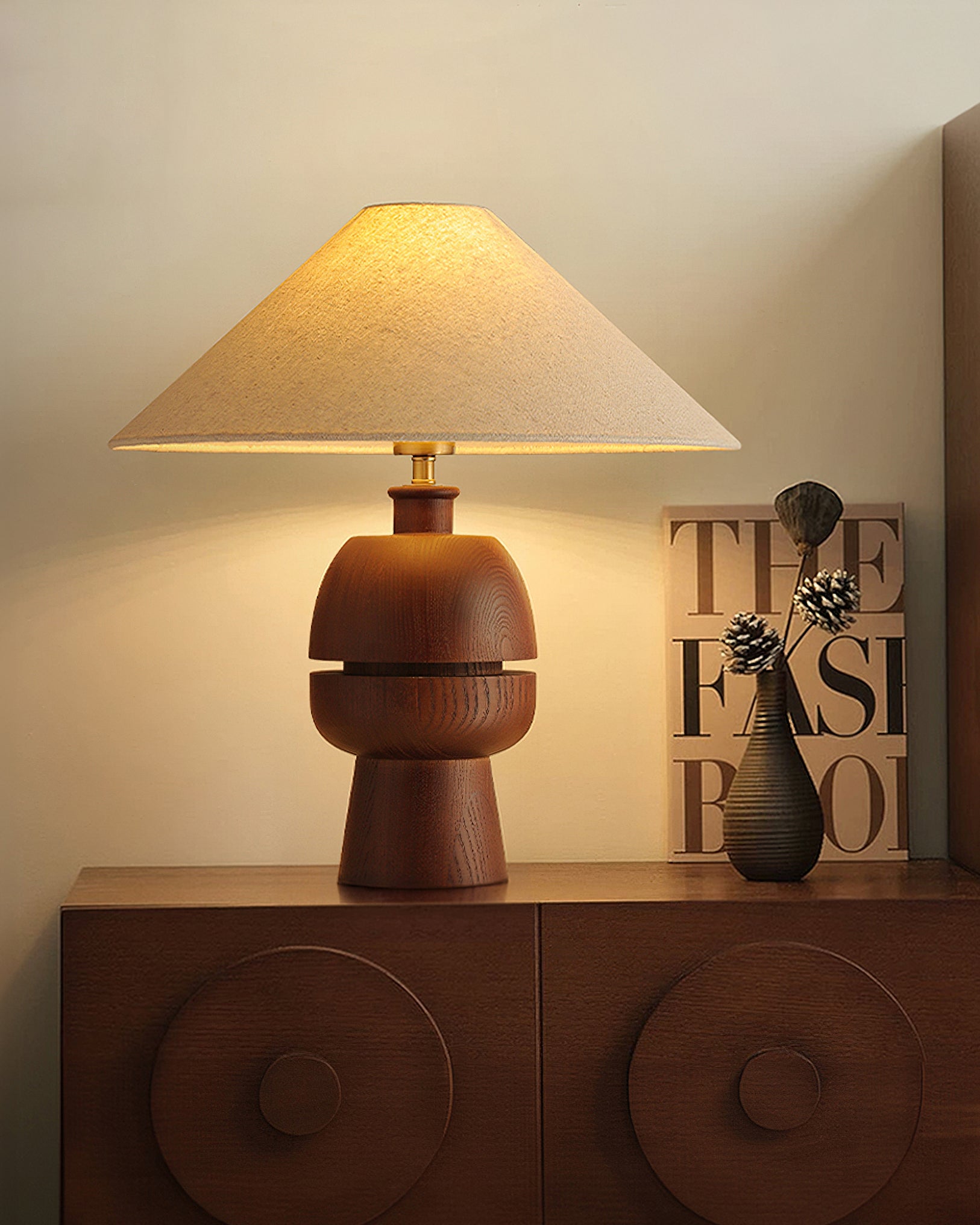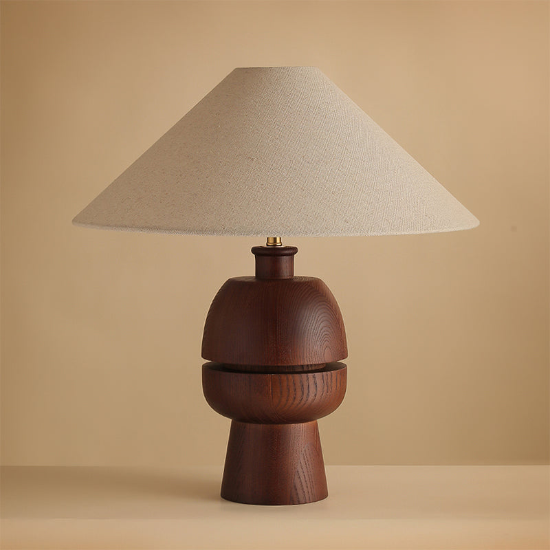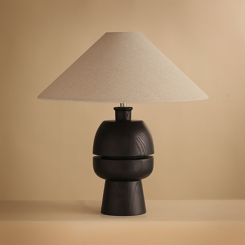 The Tenoro Table Lamp from Mooijane features a totem-inspired stacked wooden base paired with a wide cone fabric shade for serene, even illumination. Subtle grain details and rounded volumes evoke a handcrafted aesthetic, while the textured shade softens light to create a warm, inviting ambiance—perfect for bedrooms, living areas, or study spaces.
