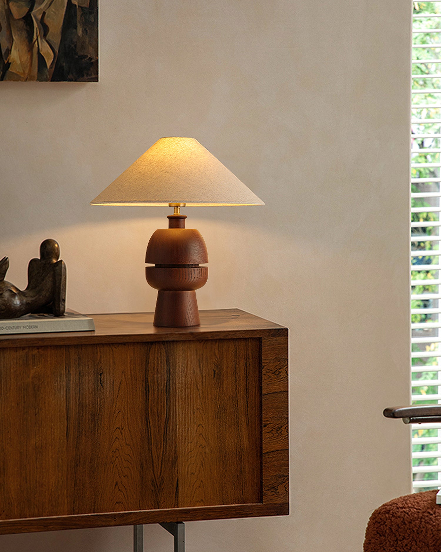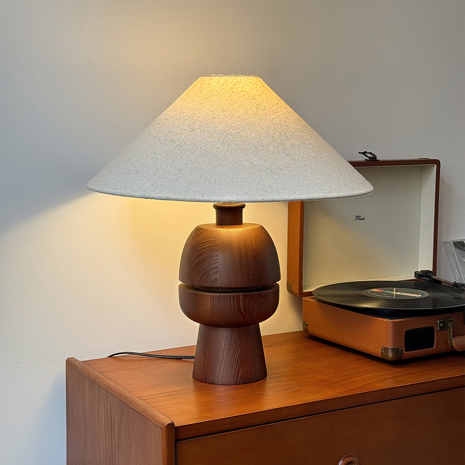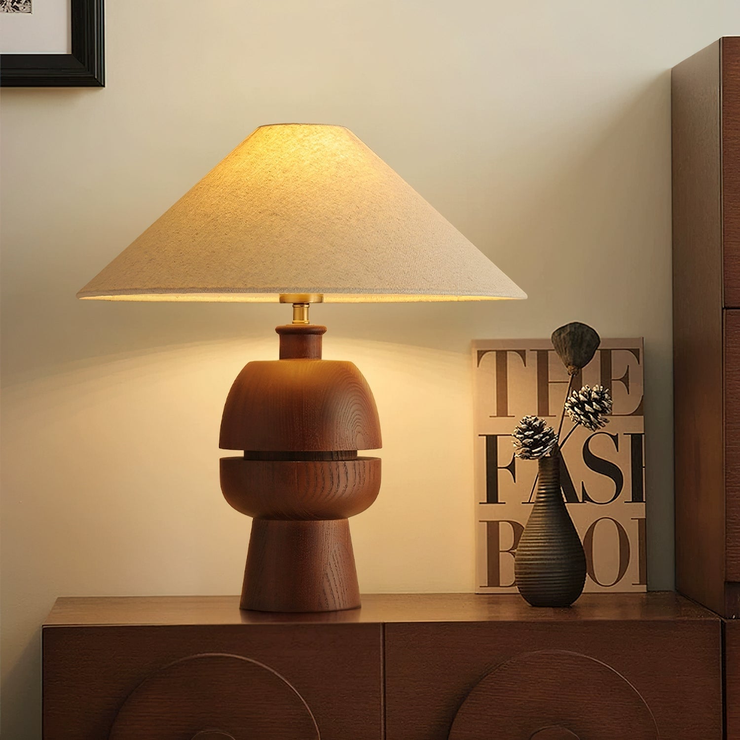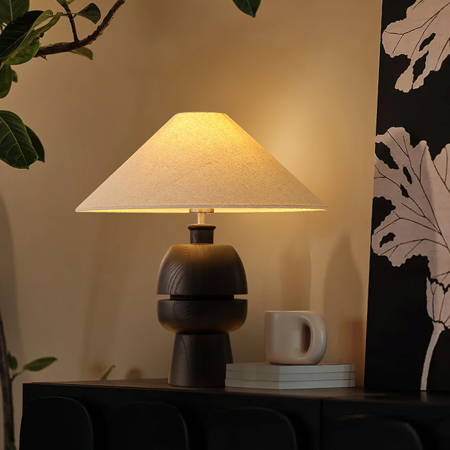 The Tenoro Table Lamp from Mooijane features a totem-inspired stacked wooden base paired with a wide cone fabric shade for serene, even illumination. Subtle grain details and rounded volumes evoke a handcrafted aesthetic, while the textured shade softens light to create a warm, inviting ambiance—perfect for bedrooms, living areas, or study spaces.