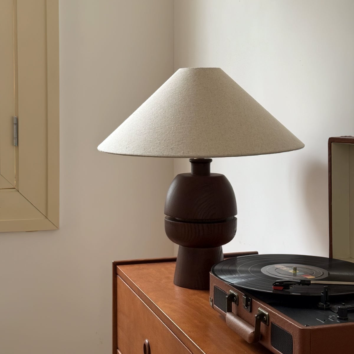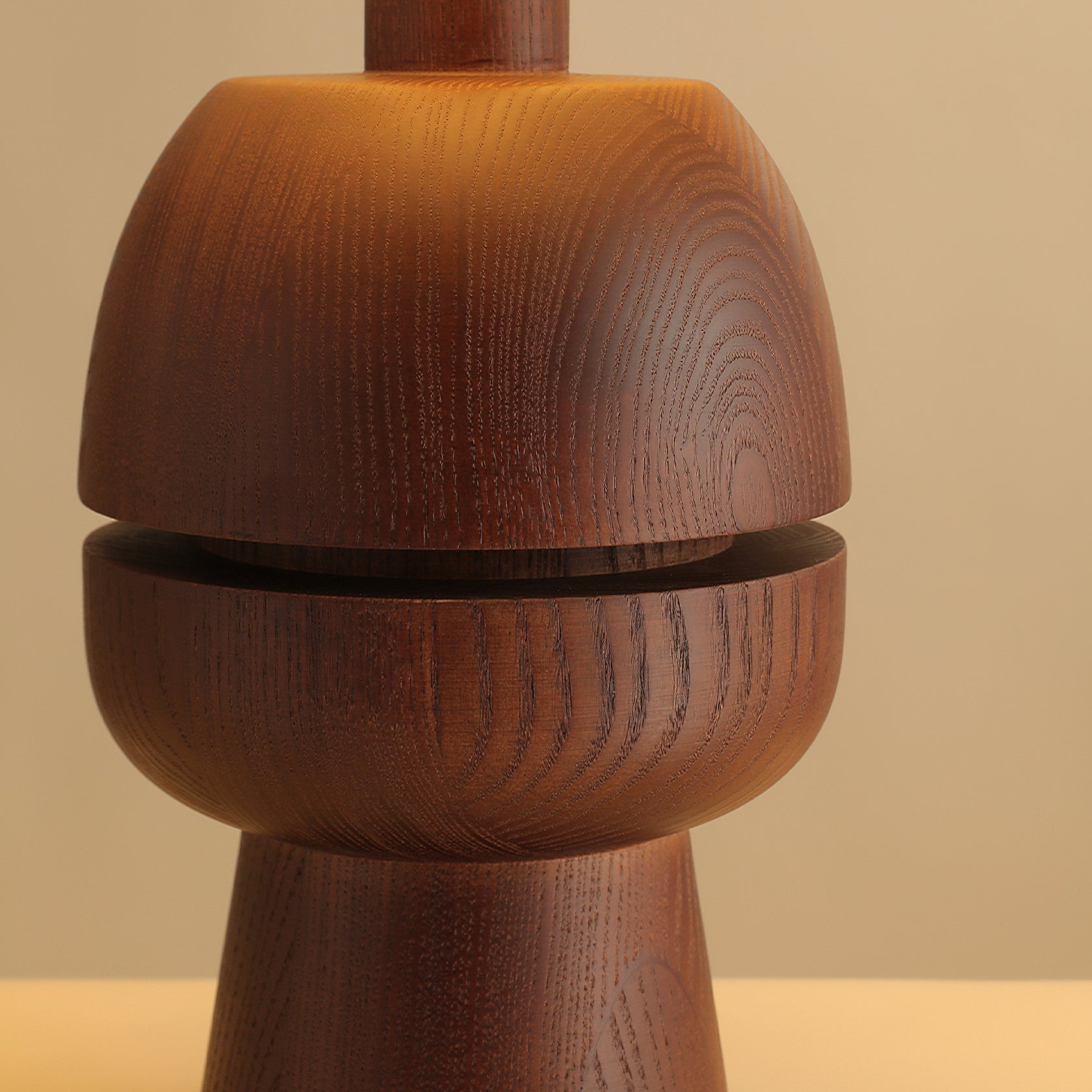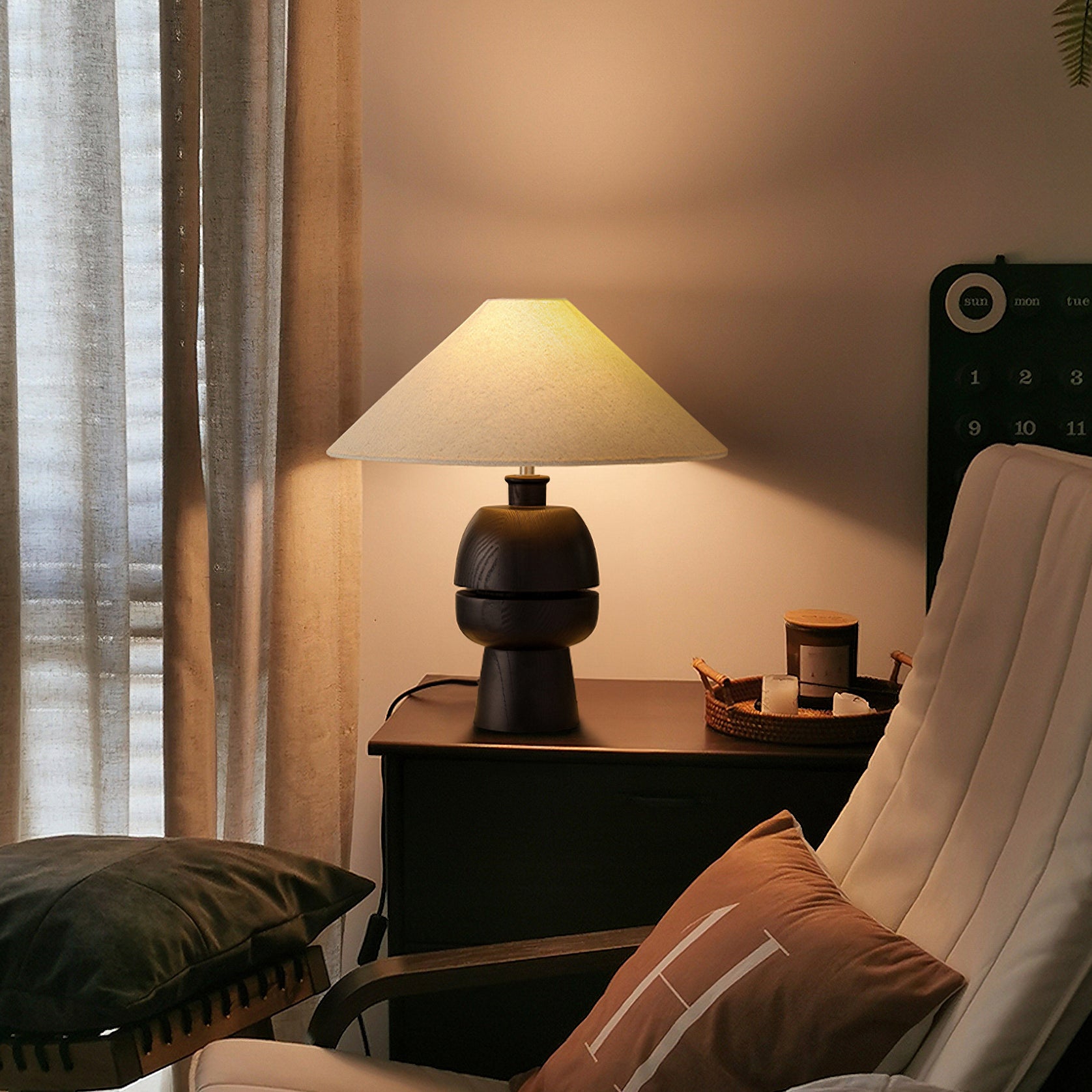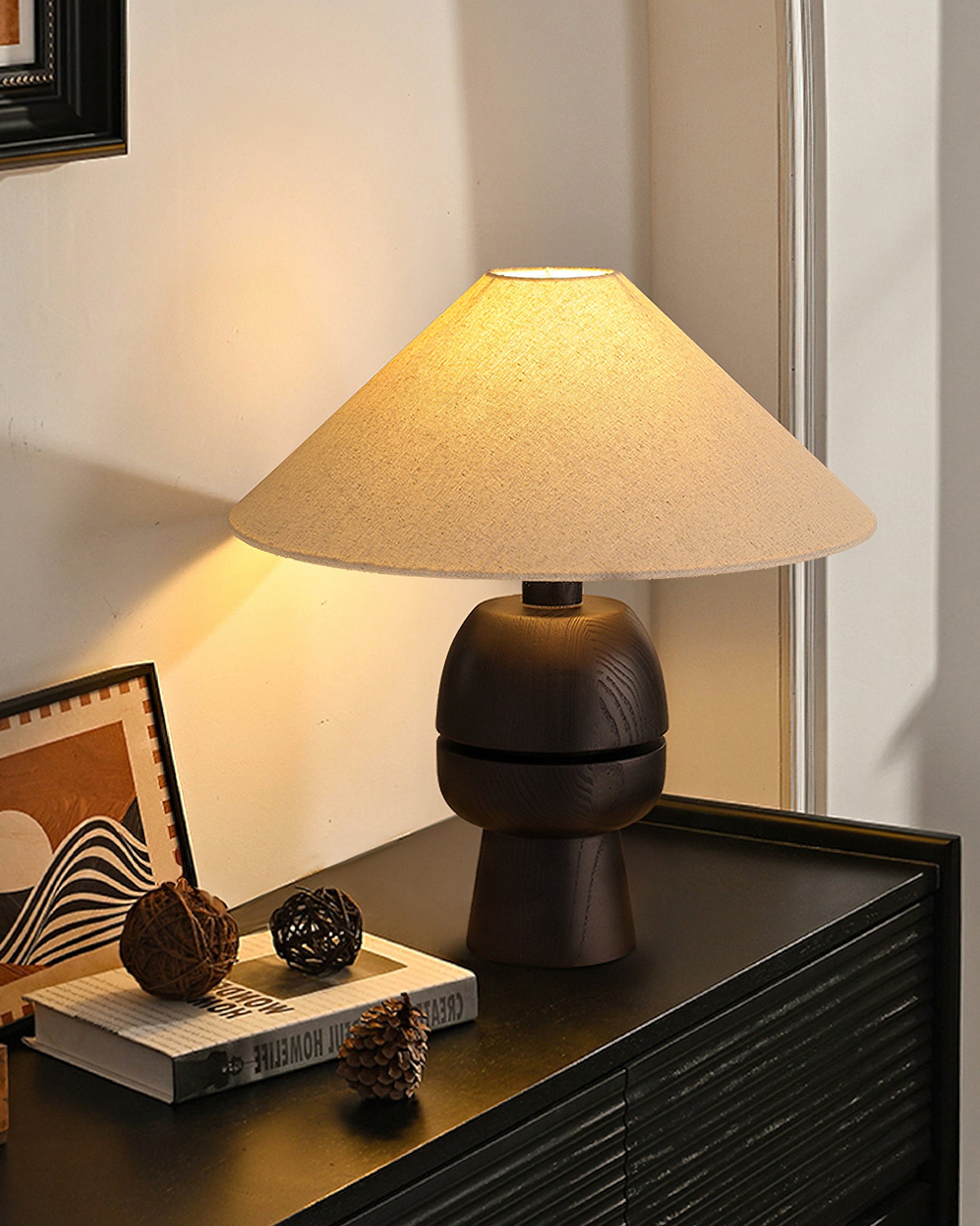The Tenoro Table Lamp from Mooijane features a totem-inspired stacked wooden base paired with a wide cone fabric shade for serene, even illumination. Subtle grain details and rounded volumes evoke a handcrafted aesthetic, while the textured shade softens light to create a warm, inviting ambiance—perfect for bedrooms, living areas, or study spaces.