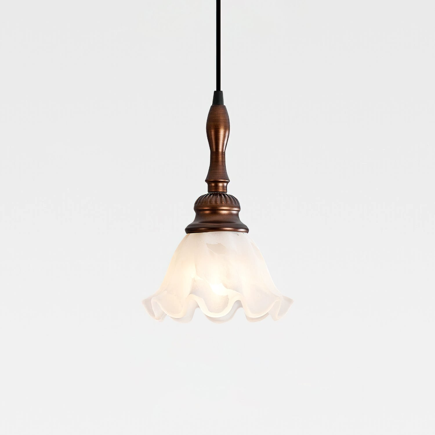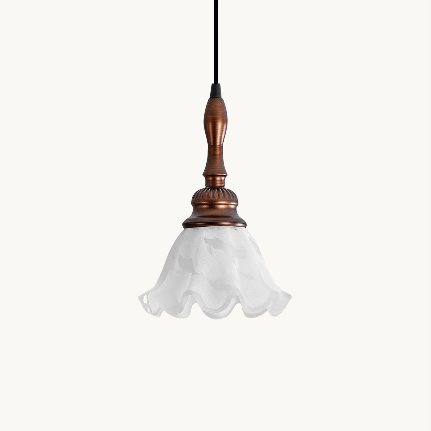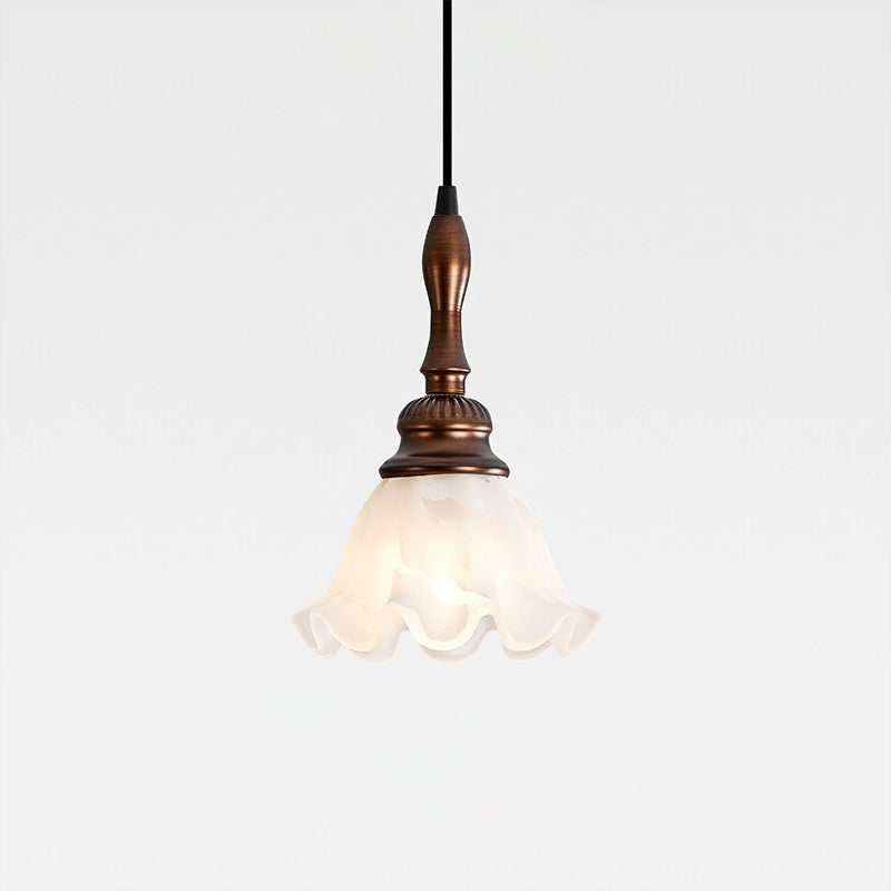 The Tessira Pendant Lamp from Mooijane features a sleek metal stem supporting an elegant ruffled glass shade. Frosted glass softly diffuses light, creating a warm, inviting glow, while a wooden base adds natural contrast. Subtle curves enhance its vintage charm, making it perfect for kitchens, dining rooms, or cozy corners—blending refined aesthetics with functional illumination.