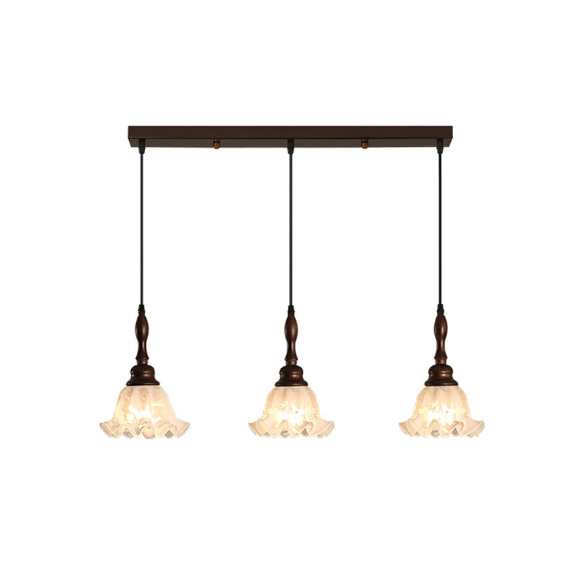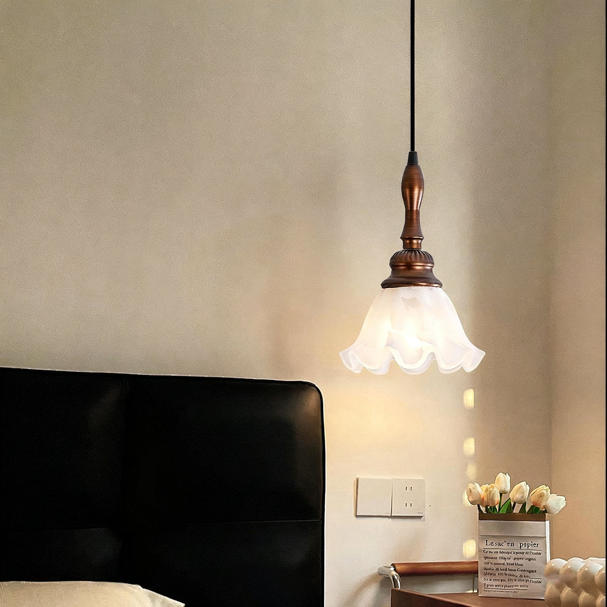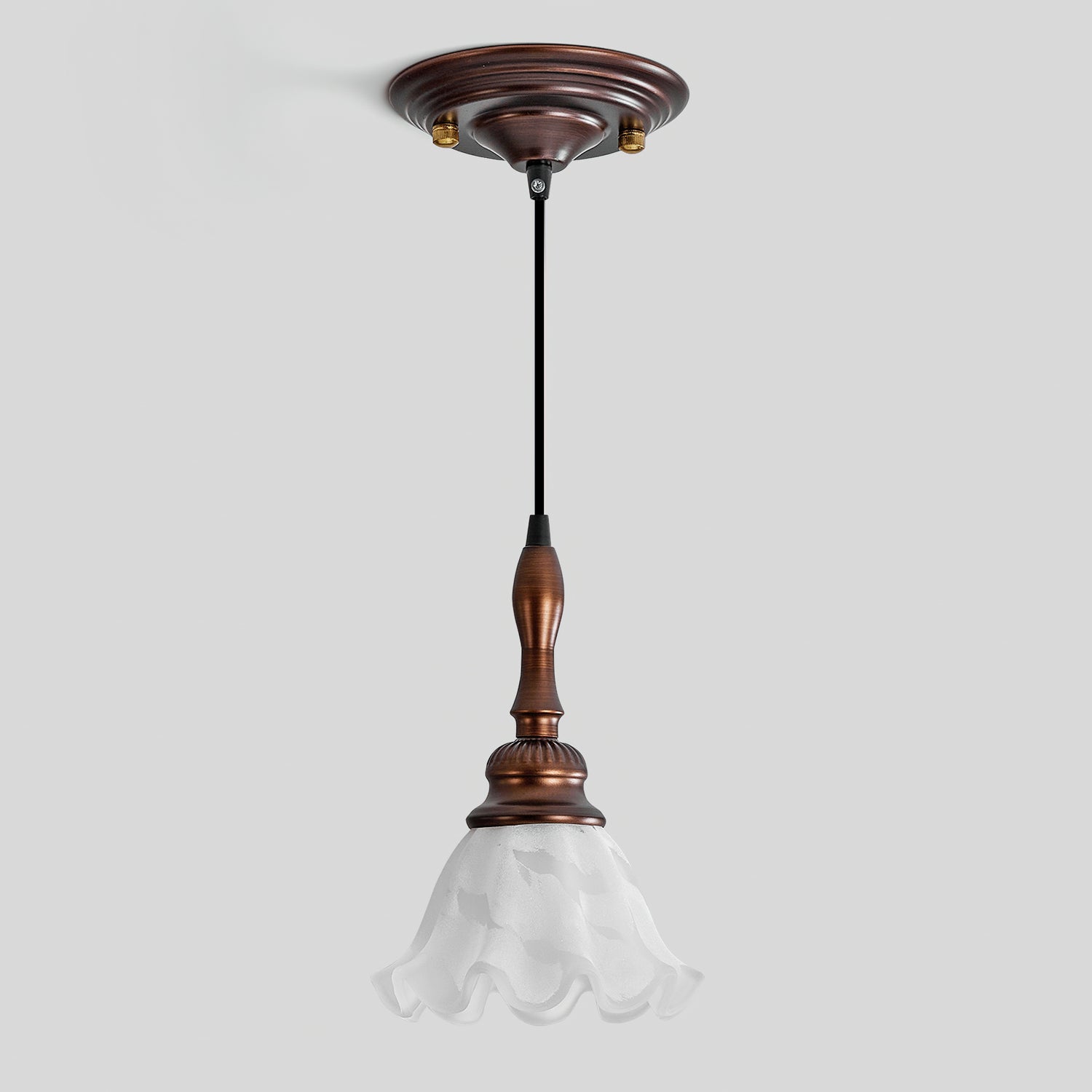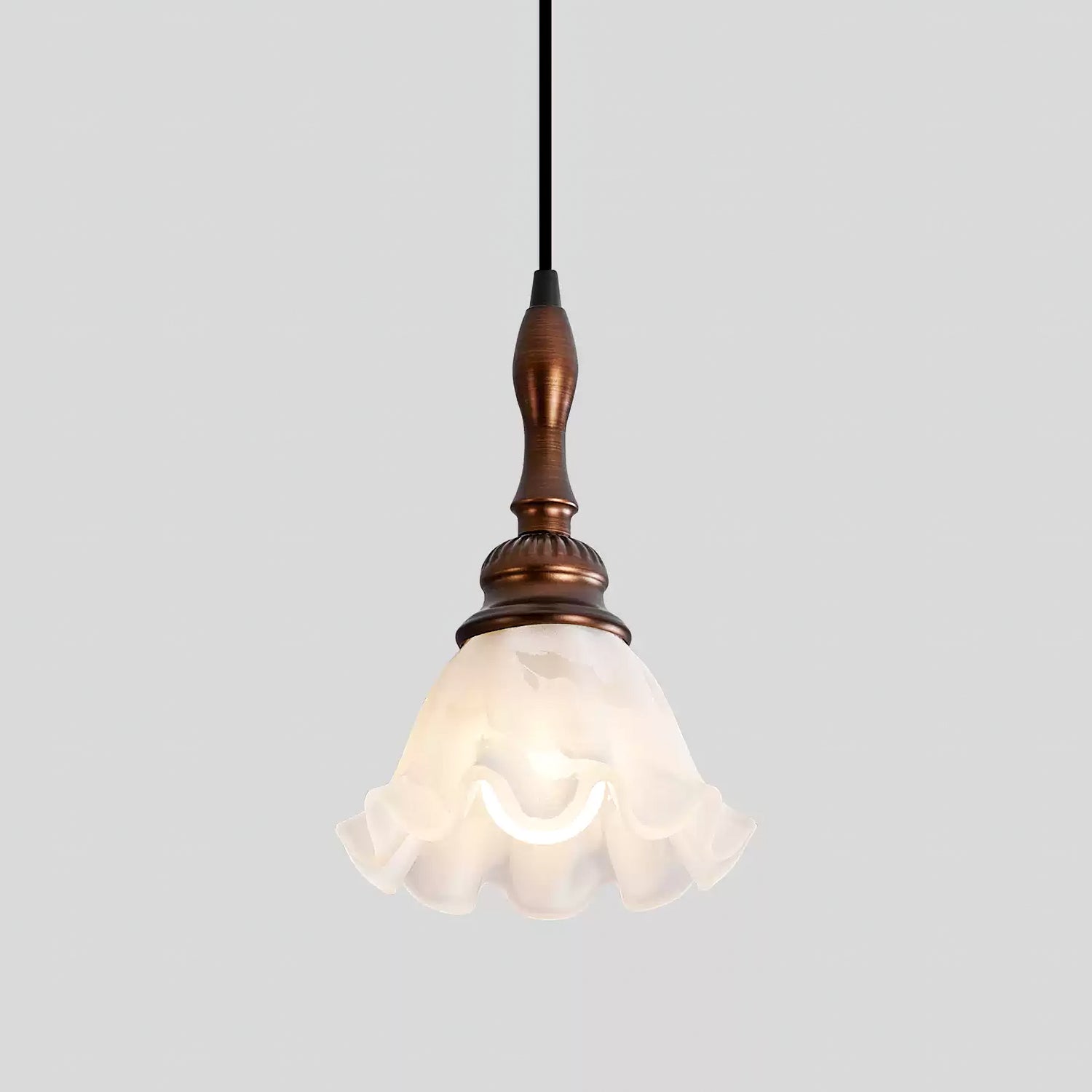 The Tessira Pendant Lamp from Mooijane features a sleek metal stem supporting an elegant ruffled glass shade. Frosted glass softly diffuses light, creating a warm, inviting glow, while a wooden base adds natural contrast. Subtle curves enhance its vintage charm, making it perfect for kitchens, dining rooms, or cozy corners—blending refined aesthetics with functional illumination.