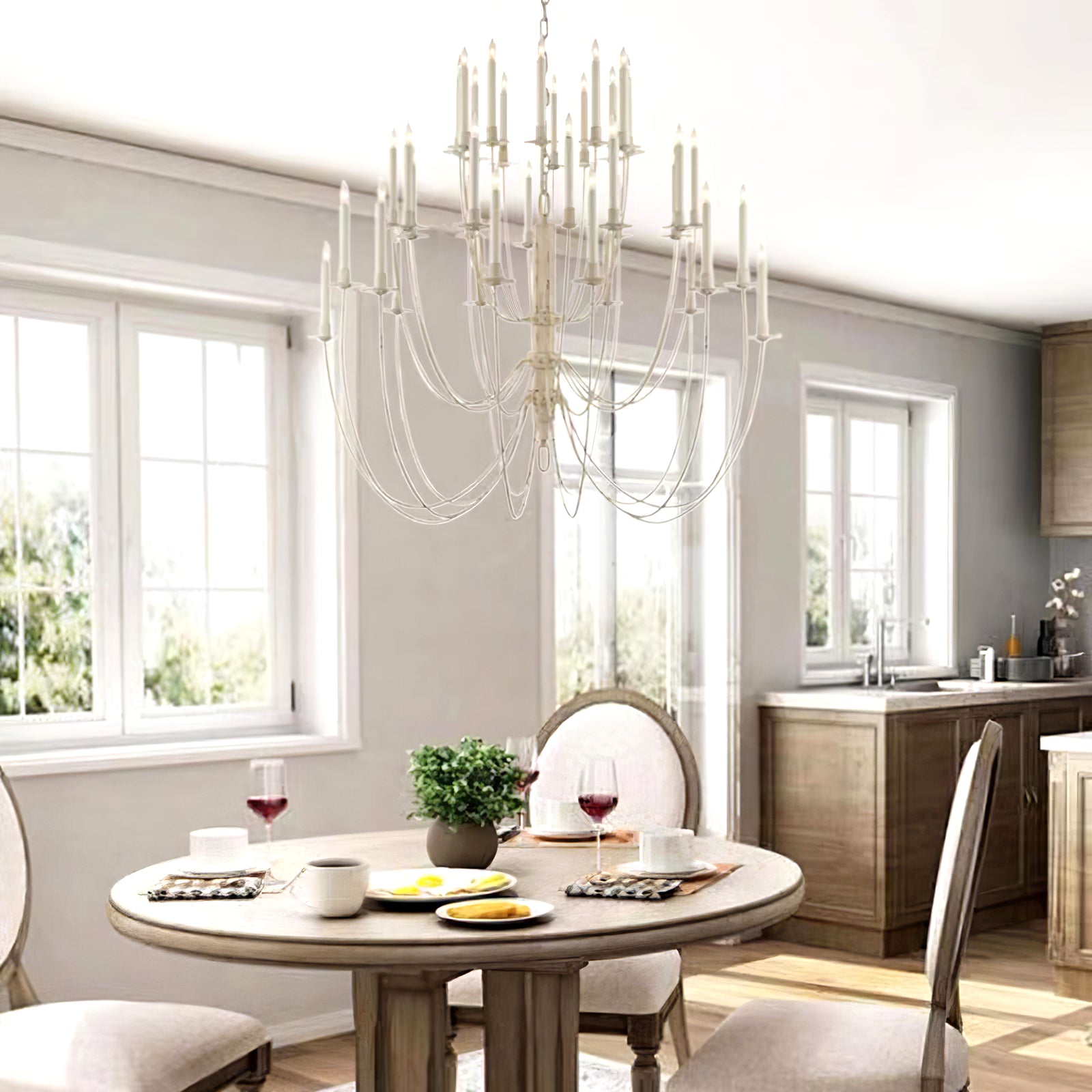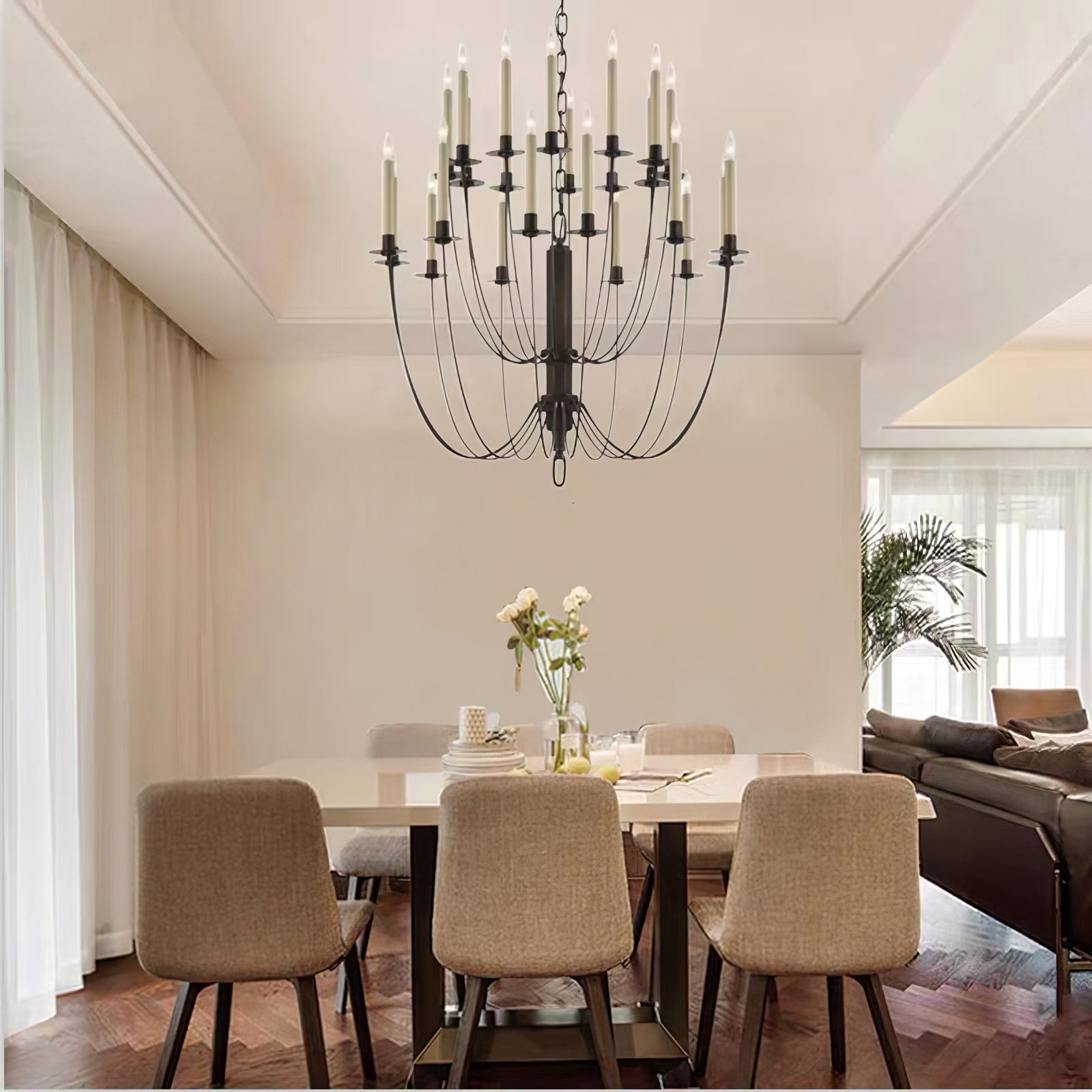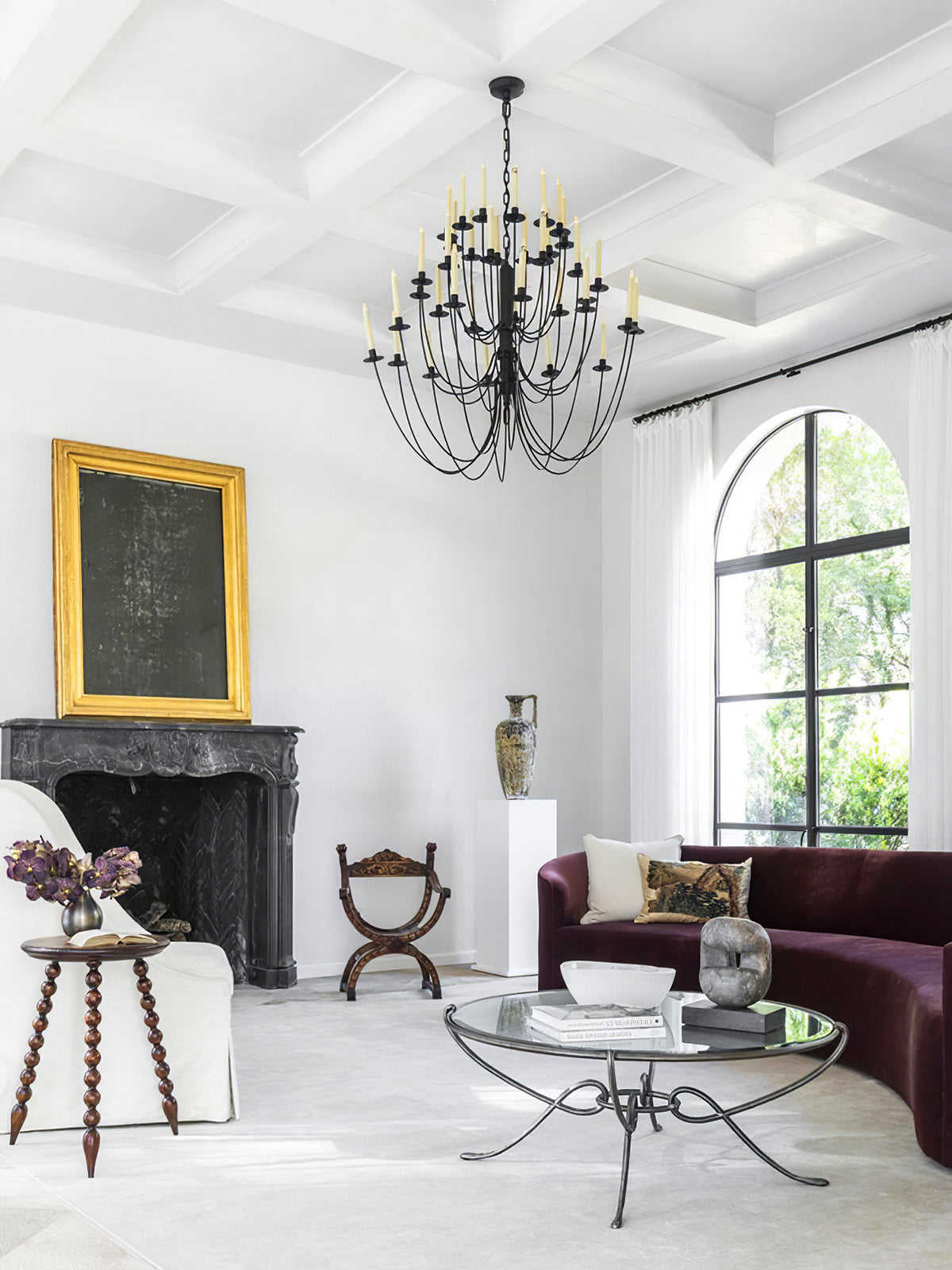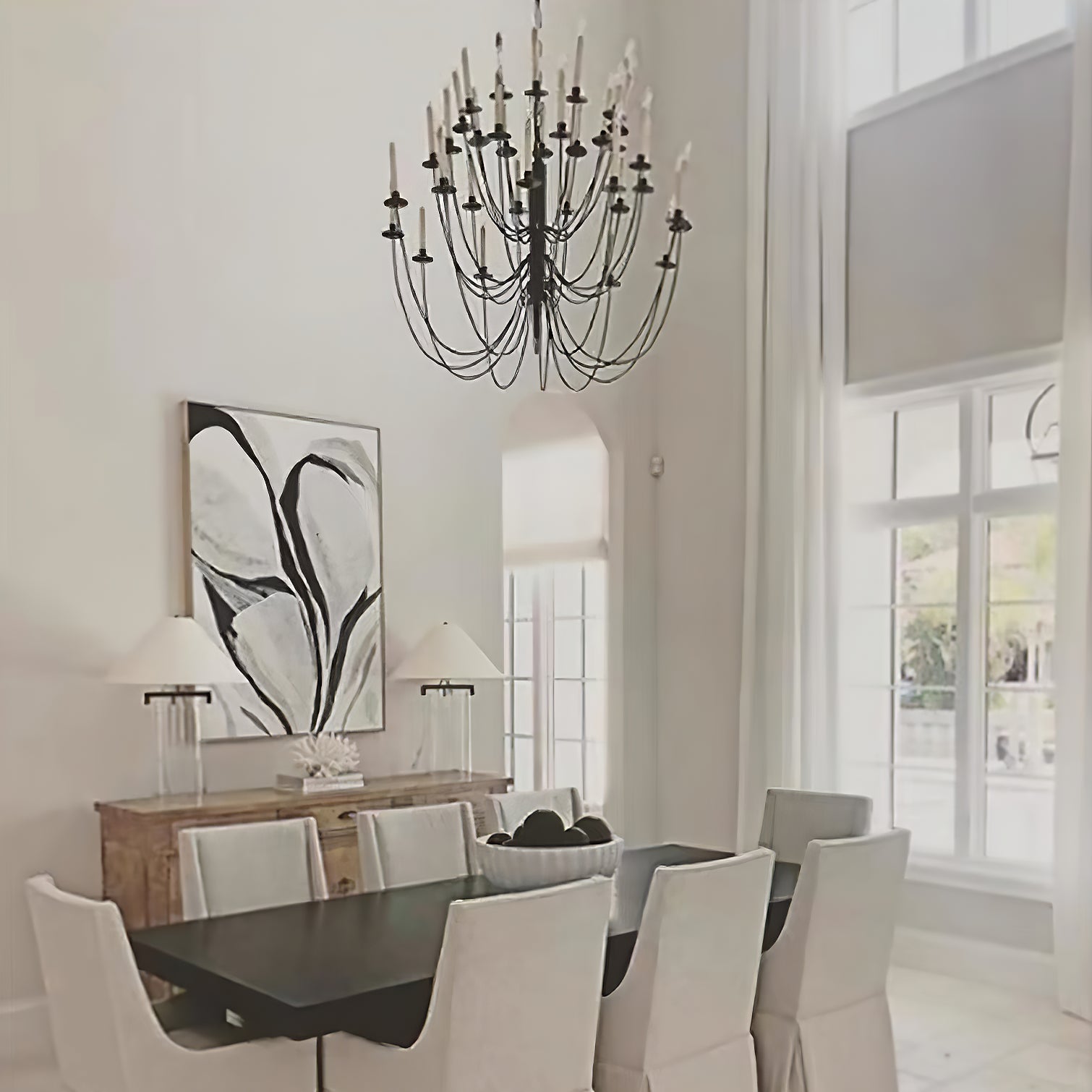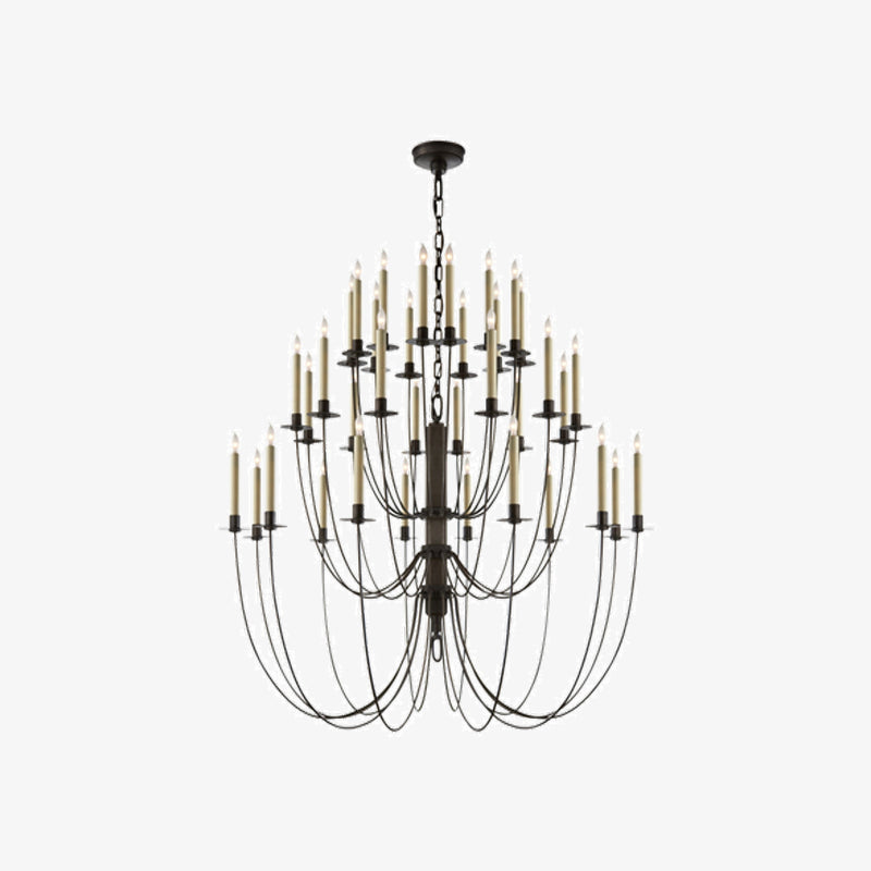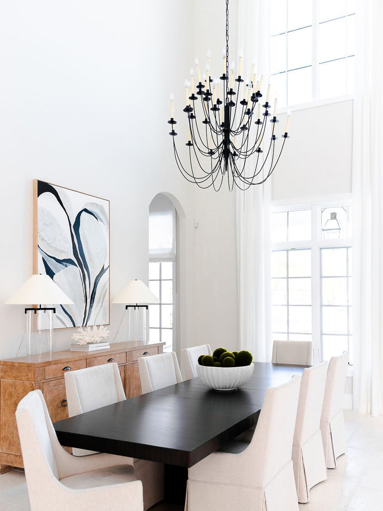 Introducing the Thomas OBrien Erika Chandelier - a bold and classic addition to your interior space. Curved arms support candle-style lights with exposed bulbs, casting a warm and inviting glow. Elevate your room with this beautifully designed chandelier.