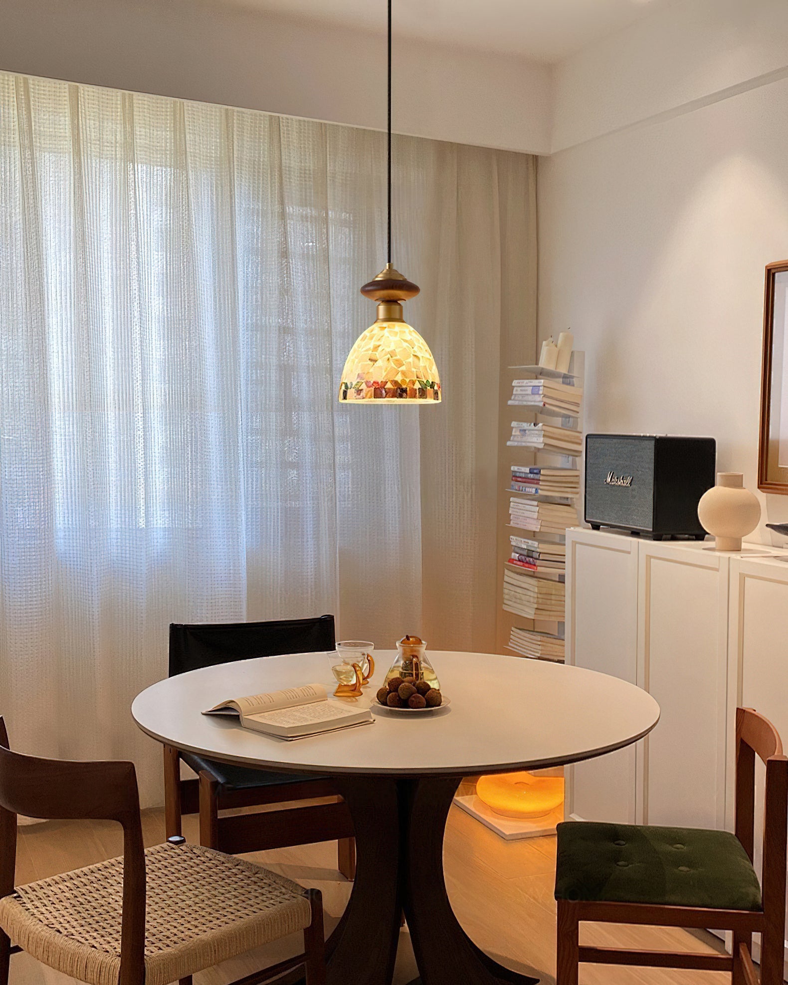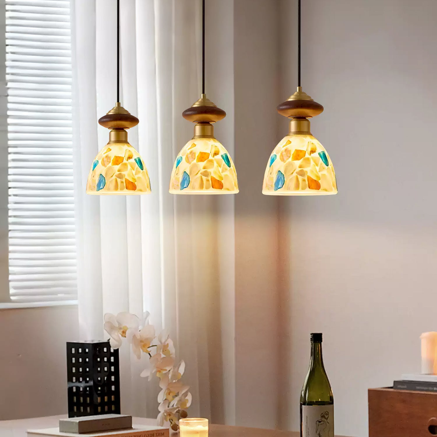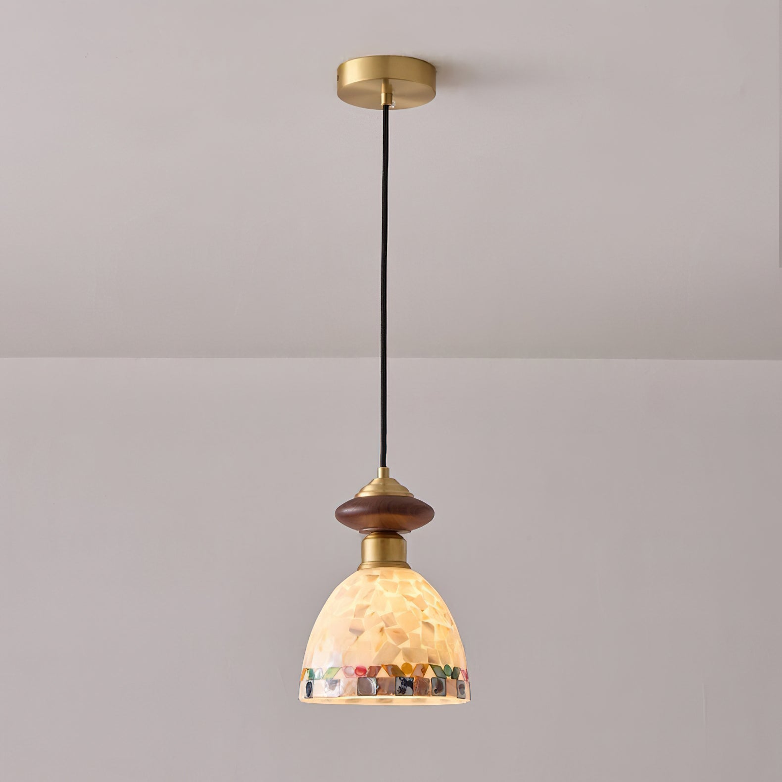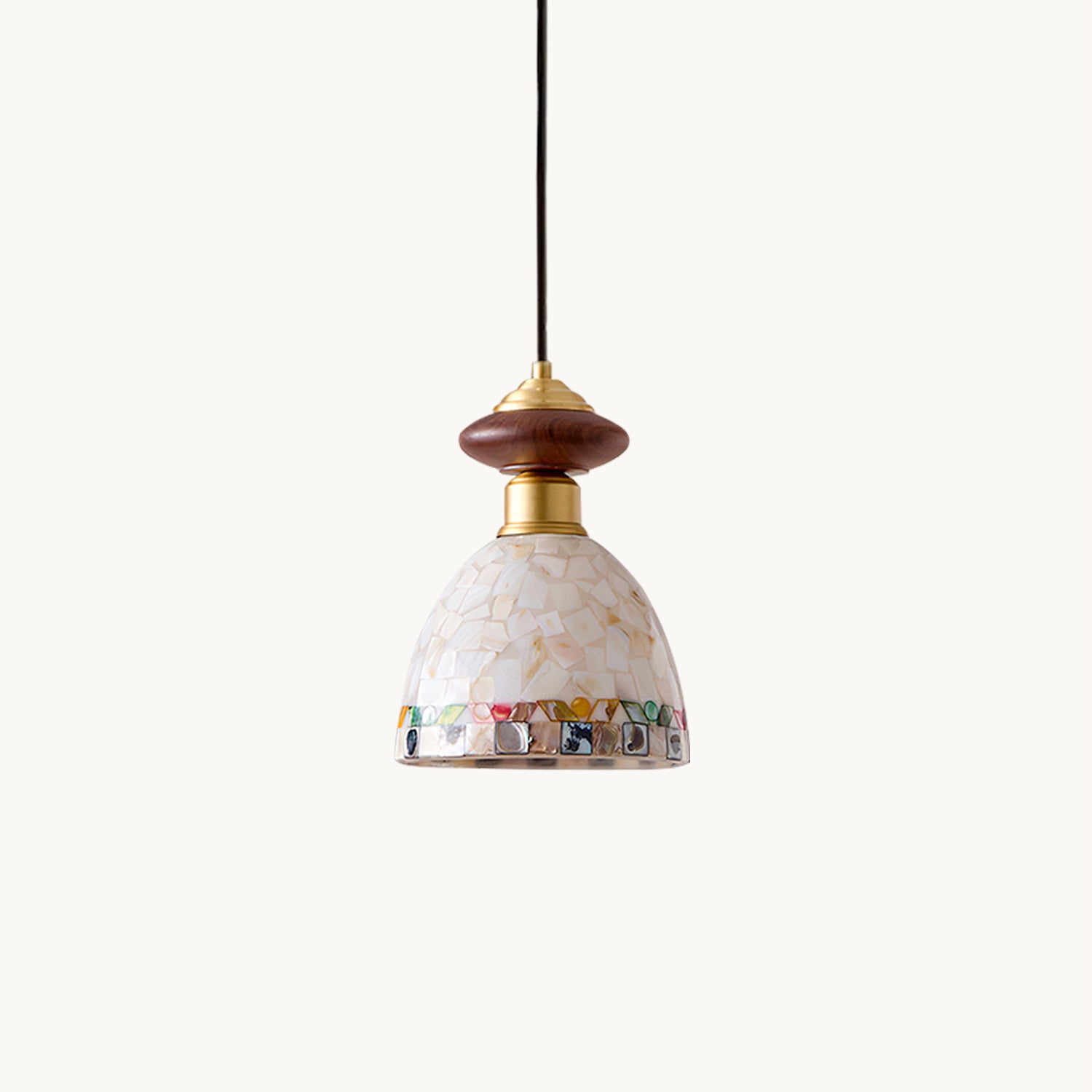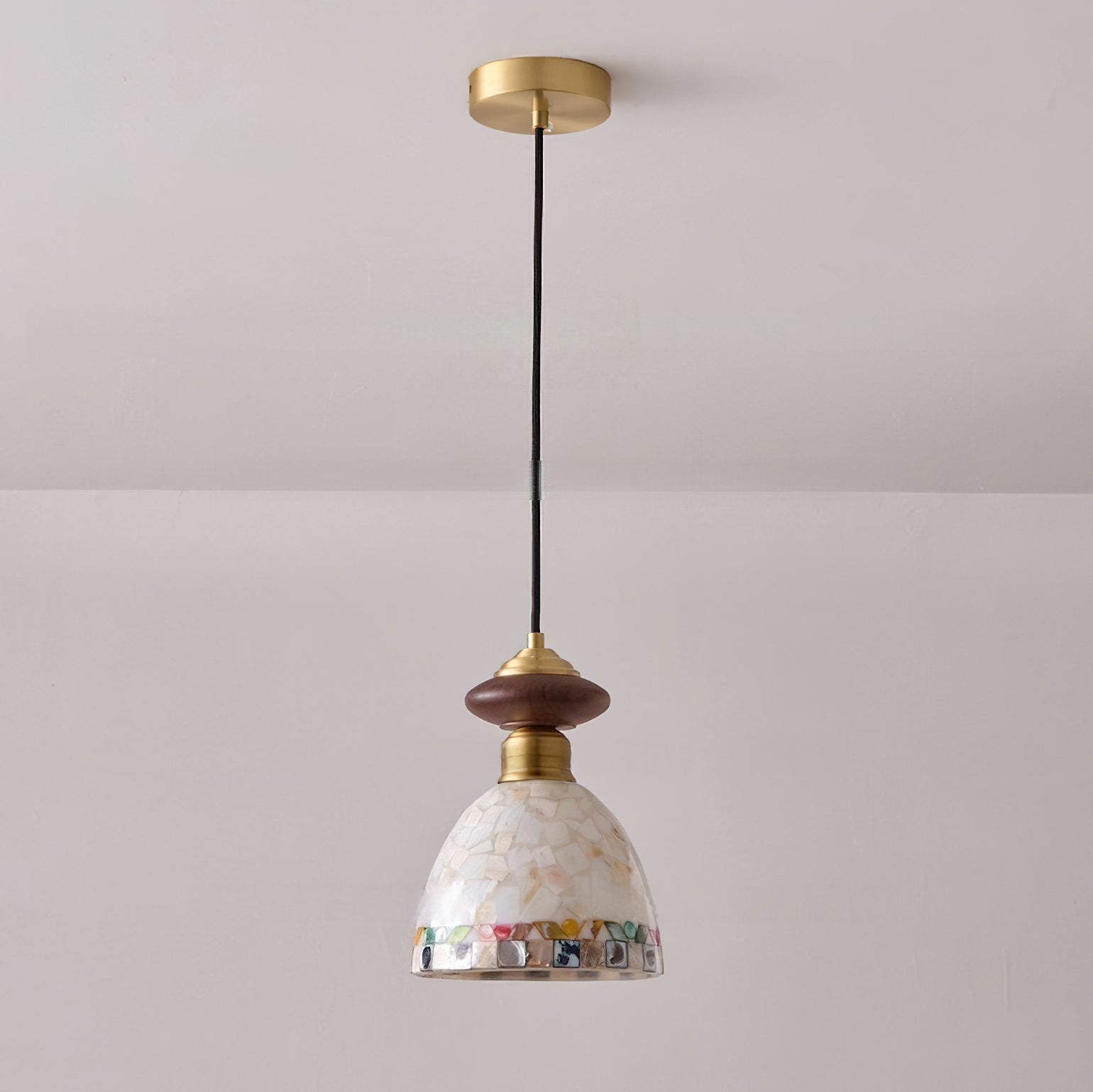 The Tivora Pendant Lamp by Mooijane showcases a sculptural design that blends warmth, texture, and color. Its handcrafted shade is inlaid with irregular, multicolored shell fragments that shimmer like glass when lit, creating a soft, luminous glow. Suspended by a matte gold fixture, the design is completed with a rich wood accent for added depth and elegance. Perfect for dining areas, hallways, or bedside settings, Tivora brings artistic character and timeless charm to any space.