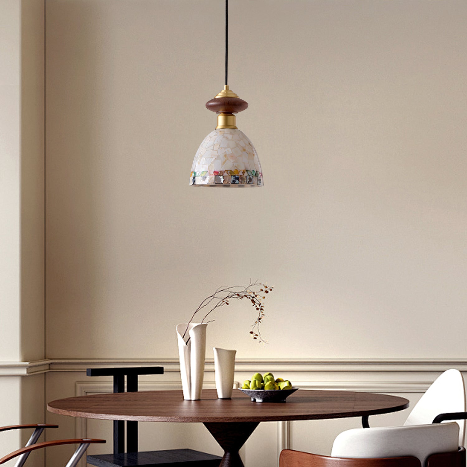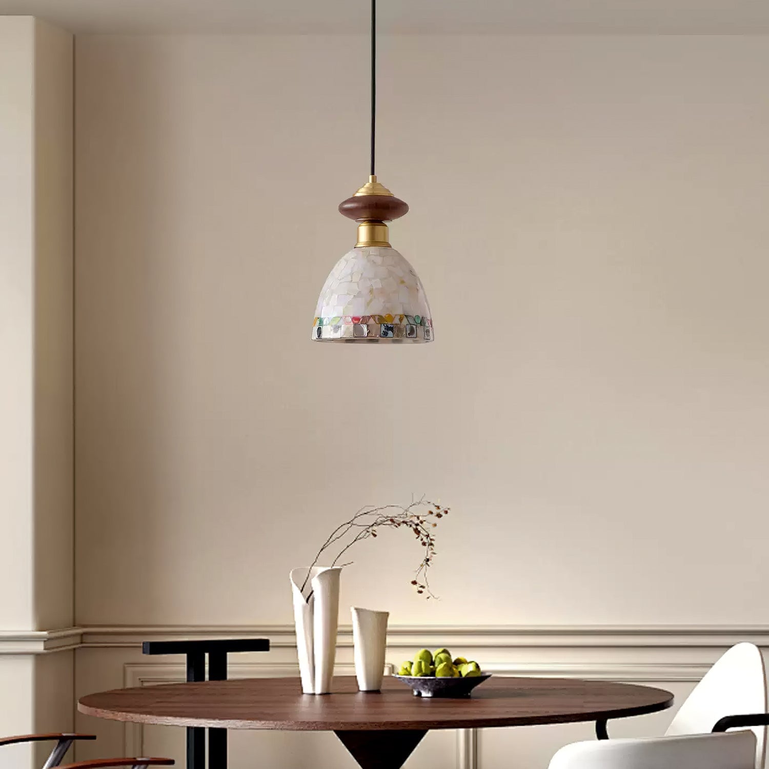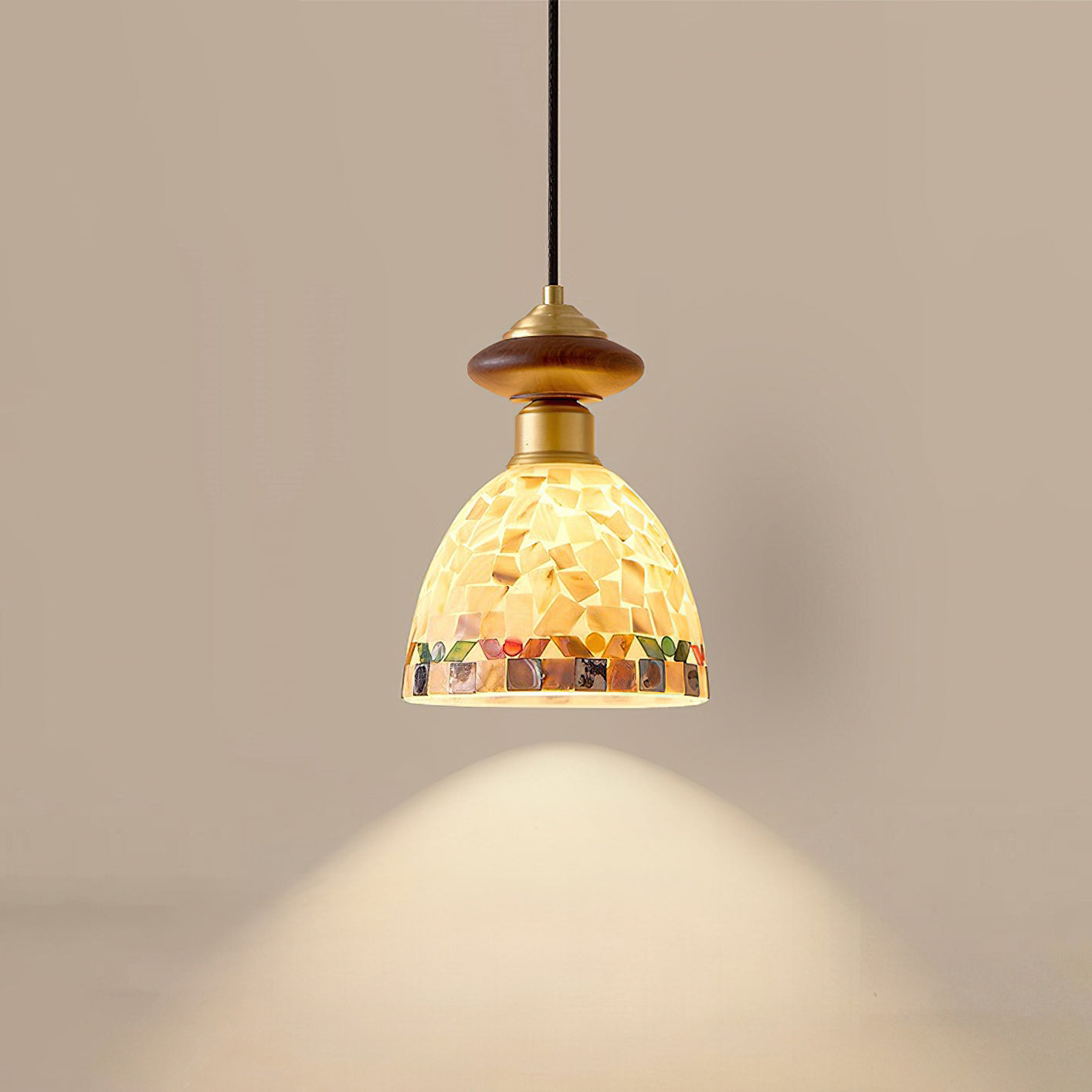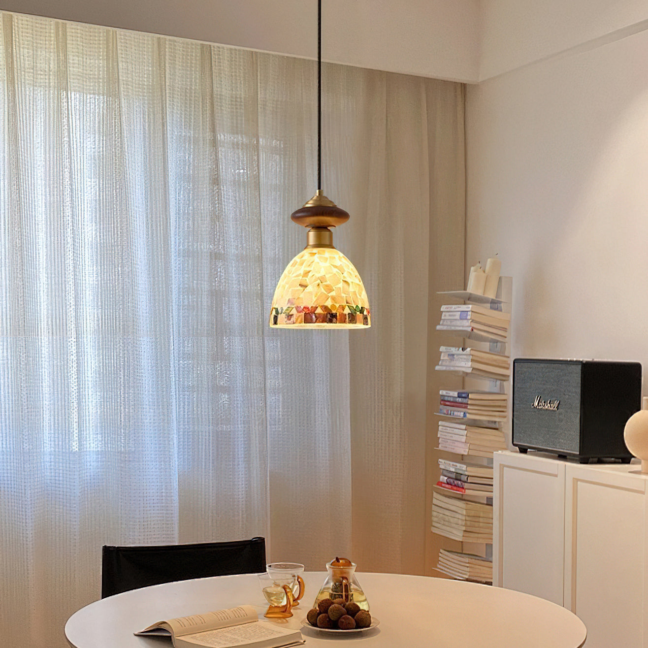 The Tivora Pendant Lamp by Mooijane showcases a sculptural design that blends warmth, texture, and color. Its handcrafted shade is inlaid with irregular, multicolored shell fragments that shimmer like glass when lit, creating a soft, luminous glow. Suspended by a matte gold fixture, the design is completed with a rich wood accent for added depth and elegance. Perfect for dining areas, hallways, or bedside settings, Tivora brings artistic character and timeless charm to any space.