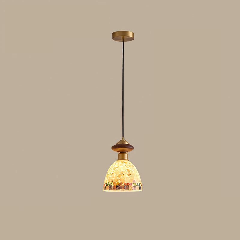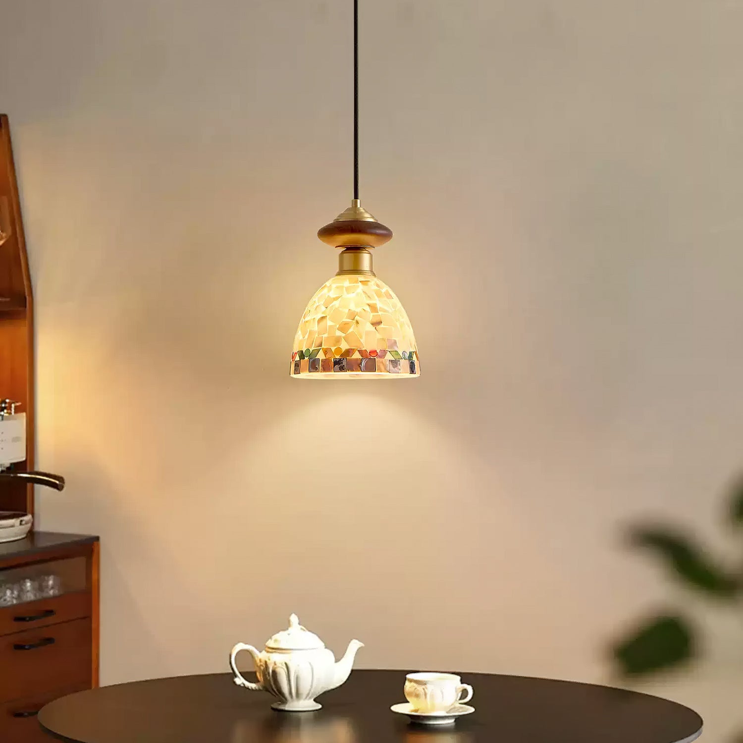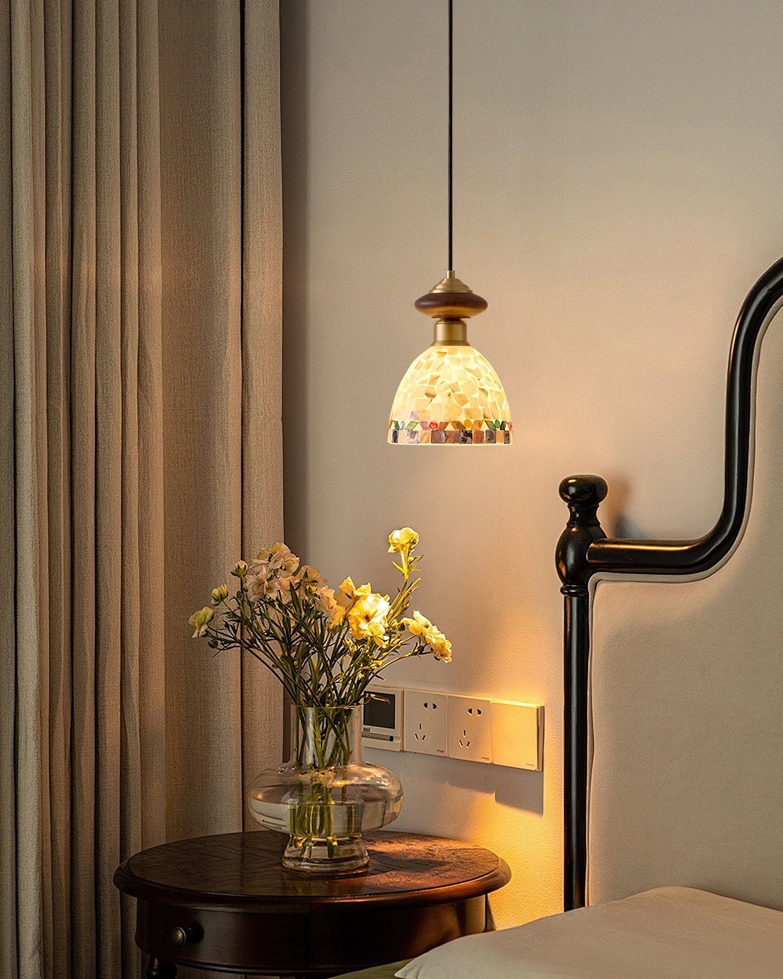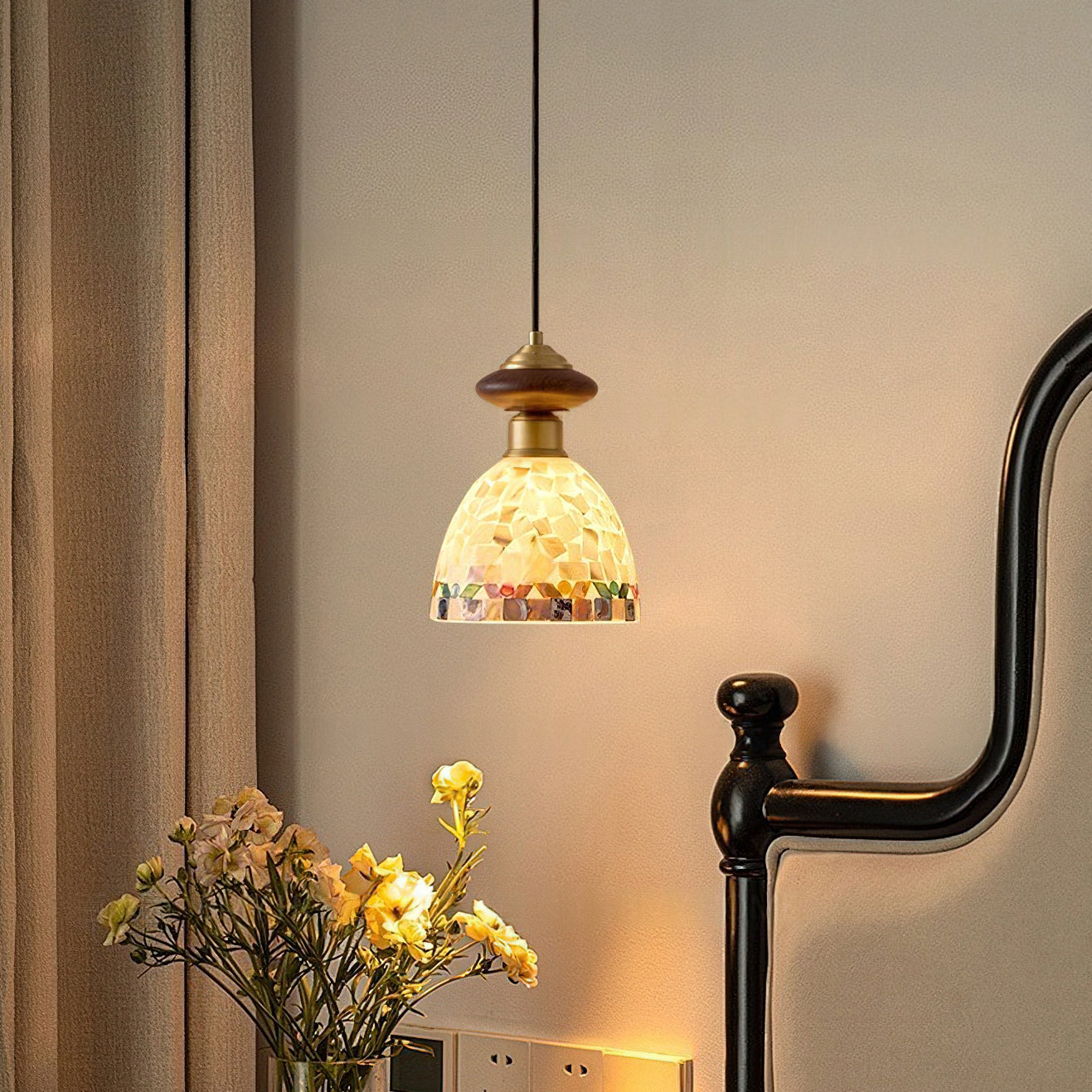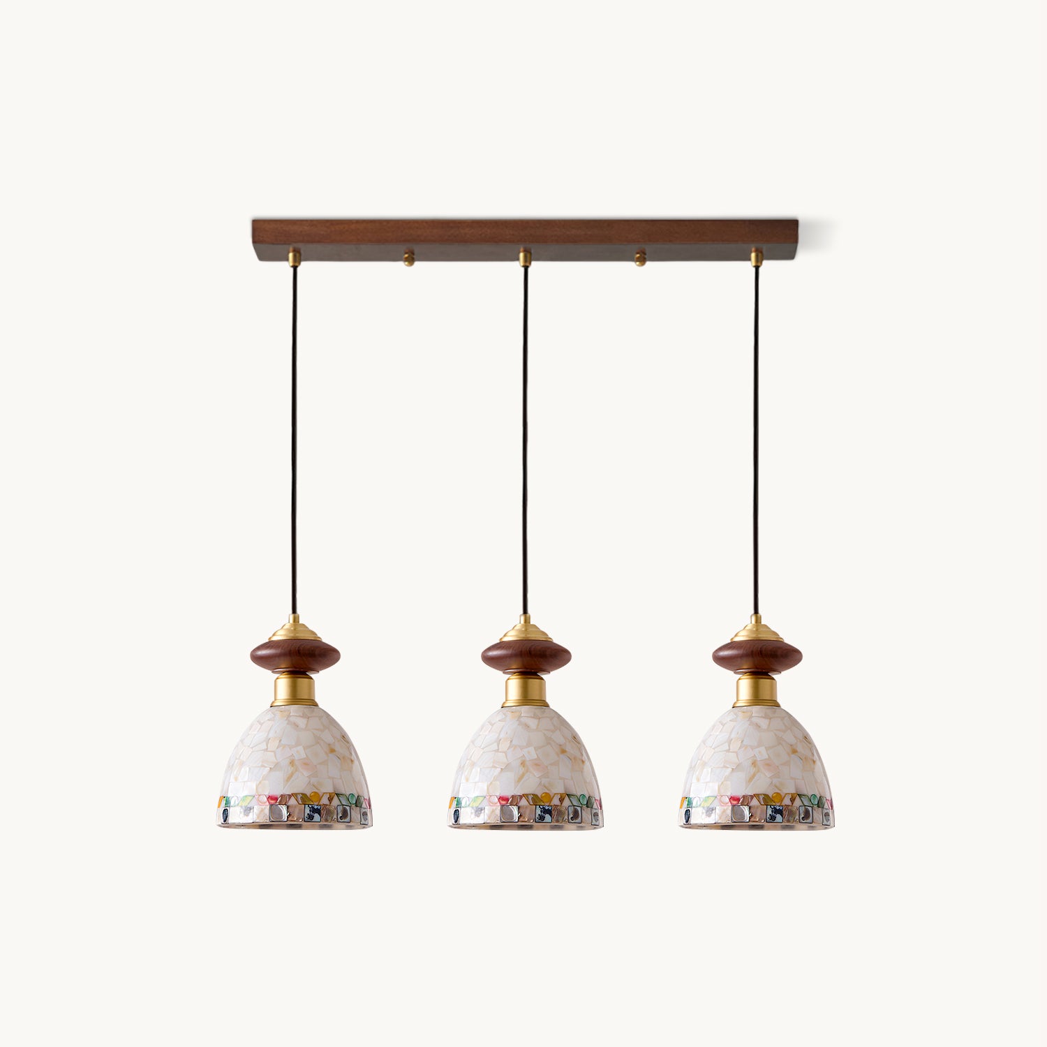 The Tivora Pendant Lamp by Mooijane showcases a sculptural design that blends warmth, texture, and color. Its handcrafted shade is inlaid with irregular, multicolored shell fragments that shimmer like glass when lit, creating a soft, luminous glow. Suspended by a matte gold fixture, the design is completed with a rich wood accent for added depth and elegance. Perfect for dining areas, hallways, or bedside settings, Tivora brings artistic character and timeless charm to any space.
