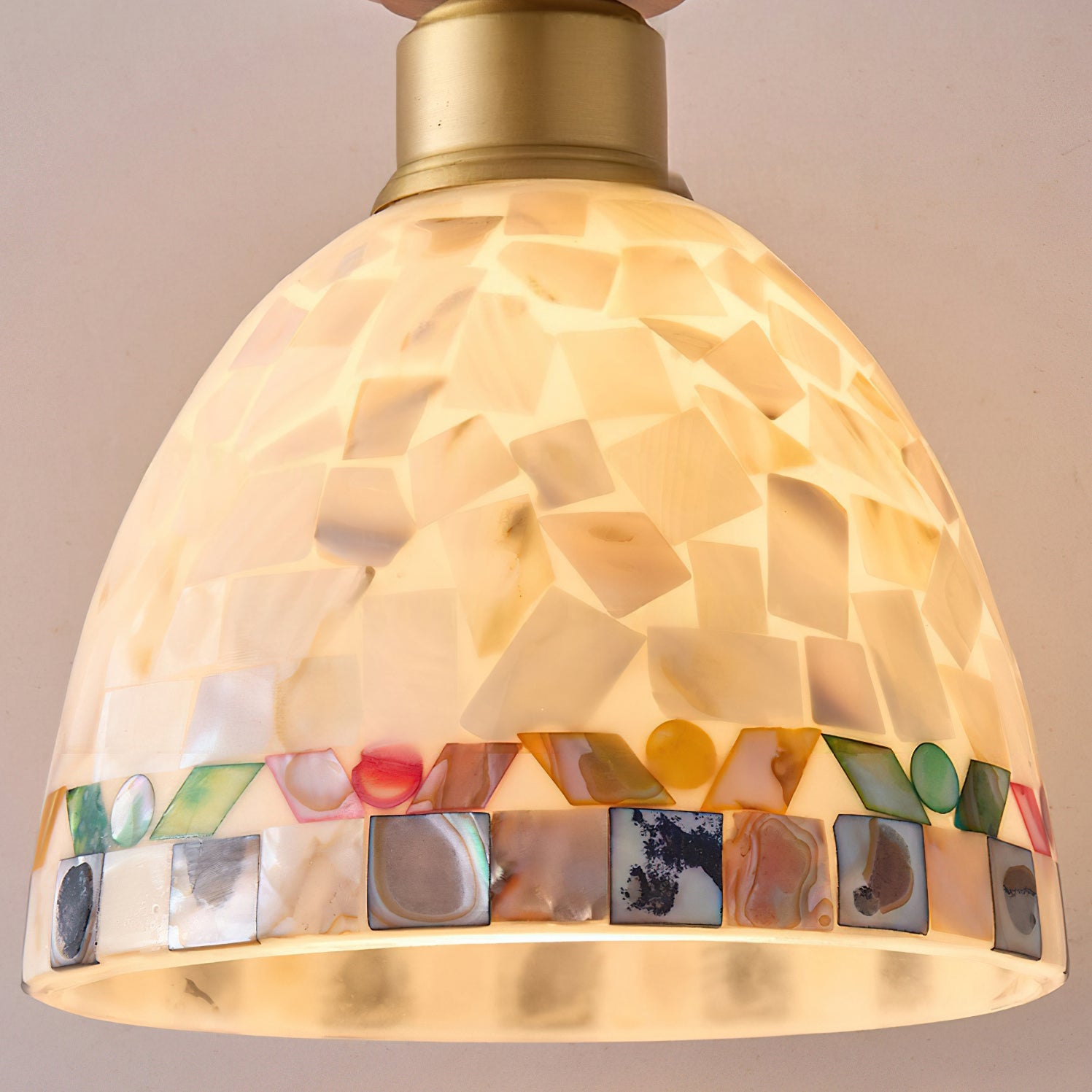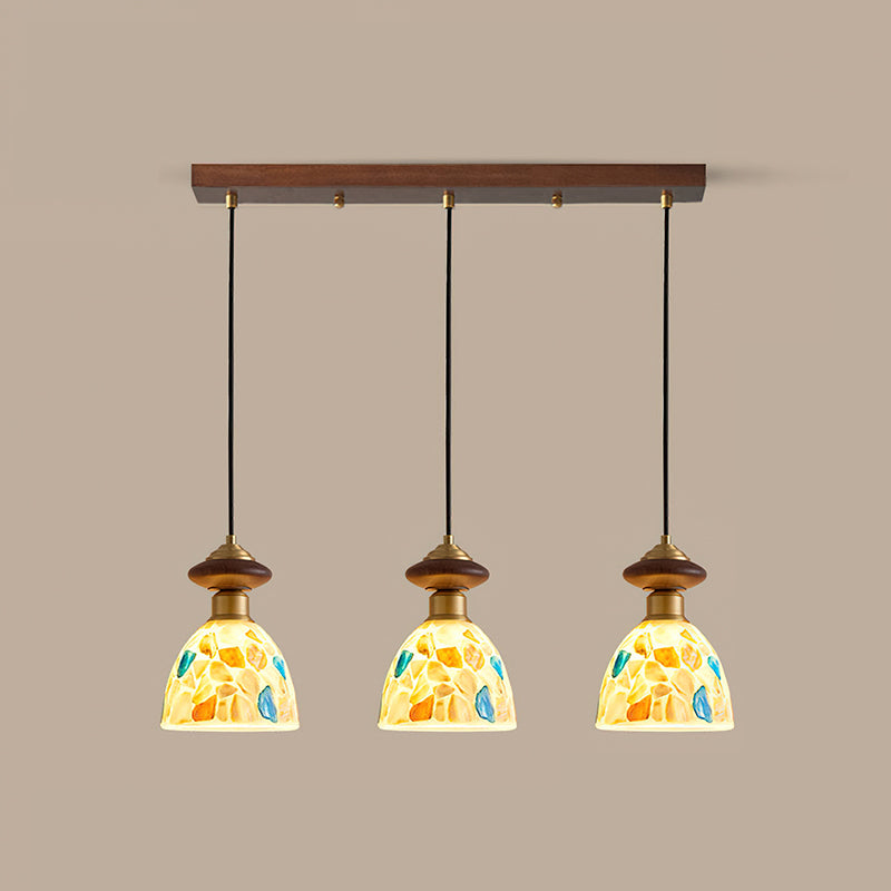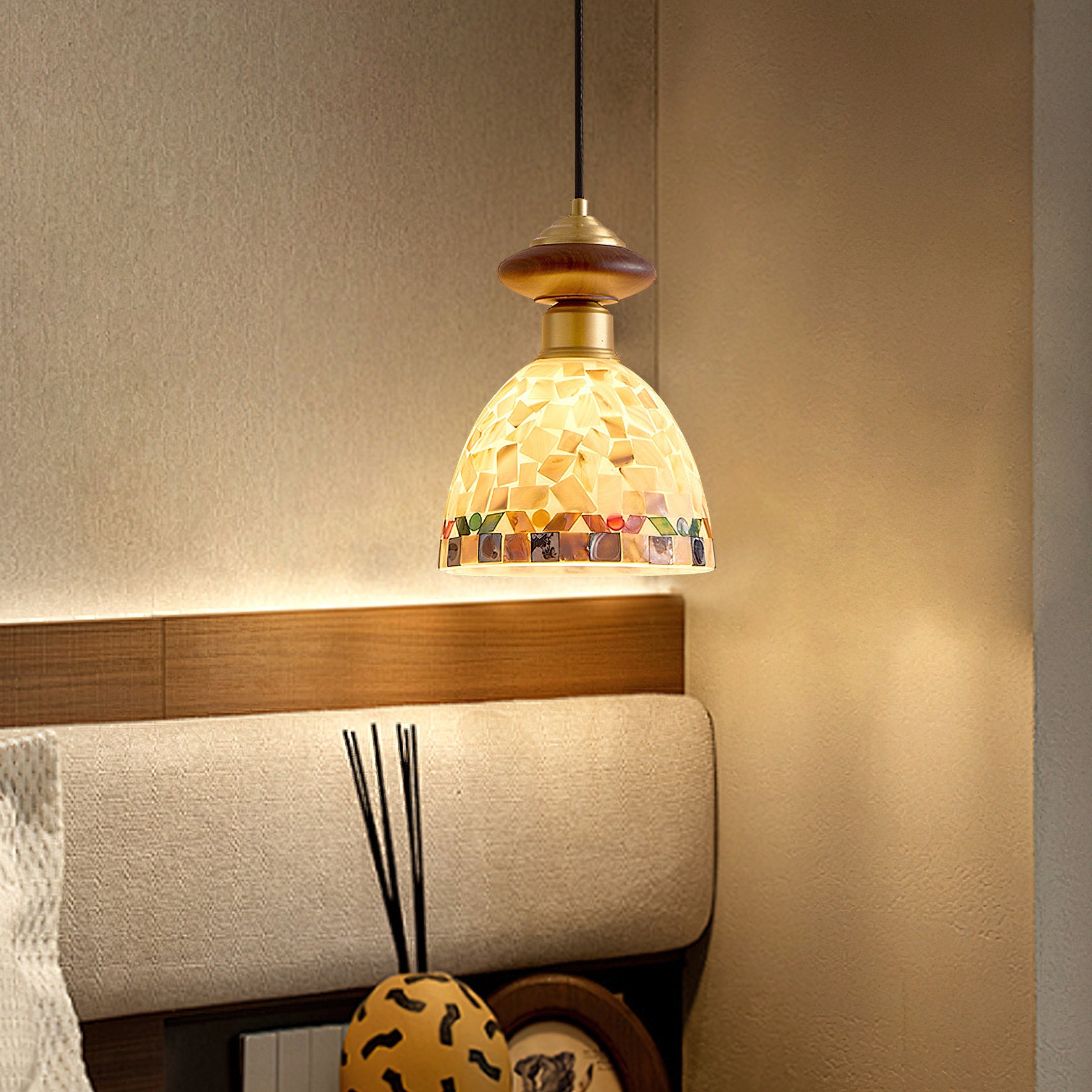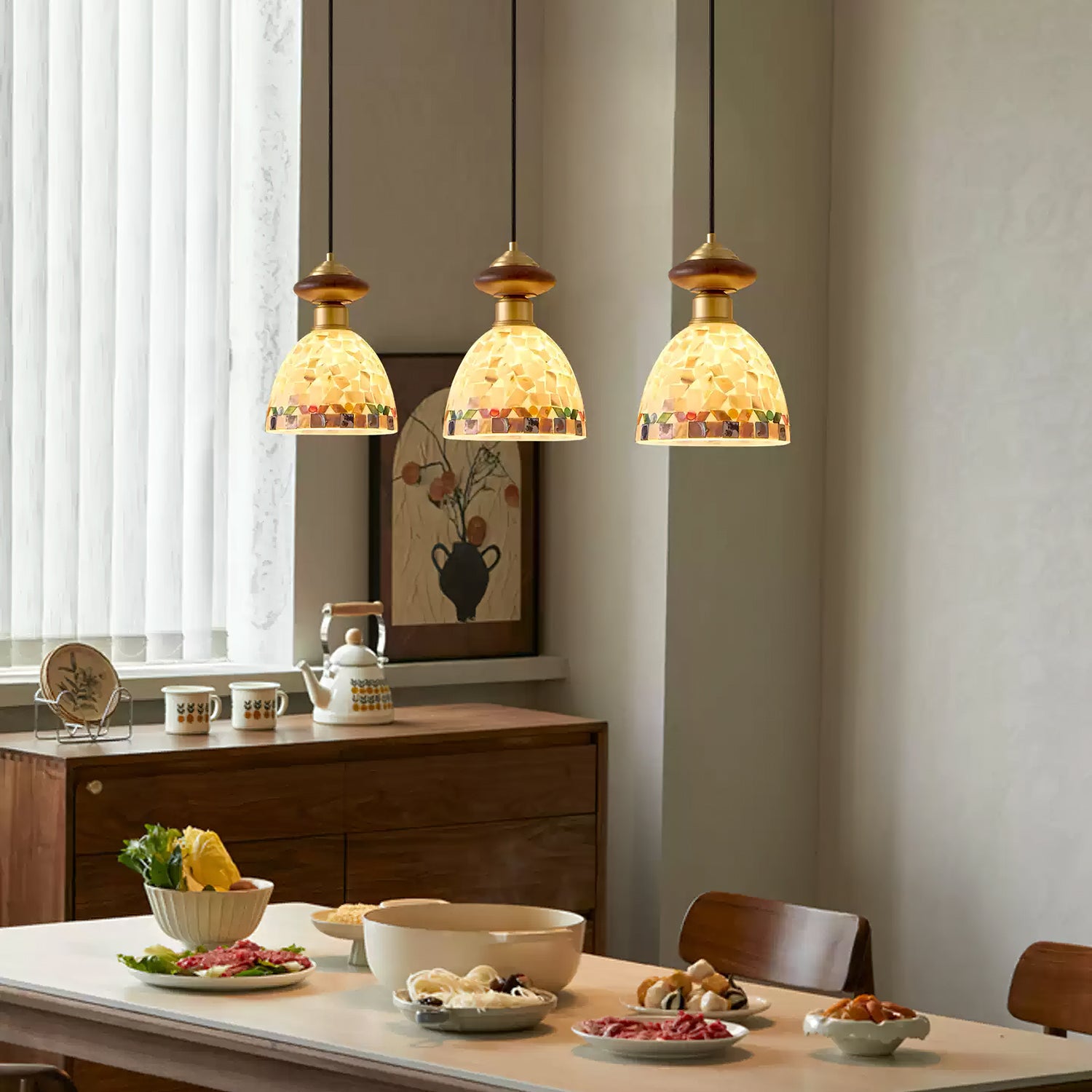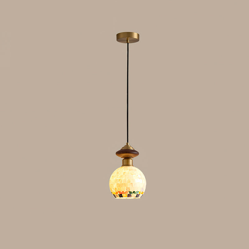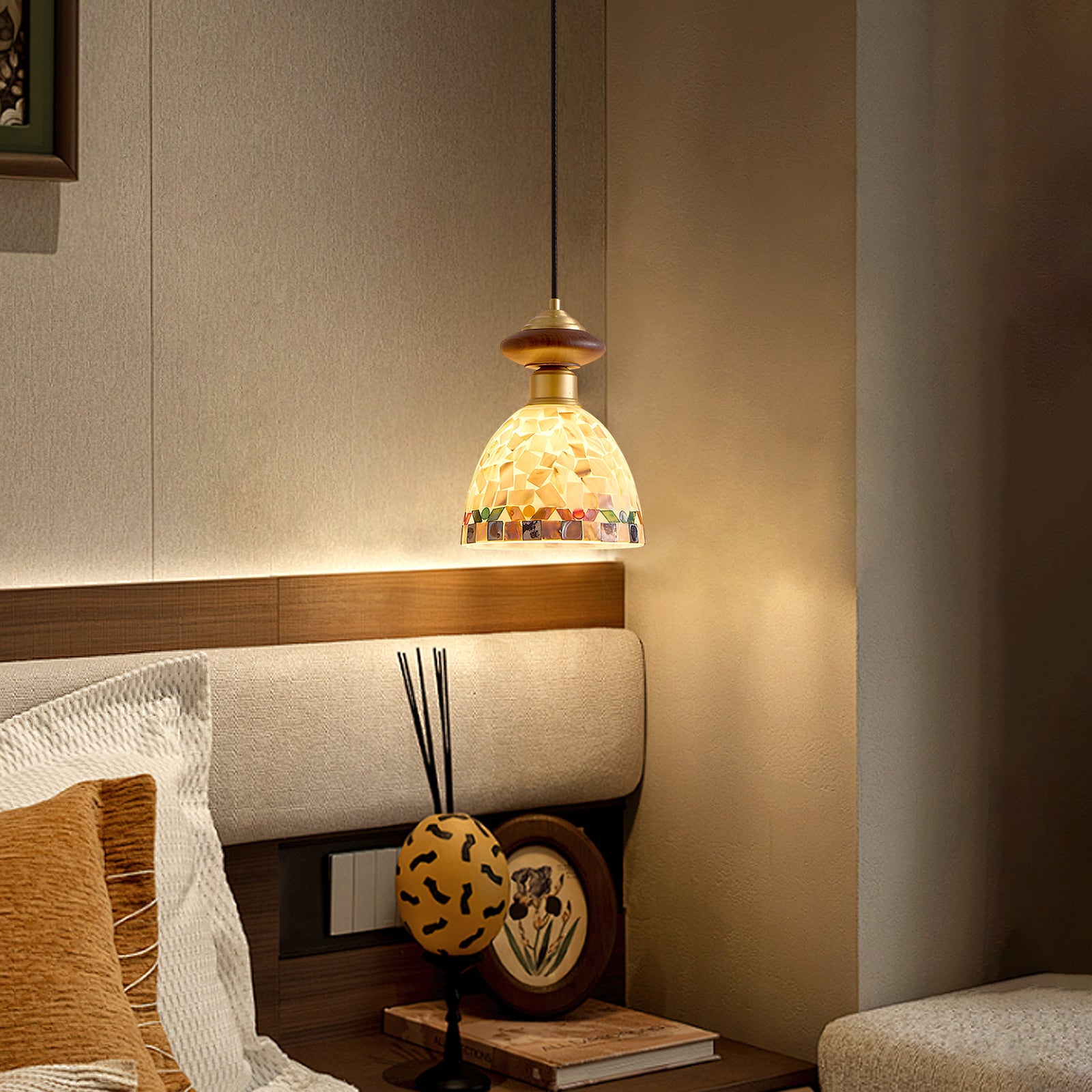 The Tivora Pendant Lamp by Mooijane showcases a sculptural design that blends warmth, texture, and color. Its handcrafted shade is inlaid with irregular, multicolored shell fragments that shimmer like glass when lit, creating a soft, luminous glow. Suspended by a matte gold fixture, the design is completed with a rich wood accent for added depth and elegance. Perfect for dining areas, hallways, or bedside settings, Tivora brings artistic character and timeless charm to any space.
