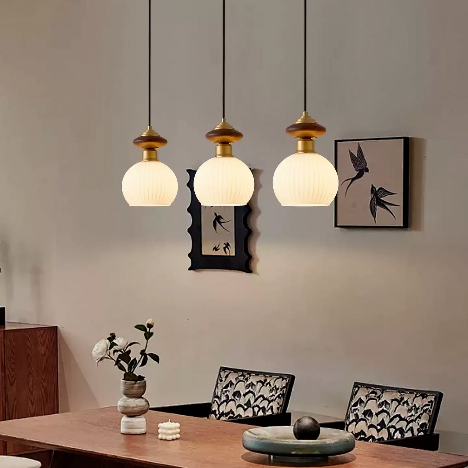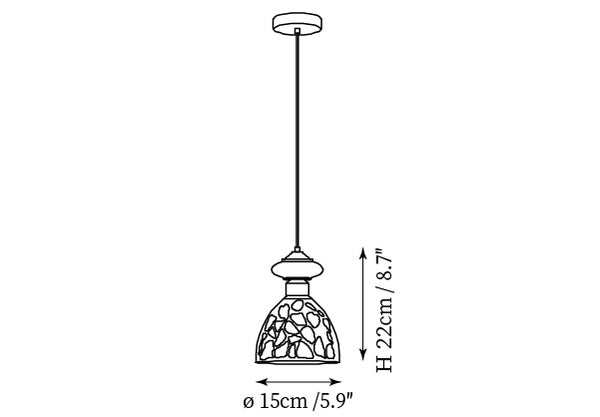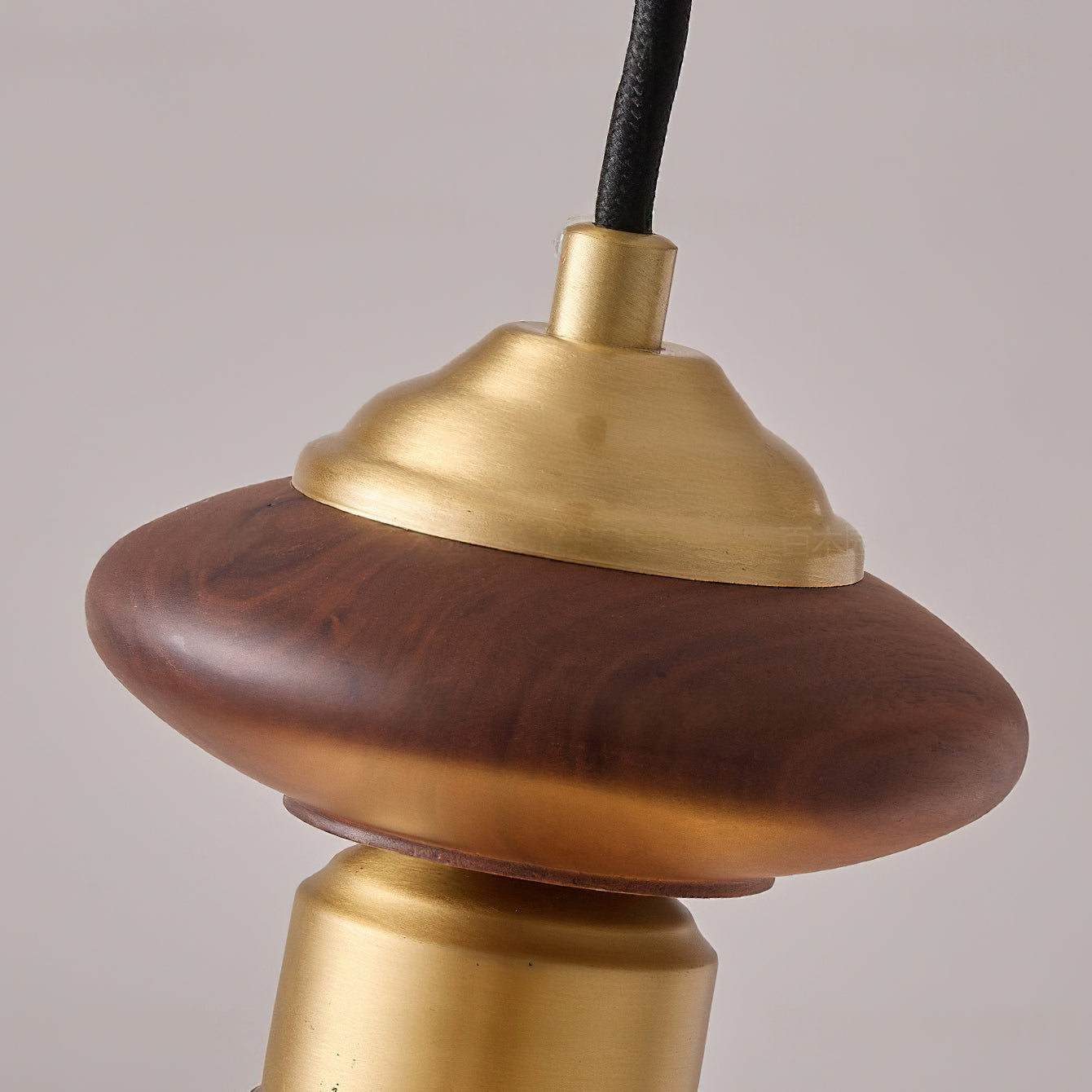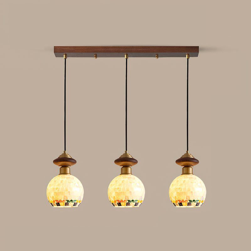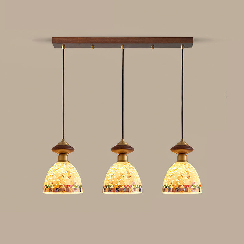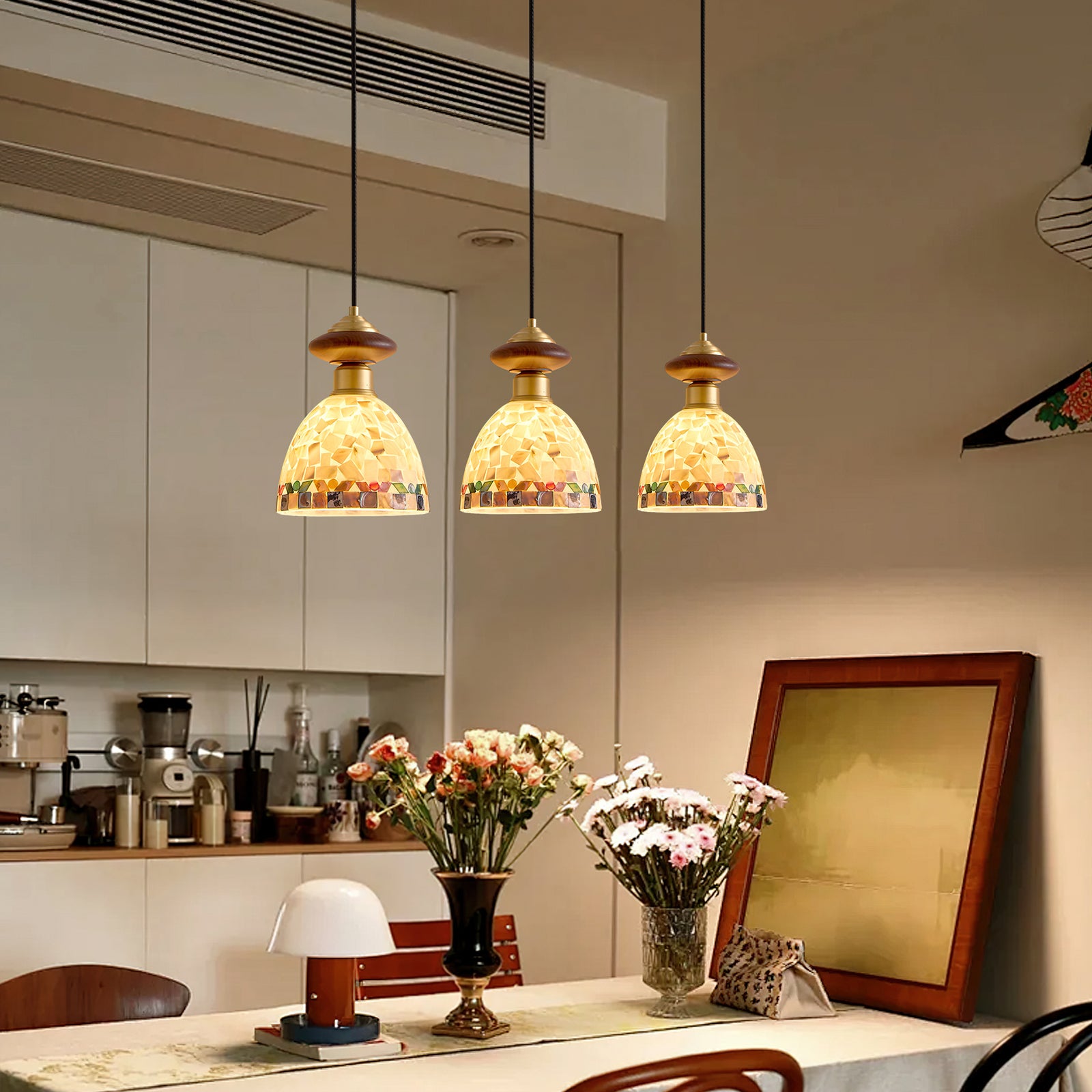 The Tivora Pendant Lamp by Mooijane showcases a sculptural design that blends warmth, texture, and color. Its handcrafted shade is inlaid with irregular, multicolored shell fragments that shimmer like glass when lit, creating a soft, luminous glow. Suspended by a matte gold fixture, the design is completed with a rich wood accent for added depth and elegance. Perfect for dining areas, hallways, or bedside settings, Tivora brings artistic character and timeless charm to any space.