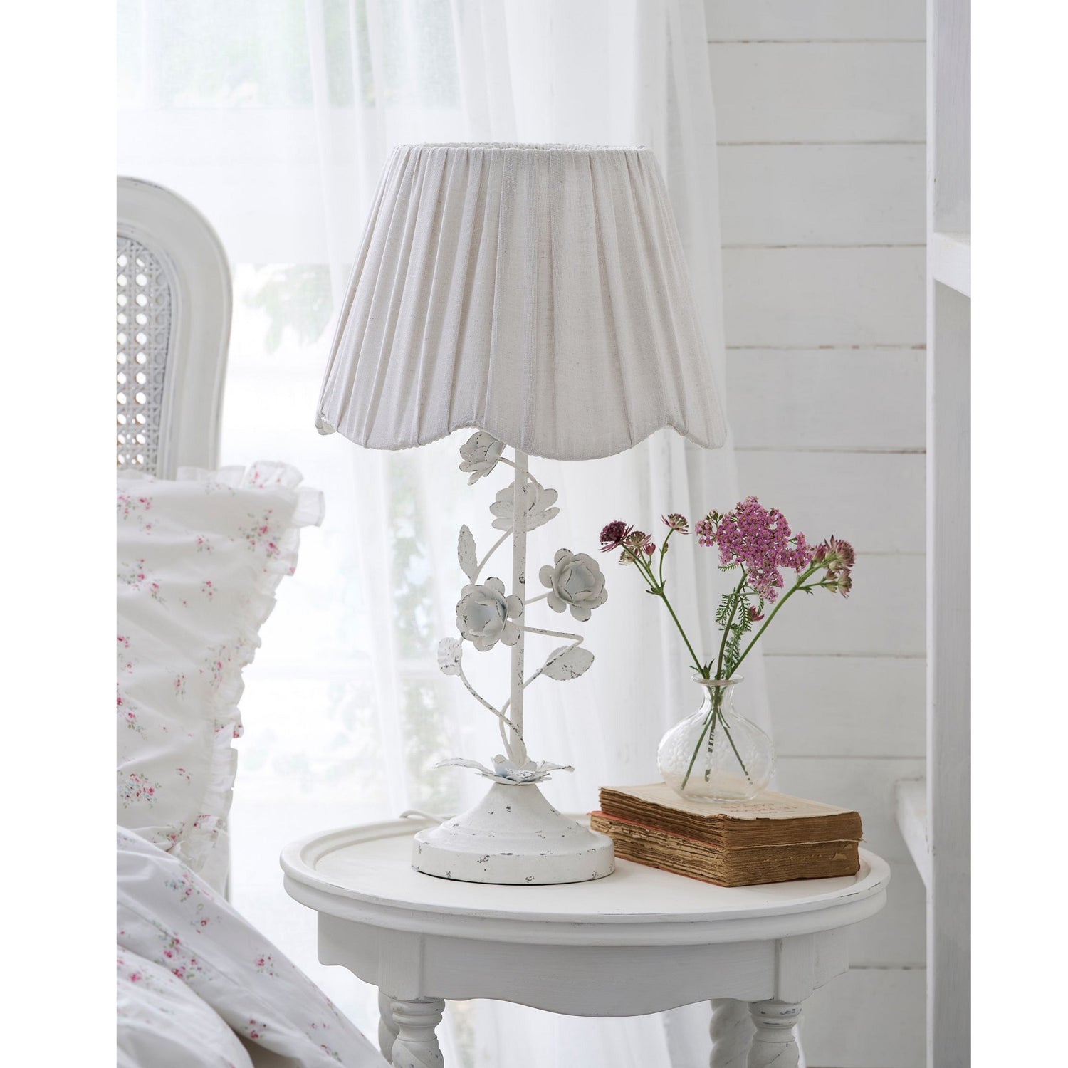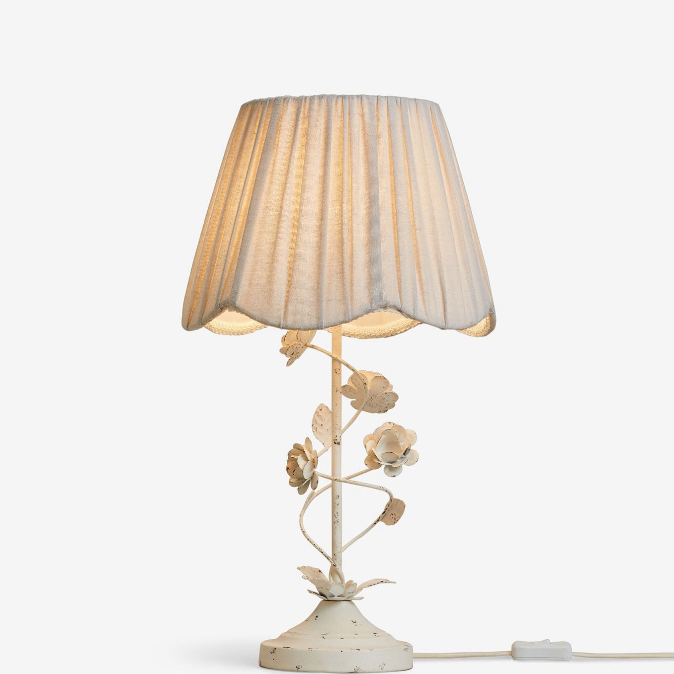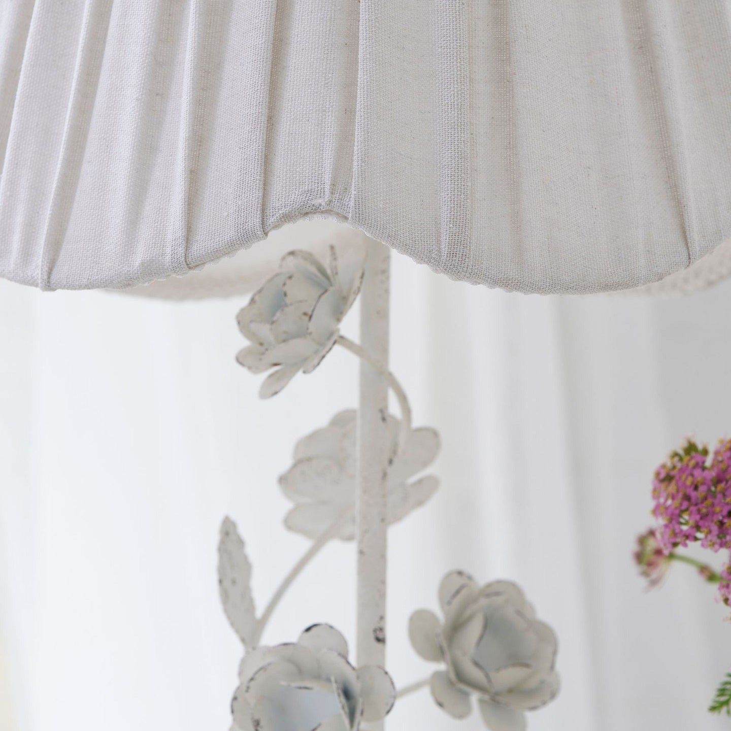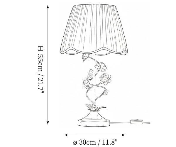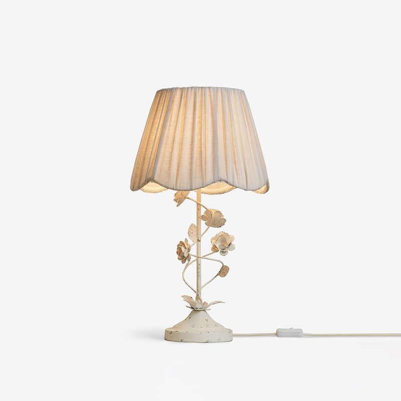 The Tiziano Table Lamp from Mooijane brings a charming touch of color to any space. Featuring a twisted metal base with decorative flowers and leaves in a distressed white finish, it’s paired with a simple, elegant fabric shade. Perfect for adding character to living rooms, bedrooms, or study areas, and available alongside a matching chandelier and floor lamp.