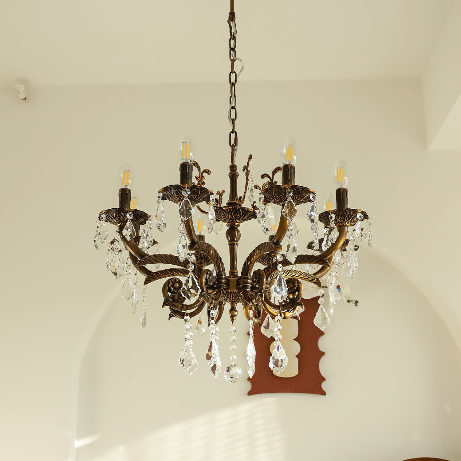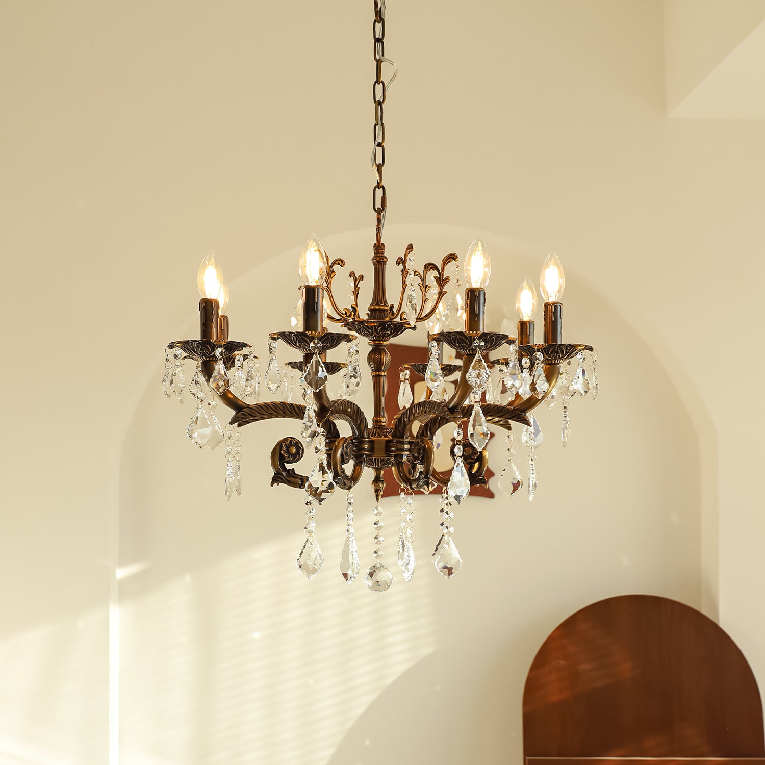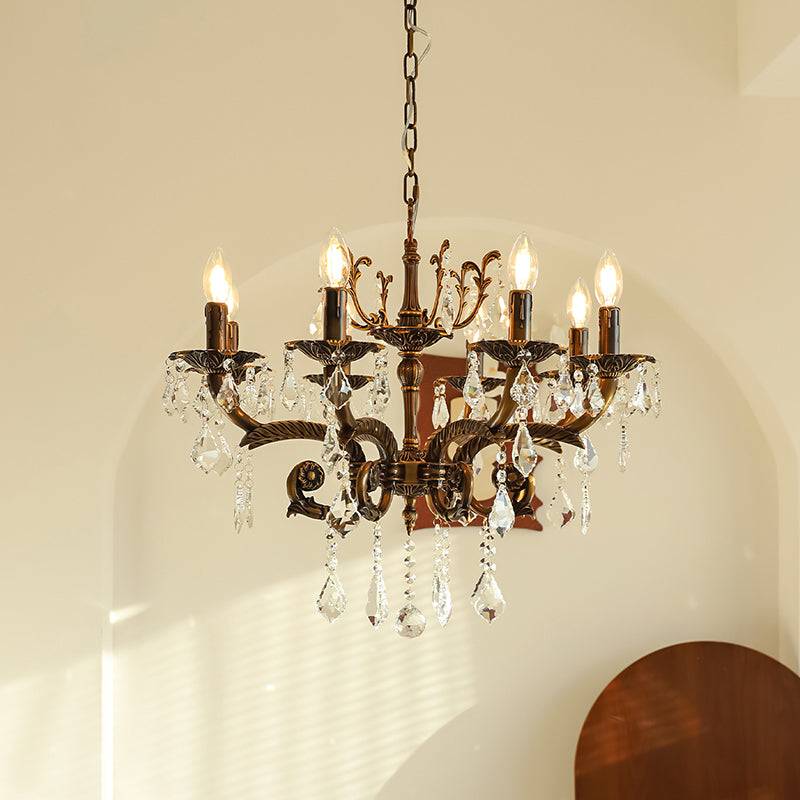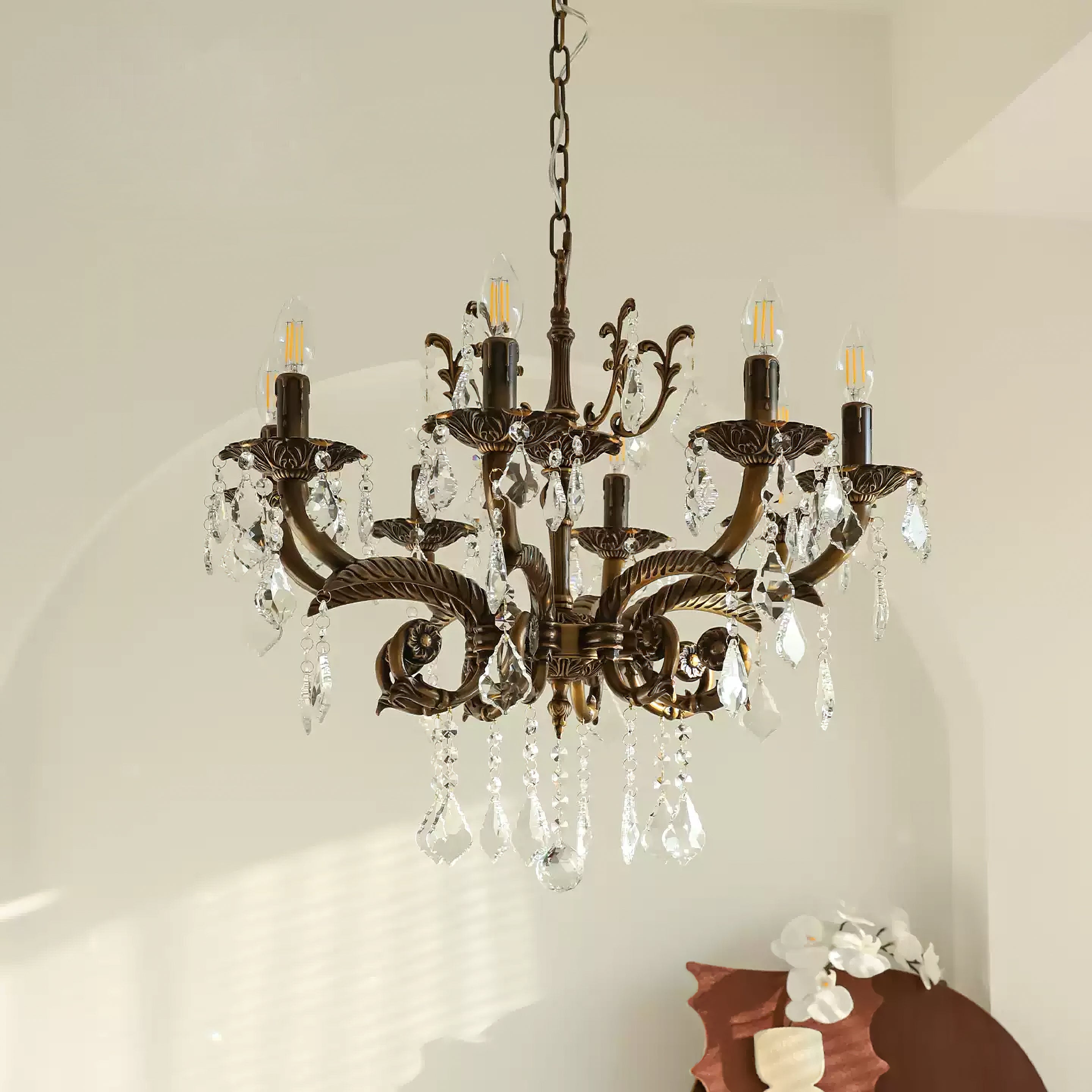 The Tournai Chandelier by Mooijane showcases a vintage copper frame with intricately carved arms and sparkling crystal pendants, offering an air of timeless elegance. candlestick-style lights cast a warm glow through finely cut crystals, creating a captivating interplay of light and shadow. Ideal for living rooms, dining areas, or grand entryways, it adds a luxurious focal point that elevates any interior.