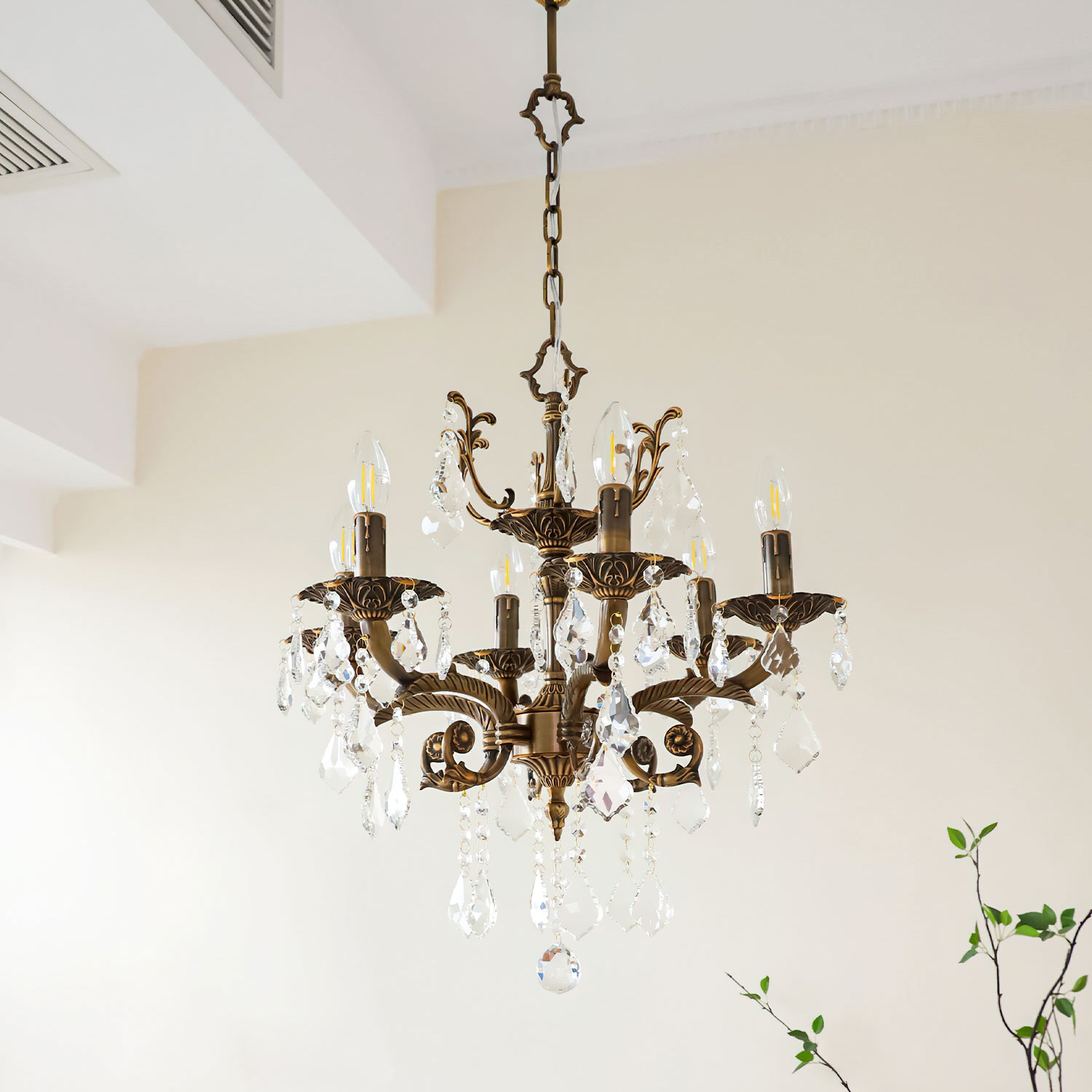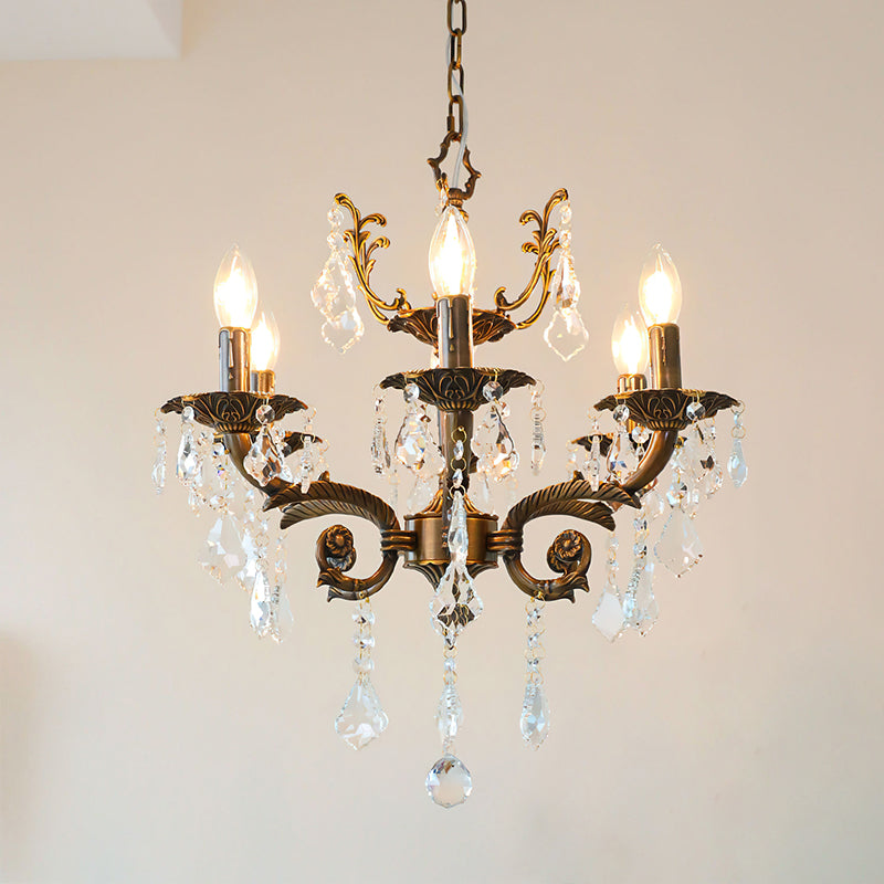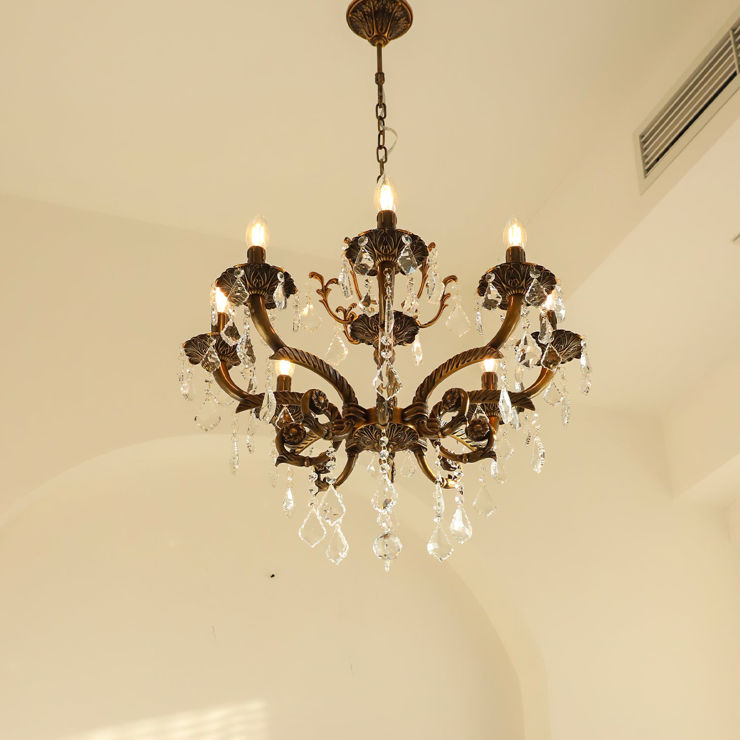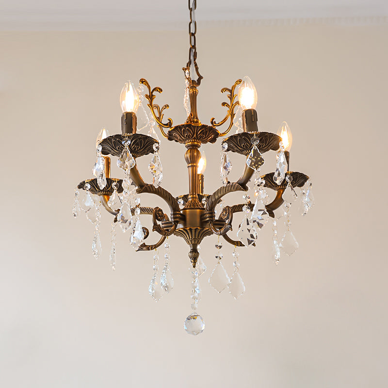 The Tournai Chandelier by Mooijane showcases a vintage copper frame with intricately carved arms and sparkling crystal pendants, offering an air of timeless elegance. candlestick-style lights cast a warm glow through finely cut crystals, creating a captivating interplay of light and shadow. Ideal for living rooms, dining areas, or grand entryways, it adds a luxurious focal point that elevates any interior.