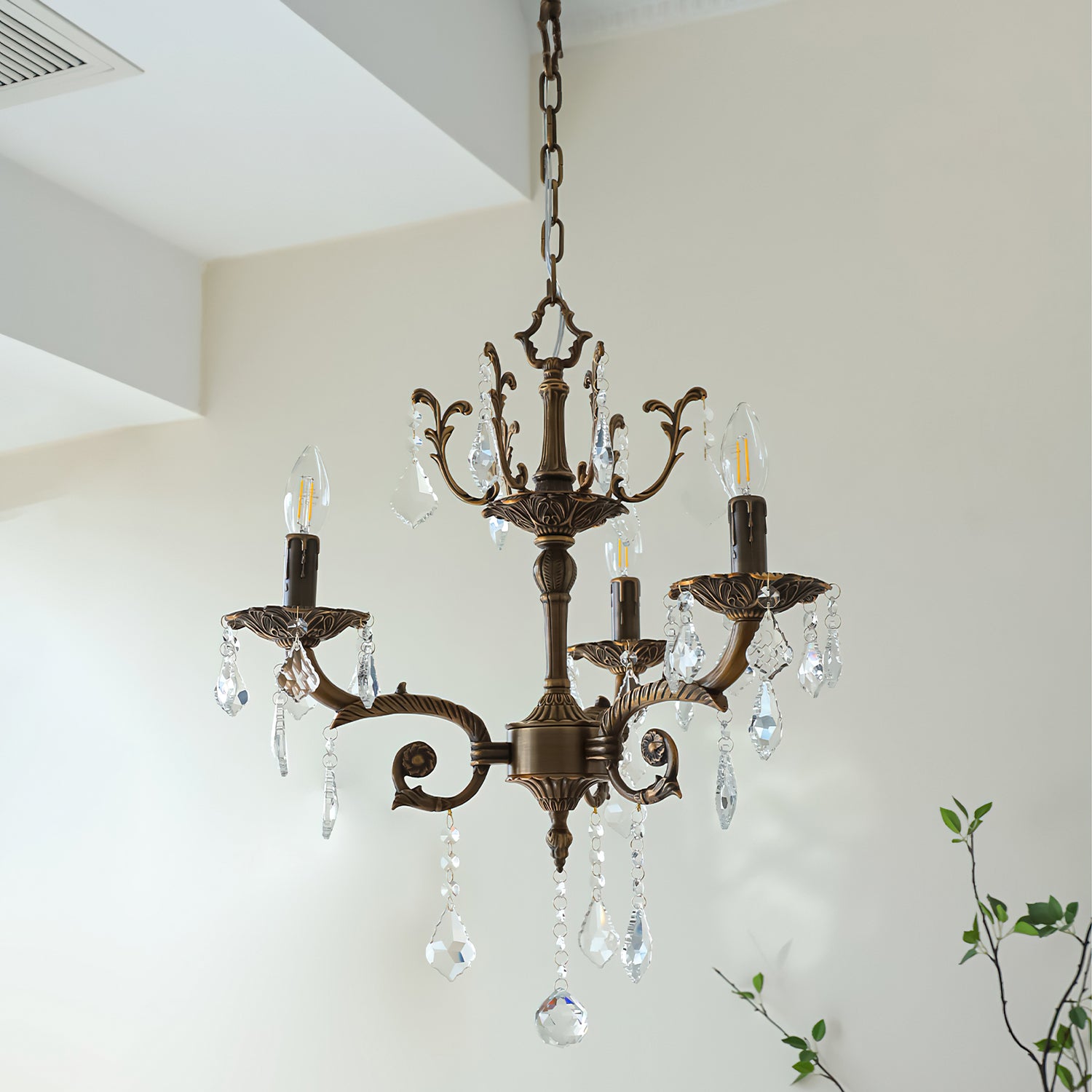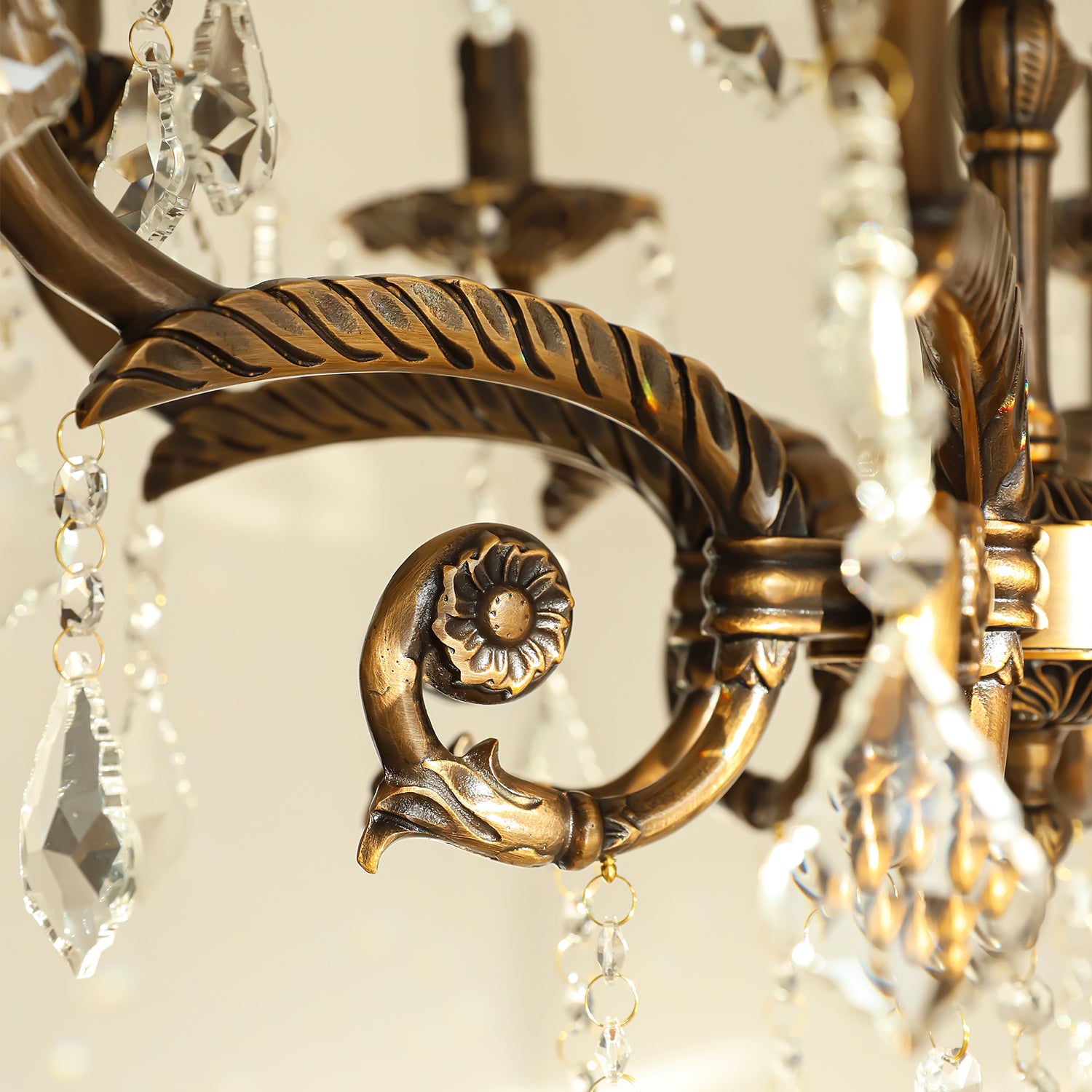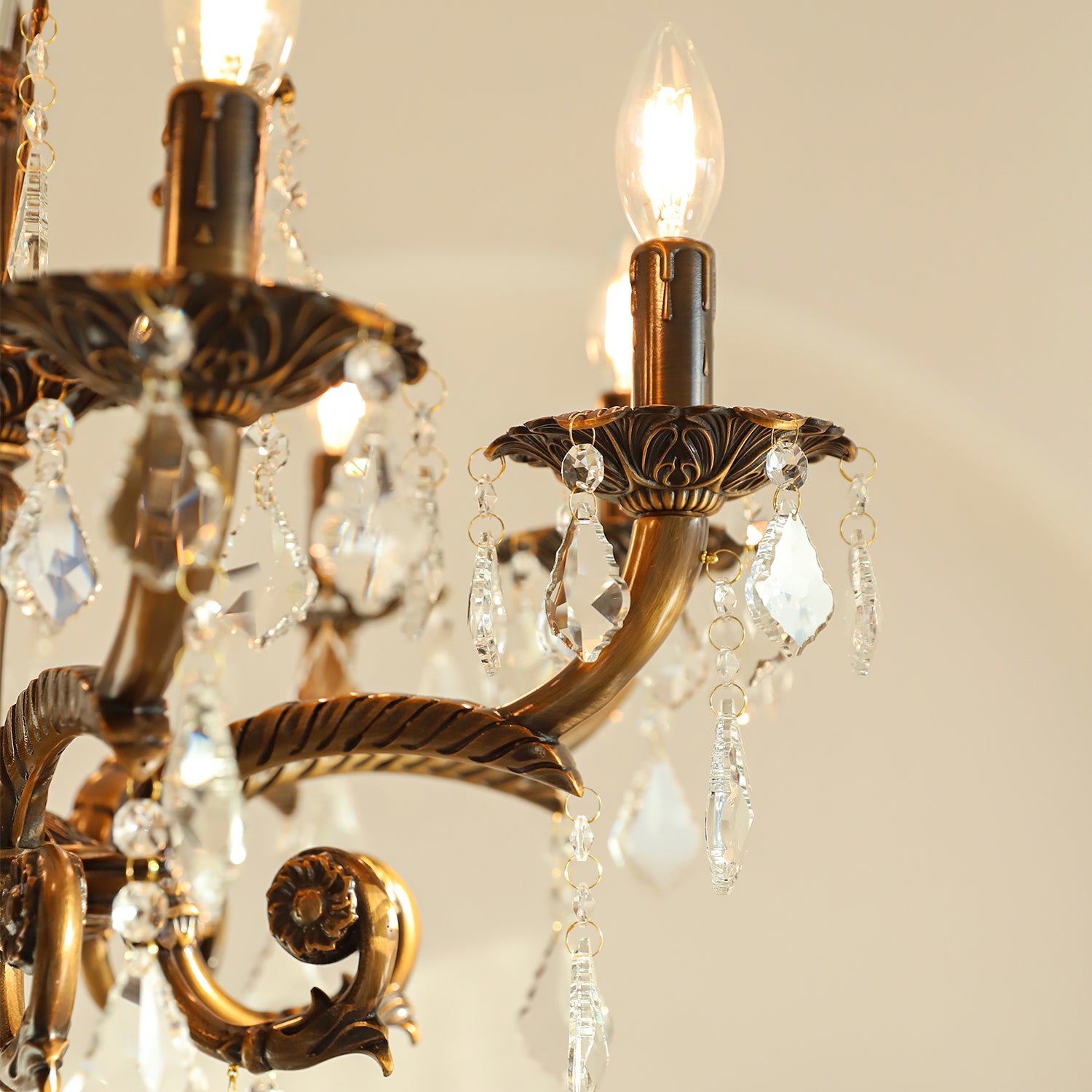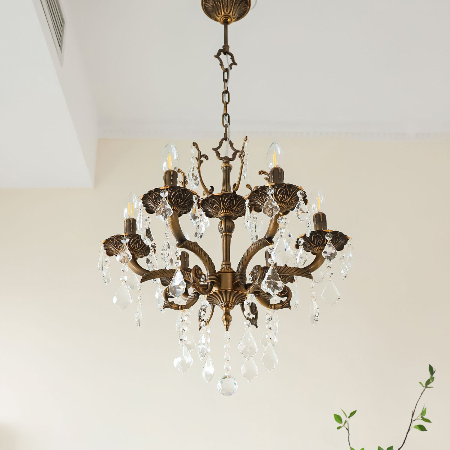 The Tournai Chandelier by Mooijane showcases a vintage copper frame with intricately carved arms and sparkling crystal pendants, offering an air of timeless elegance. candlestick-style lights cast a warm glow through finely cut crystals, creating a captivating interplay of light and shadow. Ideal for living rooms, dining areas, or grand entryways, it adds a luxurious focal point that elevates any interior.