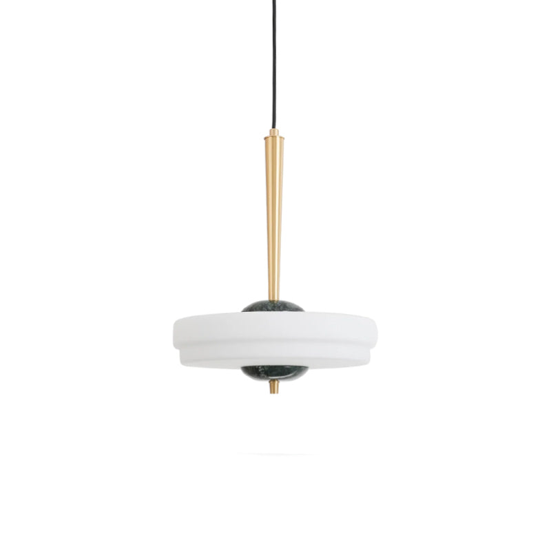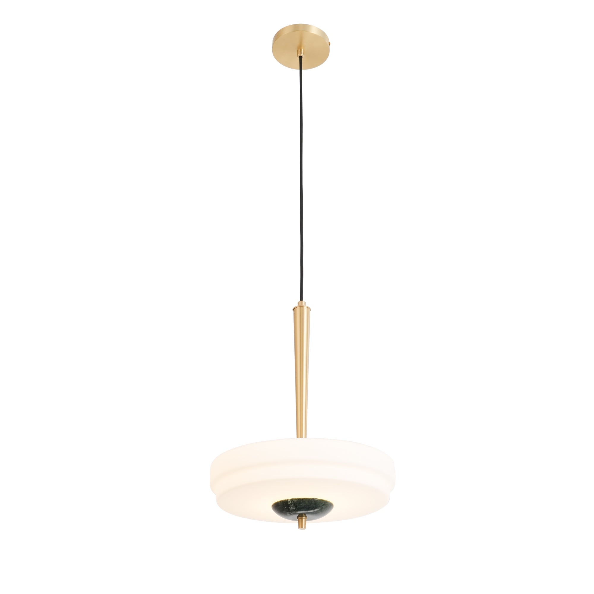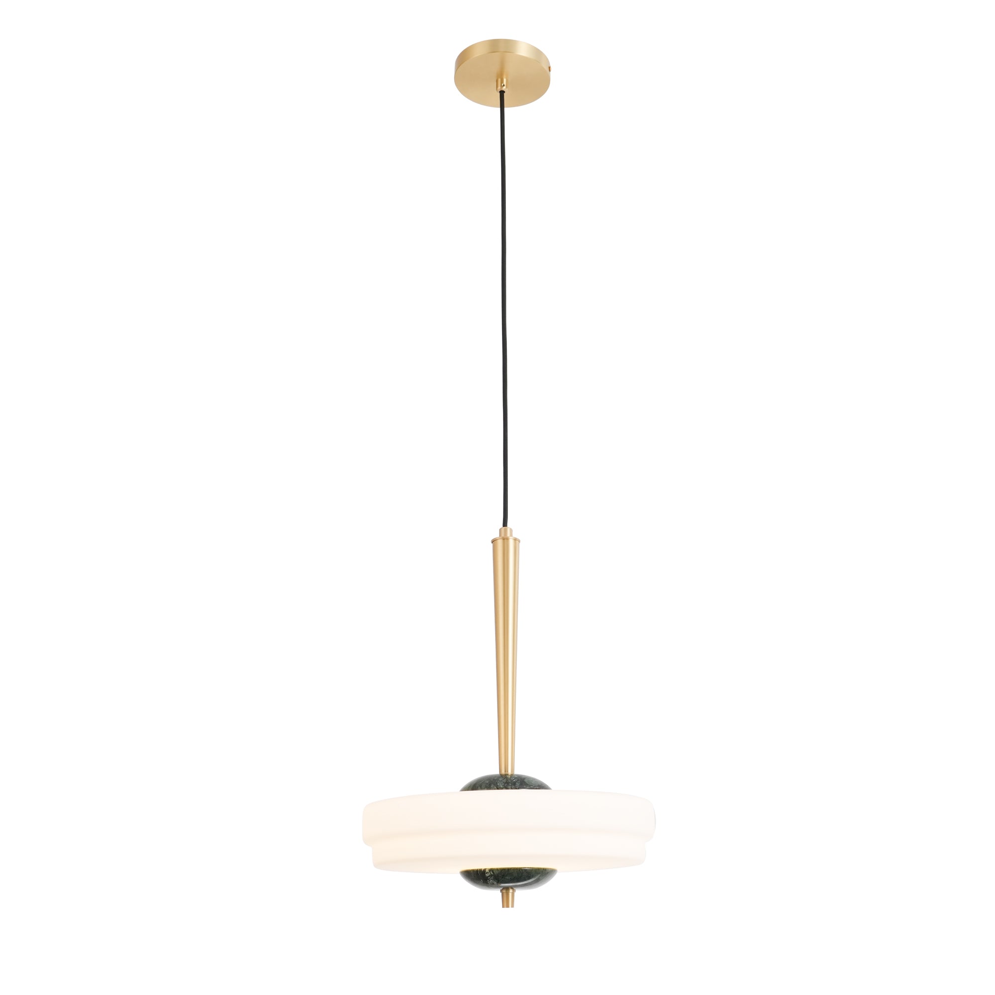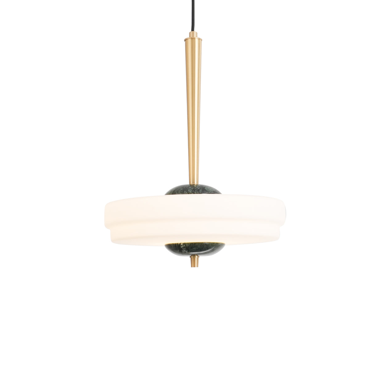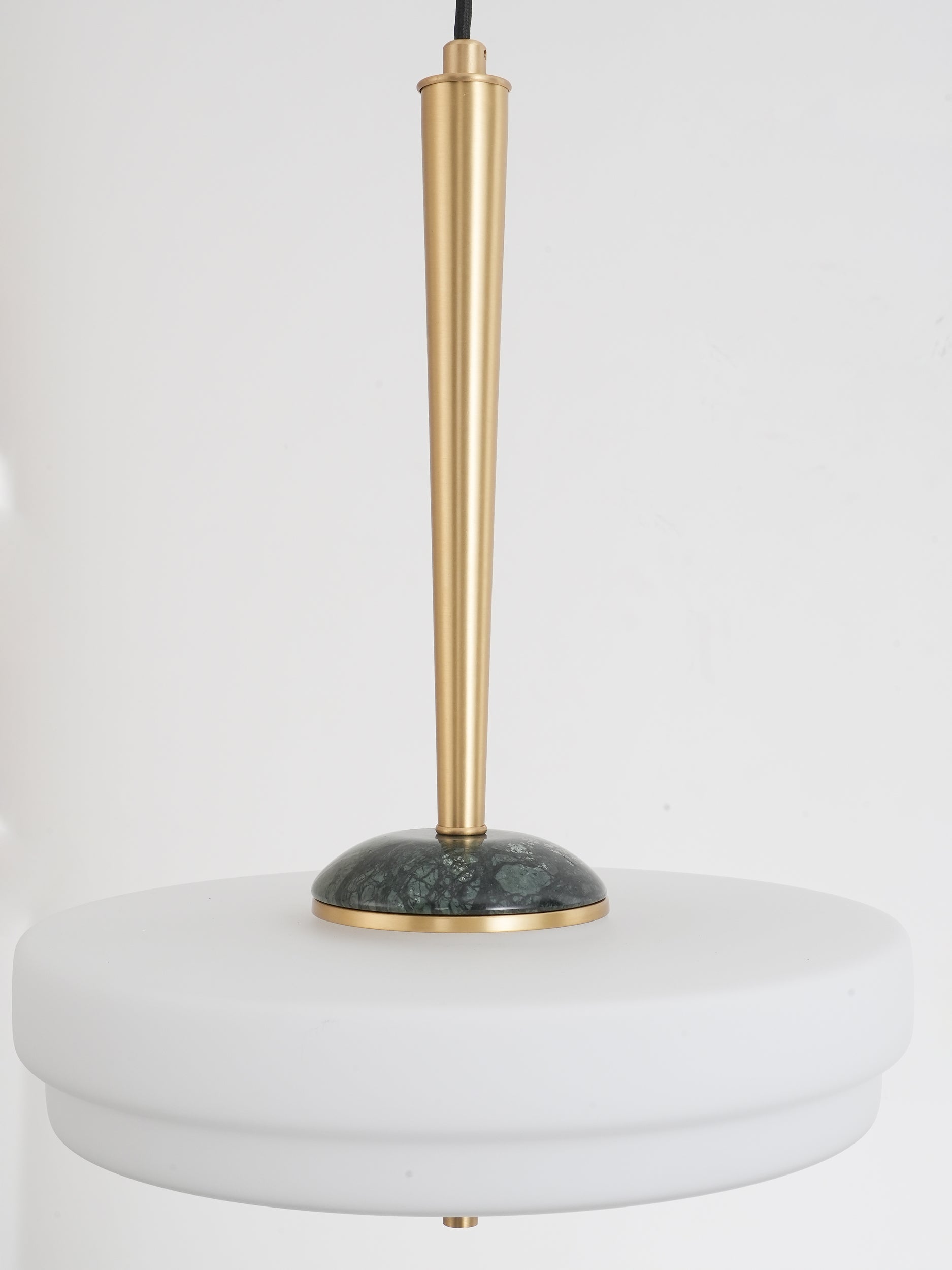 Suspended from a reeded, fluted brass stem, the two-tier, soft-finish, opal glass shade with spherical marble detailing produces a soft, ambient light.