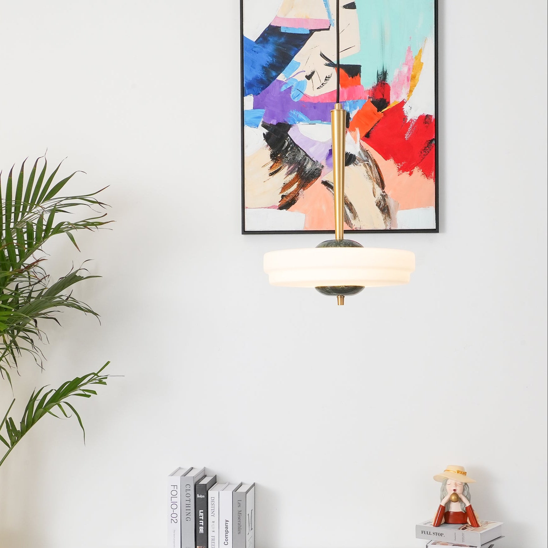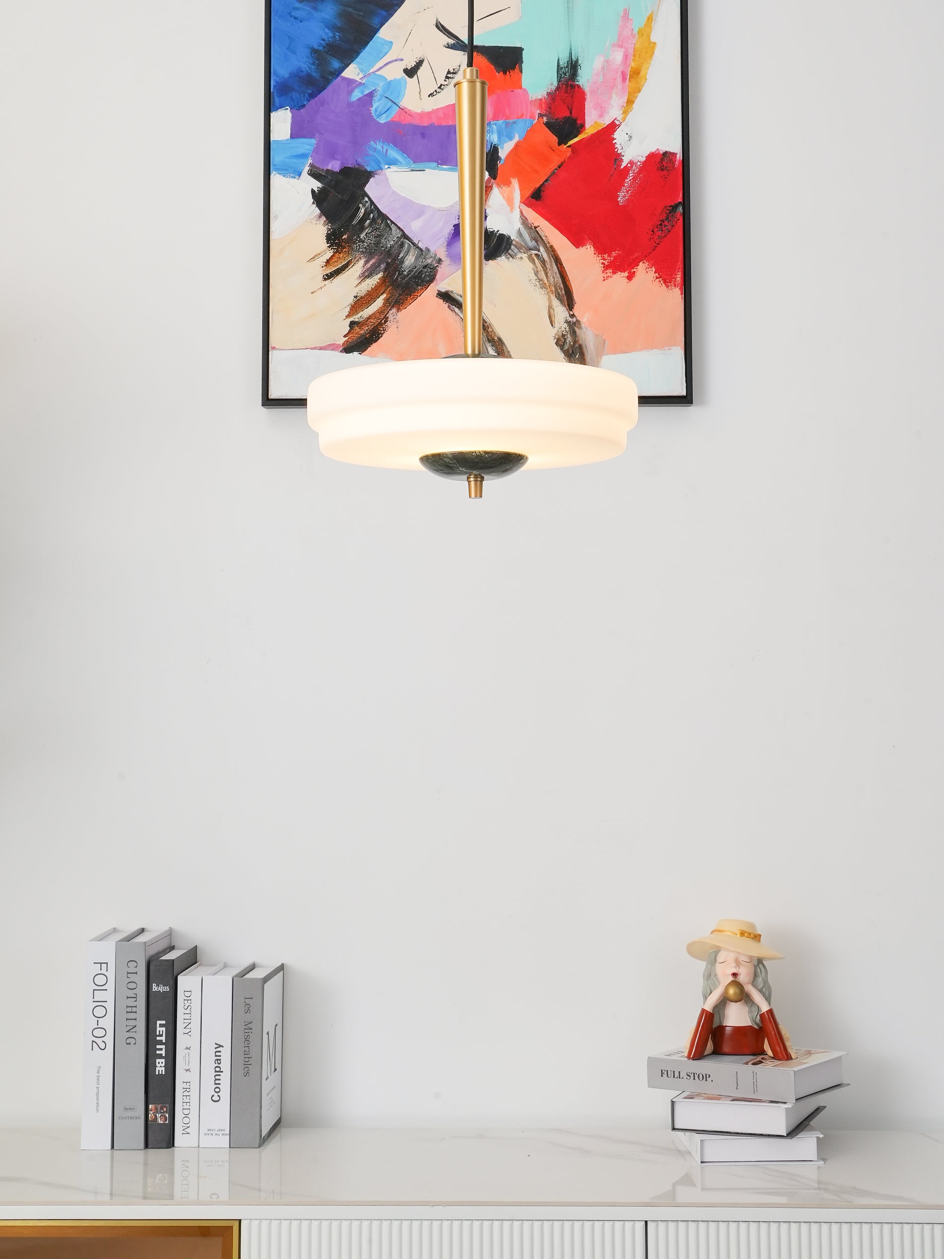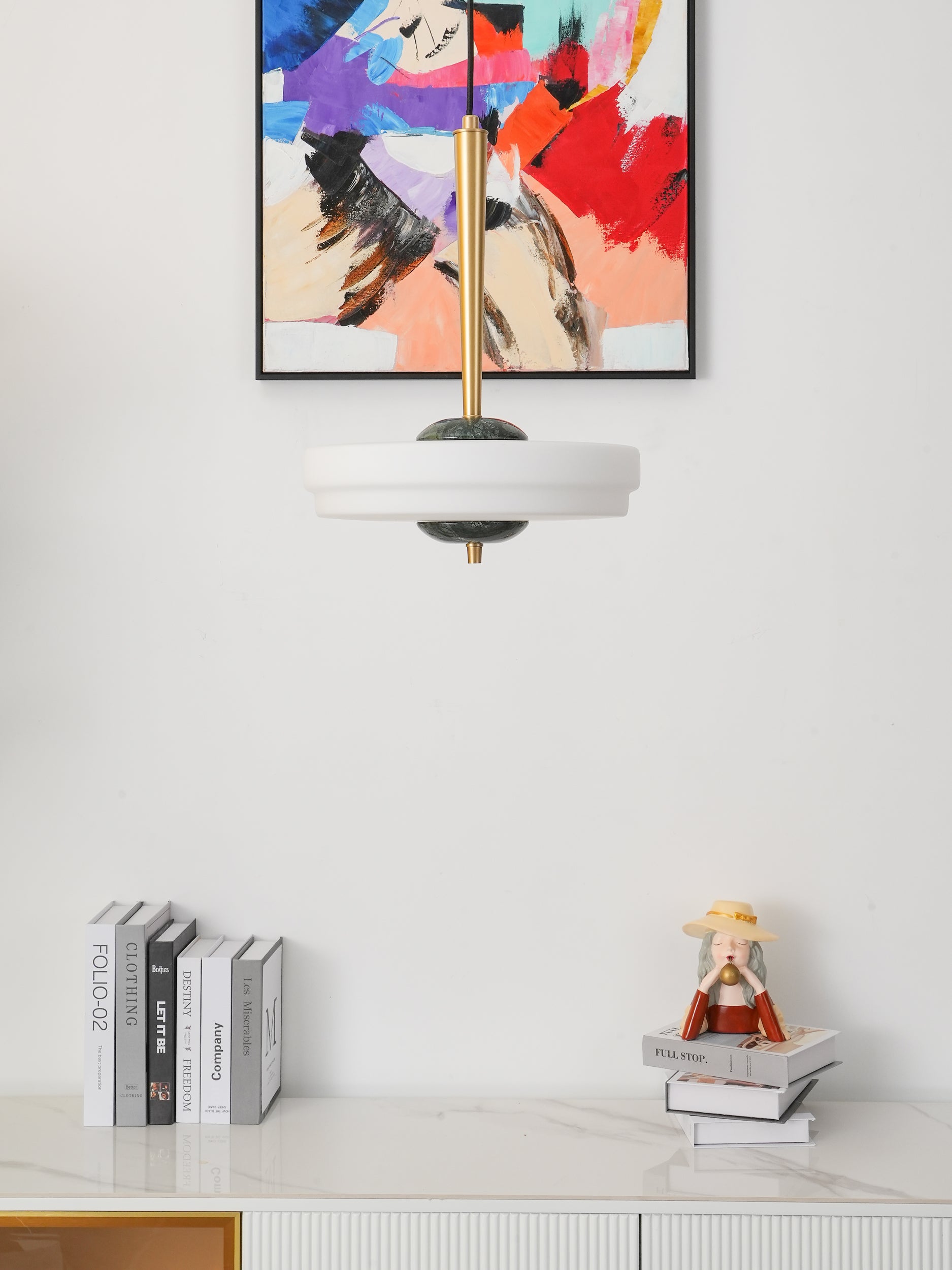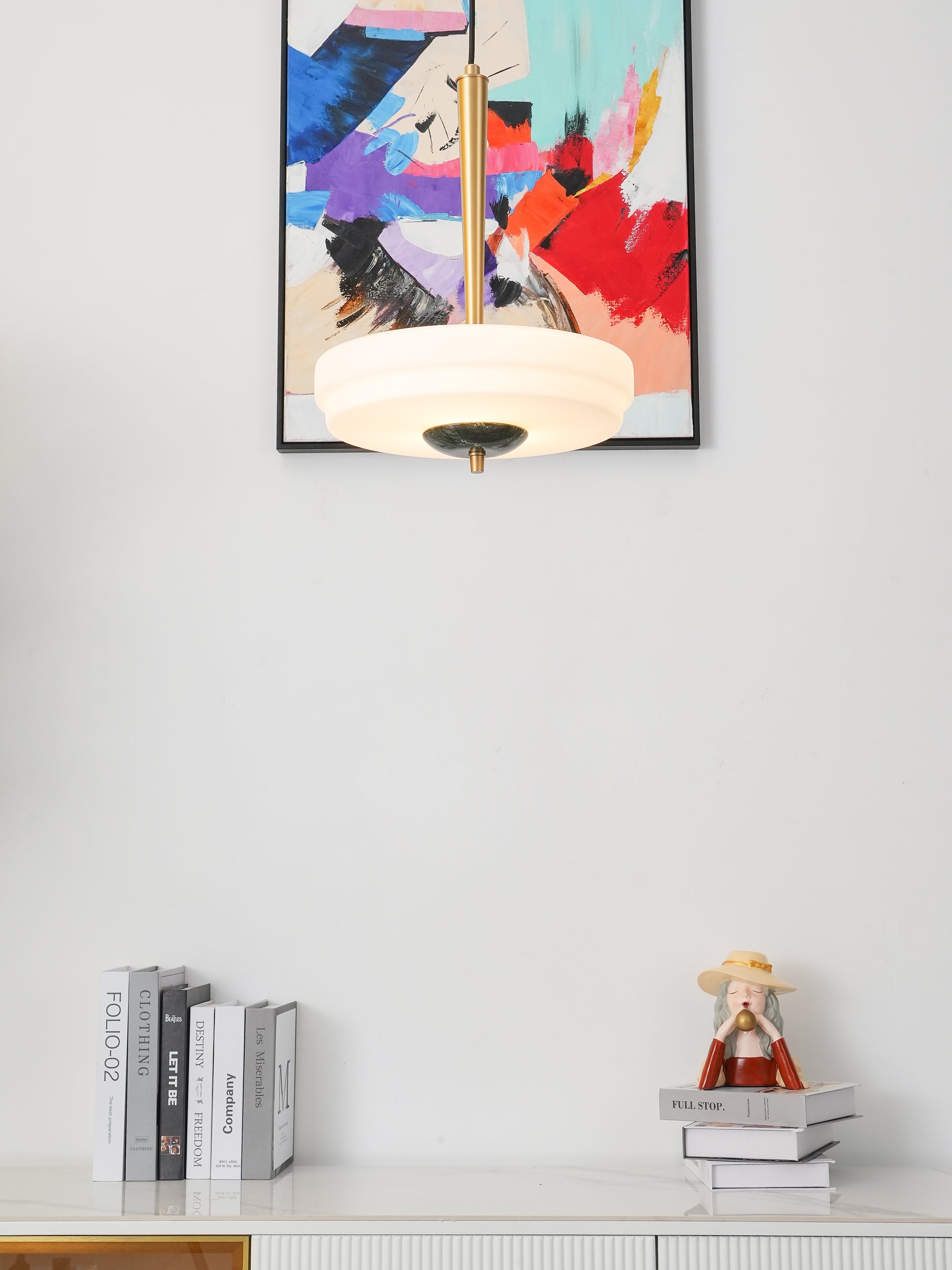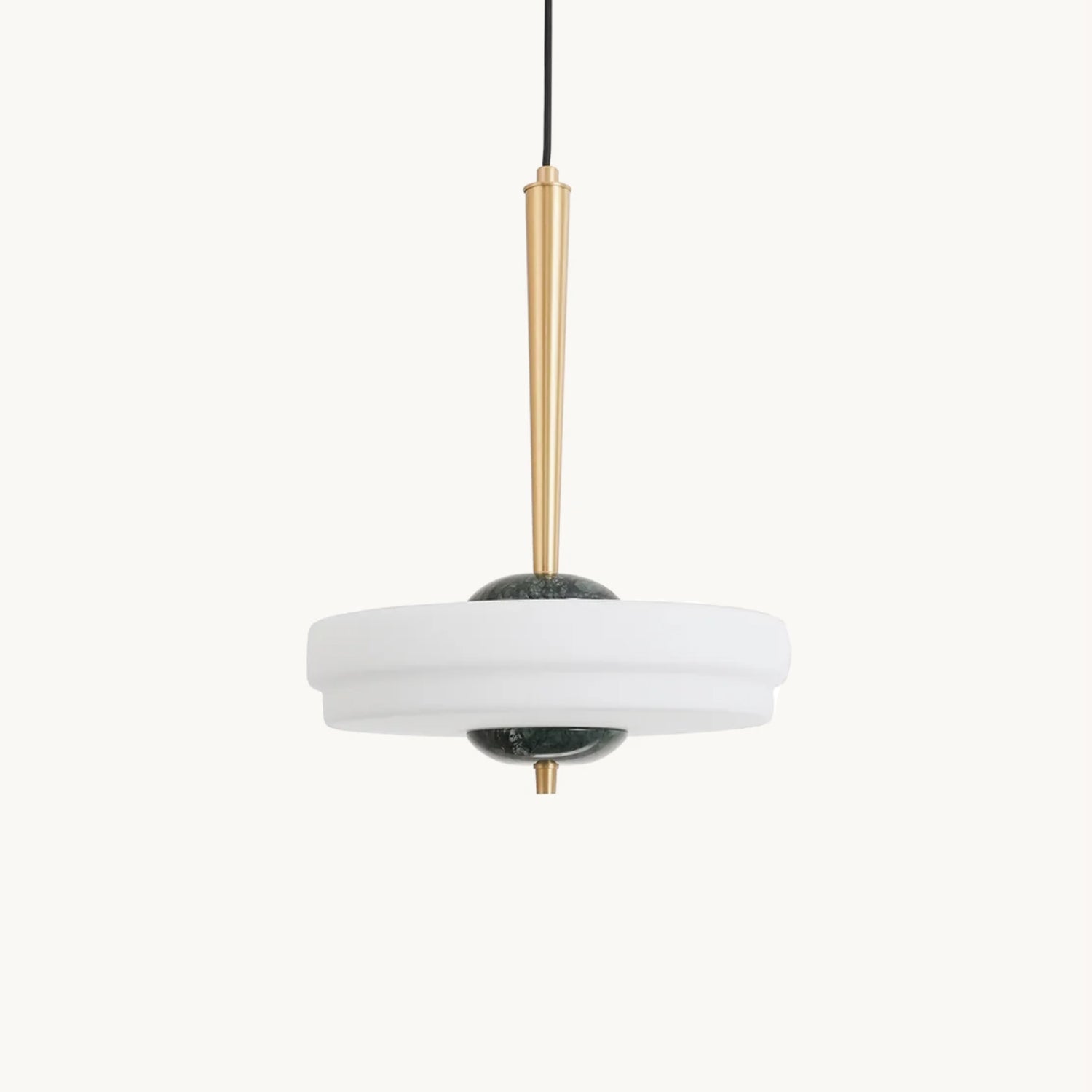 Suspended from a reeded, fluted brass stem, the two-tier, soft-finish, opal glass shade with spherical marble detailing produces a soft, ambient light.
