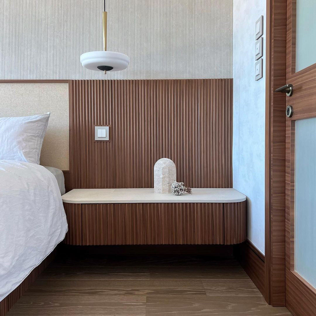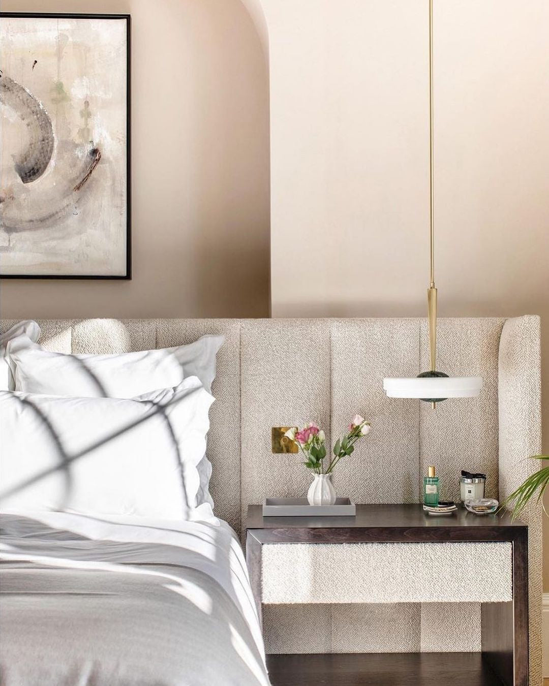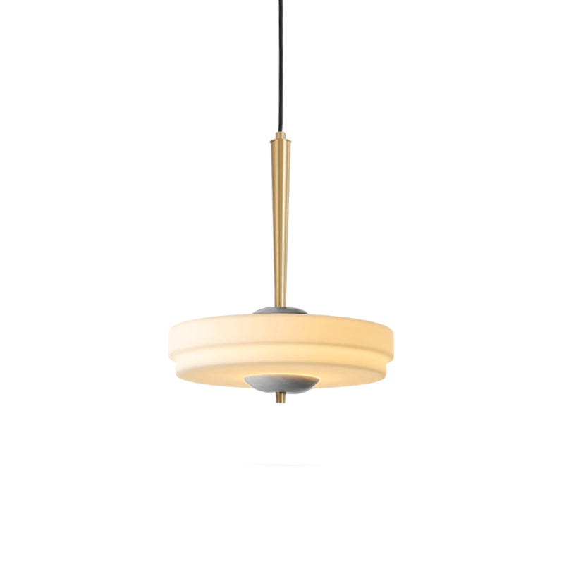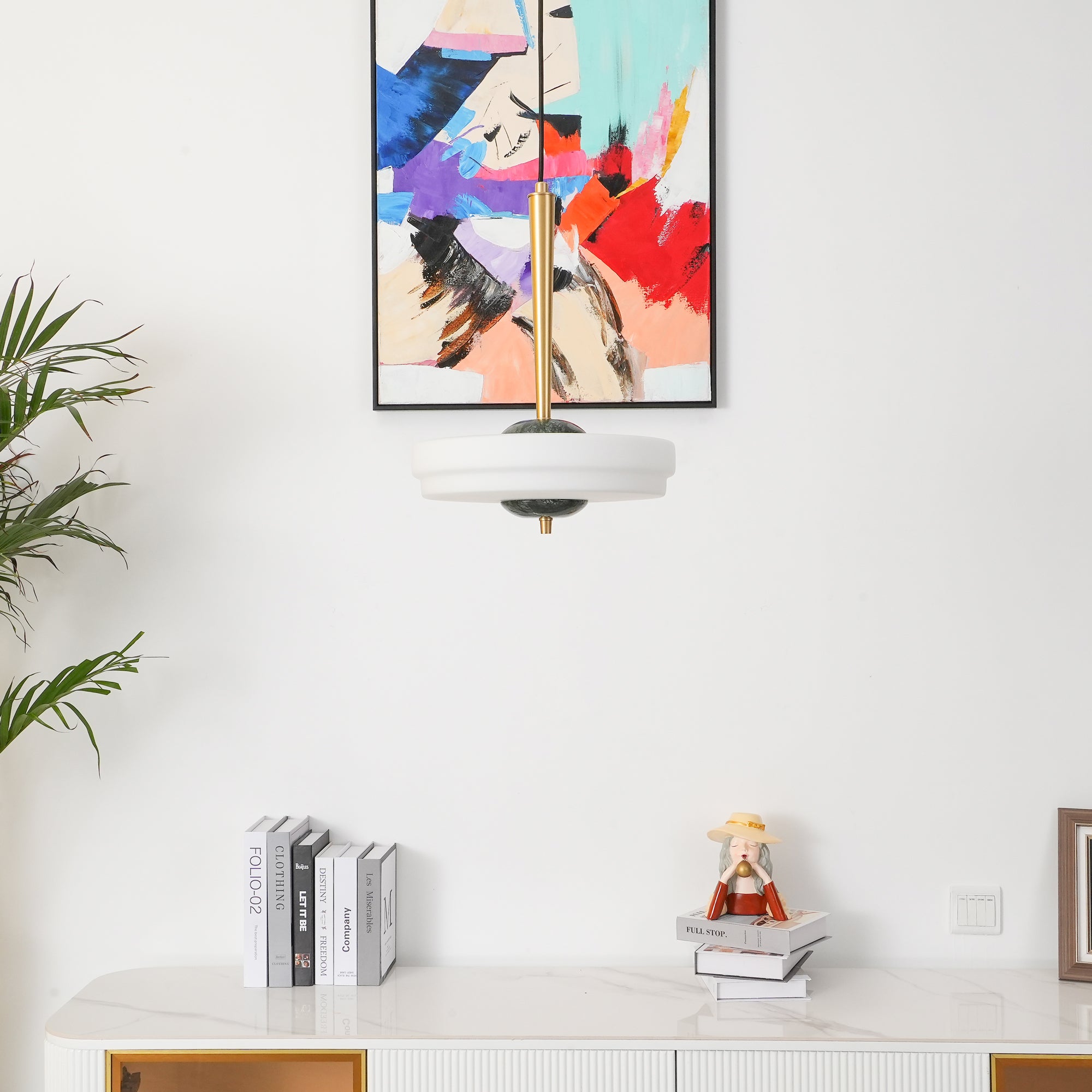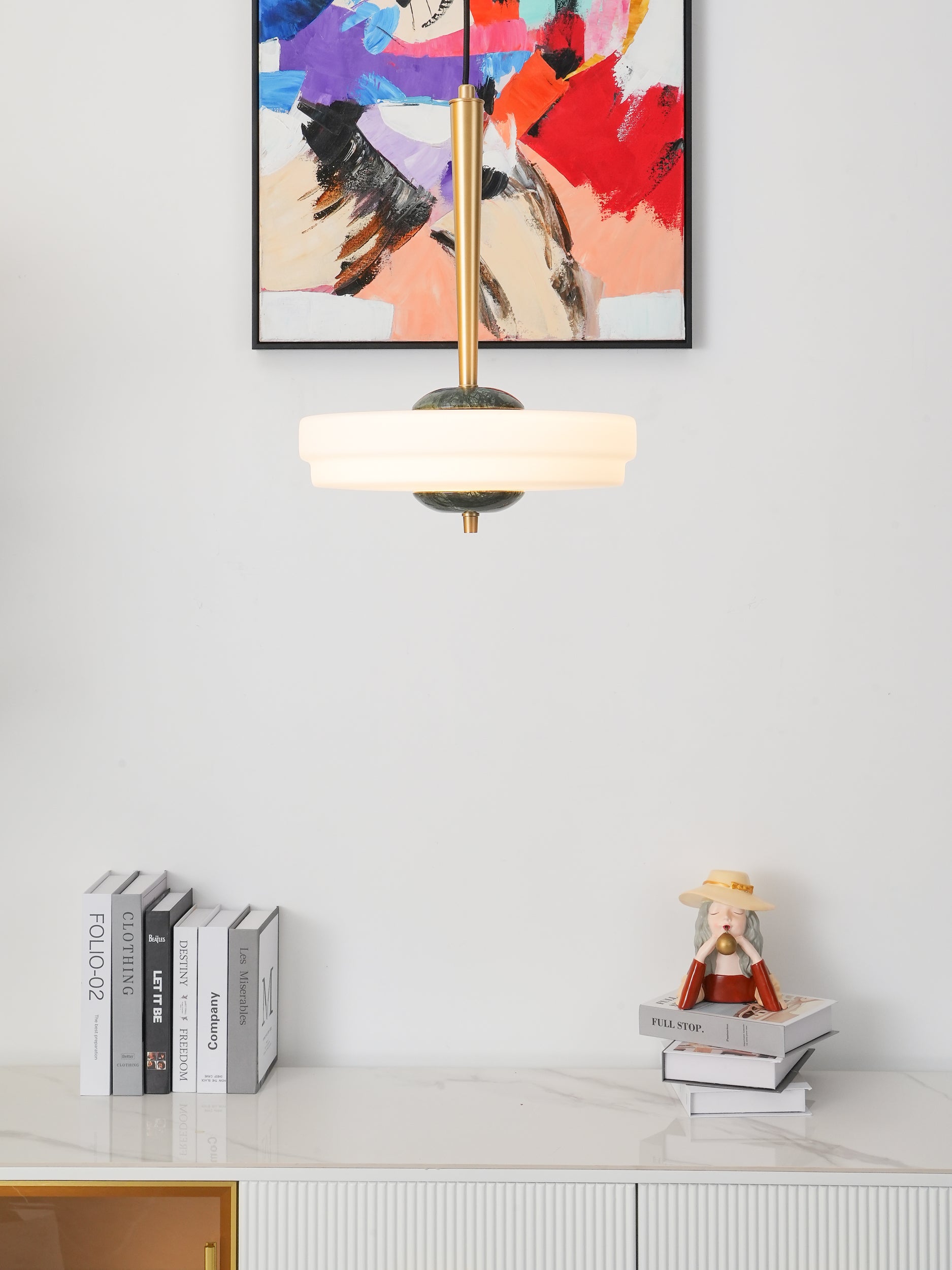 Suspended from a reeded, fluted brass stem, the two-tier, soft-finish, opal glass shade with spherical marble detailing produces a soft, ambient light.