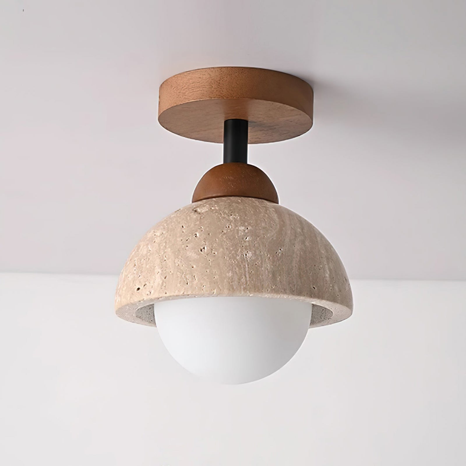 The Travertine Flush Mount Ceiling Light brings a natural, refined elegance to any space. Featuring a half-dome travertine stone shade with a smooth, earthy texture, it pairs beautifully with a warm wooden mount for a minimalist, organic look. The soft glow emitted from the glass diffuser underneath creates a cozy and inviting atmosphere, making it ideal for hallways, entryways, or intimate spaces. With its blend of natural materials and simple design, this flush mount light adds a touch of sophistication and warmth, perfect for modern and rustic interiors alike.