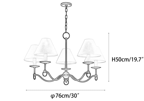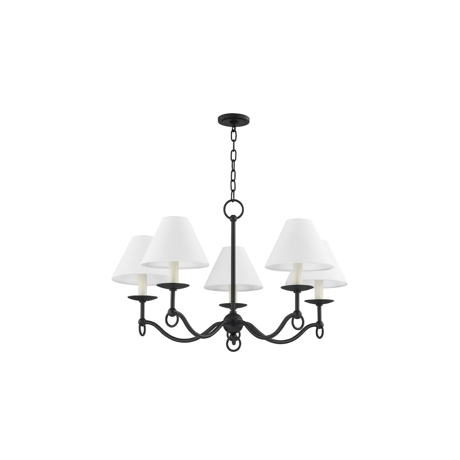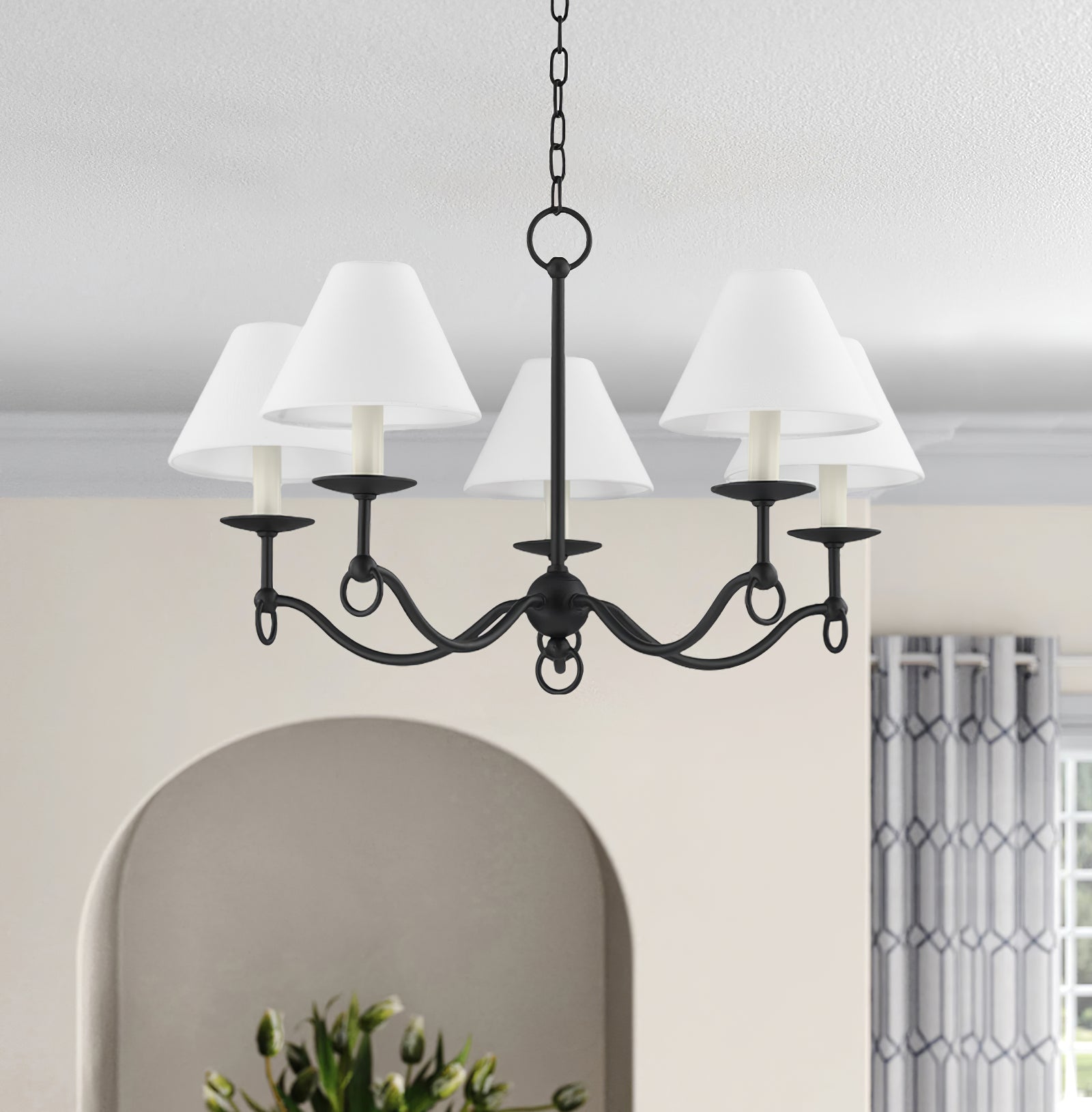 The Troy Lighting Massi Five-Arm Chandelier seamlessly blends timeless elegance with a transitional twist. Its classic English-style shades and candelabra lighting are complemented by finely crafted details, such as looped hardware and a central accent sphere, merging traditional sophistication with a modern edge. The chandelier’s gracefully curved arms add an extra touch of refinement, while the forged iron finish and white linen shades create a retro-chic aesthetic. Perfect for settings from traditional to modern farmhouse, this versatile piece brings warmth, charm, and a sense of understated luxury to any room.