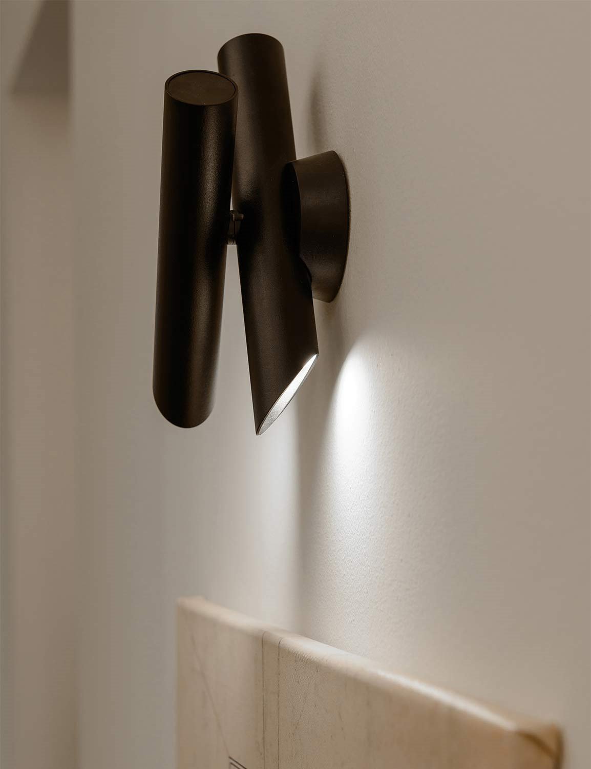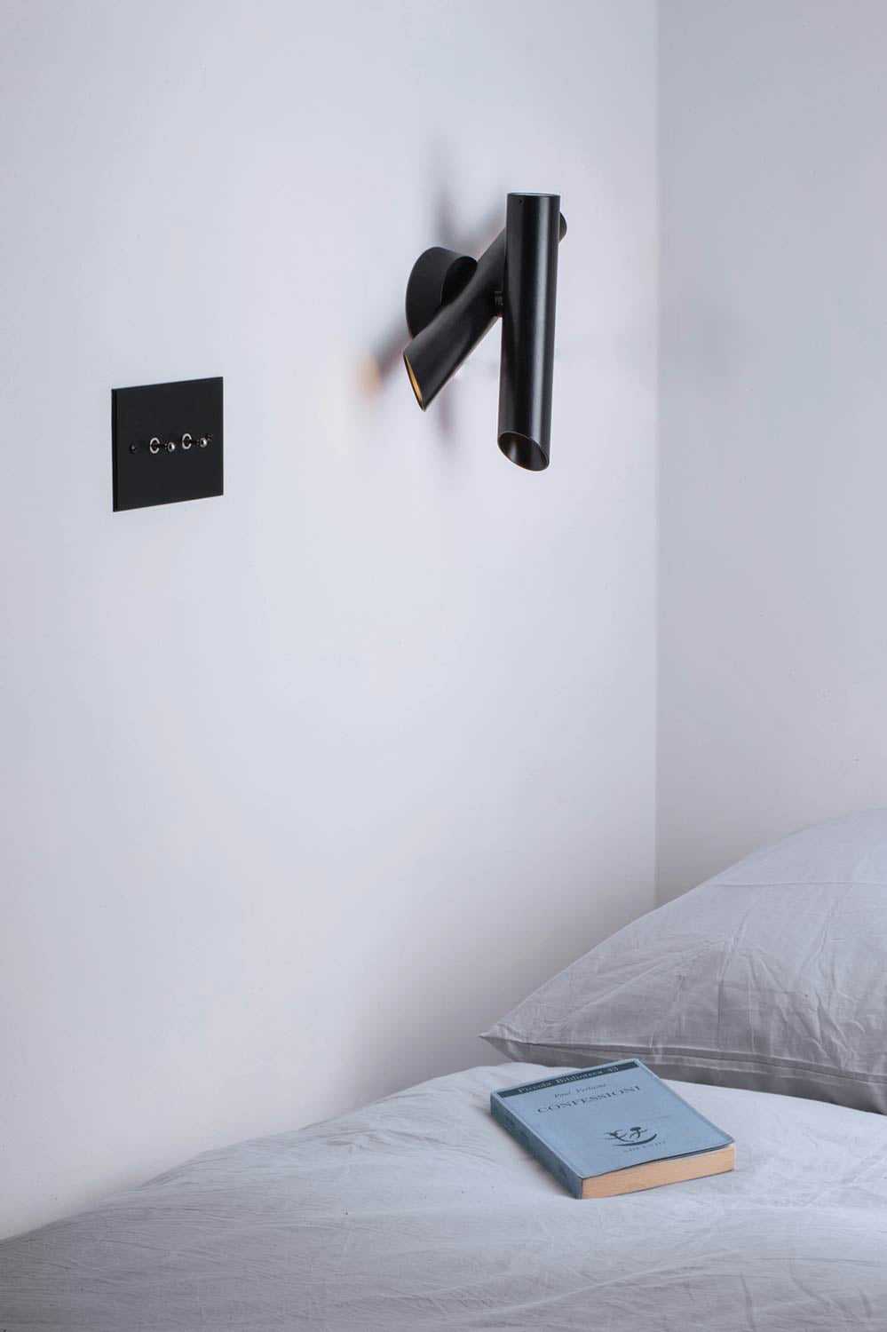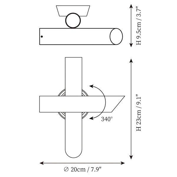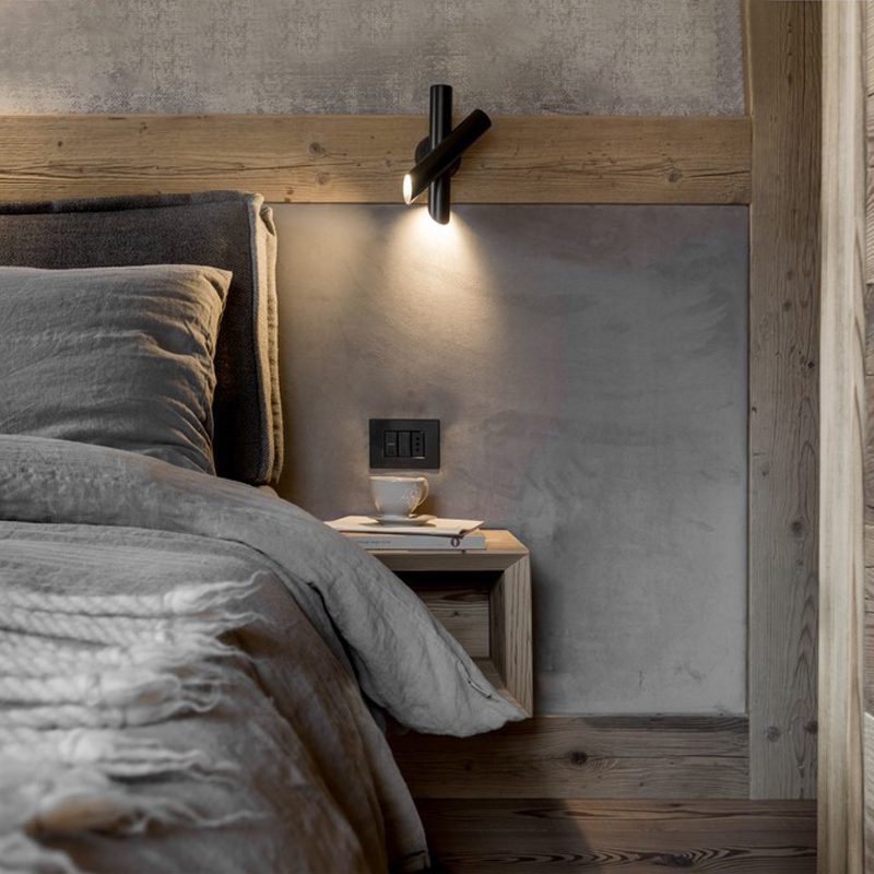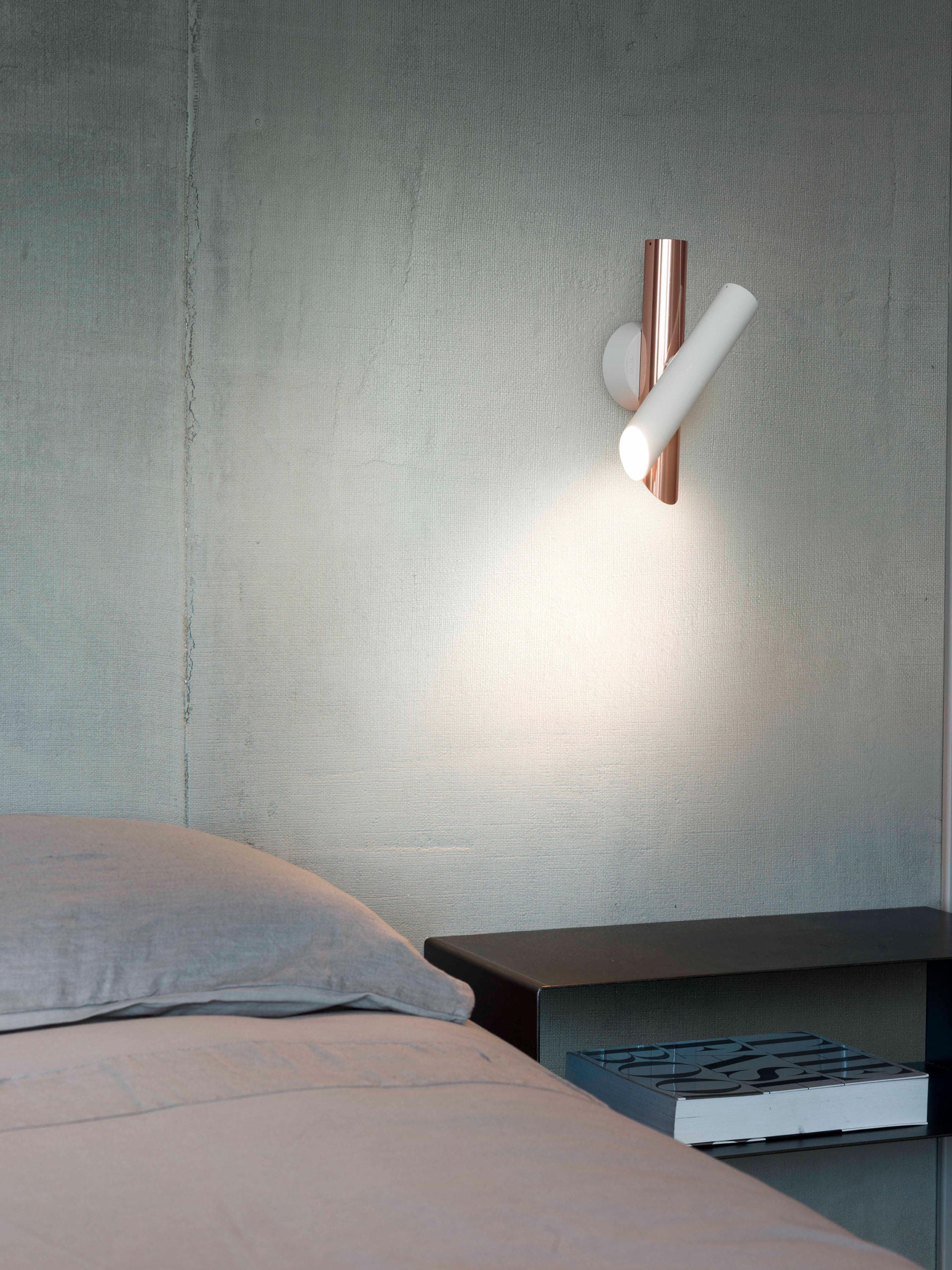 Family of suspension, wall, and ceiling lamps, made with tubular elements for objects with a strong and essential design that is expressed through pure forms. The wall versions are extruded aluminum rotatable and adjustable and are also available with a push dimmer installed directly on the lamp (Tubes 1/2). In the ceiling version, the ceiling element rotates at 340 °, while the other cylinder can be rotated by 90 °.