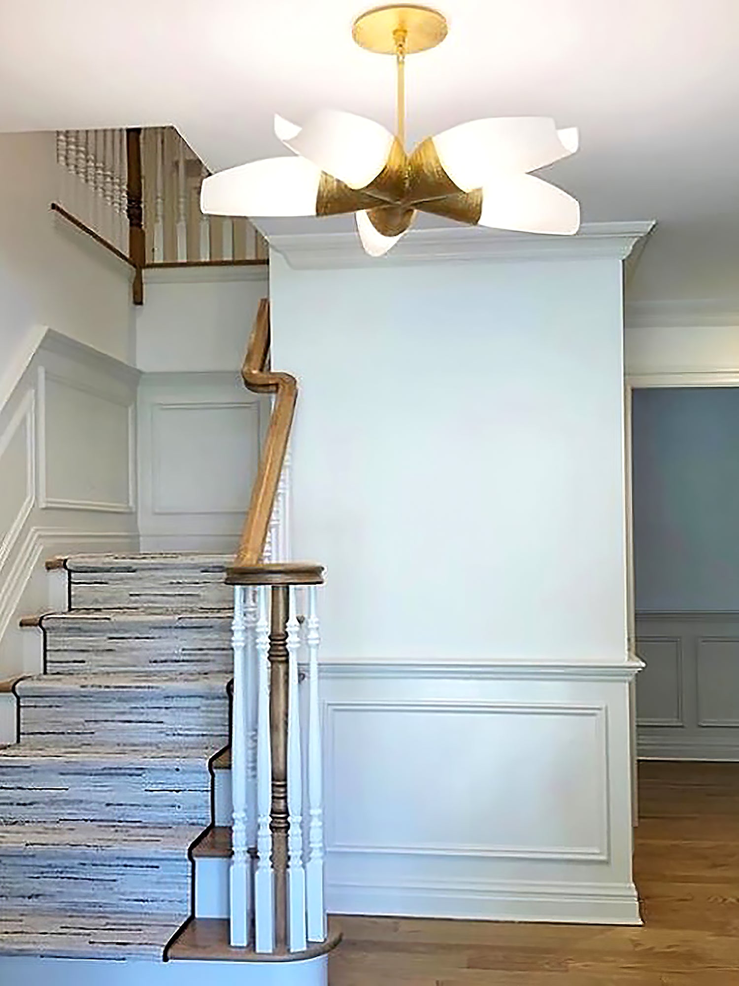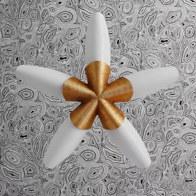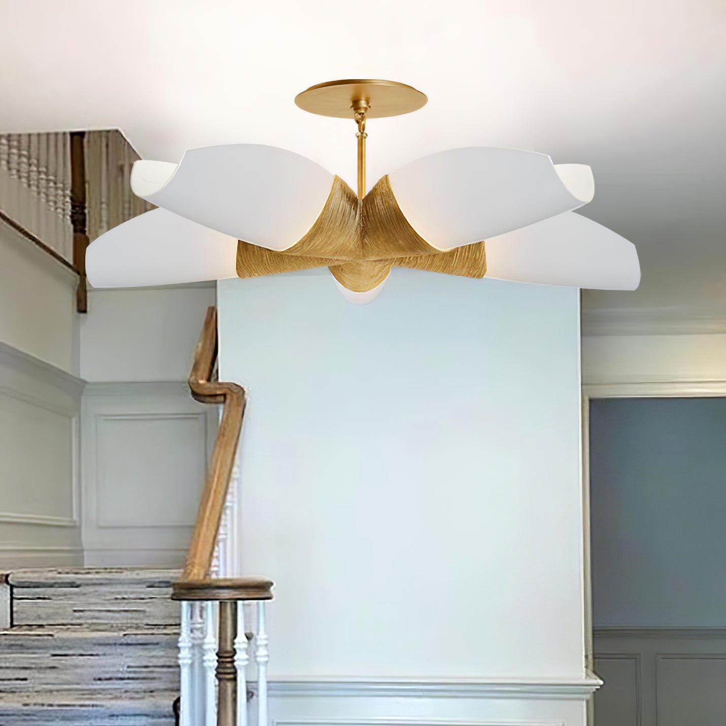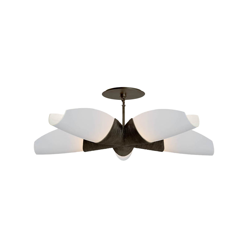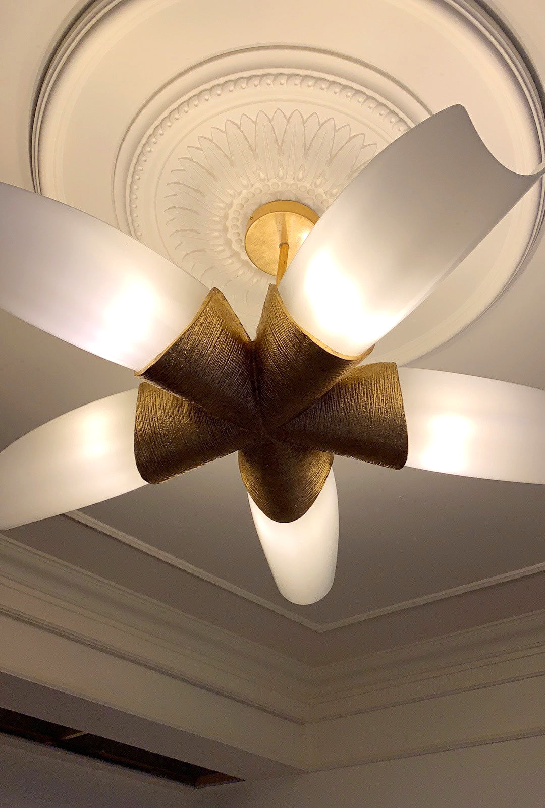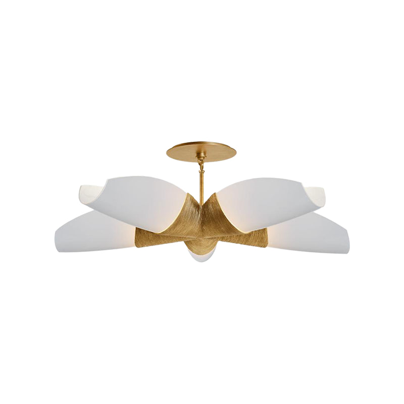 Discover a modern masterpiece with the Utopia Five-Arm Chandelier! Designed by Kelly Wearstler, this stunning chandelier features a gilded finish and a unique ribbed texture. Five elongated glass molds are arranged in a fan-shaped pattern, adding a touch of elegance to any space. Don't miss this one-of-a-kind piece.
