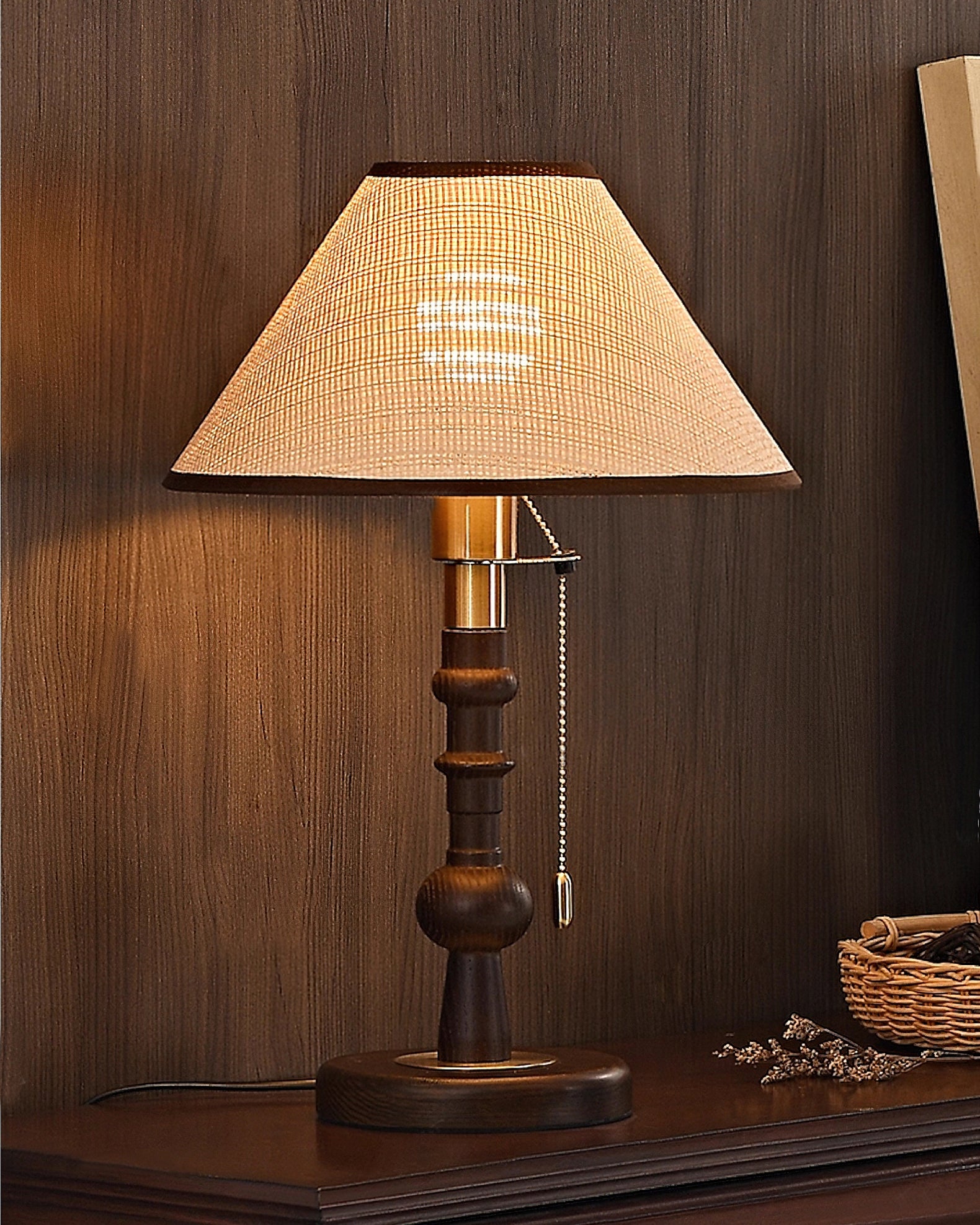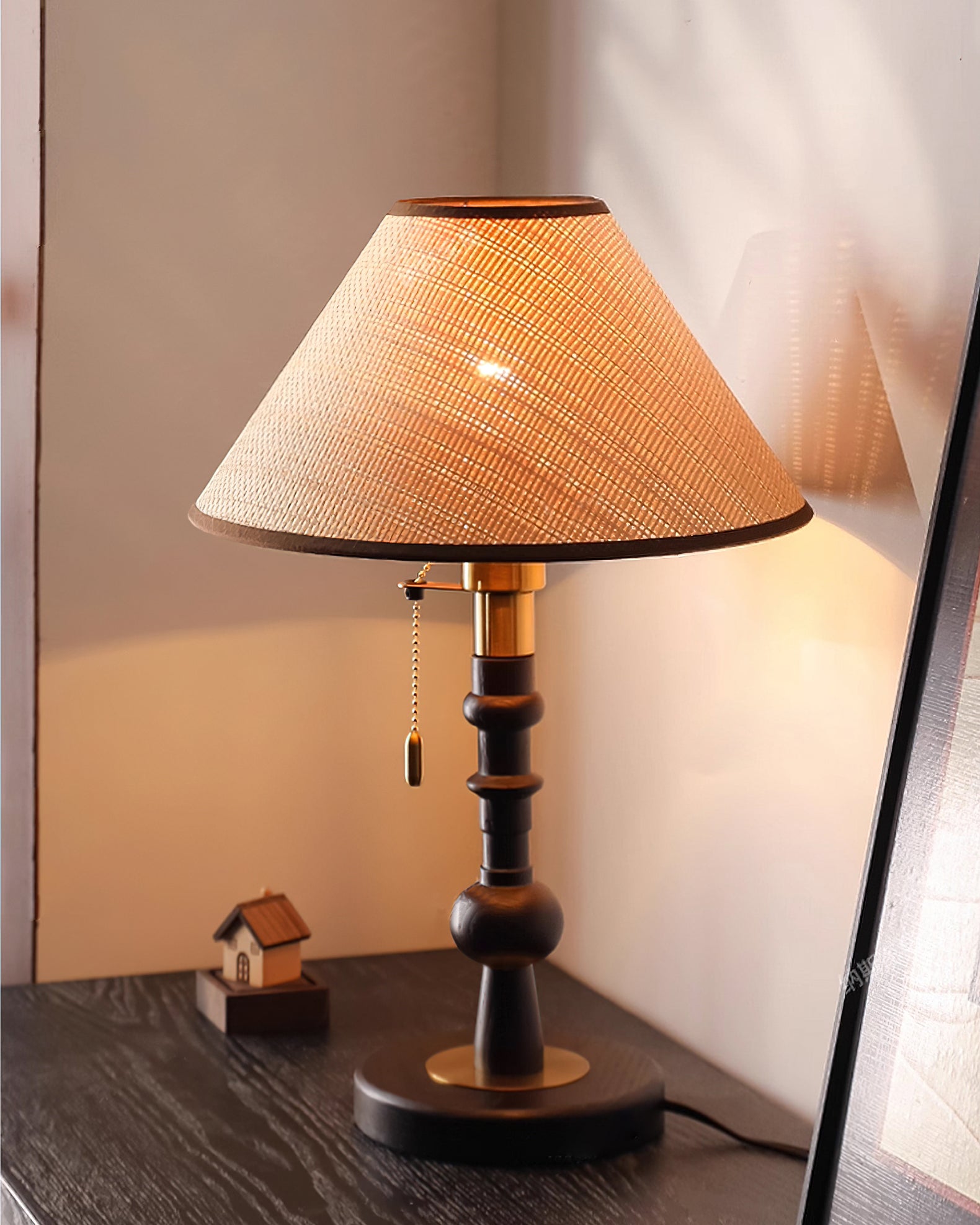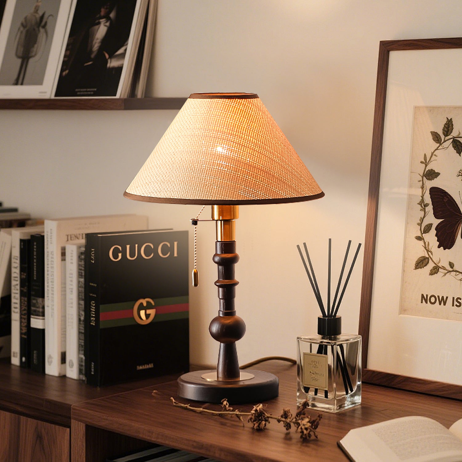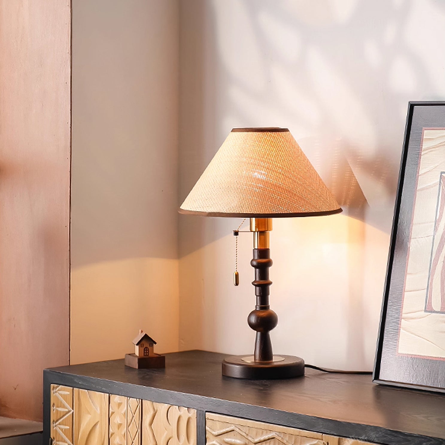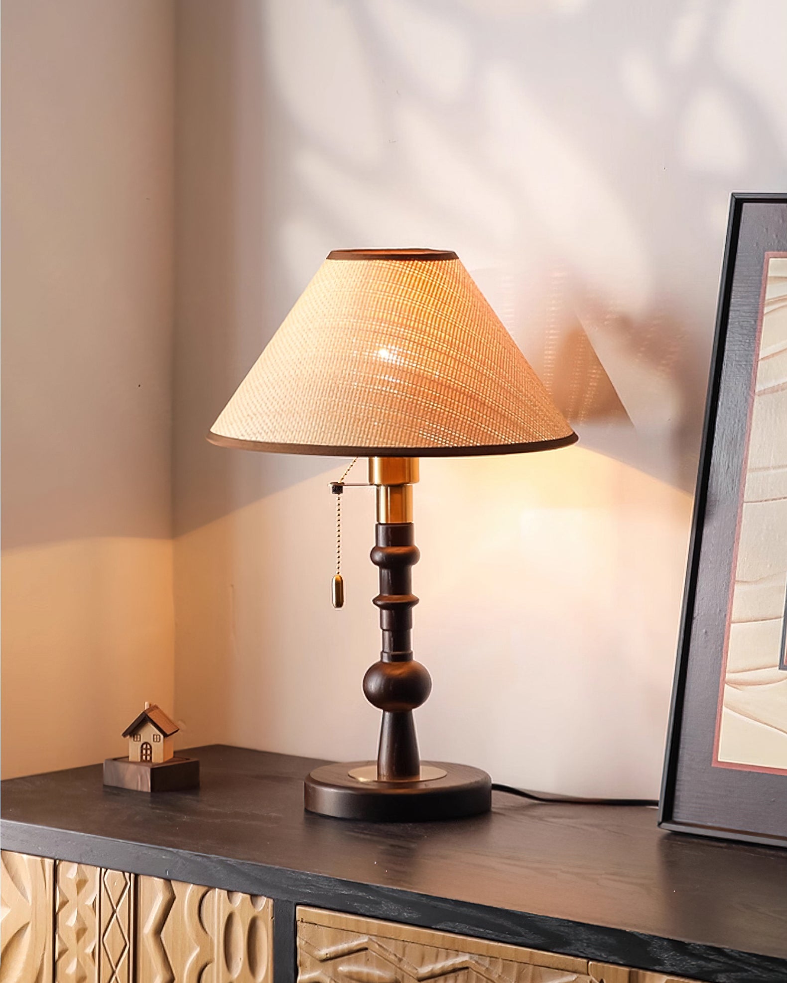 The Valinte Table Lamp from Mooijane features a carved solid wood base paired with a tapered fabric shade, blending natural texture with timeless elegance. Its warm, inviting glow and convenient pull-chain switch make it perfect for bedrooms, studies, or living rooms, adding both style and cozy sophistication to any space.