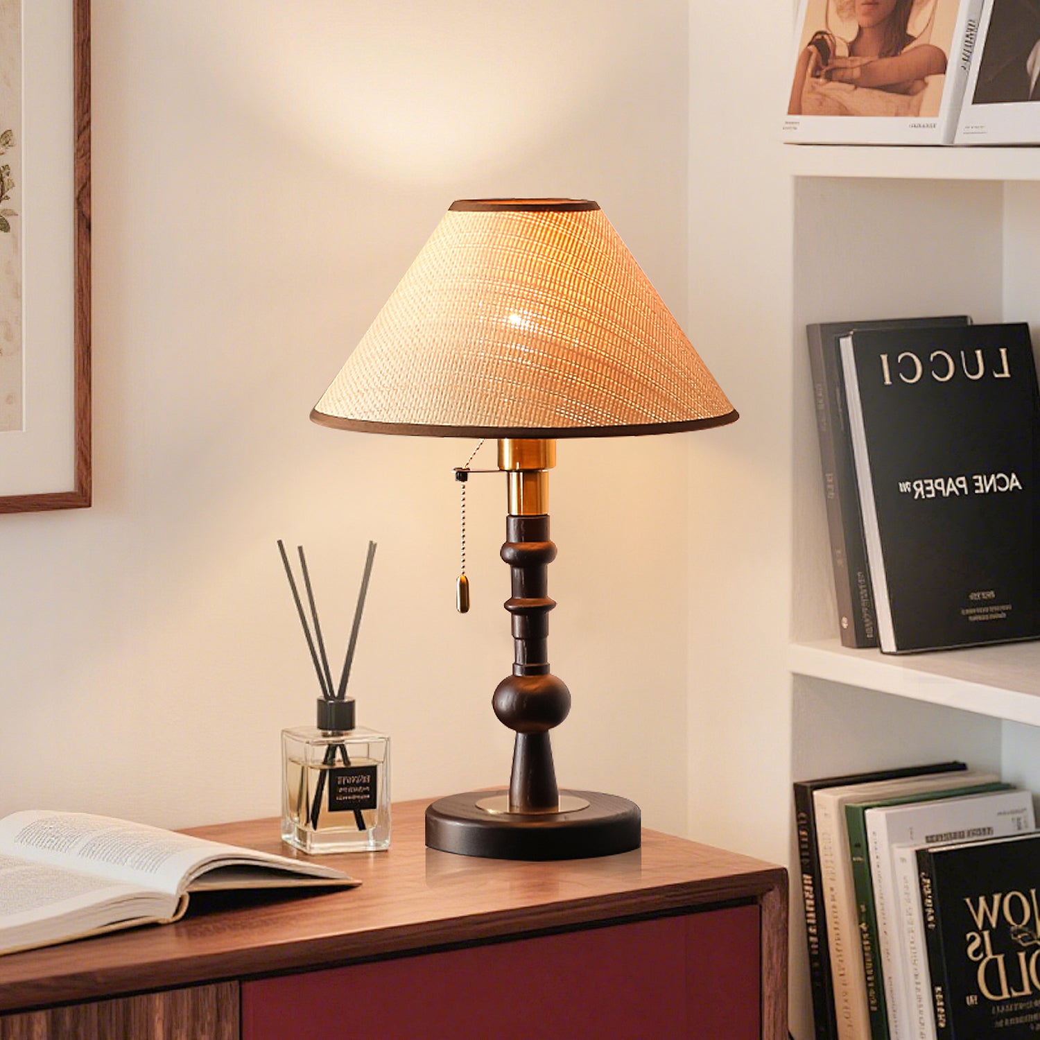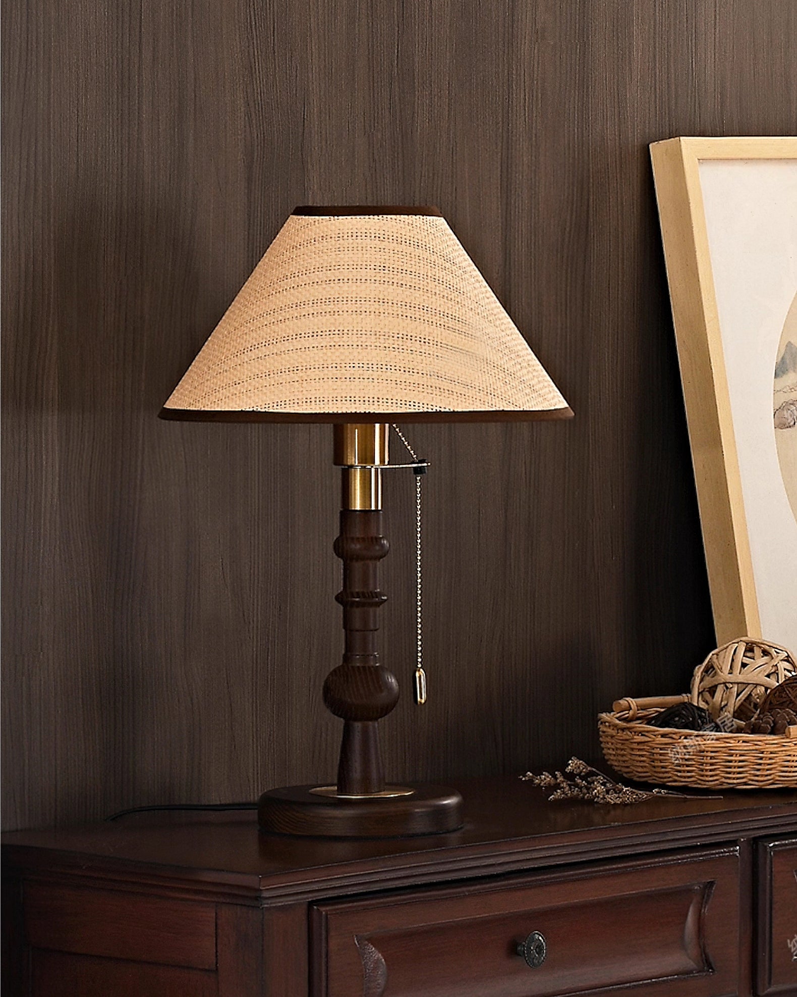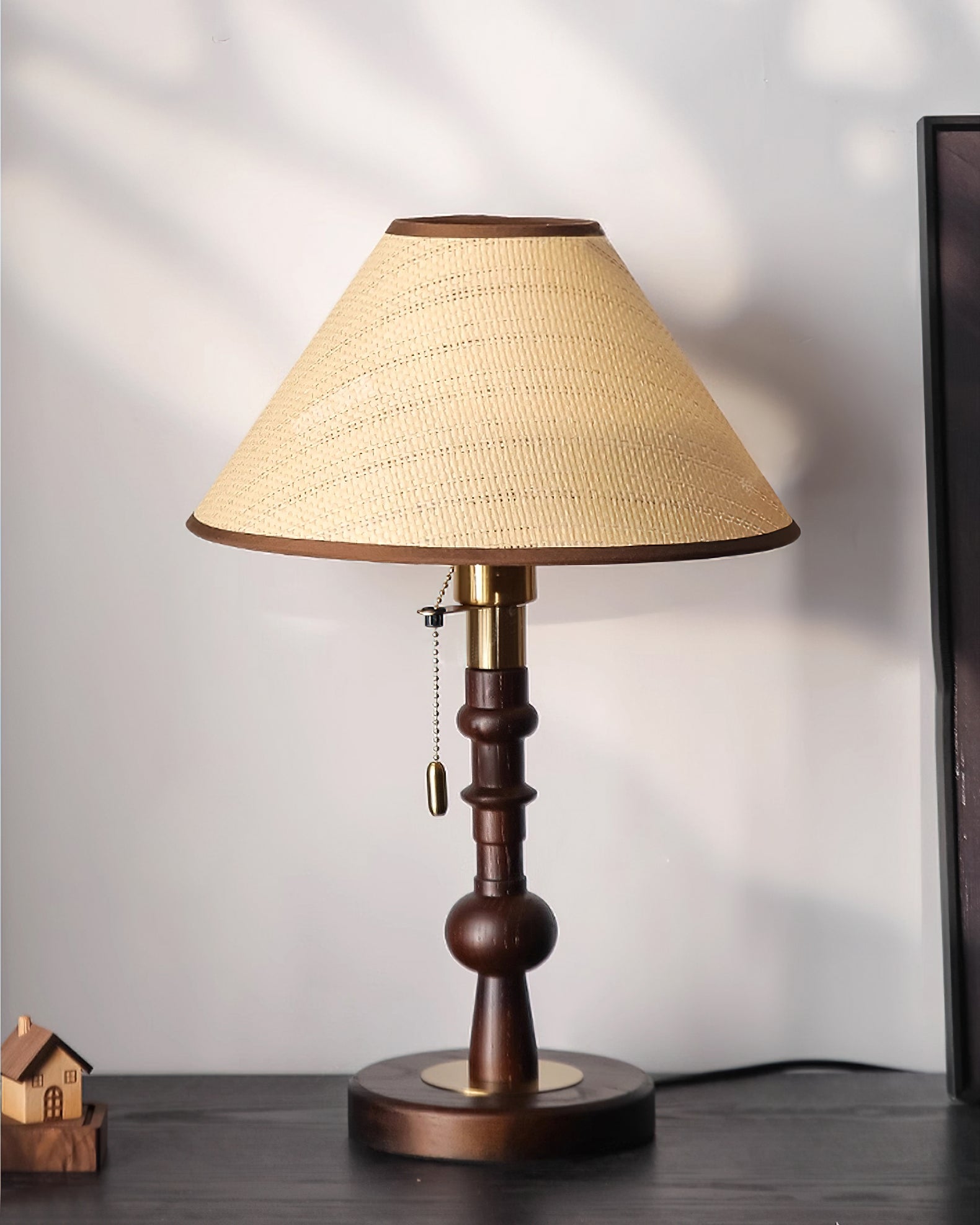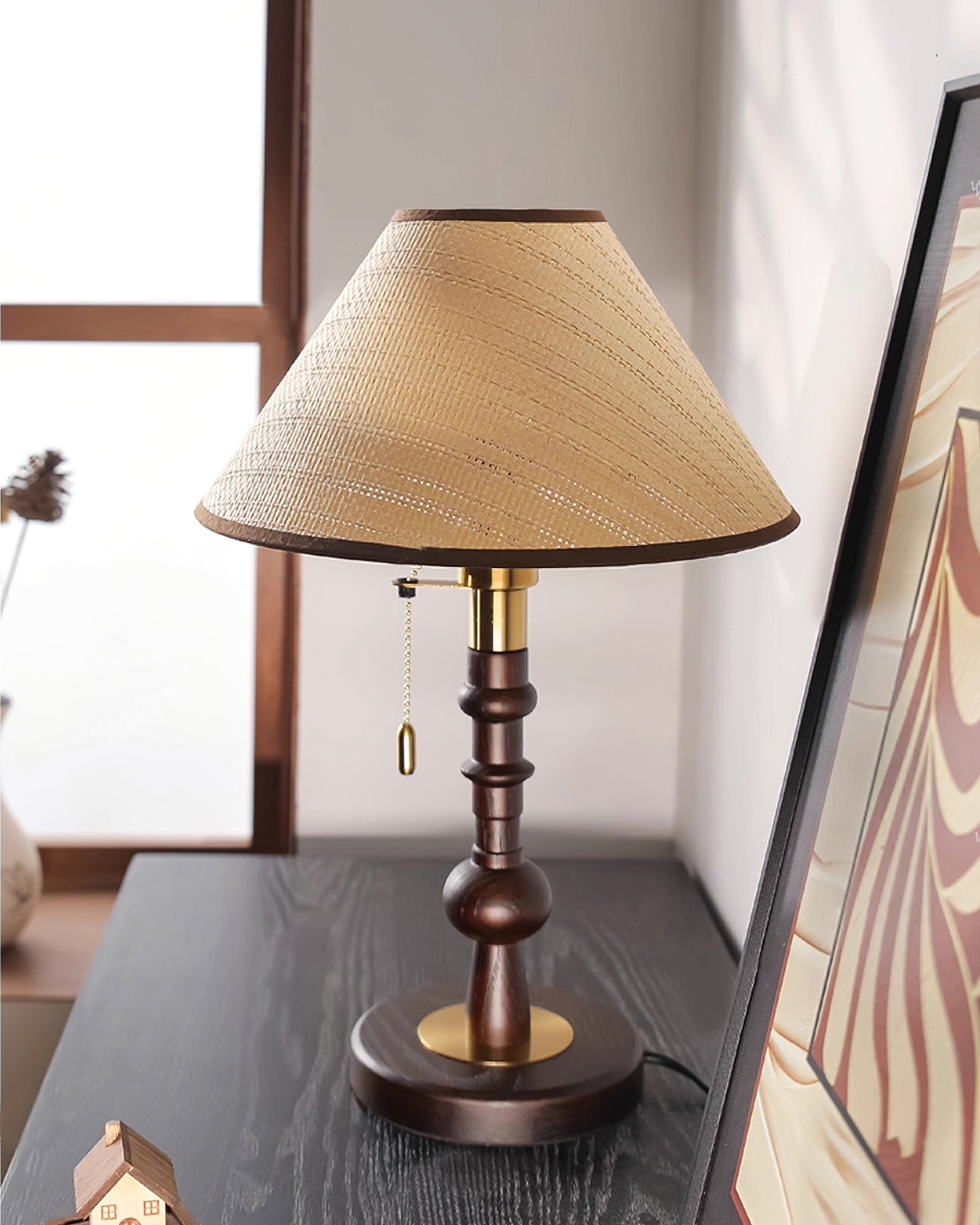 The Valinte Table Lamp from Mooijane features a carved solid wood base paired with a tapered fabric shade, blending natural texture with timeless elegance. Its warm, inviting glow and convenient pull-chain switch make it perfect for bedrooms, studies, or living rooms, adding both style and cozy sophistication to any space.