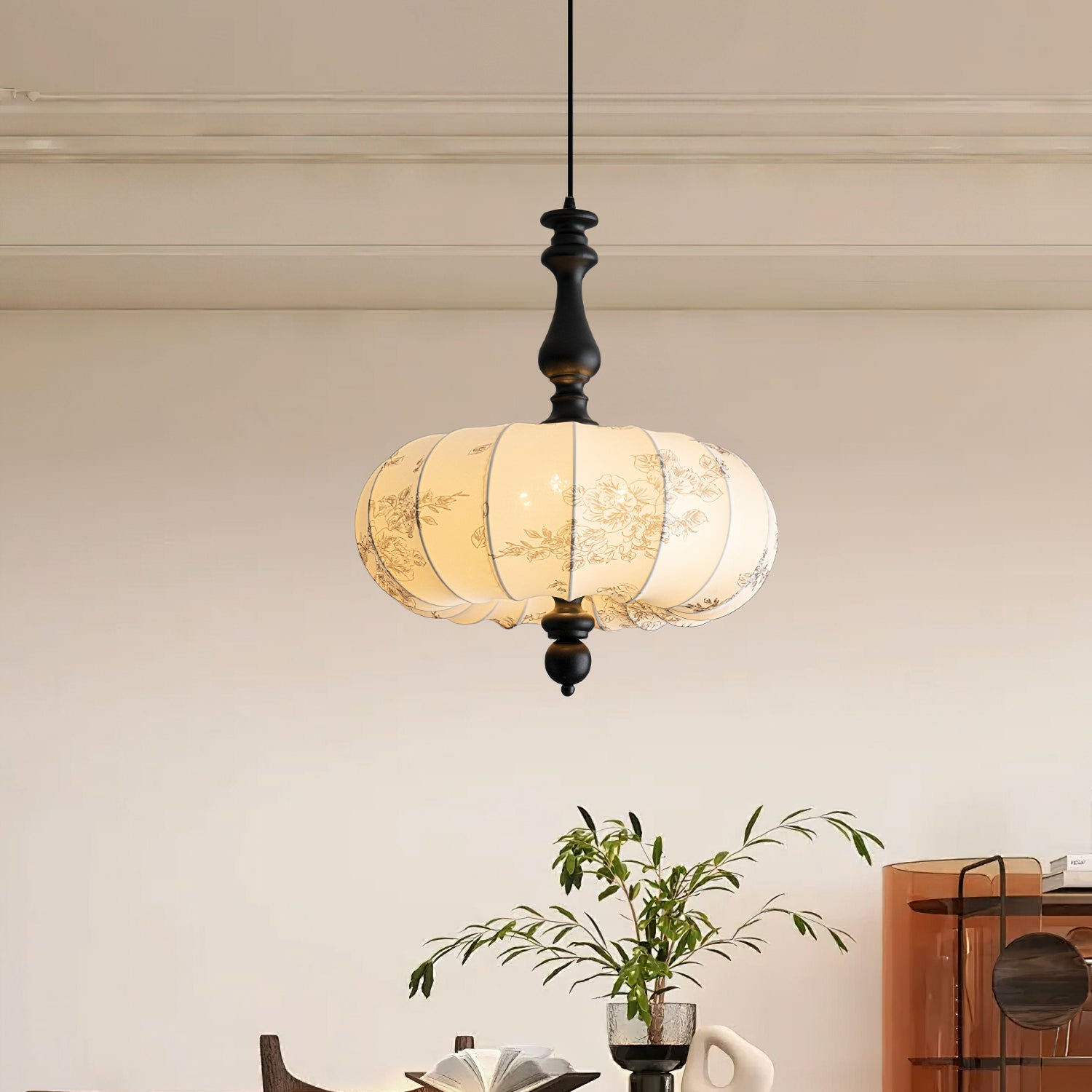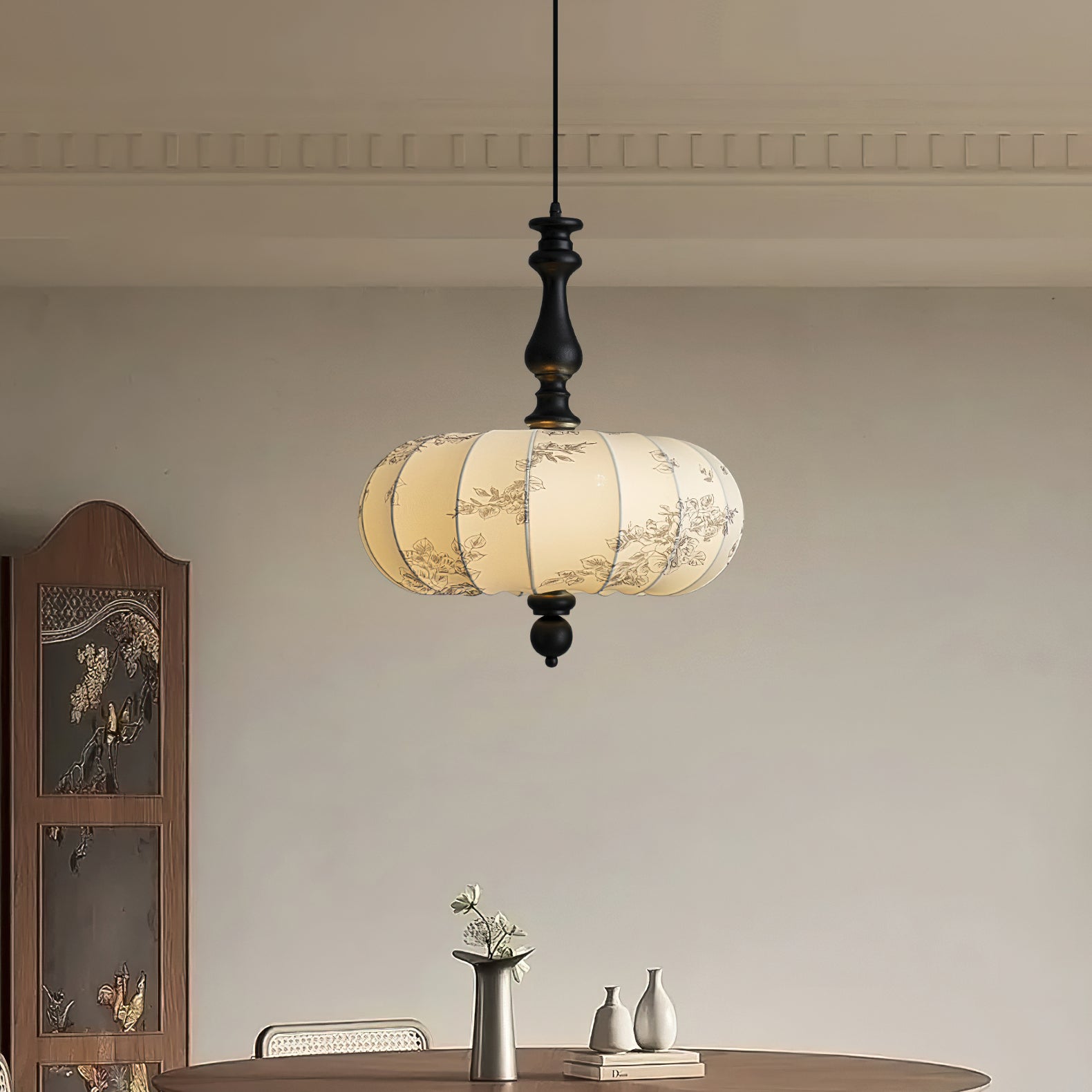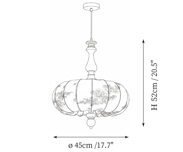 The Velina Pendant Lamp from Mooijane blends traditional and vintage elements with modern elegance. A warm wooden stem complements a fabric shade adorned with delicate floral patterns, softly diffusing light. Scalloped edges and refined wooden accents create a playful yet sophisticated design, ideal for dining areas, living rooms, or bedrooms—bringing both charm and functional illumination to your space.