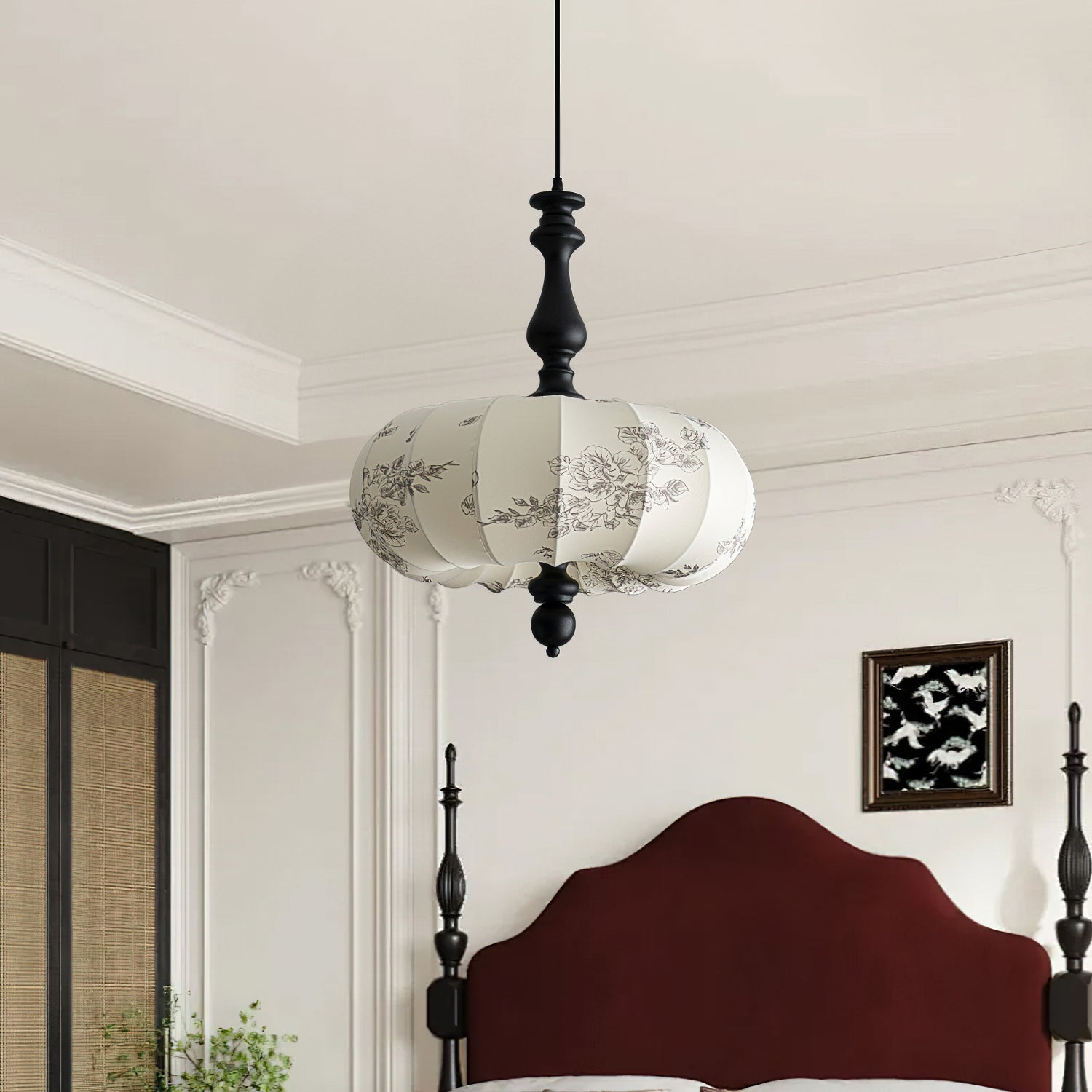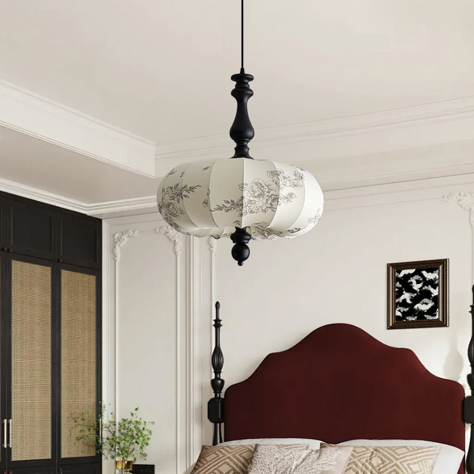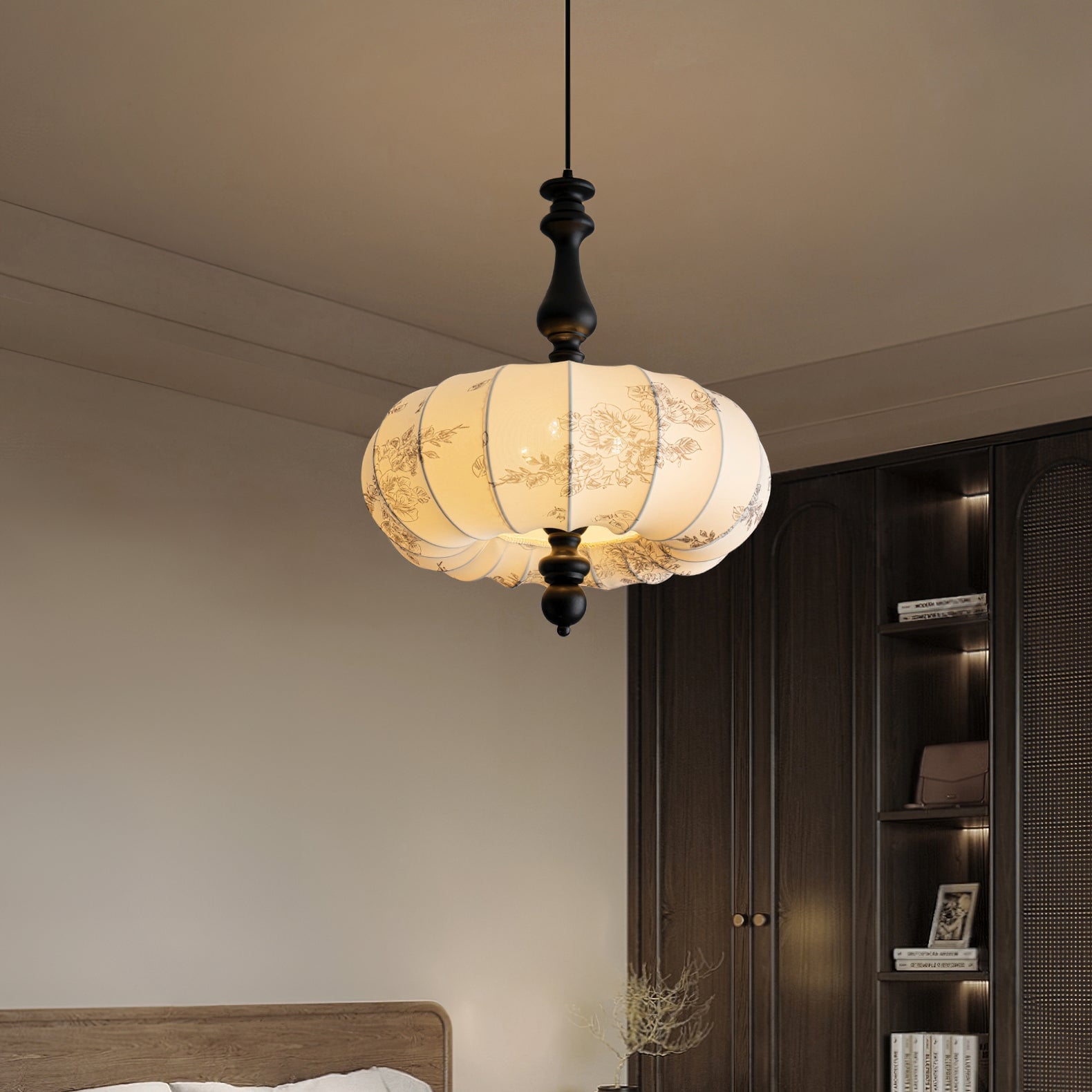 The Velina Pendant Lamp from Mooijane blends traditional and vintage elements with modern elegance. A warm wooden stem complements a fabric shade adorned with delicate floral patterns, softly diffusing light. Scalloped edges and refined wooden accents create a playful yet sophisticated design, ideal for dining areas, living rooms, or bedrooms—bringing both charm and functional illumination to your space.