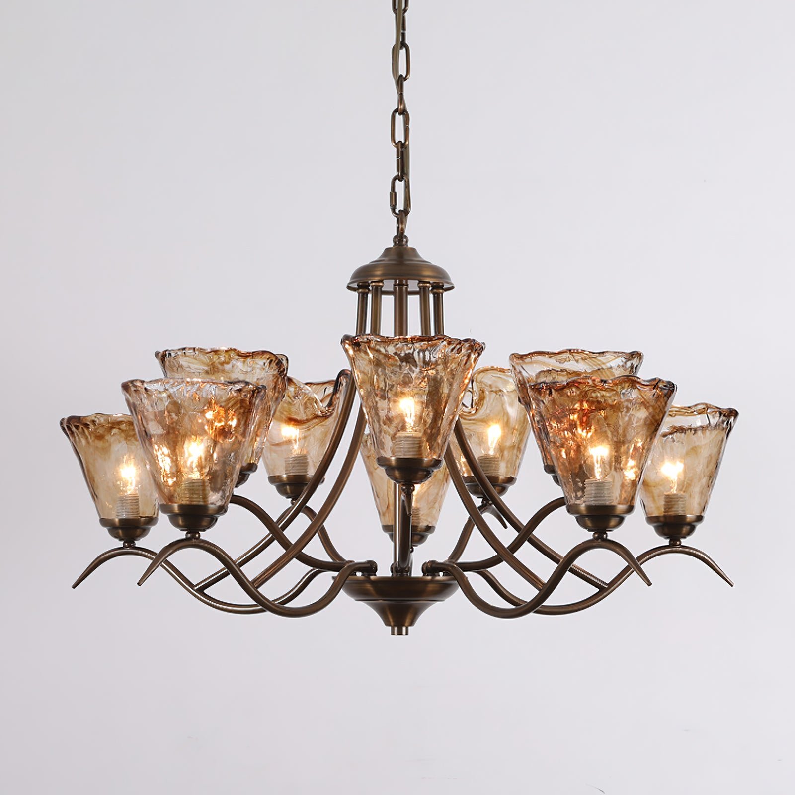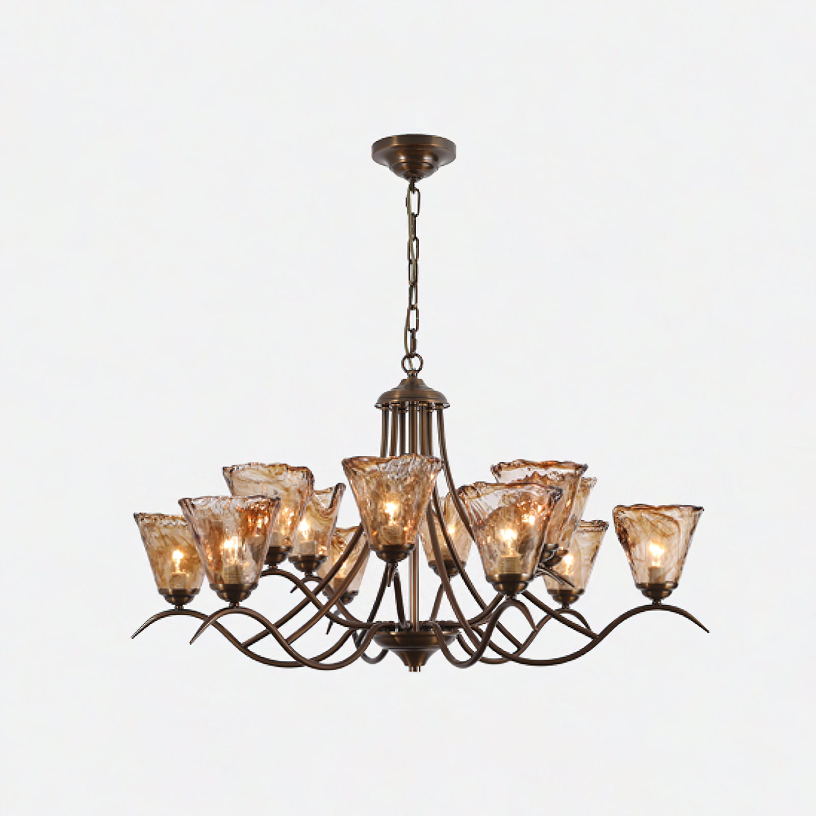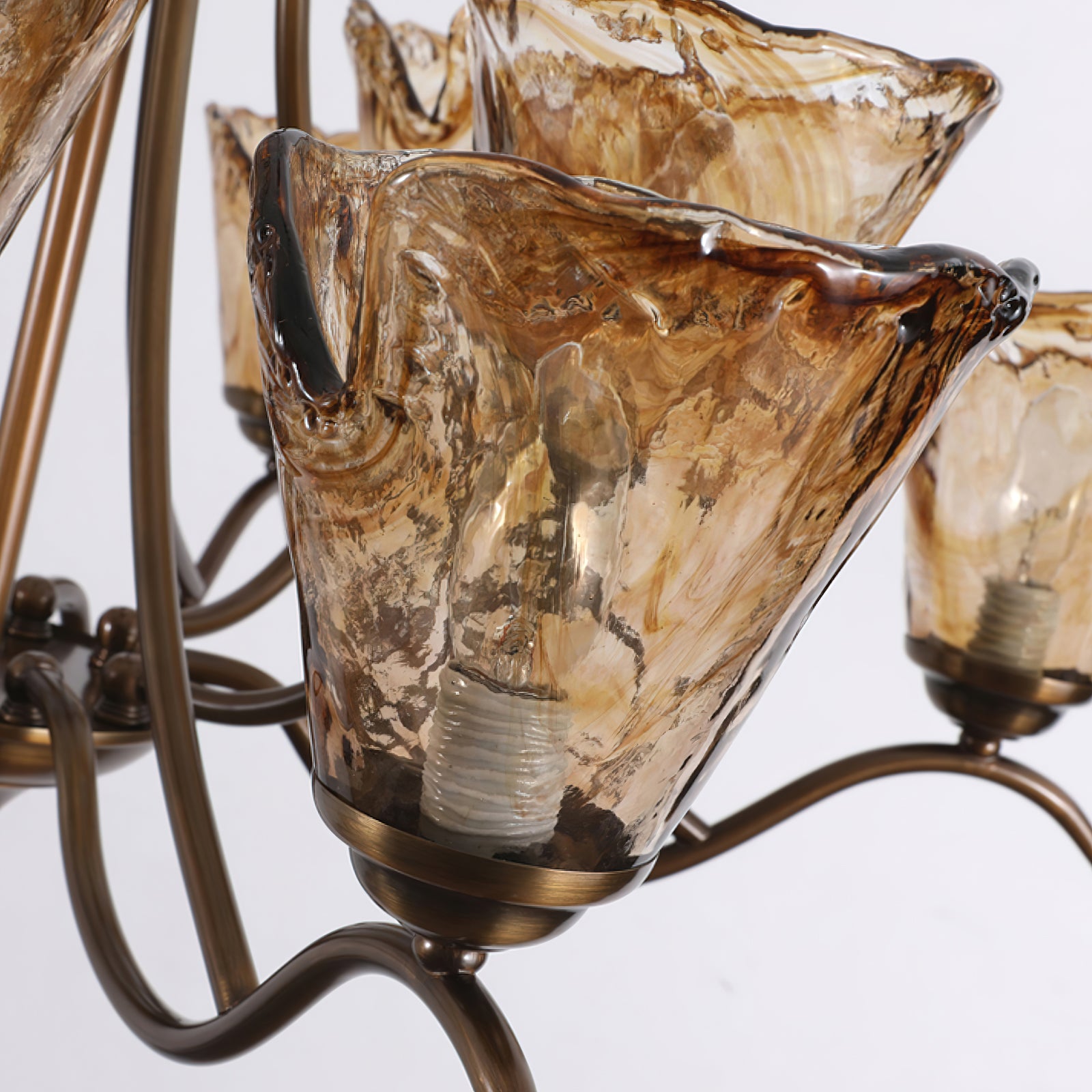 This Vetraio Chandelier by Mooijane perfectly blends modern creativity with classic design. Its delicate scroll-style arms and ornate bronze accents add a touch of sophistication to any room. The handcrafted amber glass shade features a unique free-form design, adding a touch of elegance and value to this stunning piece.