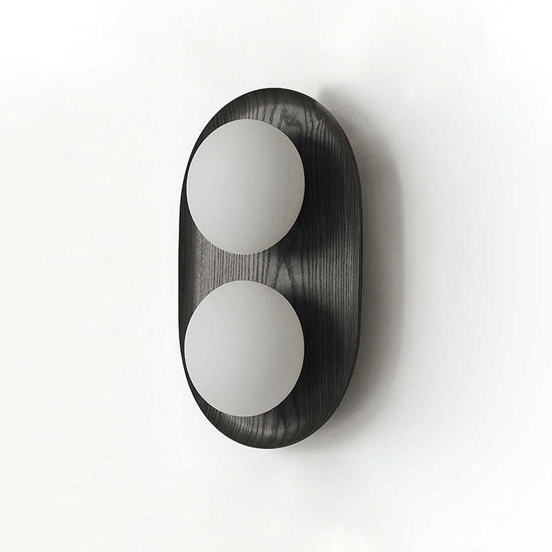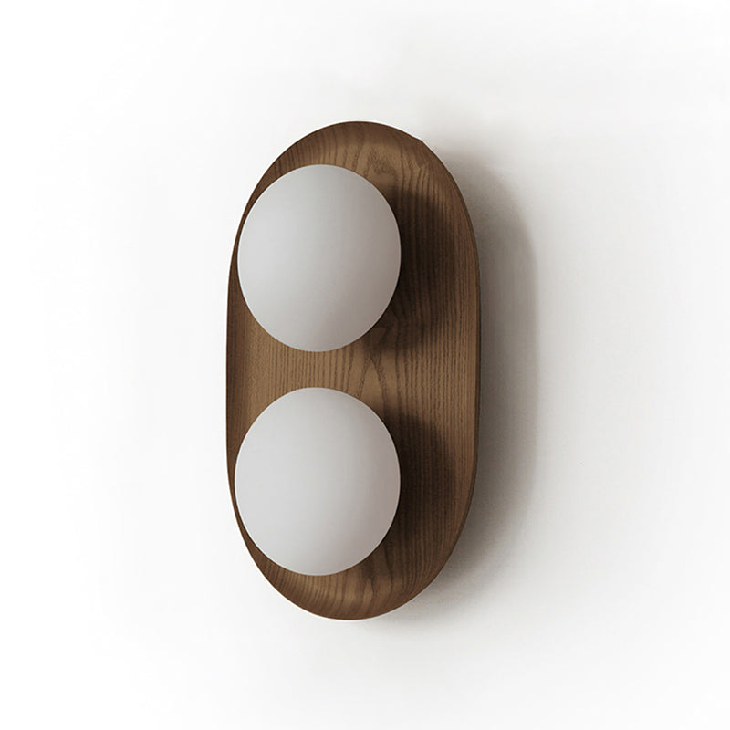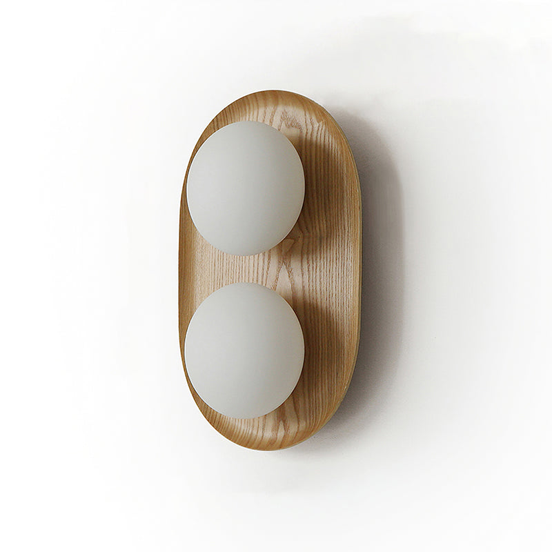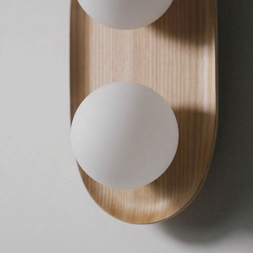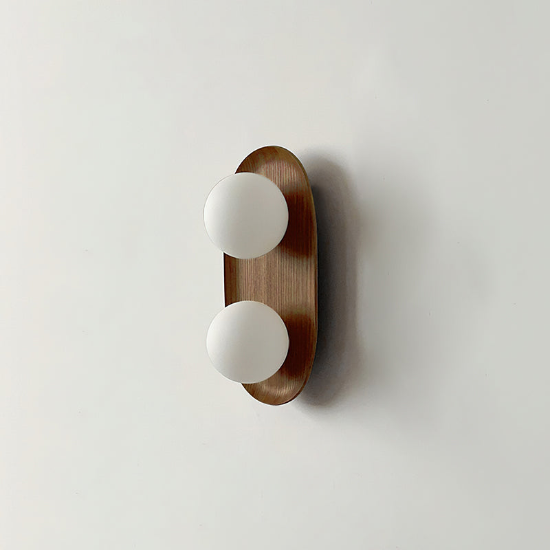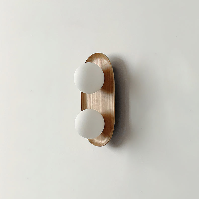 The Vidalet Wall Lamp by Mooijane strikes a refined balance between natural warmth and modern design. Its oval wooden base, with smooth lines and visible grain, exudes organic charm, while two frosted glass globes float above, lending a sculptural elegance. When illuminated, the globes cast a soft, even glow that creates a tranquil and inviting ambiance.