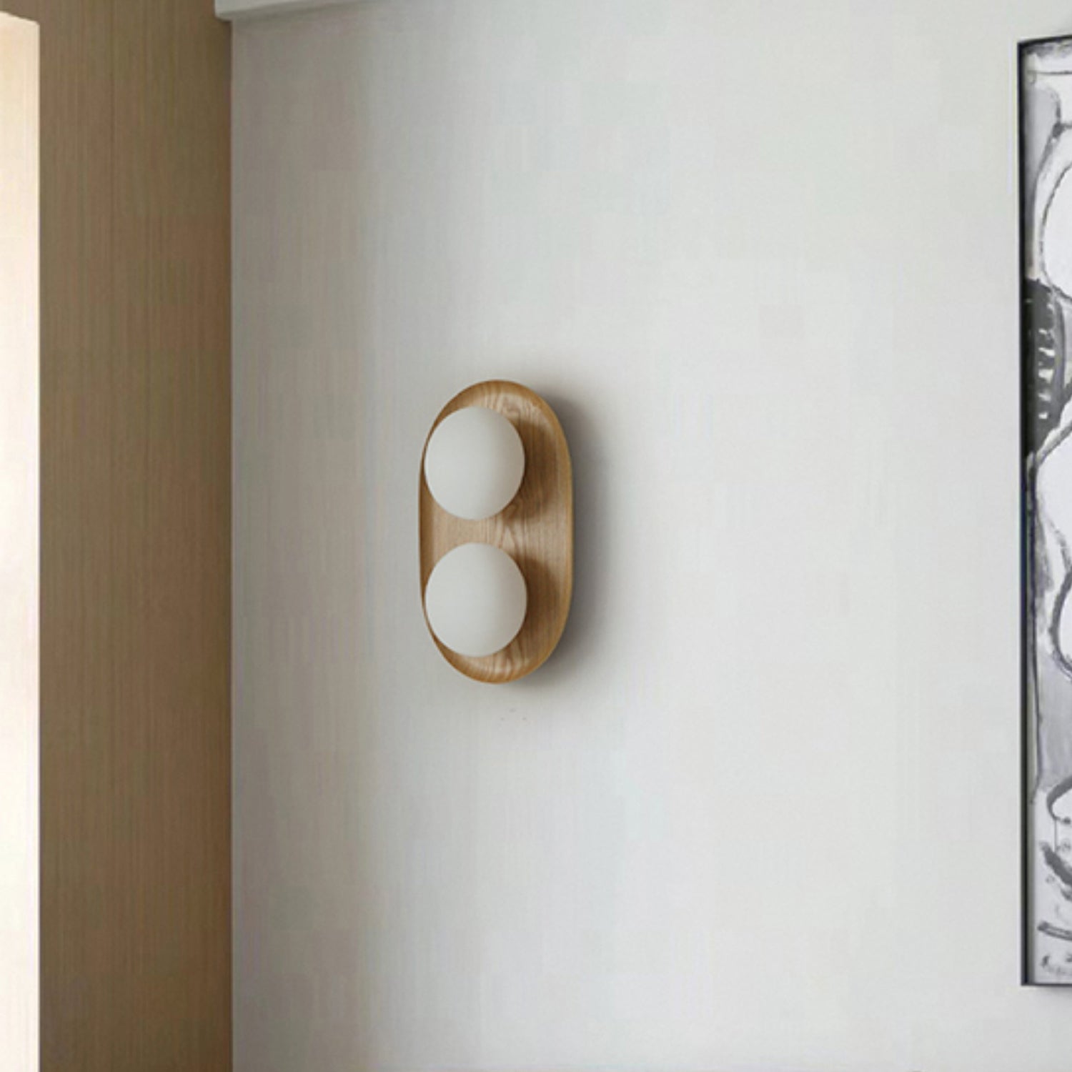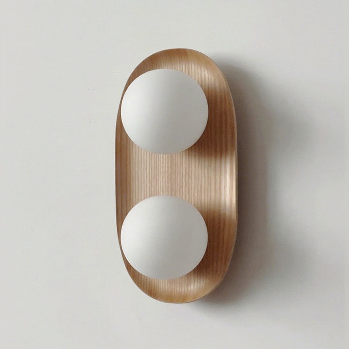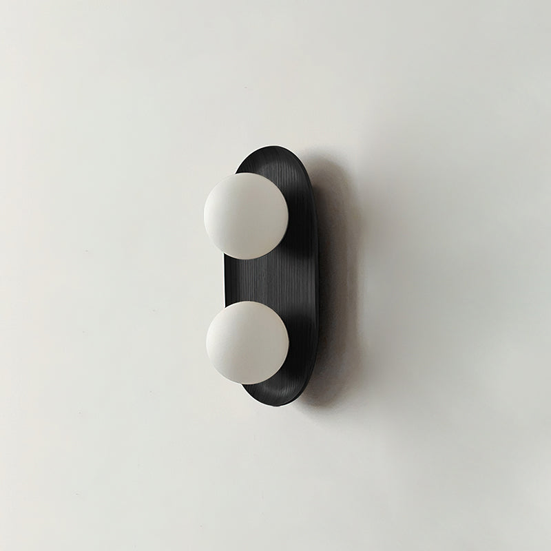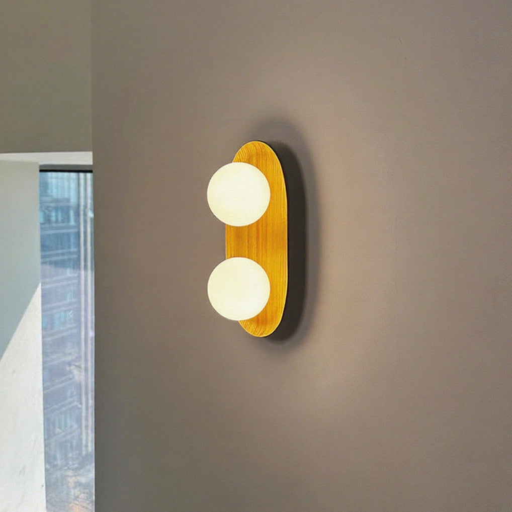 The Vidalet Wall Lamp by Mooijane strikes a refined balance between natural warmth and modern design. Its oval wooden base, with smooth lines and visible grain, exudes organic charm, while two frosted glass globes float above, lending a sculptural elegance. When illuminated, the globes cast a soft, even glow that creates a tranquil and inviting ambiance.
