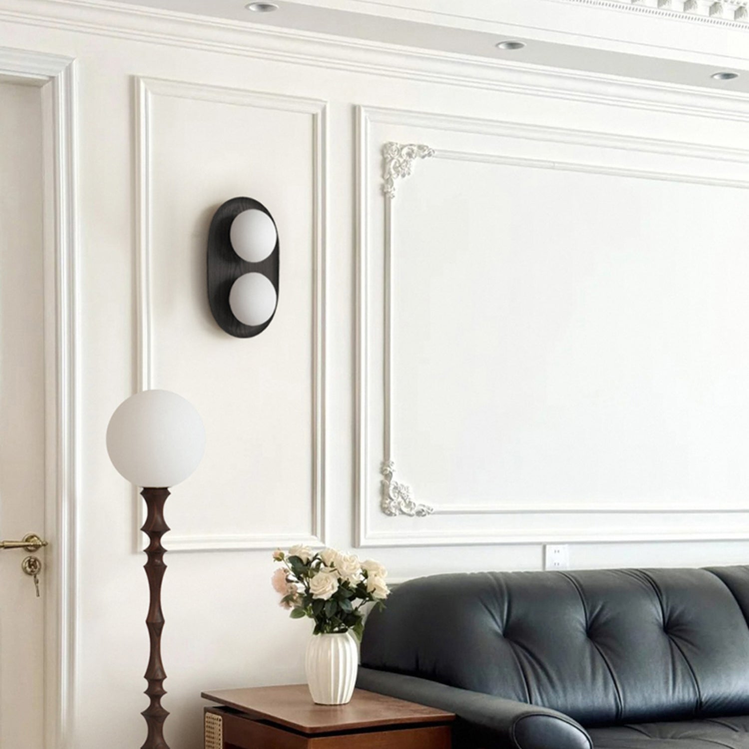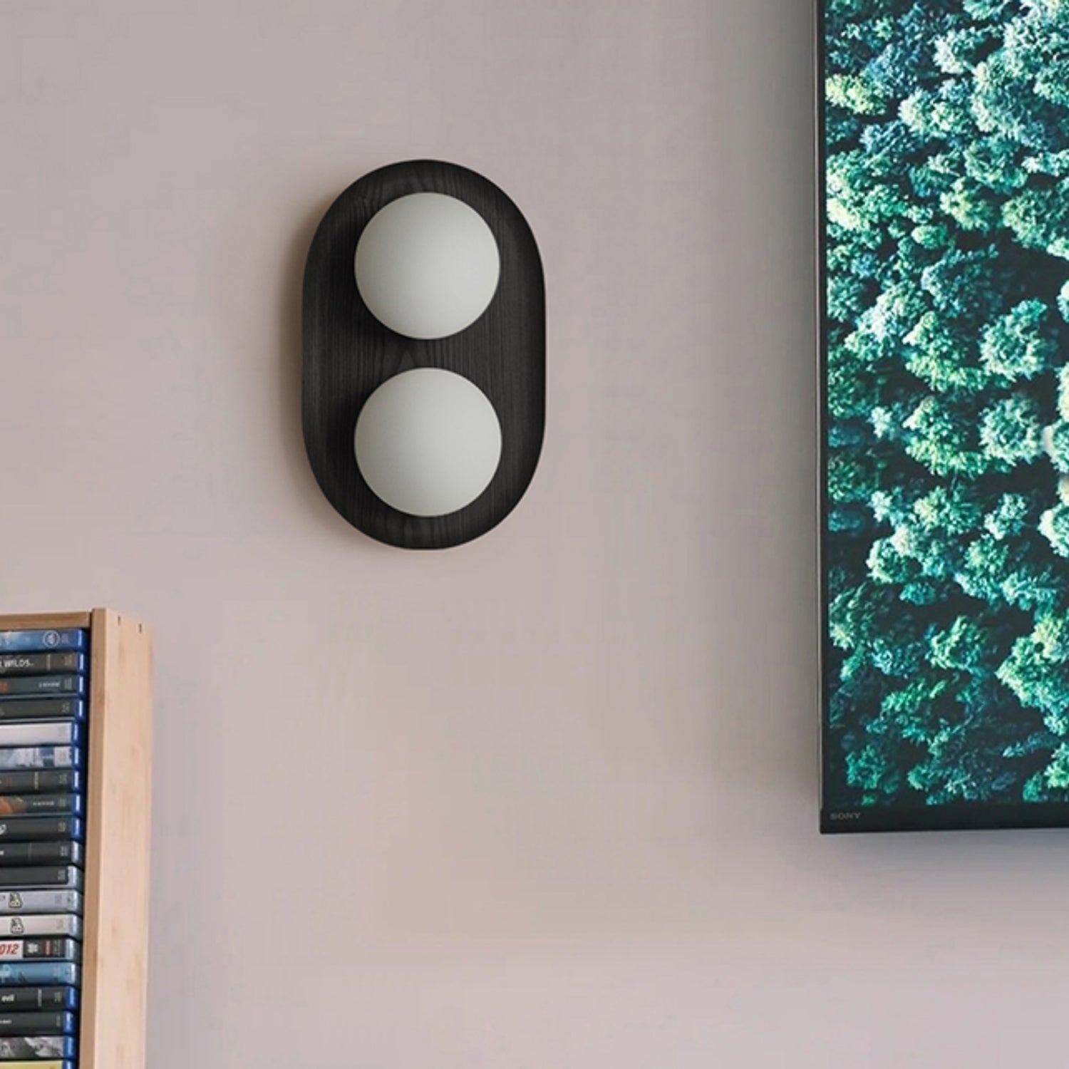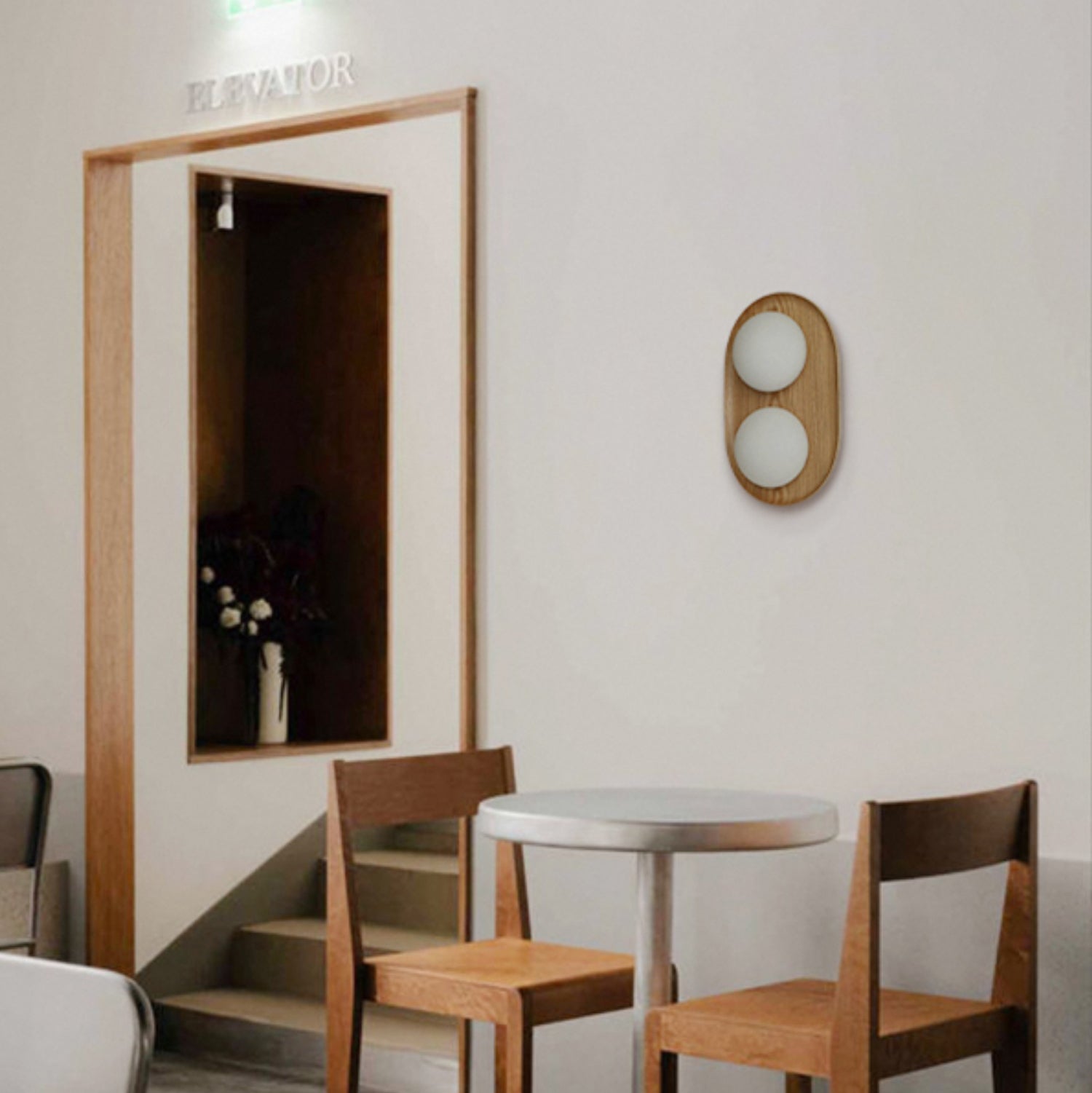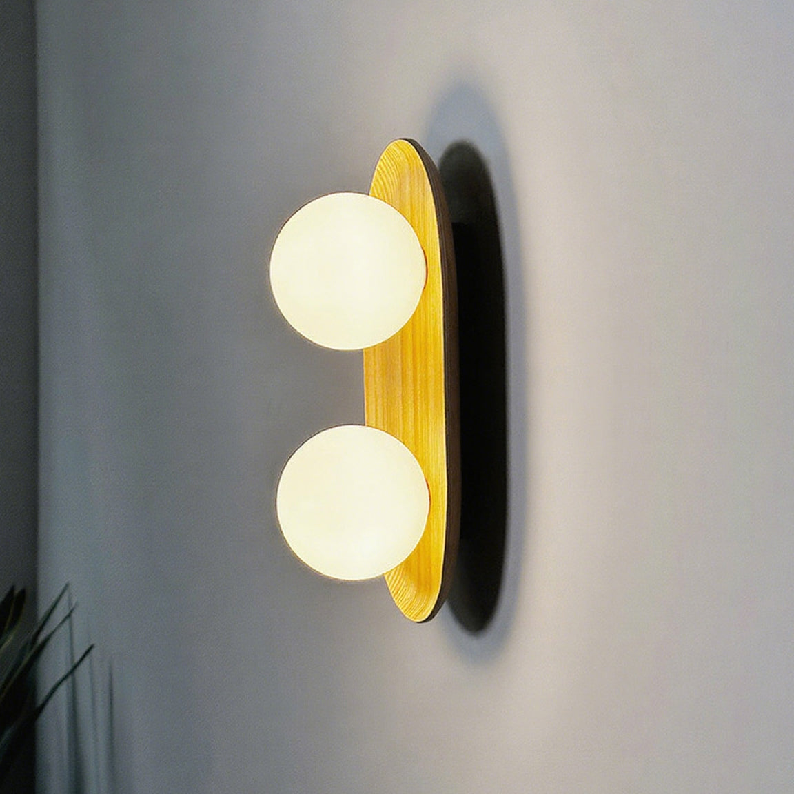 The Vidalet Wall Lamp by Mooijane strikes a refined balance between natural warmth and modern design. Its oval wooden base, with smooth lines and visible grain, exudes organic charm, while two frosted glass globes float above, lending a sculptural elegance. When illuminated, the globes cast a soft, even glow that creates a tranquil and inviting ambiance.