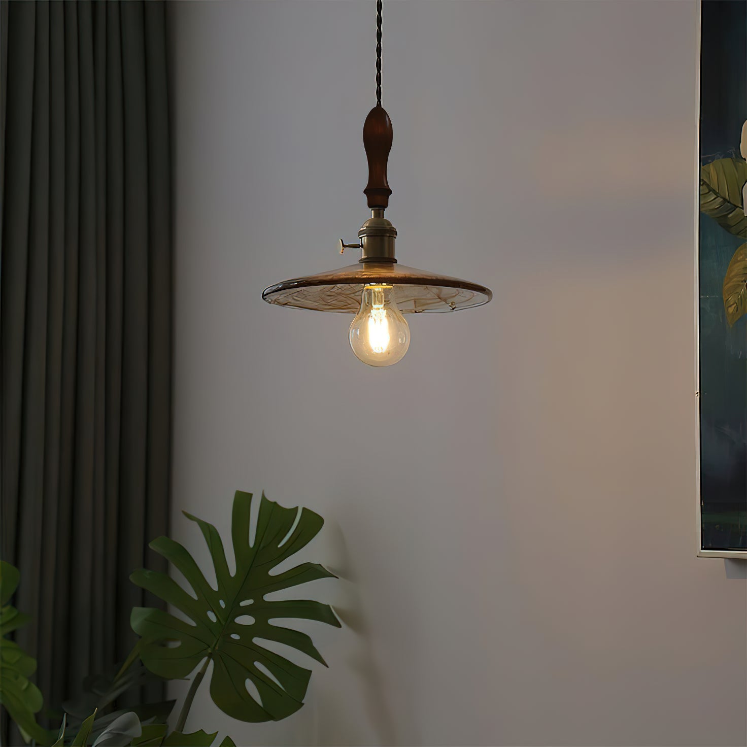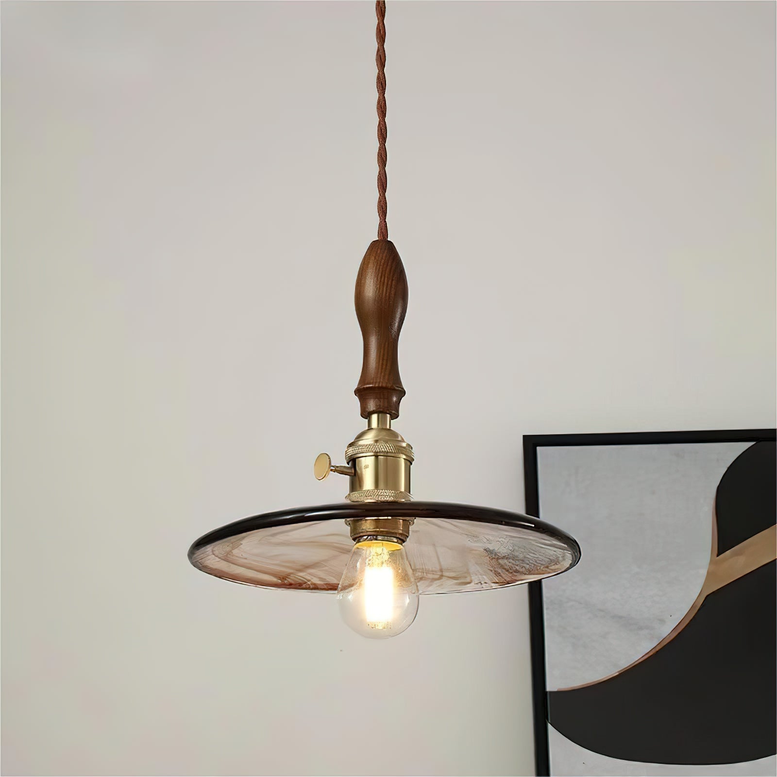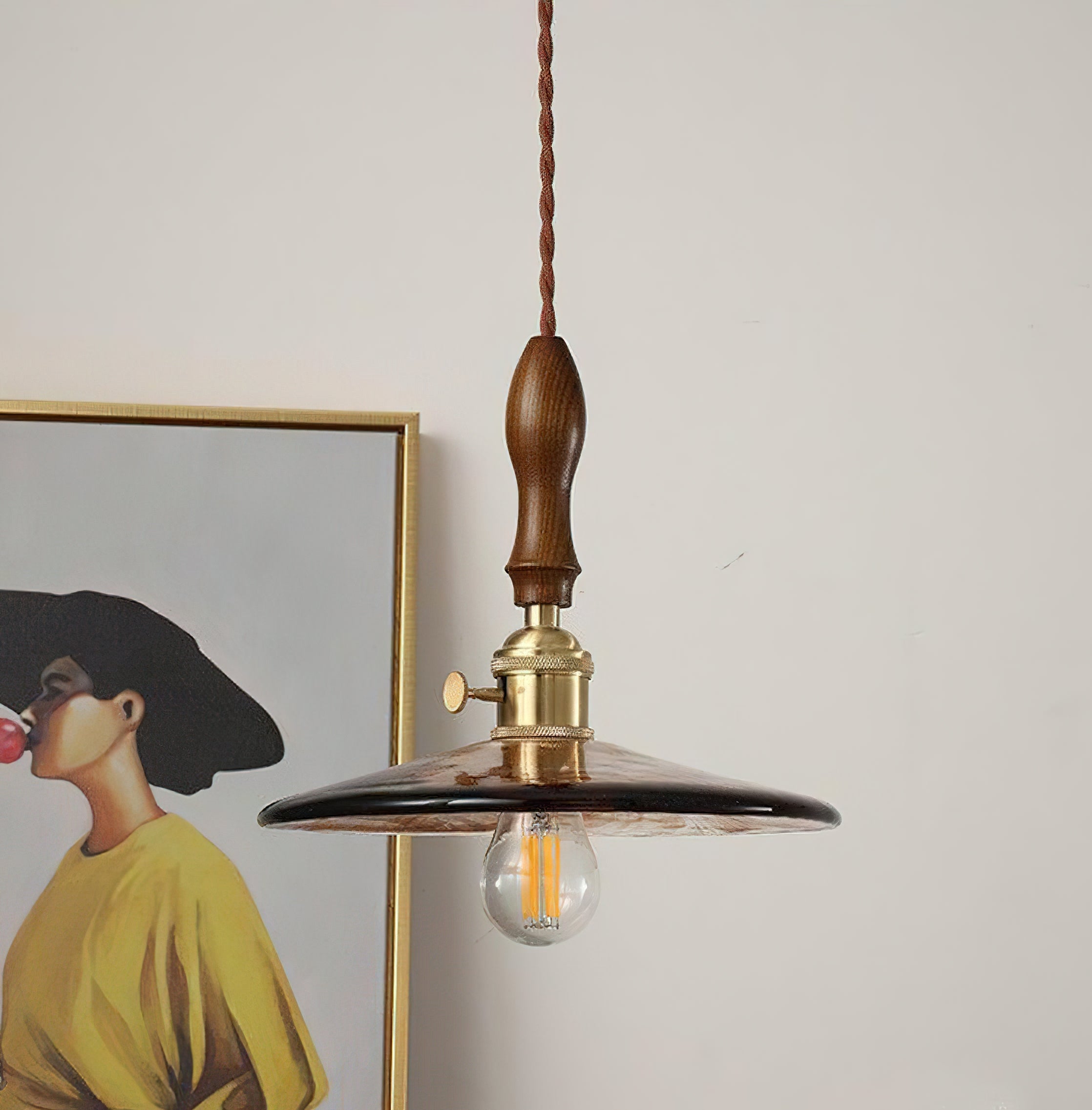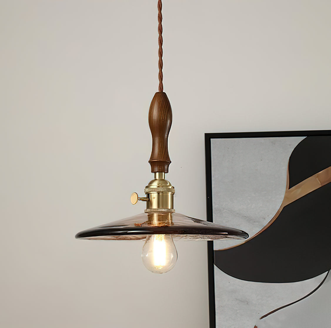This classic vintage walnut glass chandelier combines walnut wood with glass and brass accents to bring a sophisticated ambiance to any room. Its filament-style bulbs add a warm glow, while brass details add a touch of luxury. Perfect for any modern, eclectic or vintage styled space.