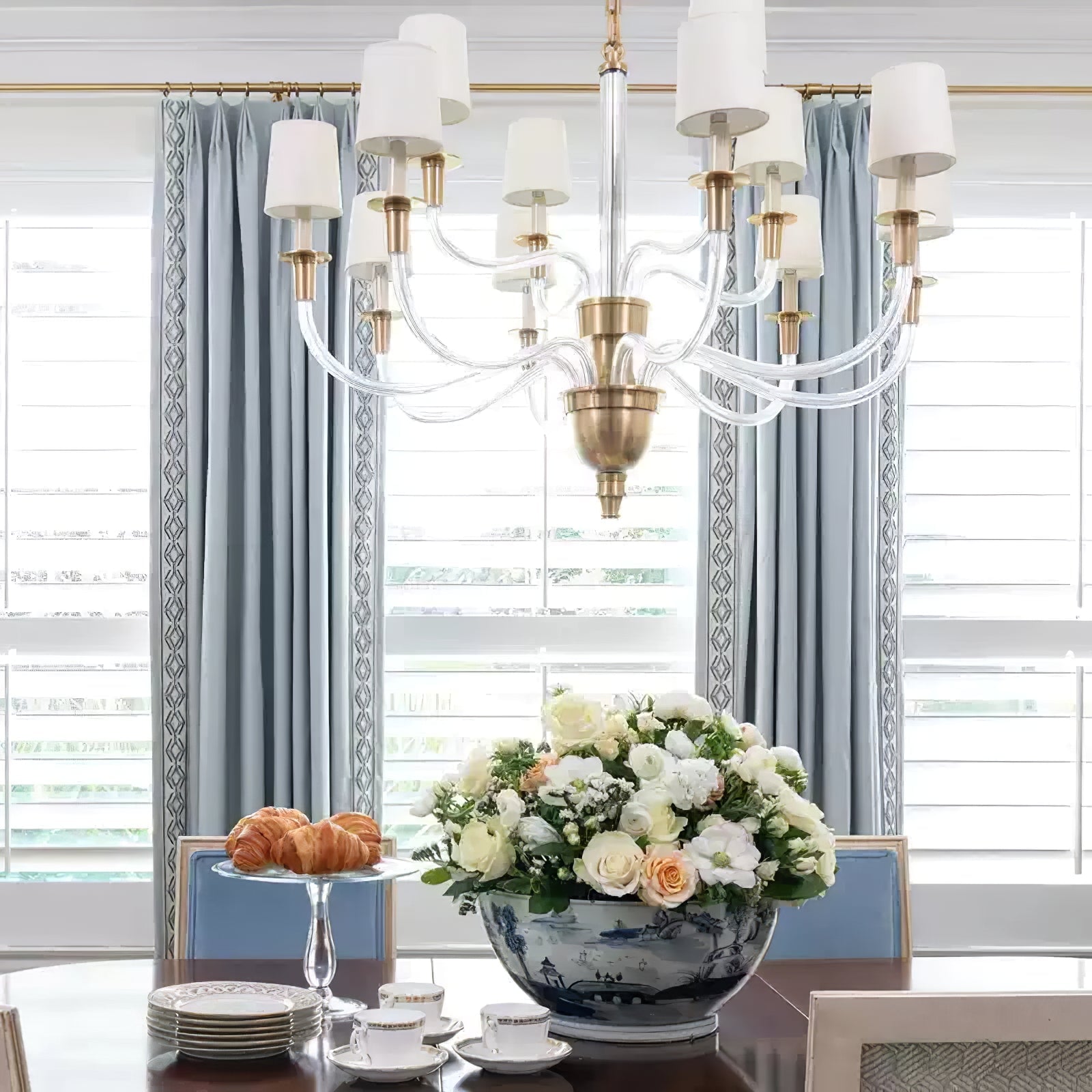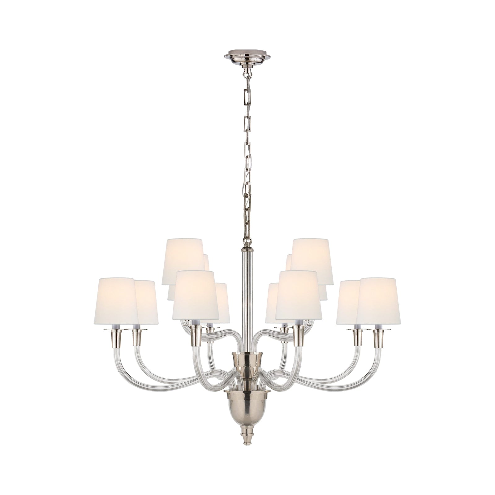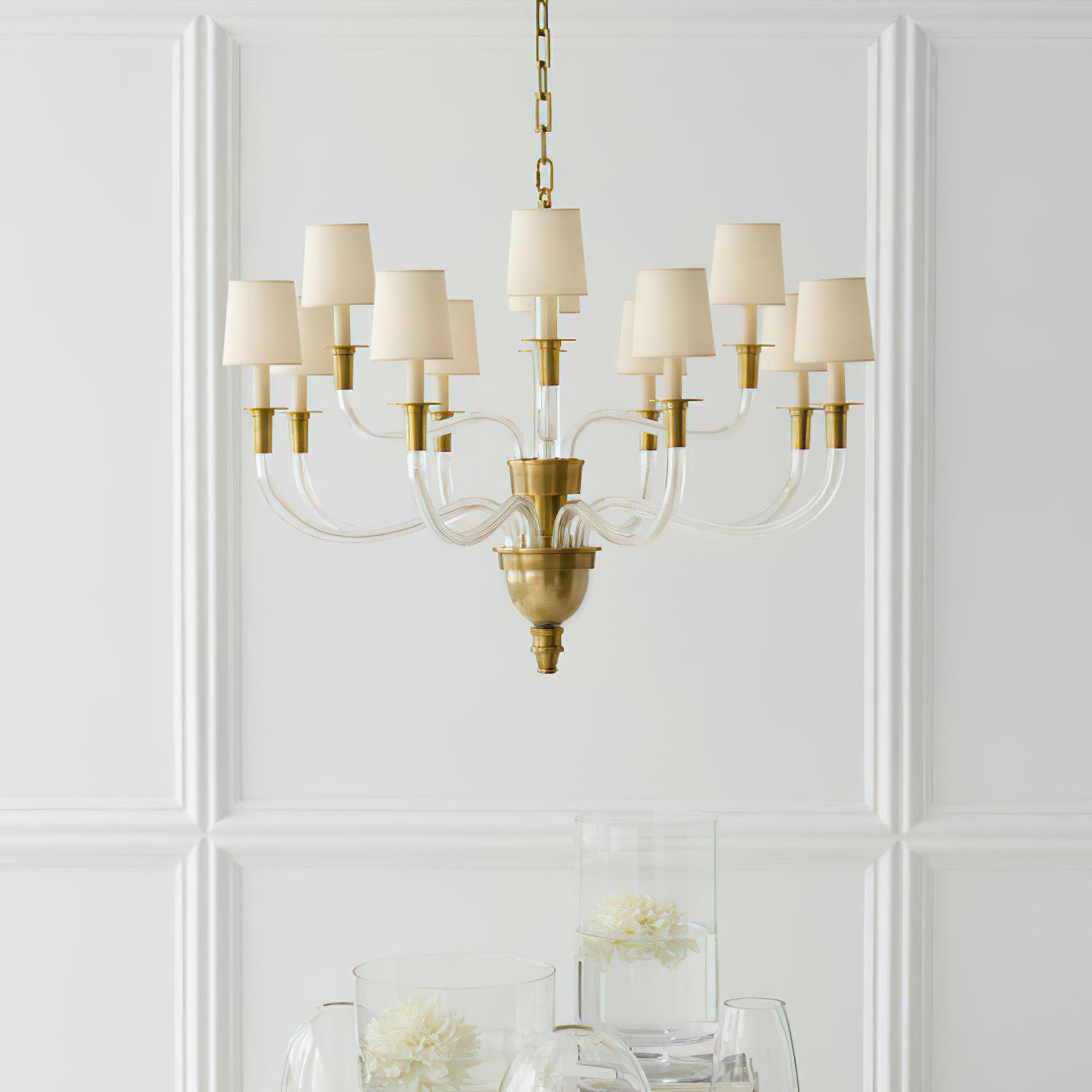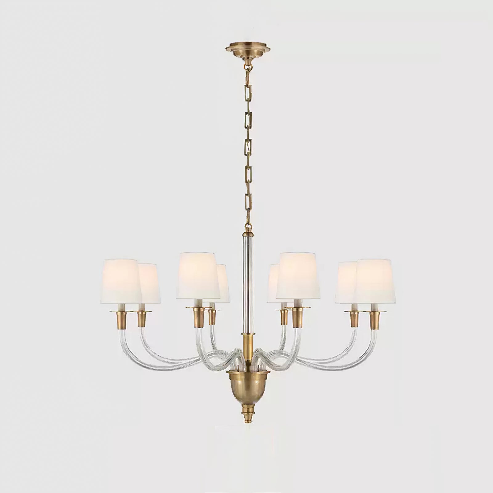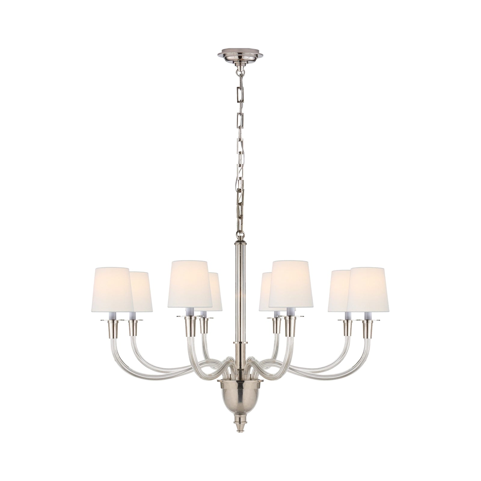 The Vivian Modern Nickel Multi-Arm Chandelier is a sophisticated blend of modern minimalism and timeless charm. Featuring a central stem finished in brushed nickel, this chandelier branches out into multiple gracefully curved arms, each supporting a light fixture adorned with a refined fabric or glass shade. The elegant arms are crafted with subtle details, adding a touch of fluidity and harmony to the overall design.