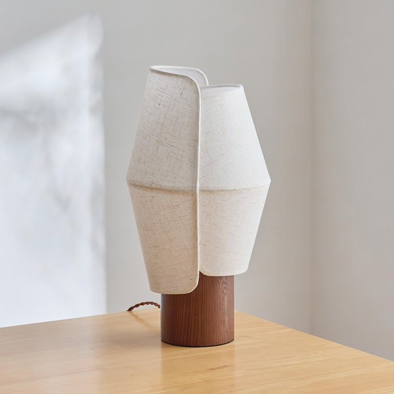 The Volute Table Lamp from Mooijane features a layered fabric shade that folds around the light like sculpted paper, creating a warm, organic glow when illuminated. Its solid wood base adds natural texture and balance, pairing beautifully with the linen-like shade for a calming, handcrafted feel.