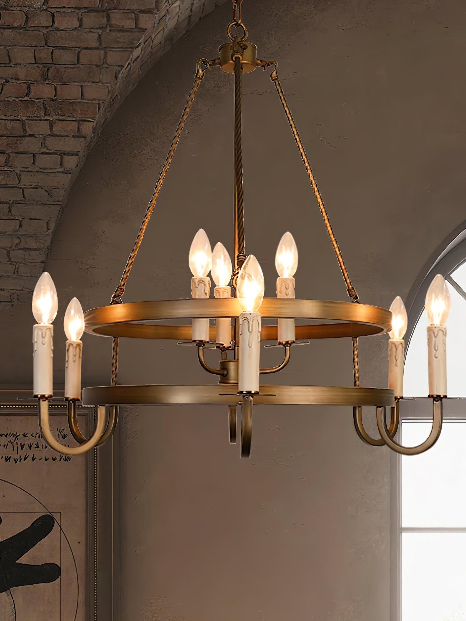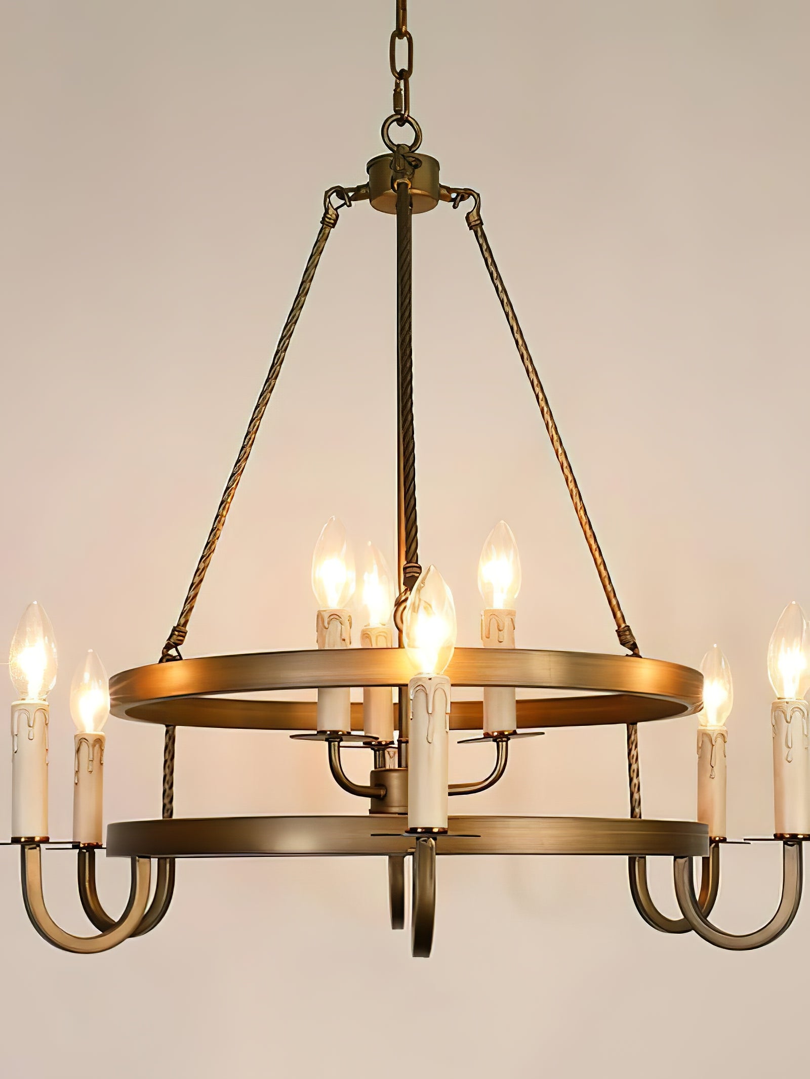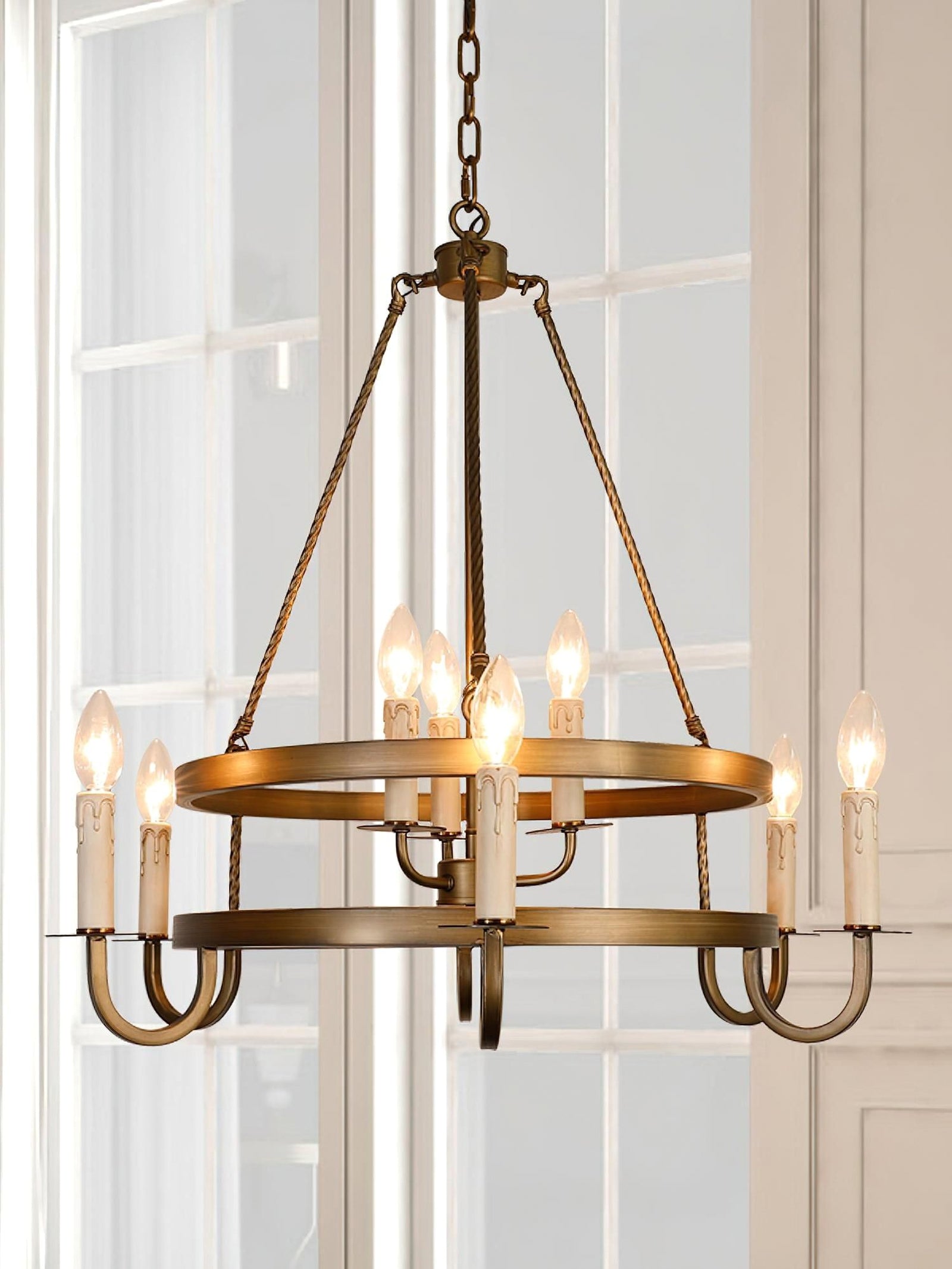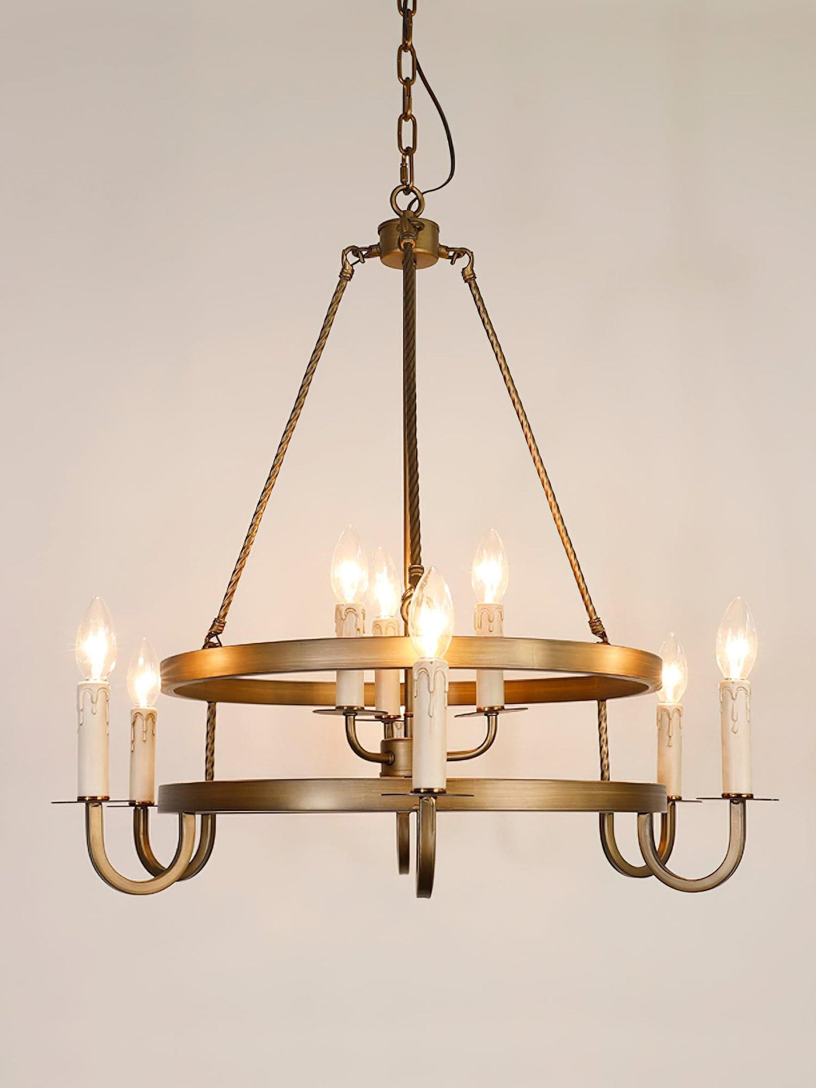 A great addition to any room, this travel antique chandelier features an antique metal frame and classic circular layout, creating the perfect balance between rugged industrial style and warm vintage elegance. The chandelier features a hanging design with real candle lighting that emits an alluring glow, perfect for entryways, dining areas, or lofts seeking a blend of traditional and modern styles.