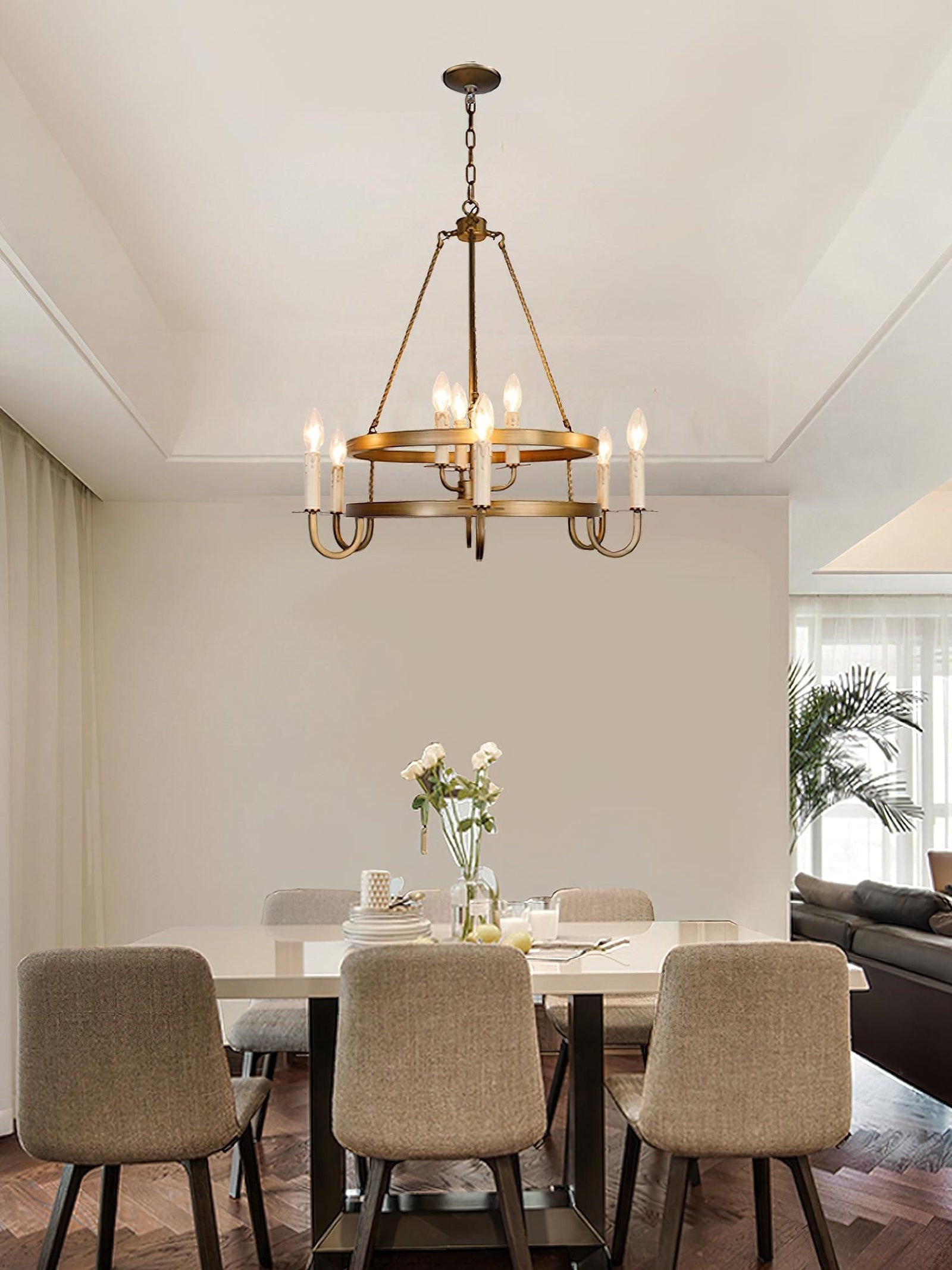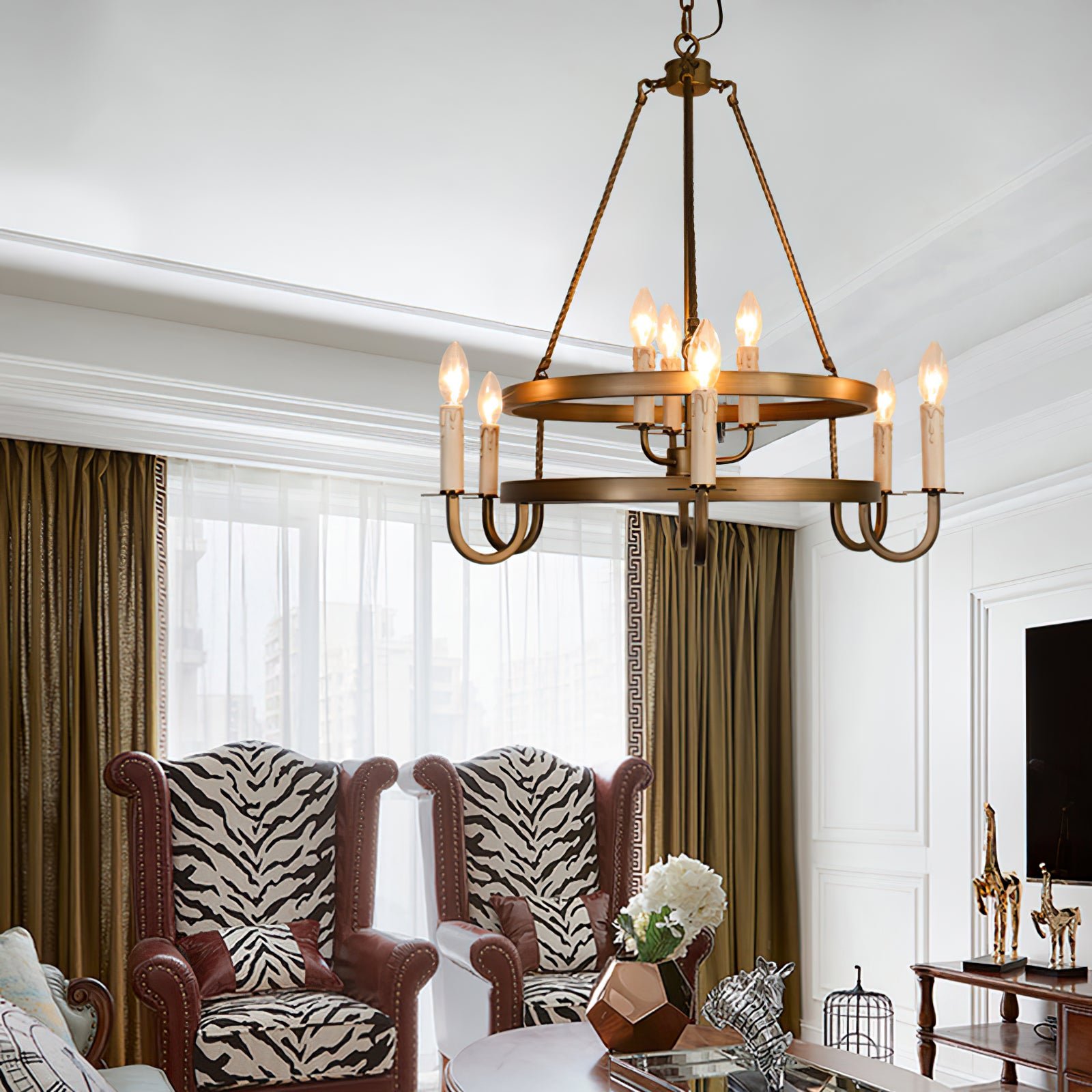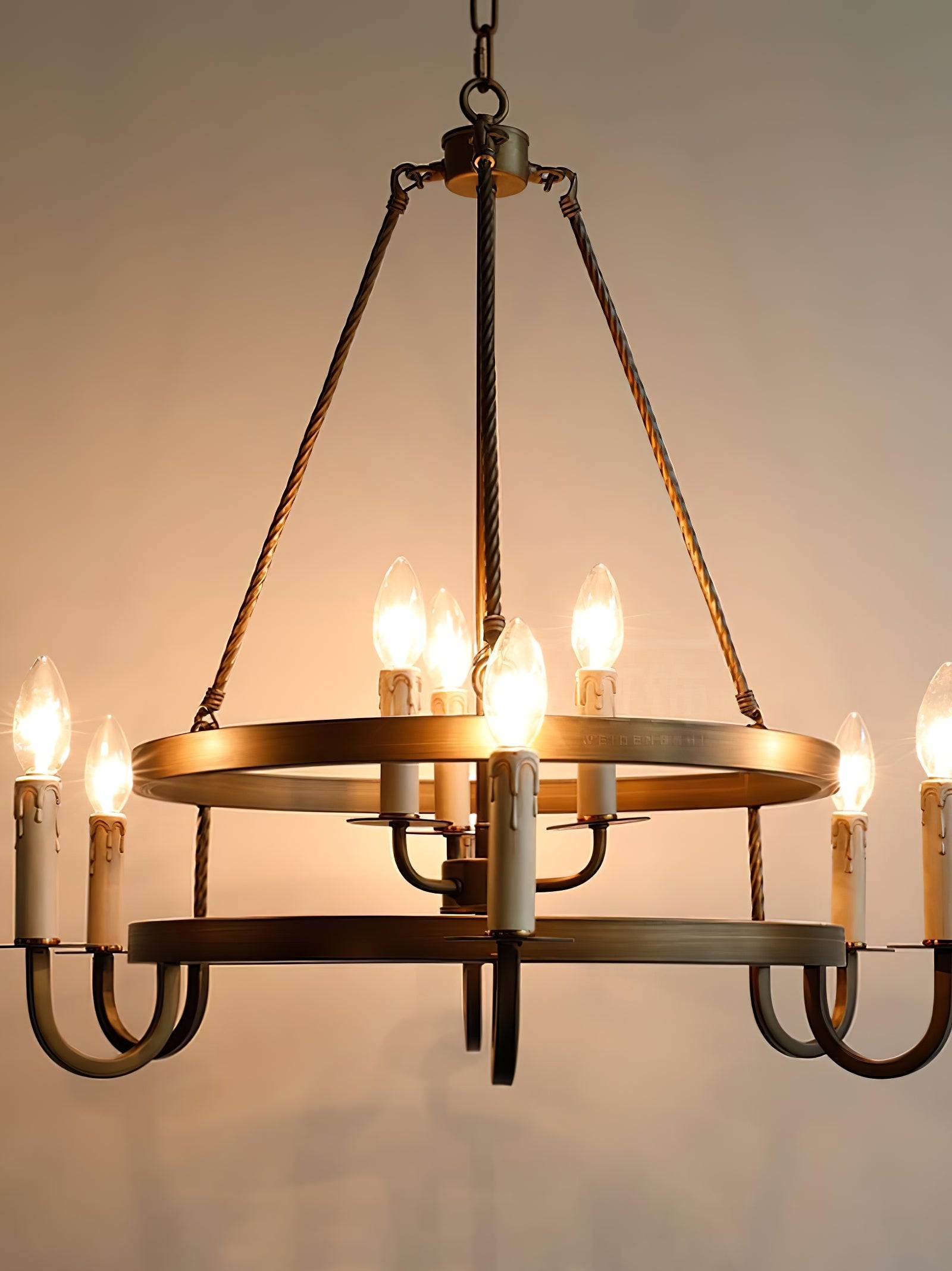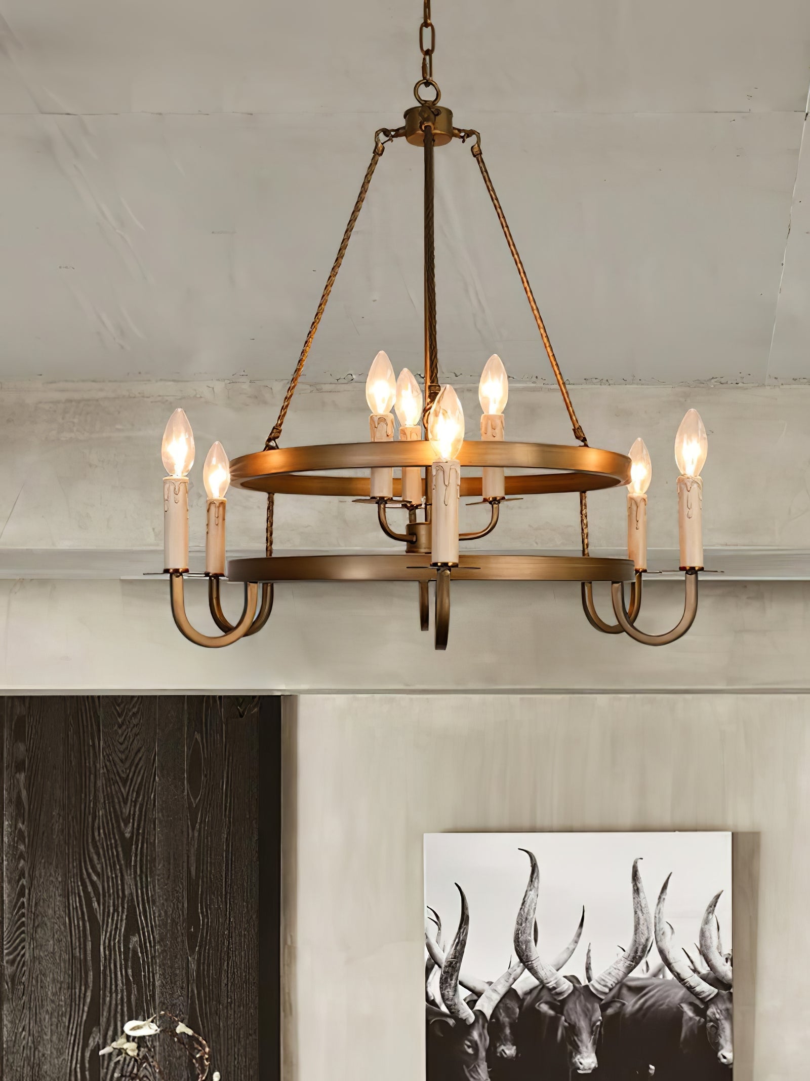 A great addition to any room, this travel antique chandelier features an antique metal frame and classic circular layout, creating the perfect balance between rugged industrial style and warm vintage elegance. The chandelier features a hanging design with real candle lighting that emits an alluring glow, perfect for entryways, dining areas, or lofts seeking a blend of traditional and modern styles.