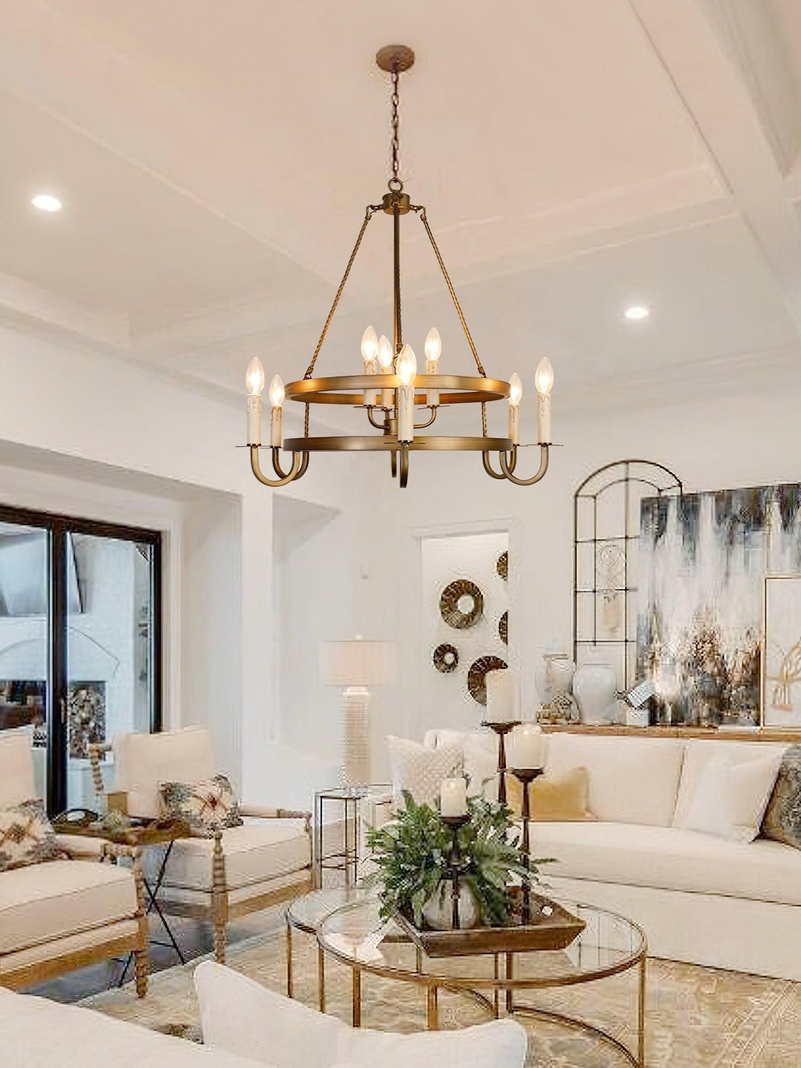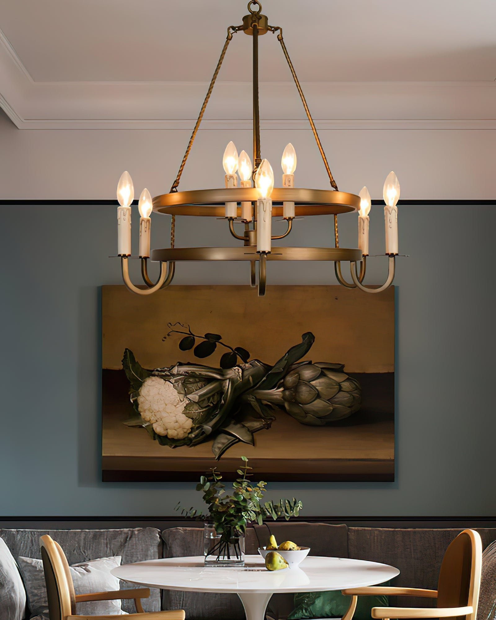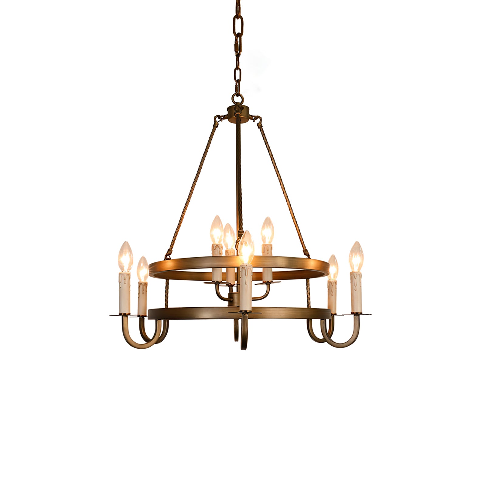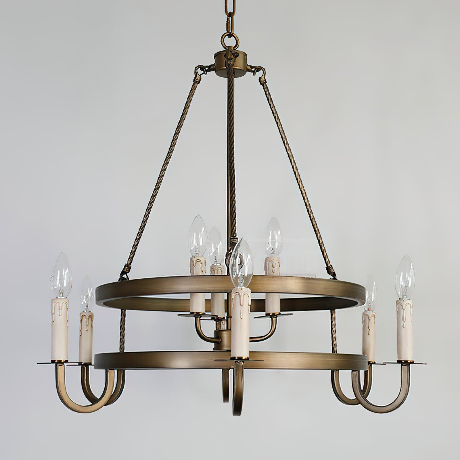 A great addition to any room, this travel antique chandelier features an antique metal frame and classic circular layout, creating the perfect balance between rugged industrial style and warm vintage elegance. The chandelier features a hanging design with real candle lighting that emits an alluring glow, perfect for entryways, dining areas, or lofts seeking a blend of traditional and modern styles.