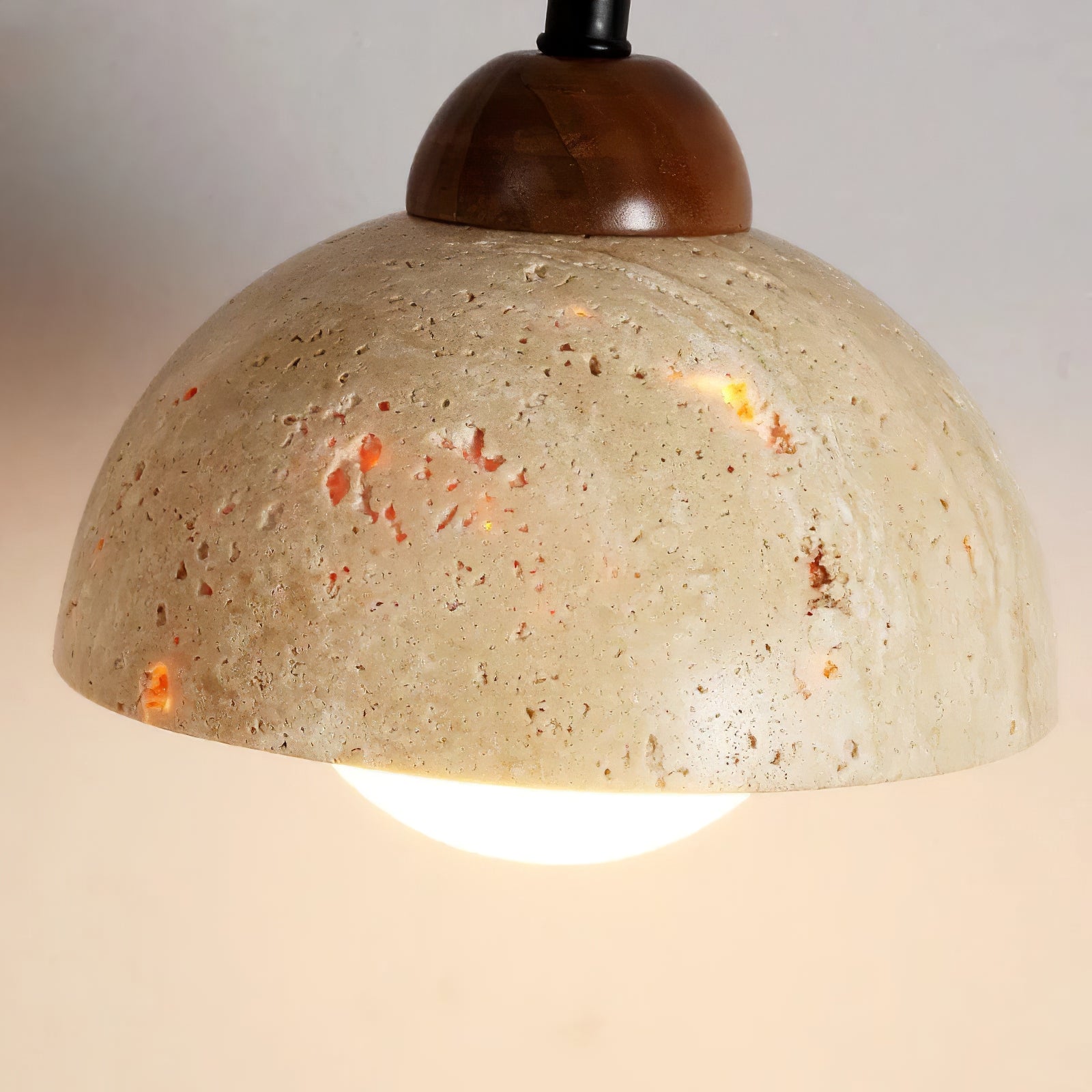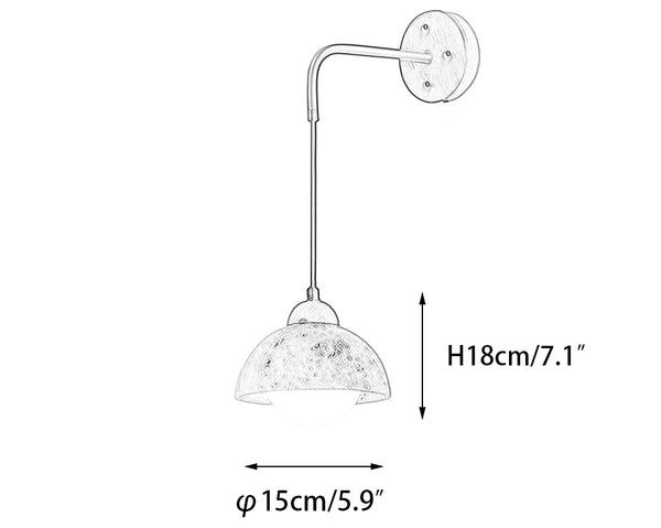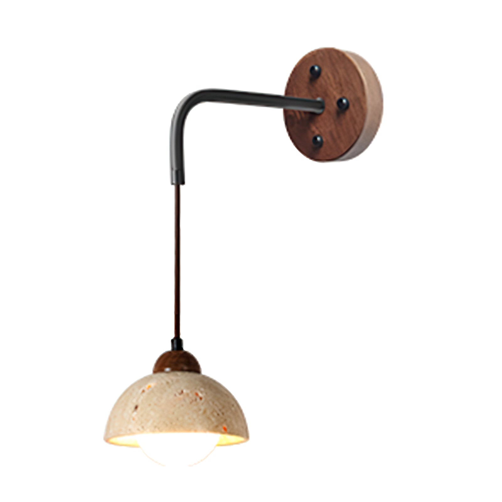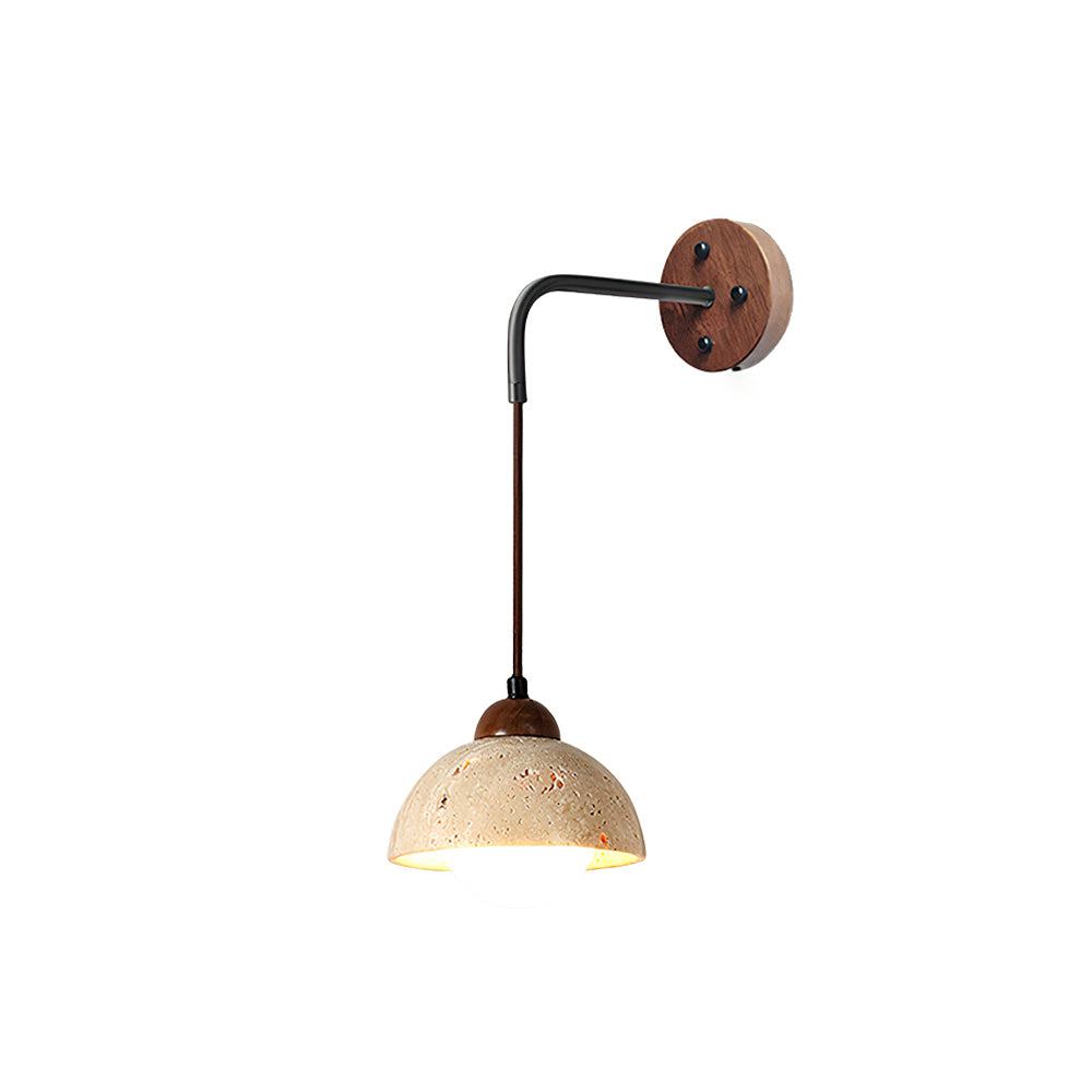 This Wabi-Sabi Texture Stone Wall Lamp embodies rustic charm with a natural, understated aesthetic. The lamp features a semi-spherical stone-textured shade, showcasing a raw, earthy finish with subtle imperfections that celebrate the beauty of organic materials. The stone shade hangs from a black metal arm, attached to a round wooden wall mount, enhancing the blend of natural elements in its design. The combination of stone, metal, and wood reflects a Wabi-Sabi philosophy, emphasizing simplicity and the beauty of imperfection. This wall lamp is perfect for interiors that seek a harmonious, nature-inspired ambiance, making it ideal for minimalist, rustic, or Japanese-style spaces.