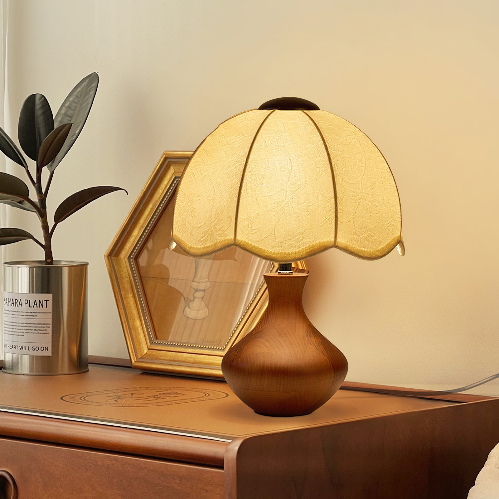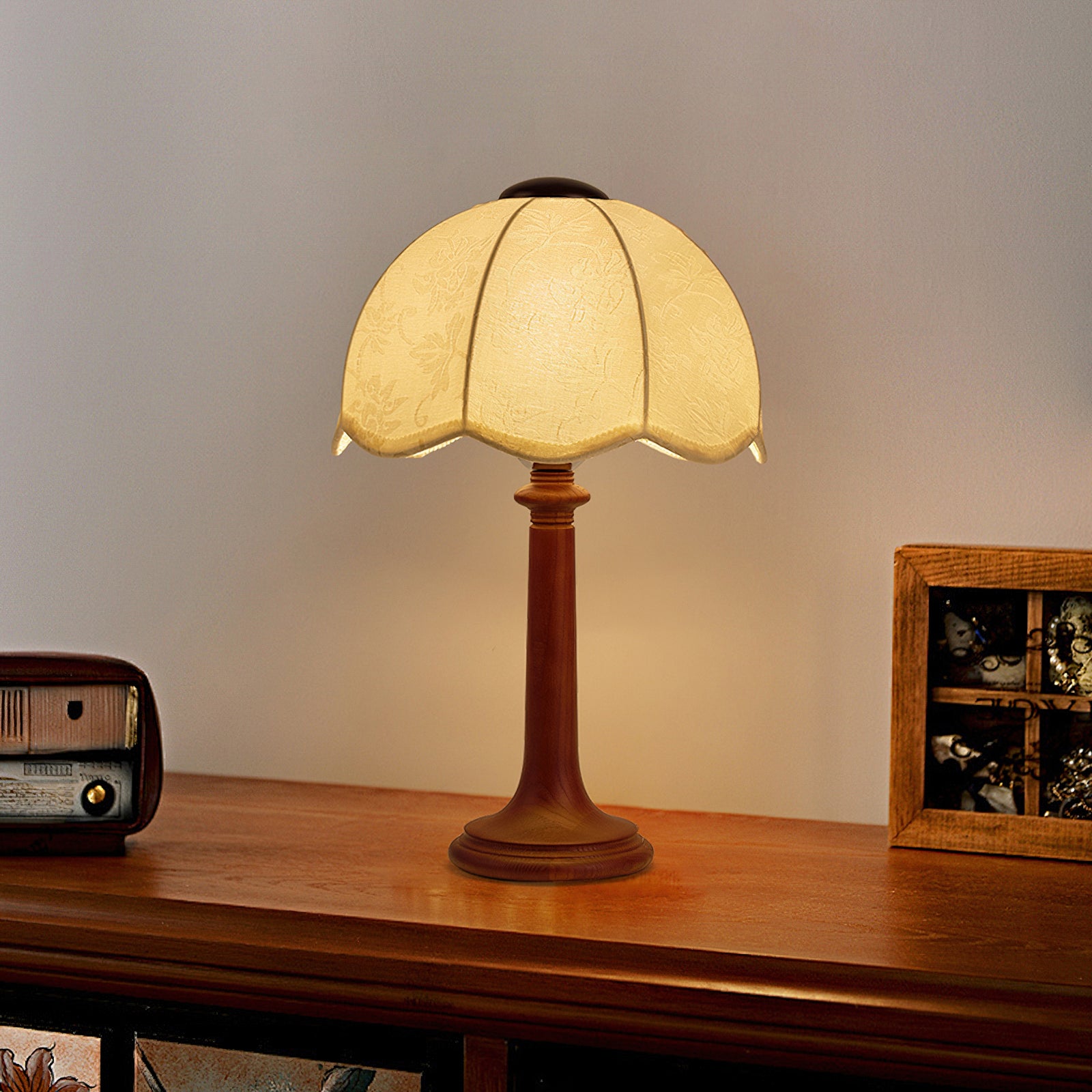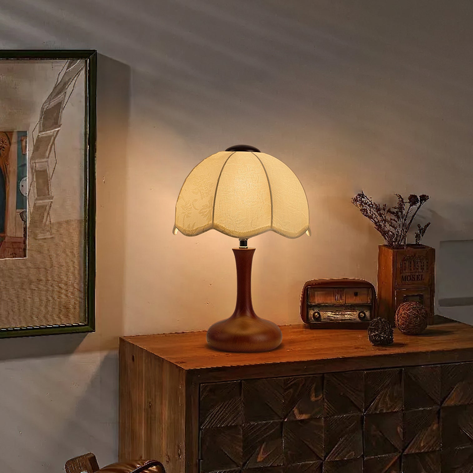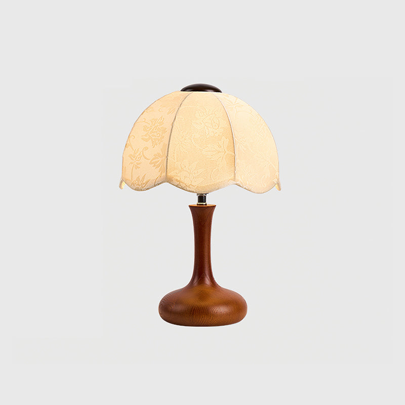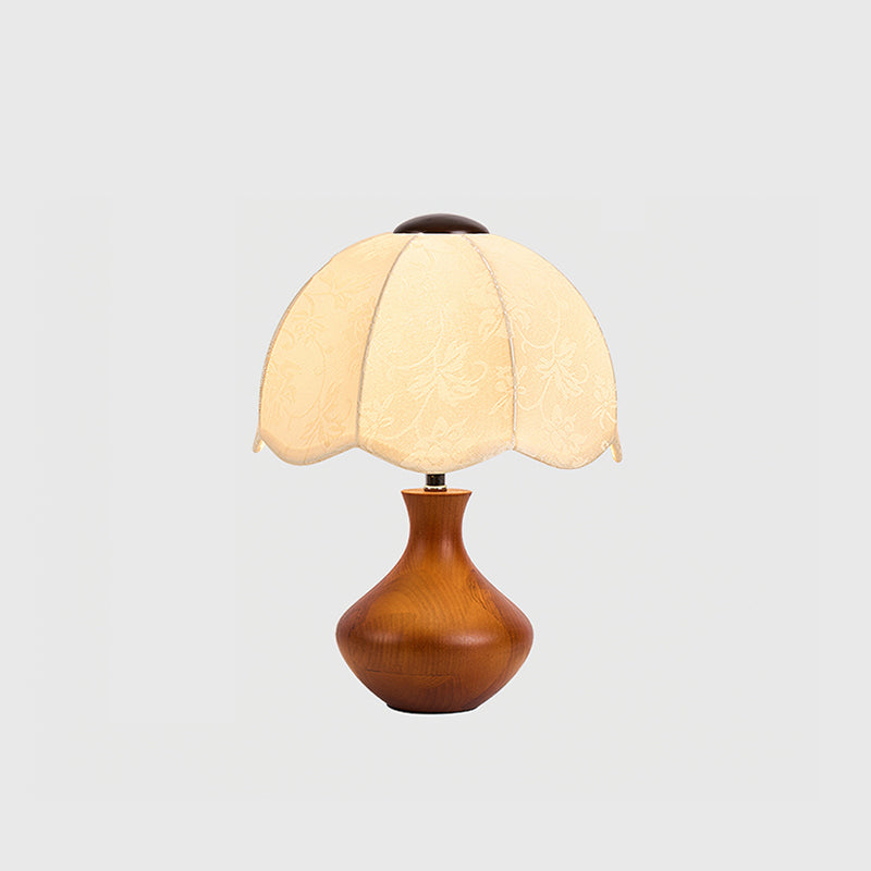 The Wagner Table Lamp from Mooijane blends retro charm with floral-inspired elegance. Its petal-shaped fabric shade features delicate relief patterns that create a layered, textured glow when lit. The smooth, bottle-shaped wooden base adds warmth and natural appeal, while internal metal reinforcement ensures lasting stability. Softly diffused and inviting, this lamp is perfect for bedrooms, studies, or vintage-style interiors—bringing a quiet sense of romance and refinement to any space.