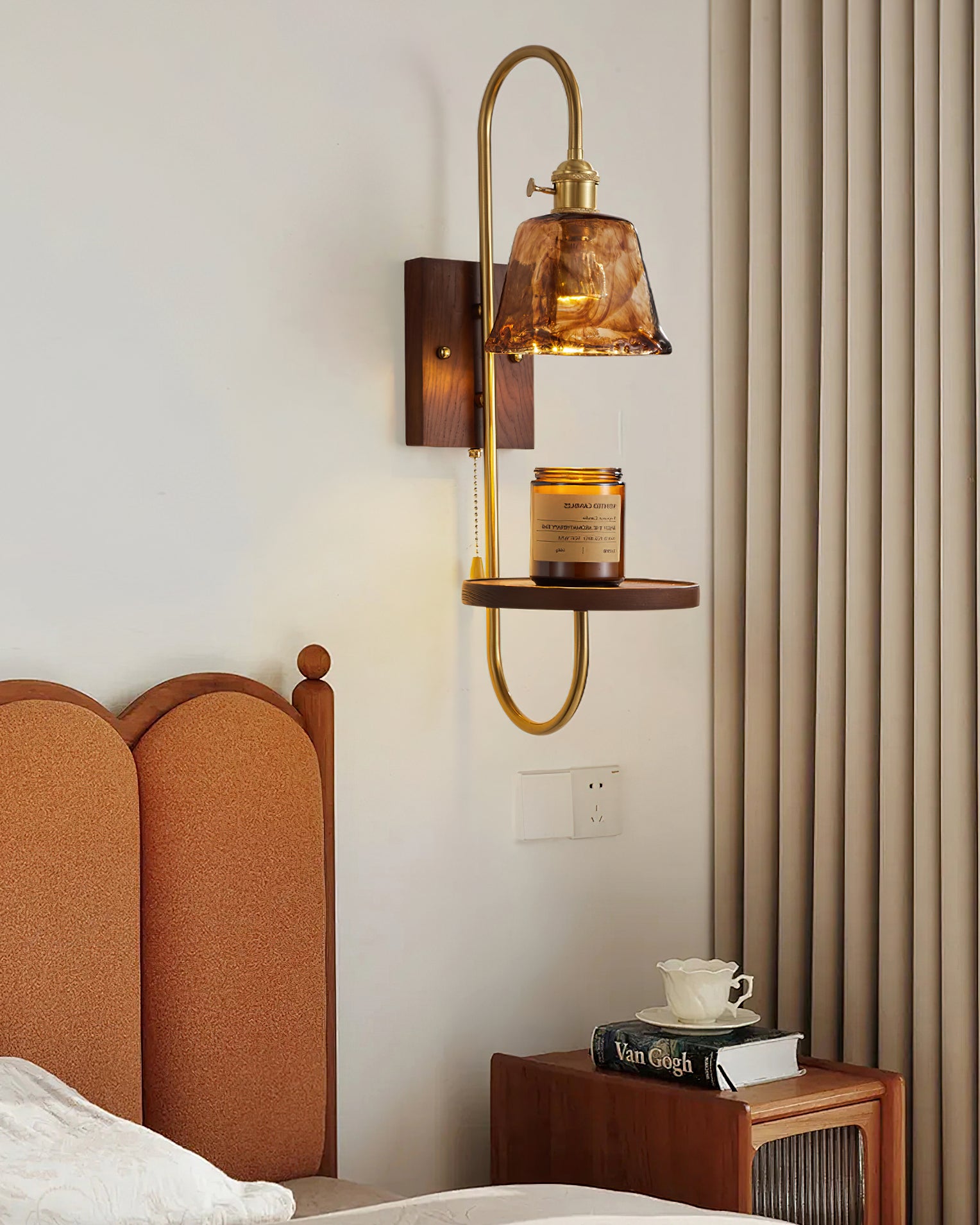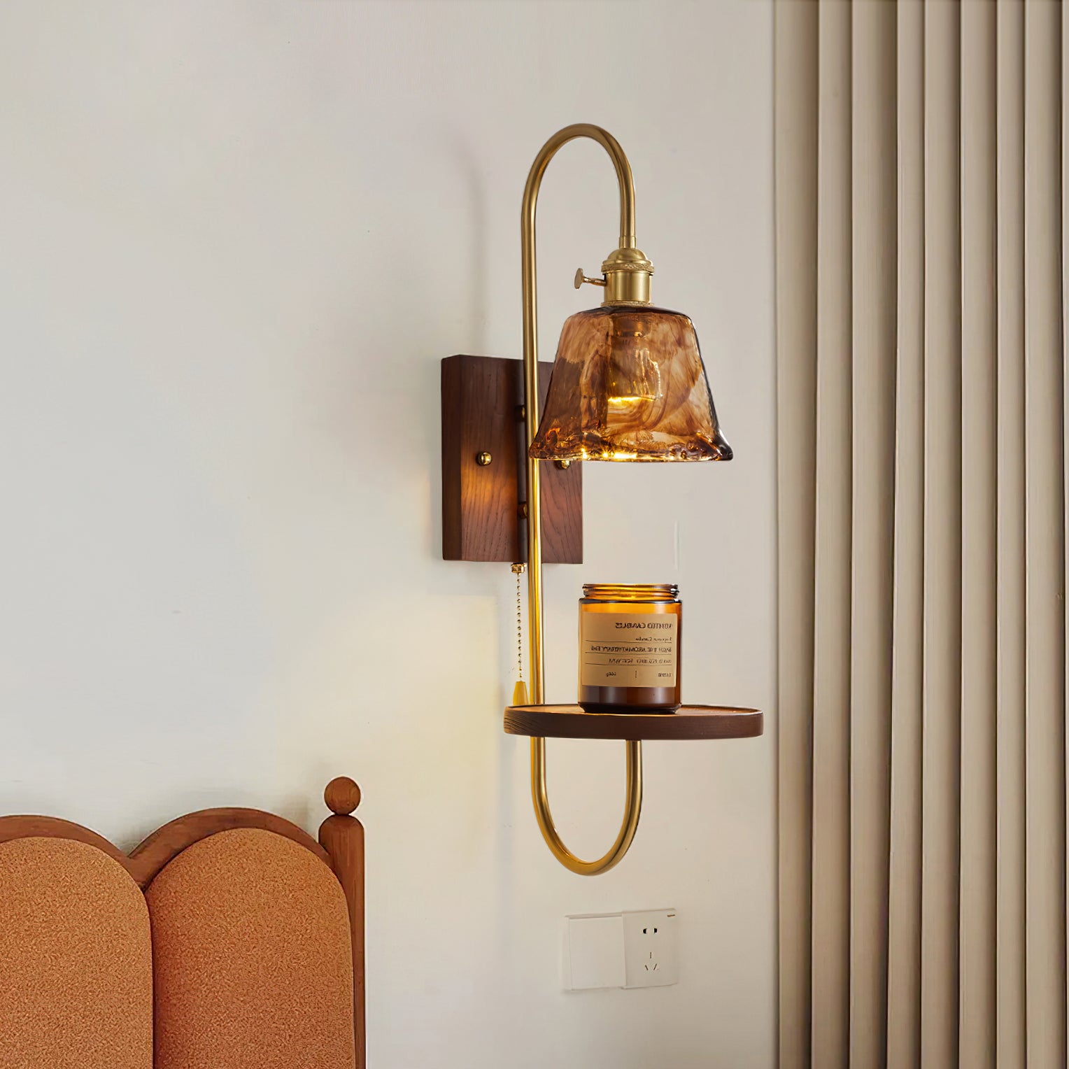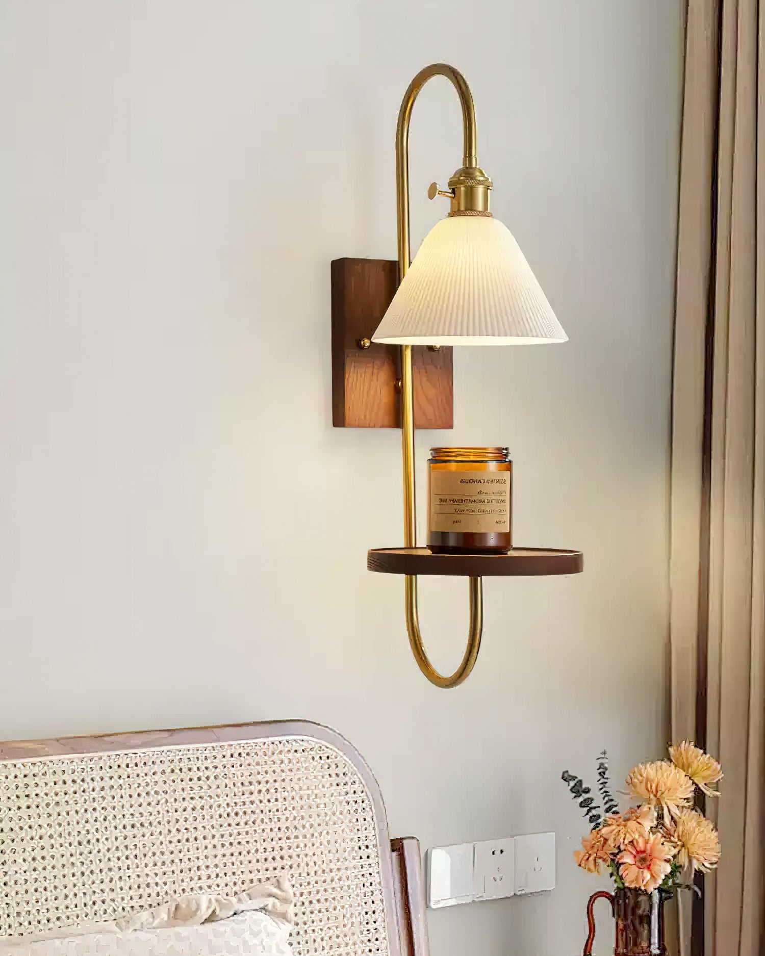 From an expert's perspective, the Walnut Shelf Wall Light from Mooijane effortlessly merges timeless aesthetics with contemporary convenience. Made with a lustrous walnut back and stylish brass arms, this wall sconce boasts a built-in shelf for storing essentials. Its warm, inviting glow adds a cozy yet elegant touch to any room.