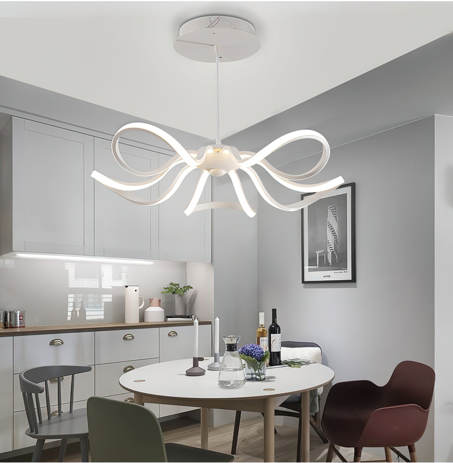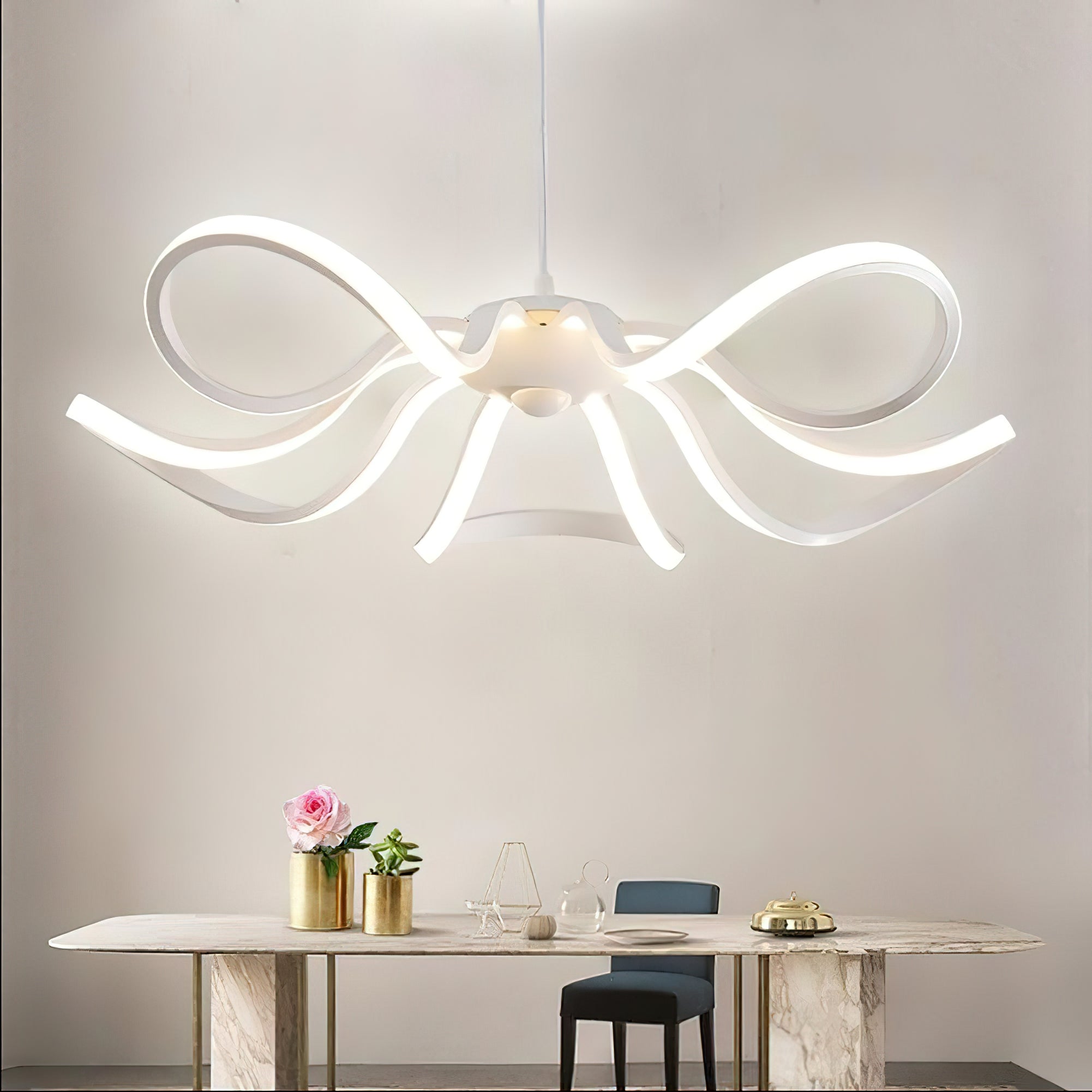 Crafted from warm aluminum, this beautiful petal chandelier exudes tranquility and brings a soothing ambience to any room. This stylish lamp's delicate petals subtly diffuse light, creating a soft, calming atmosphere. It adds a luxurious touch to your home and is sure to bring a touch of elegance.