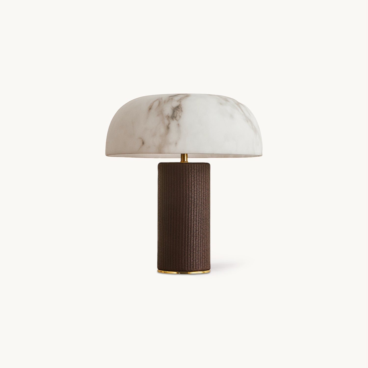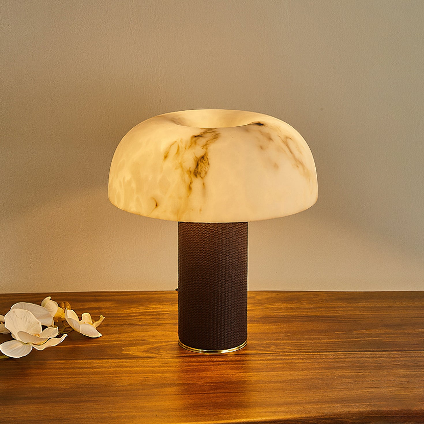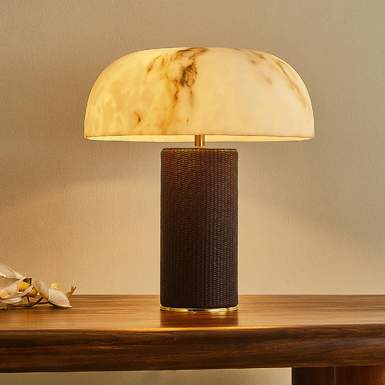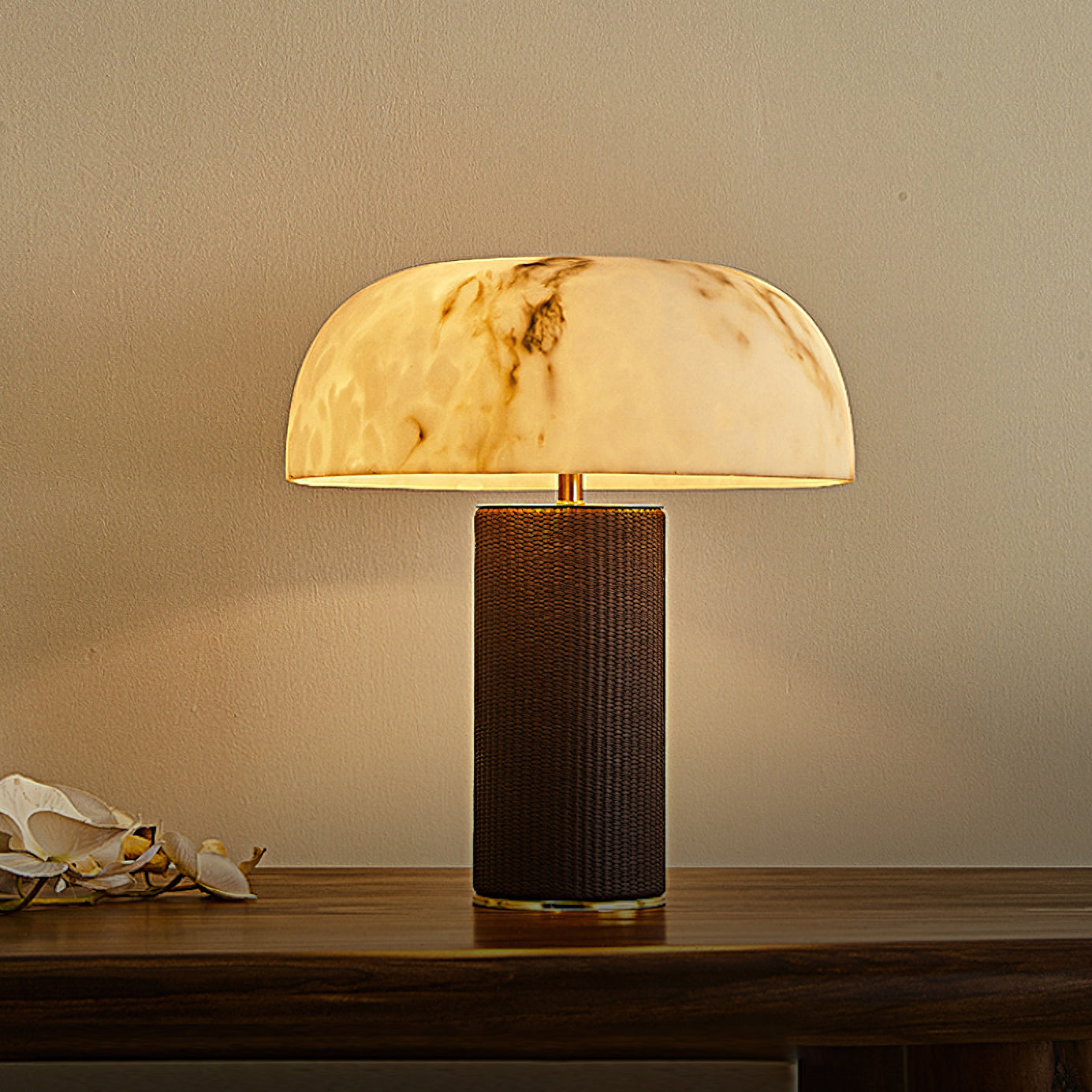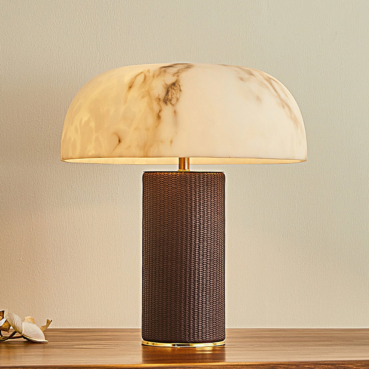 The Warren Table Lamp from Mooijane offers a refined blend of texture and warmth. Its cylindrical base is wrapped in dark woven leather, accented by a sleek metal trim for a touch of modern elegance. The faux alabaster shade features natural veining and diffuses a soft, ambient glow reminiscent of morning light. Perfect for bedrooms, studies, or living areas, it combines timeless design with everyday functionality.