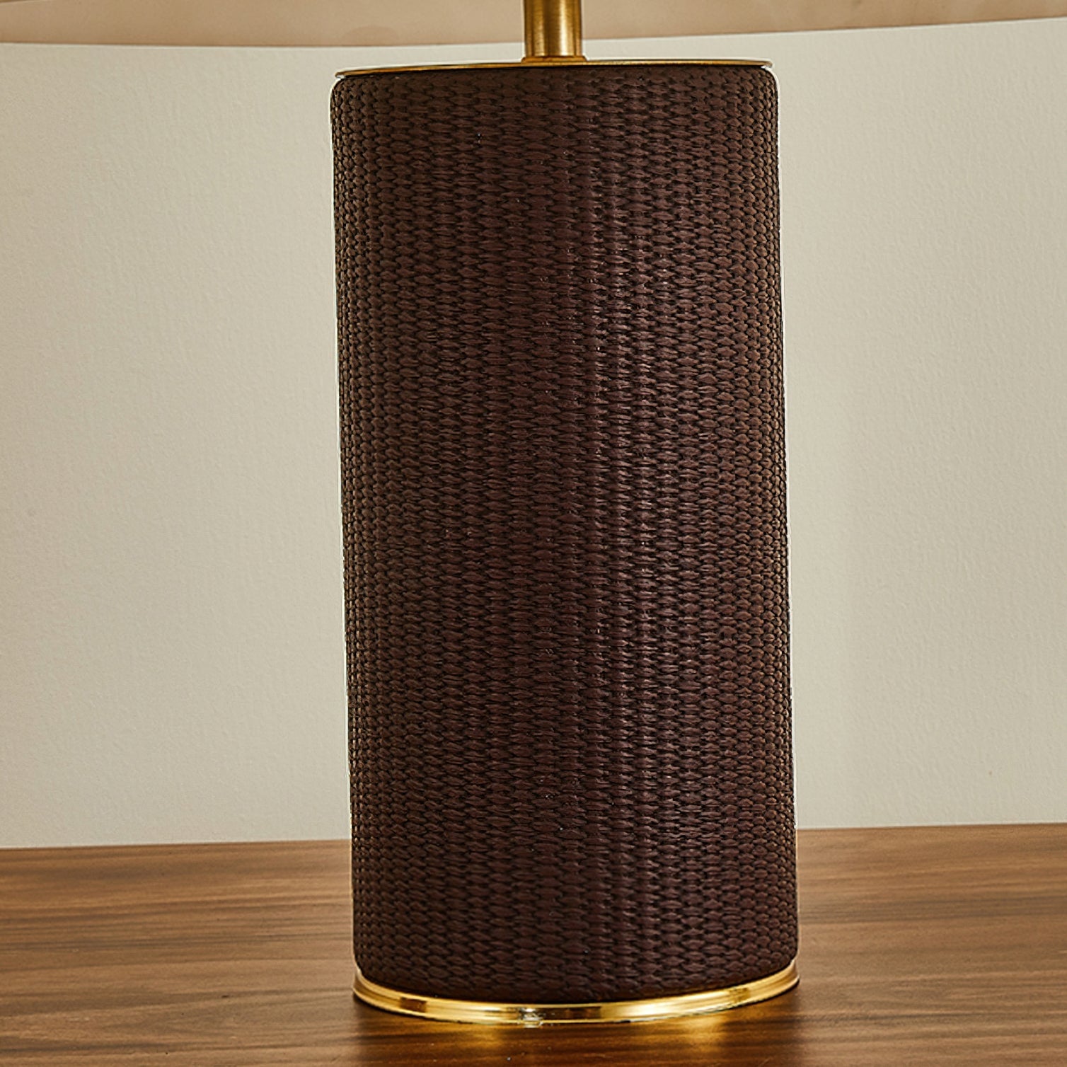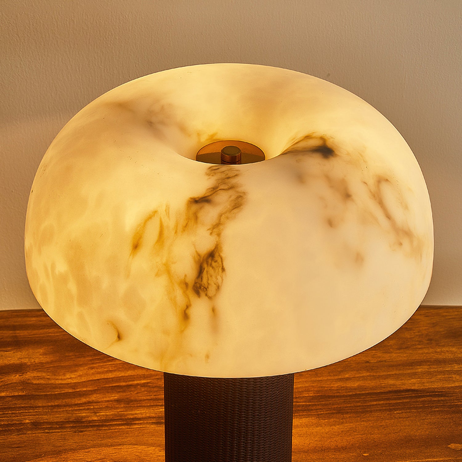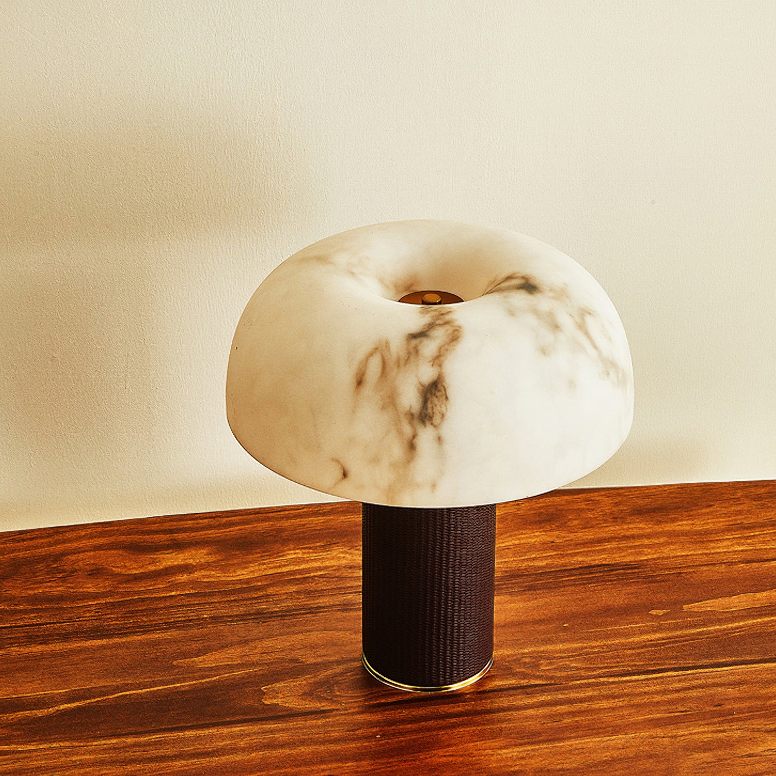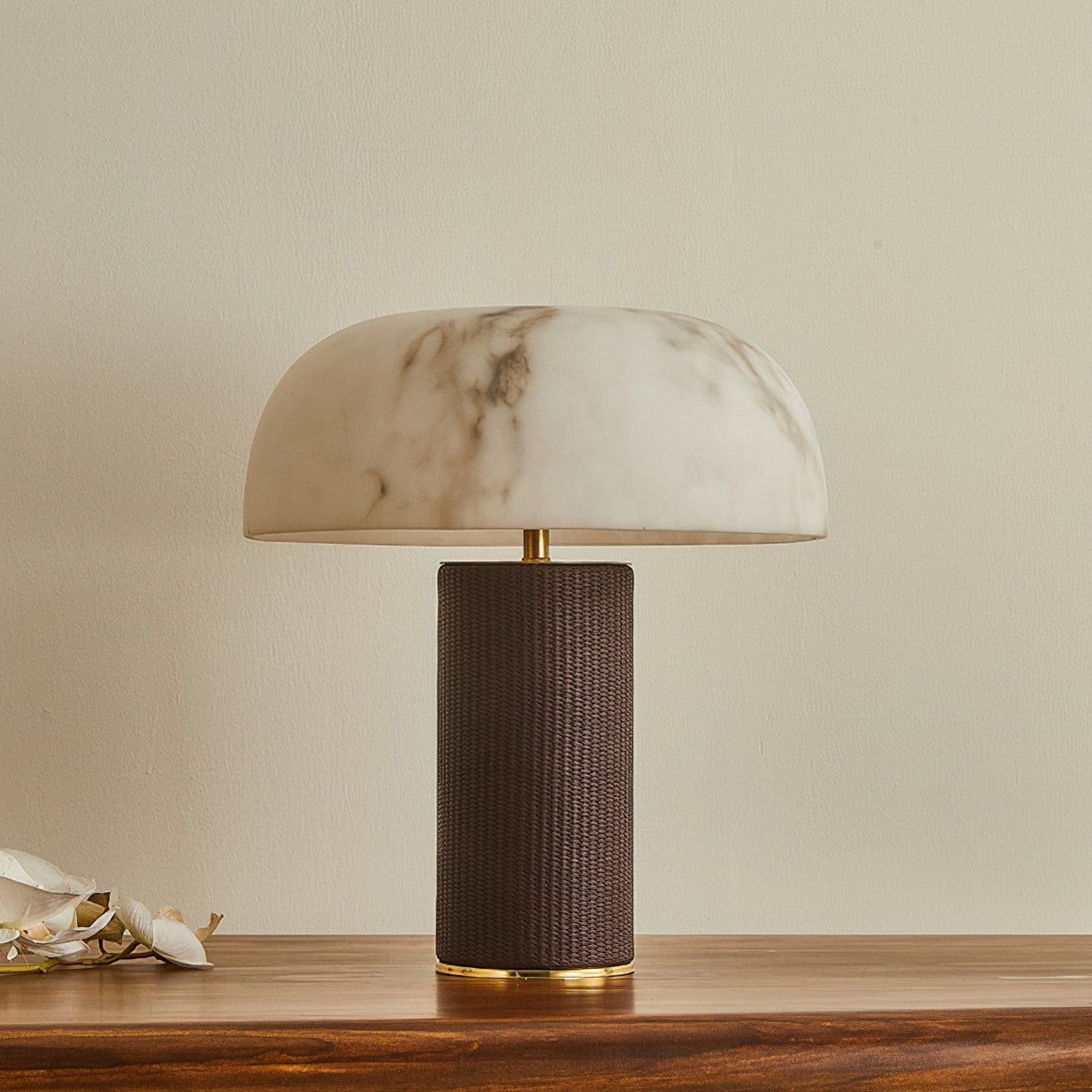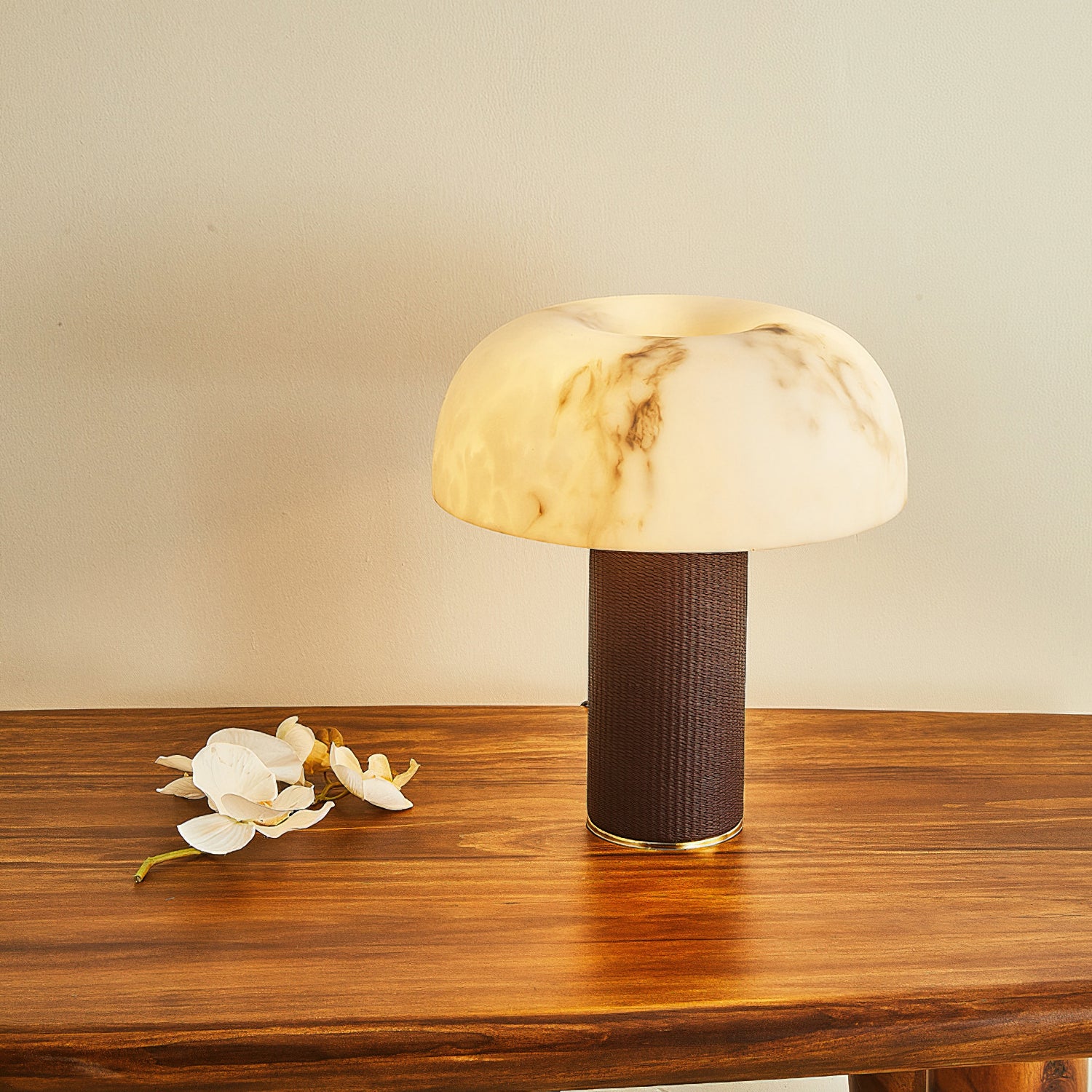 The Warren Table Lamp from Mooijane offers a refined blend of texture and warmth. Its cylindrical base is wrapped in dark woven leather, accented by a sleek metal trim for a touch of modern elegance. The faux alabaster shade features natural veining and diffuses a soft, ambient glow reminiscent of morning light. Perfect for bedrooms, studies, or living areas, it combines timeless design with everyday functionality.